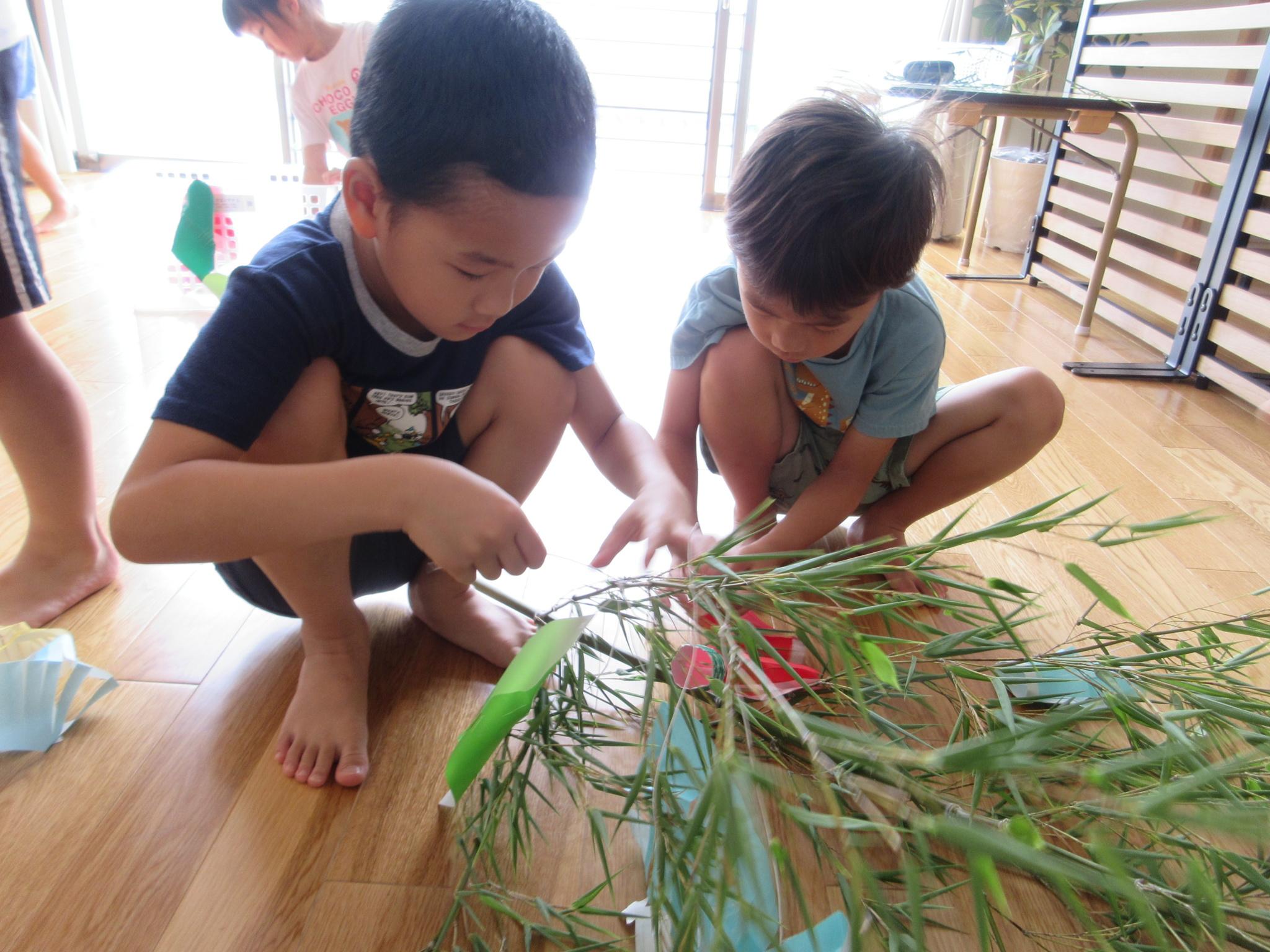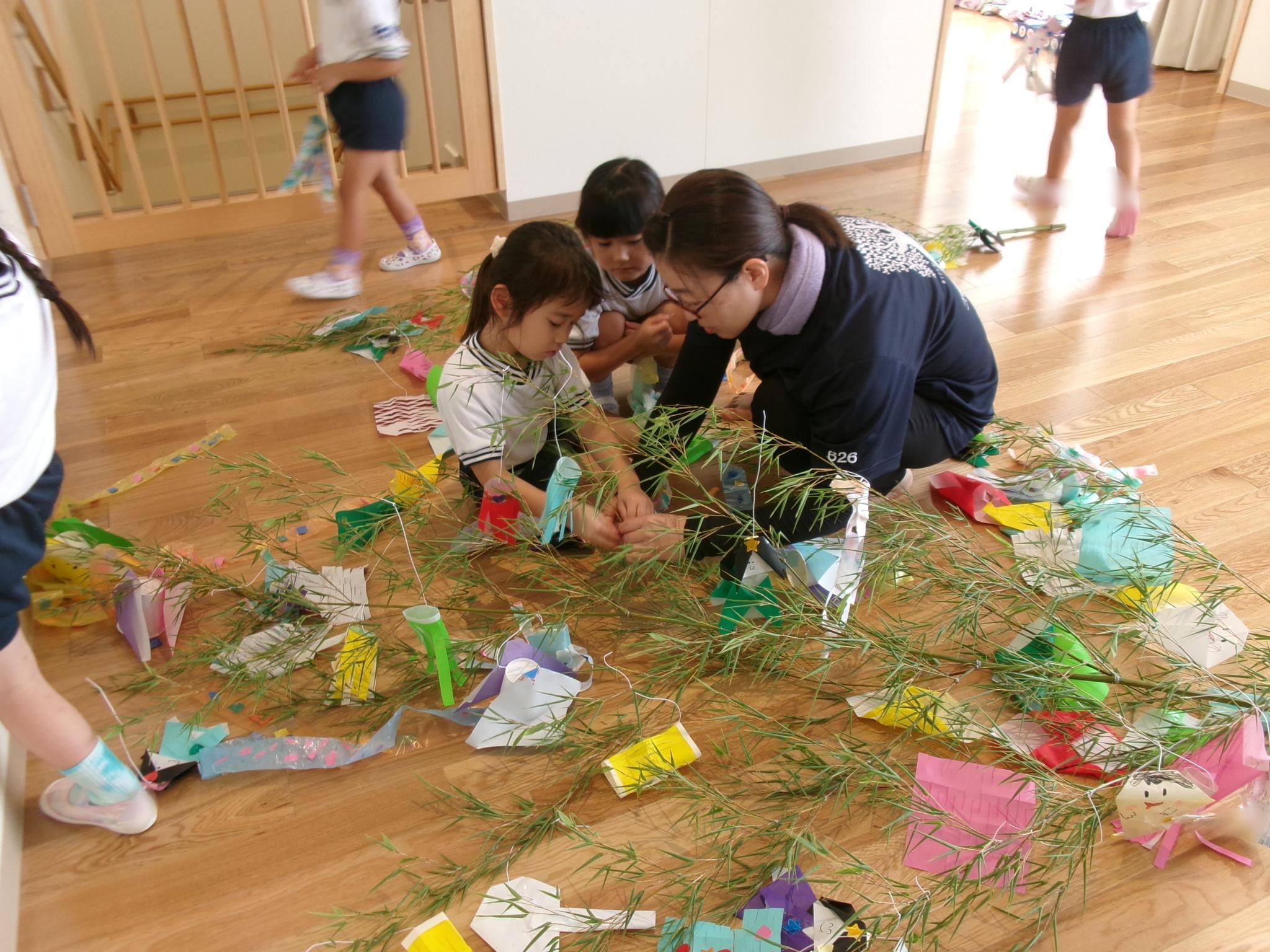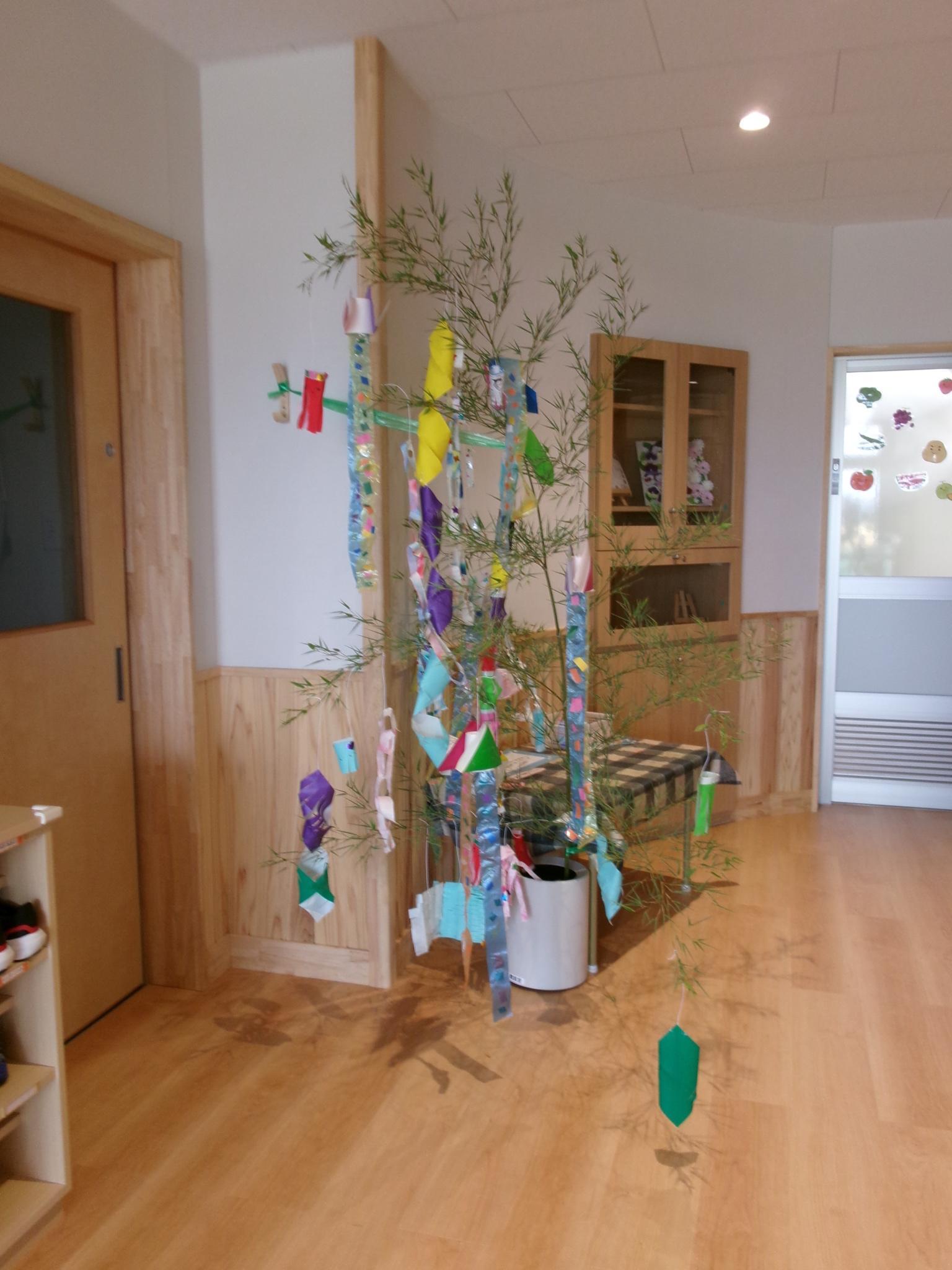 みんなで作った可愛い七夕飾りを笹に飾りつけしました。カラフルですてきな飾りがいっぱい!保育園が更に明るくなりました!