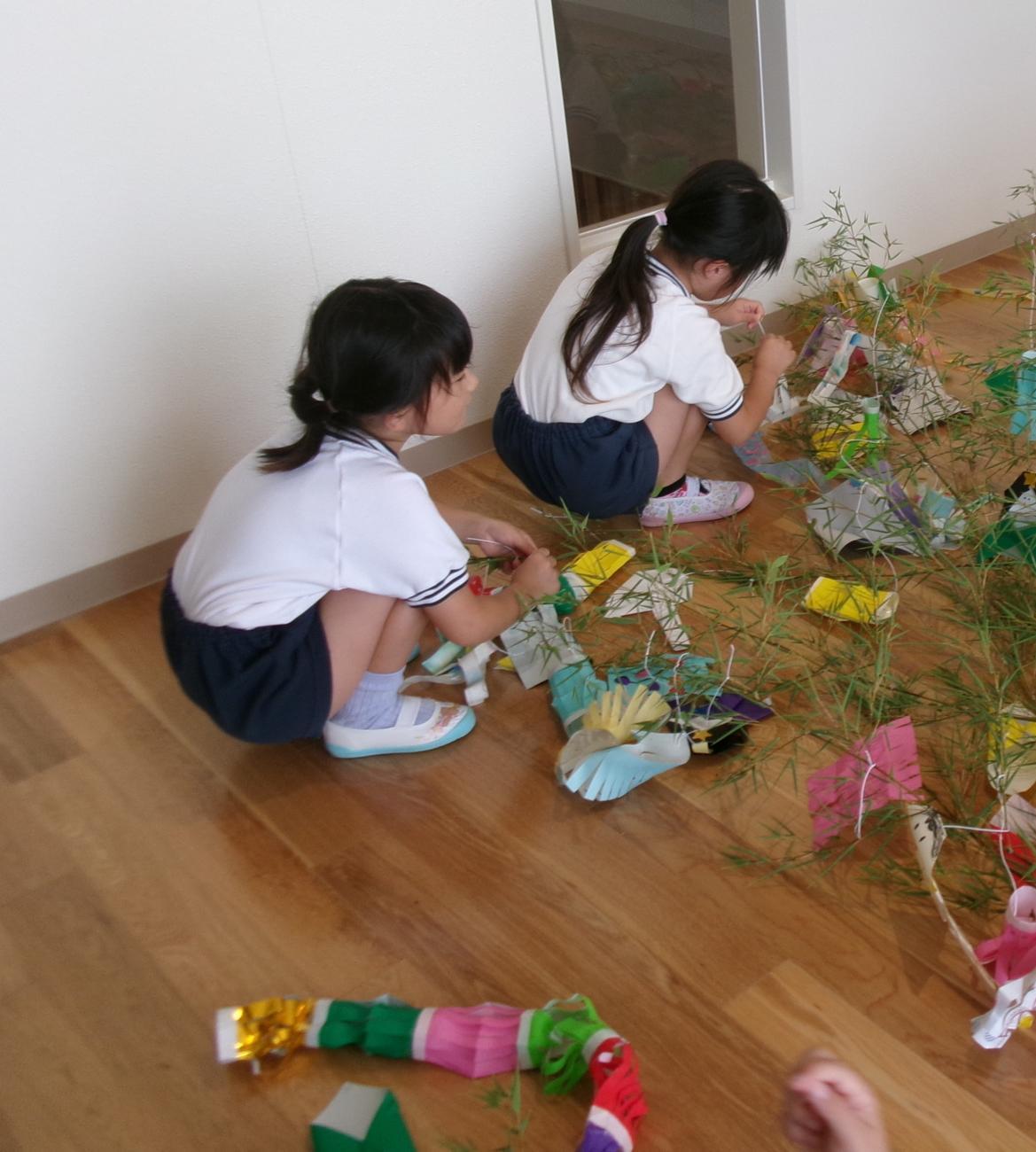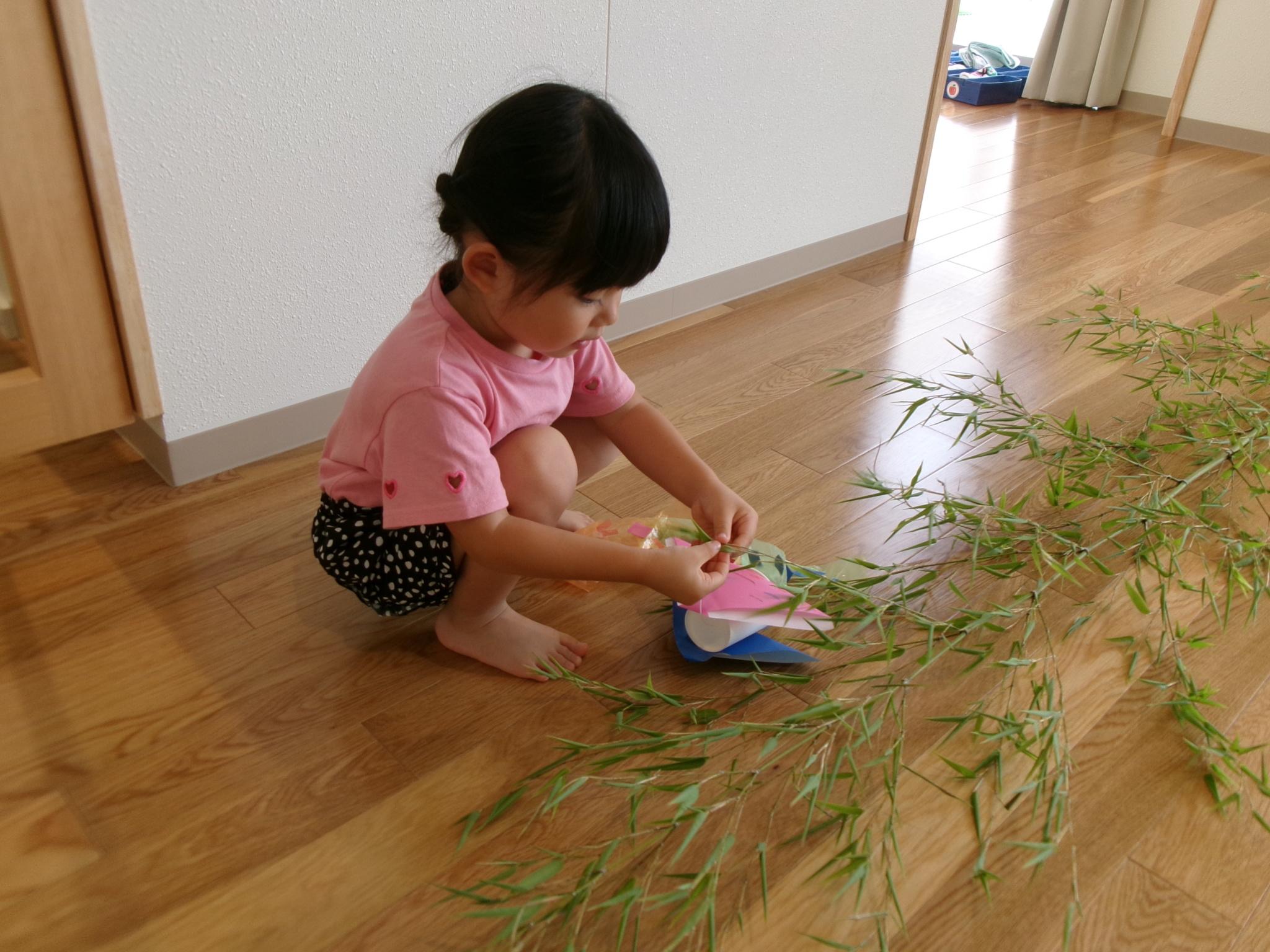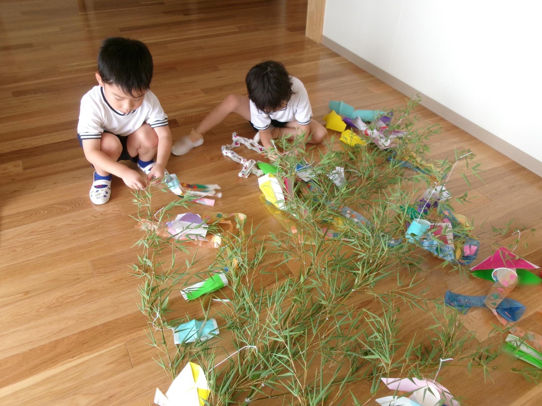 みんなで作った可愛い七夕飾りを笹に飾りつけしました。カラフルですてきな飾りがいっぱい!保育園が更に明るくなりました!