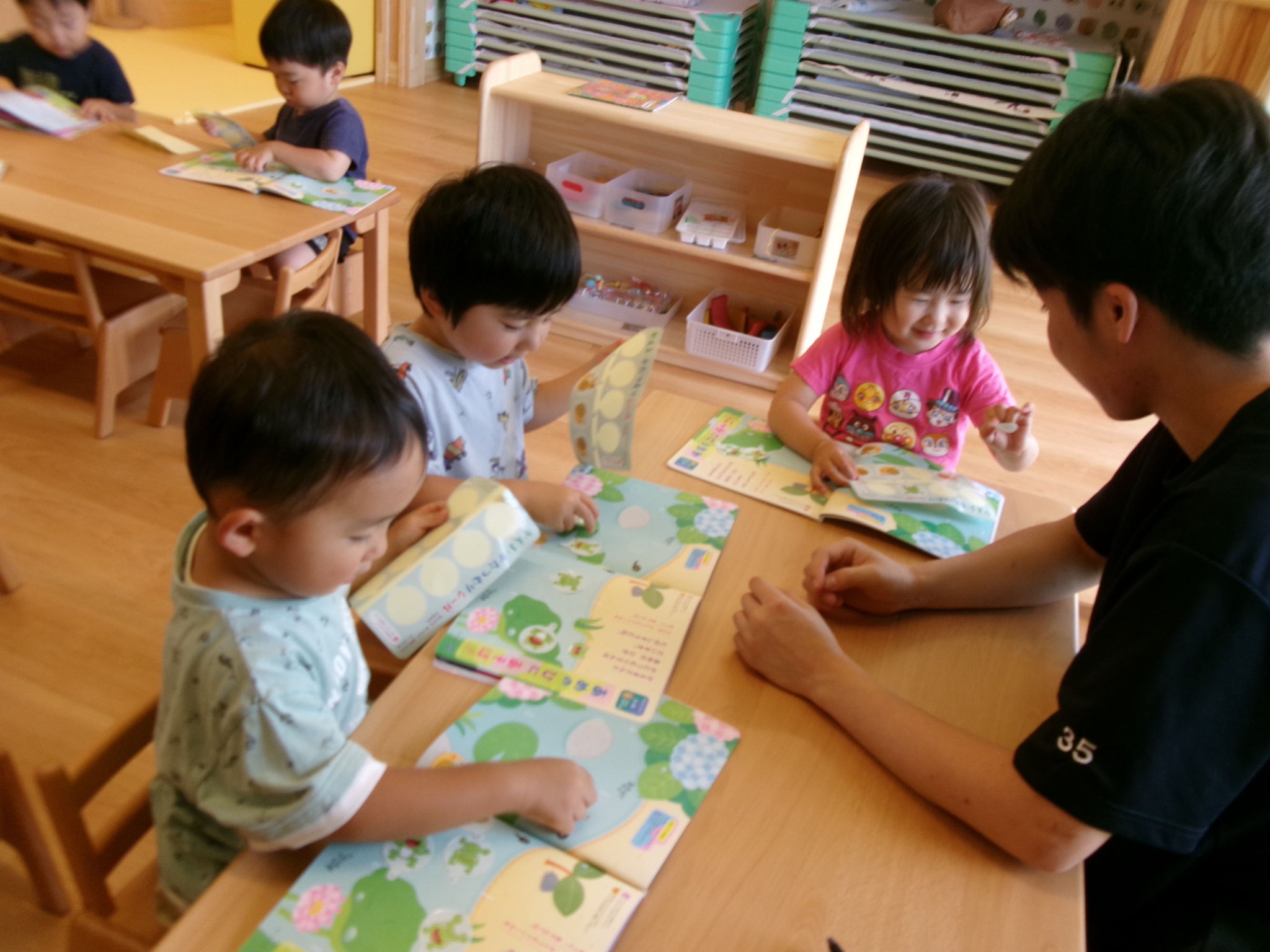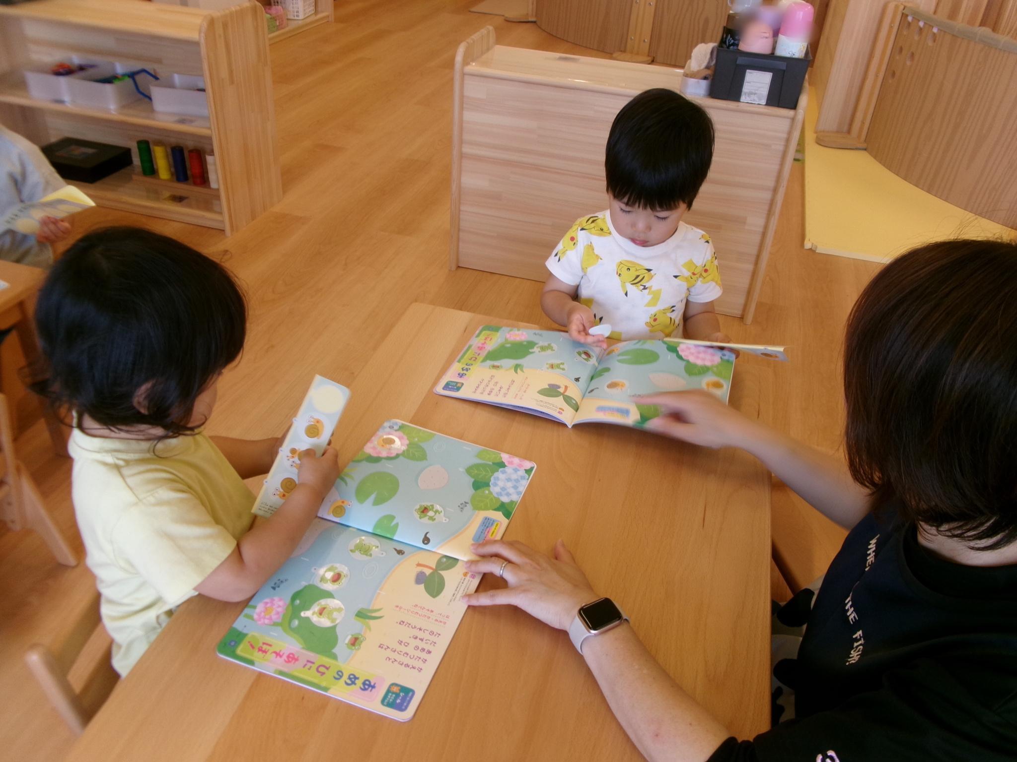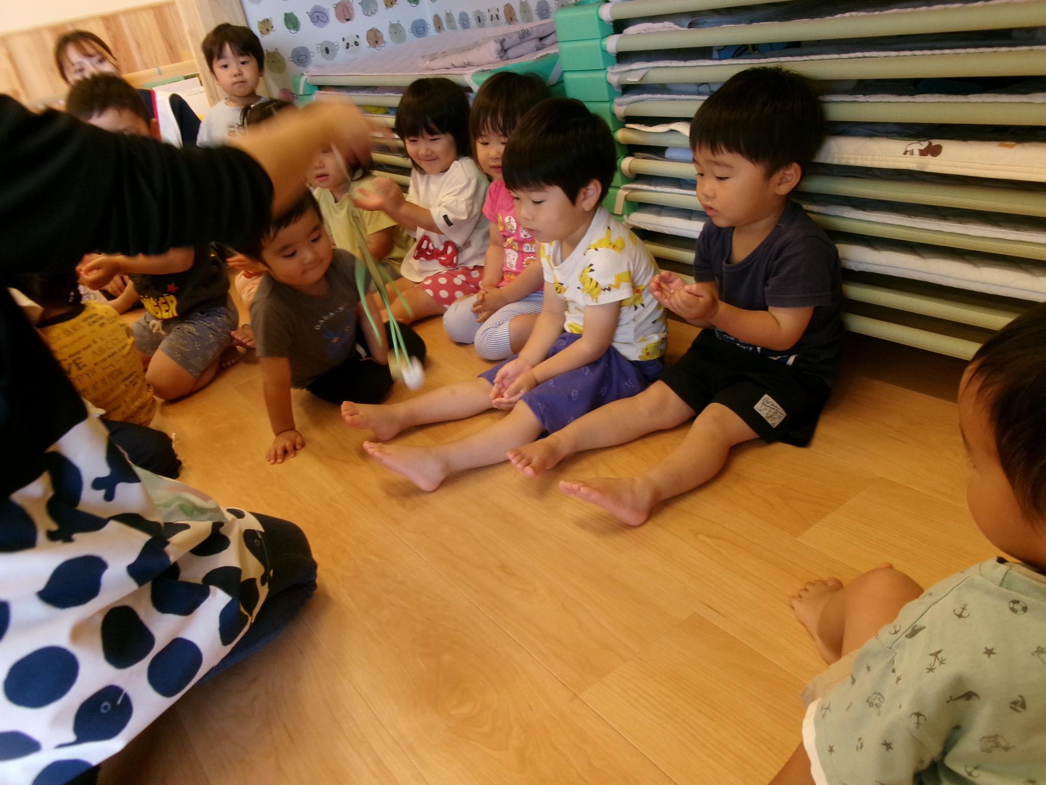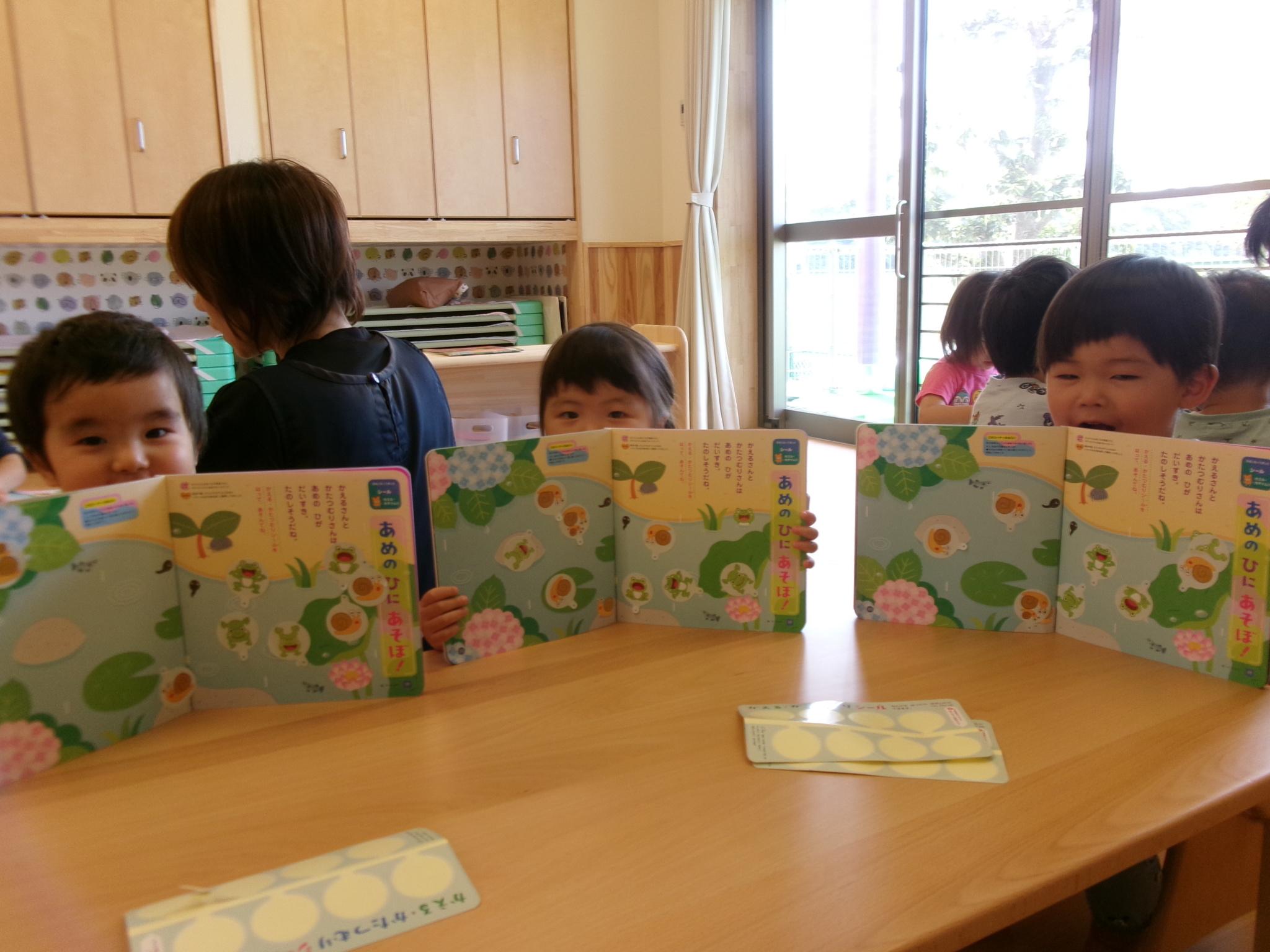 『きゃーろのめだま』に合わせて人形を動かしてわらべうた遊びをした後、シールあそびをしました。カエルがぴょん、かたつむりはここにいる、と水の中やあじさいの花の上にシールを貼って遊びました。