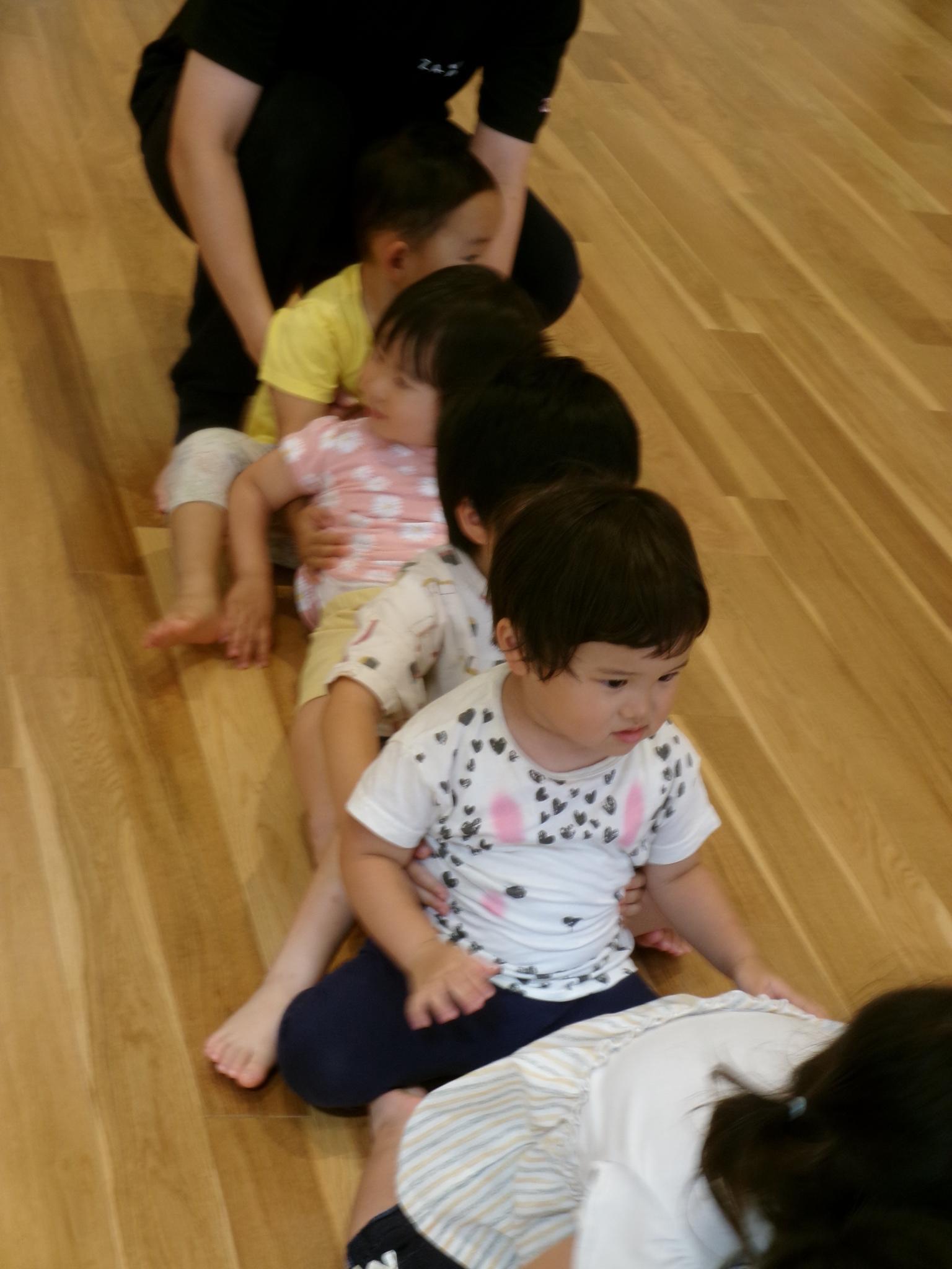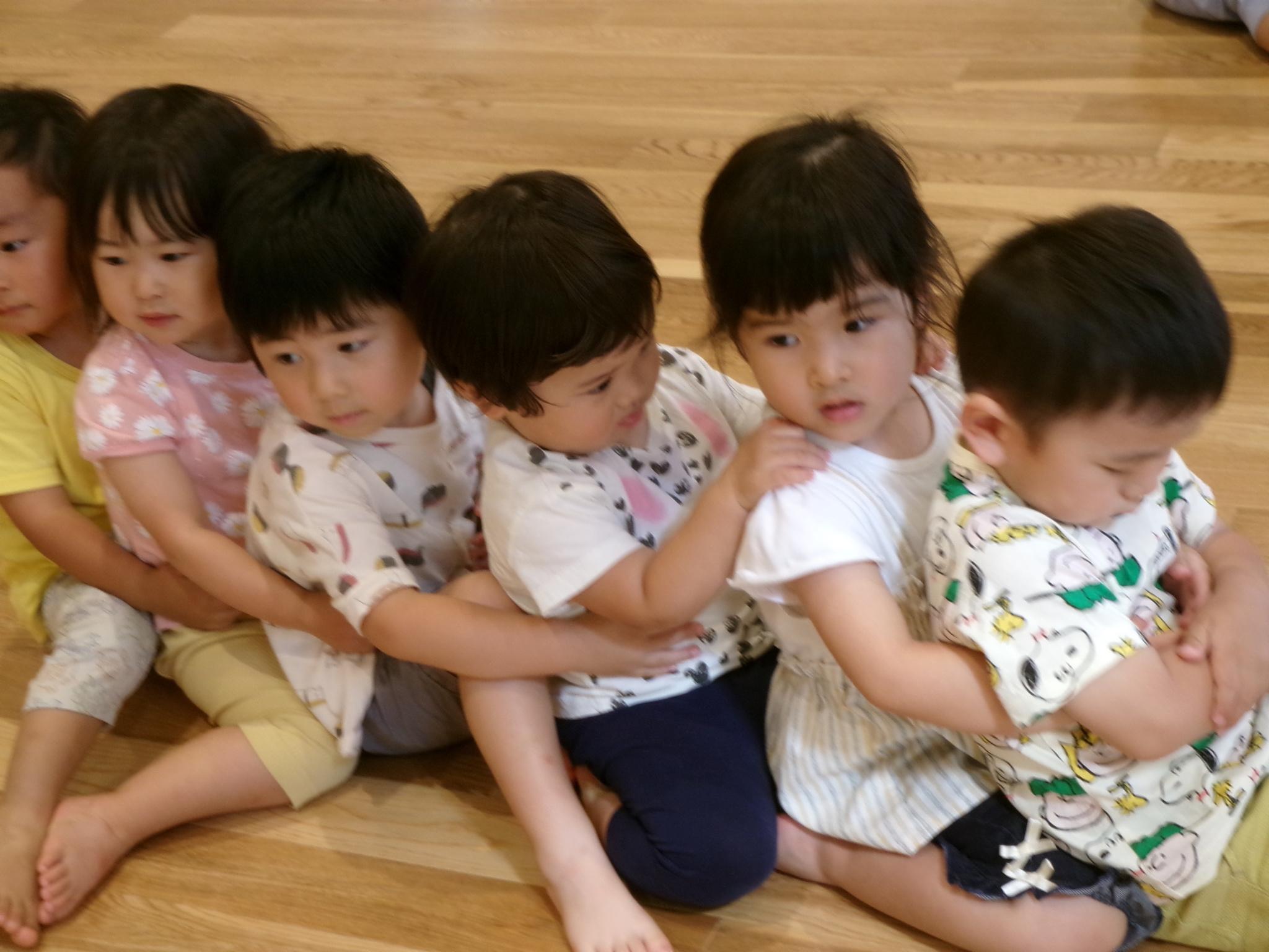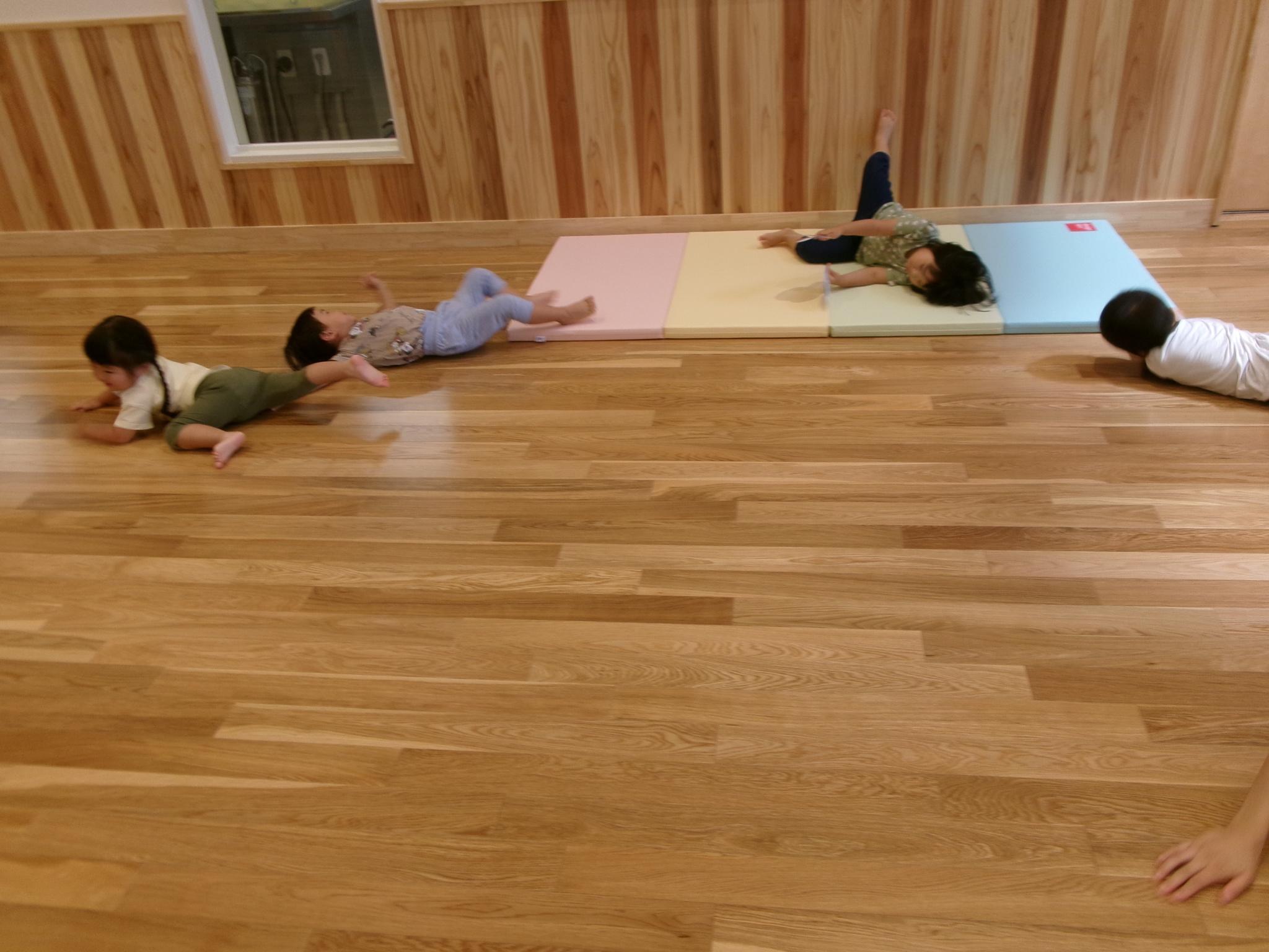 今日からリズムあそびが始まりました。ピアノの音に合わせてウサギやカエルになってぴょんぴょん跳ねたり、どんぐりのようにコロコロ床に転がりました。これから体を動かして楽しんでいきます。