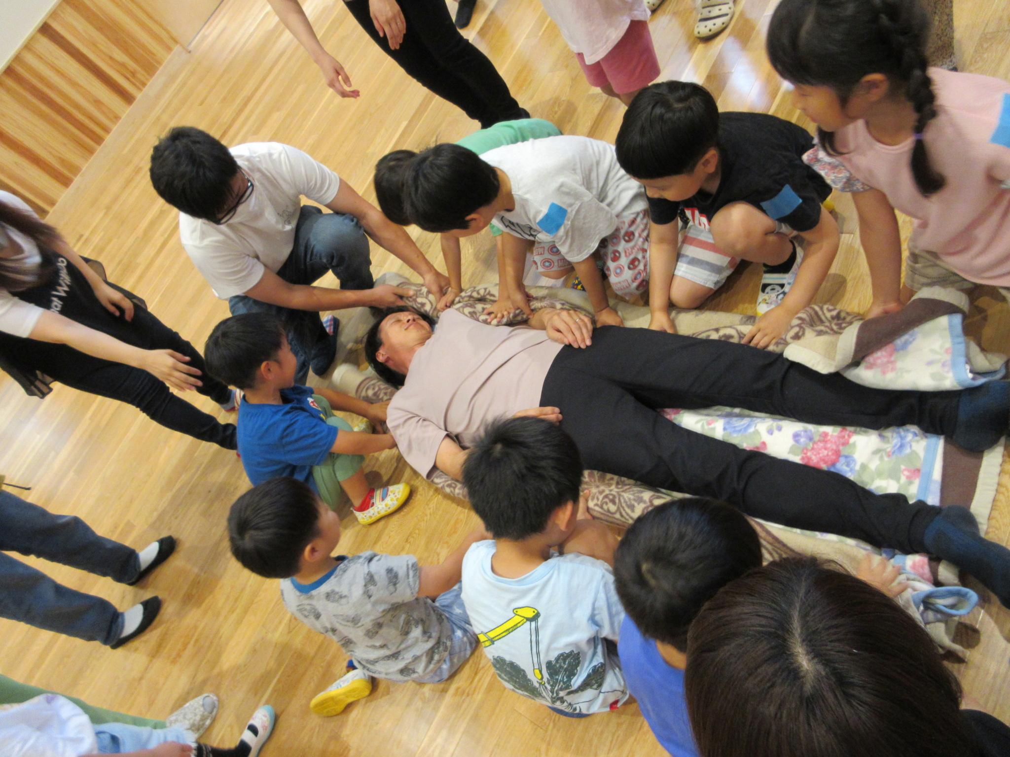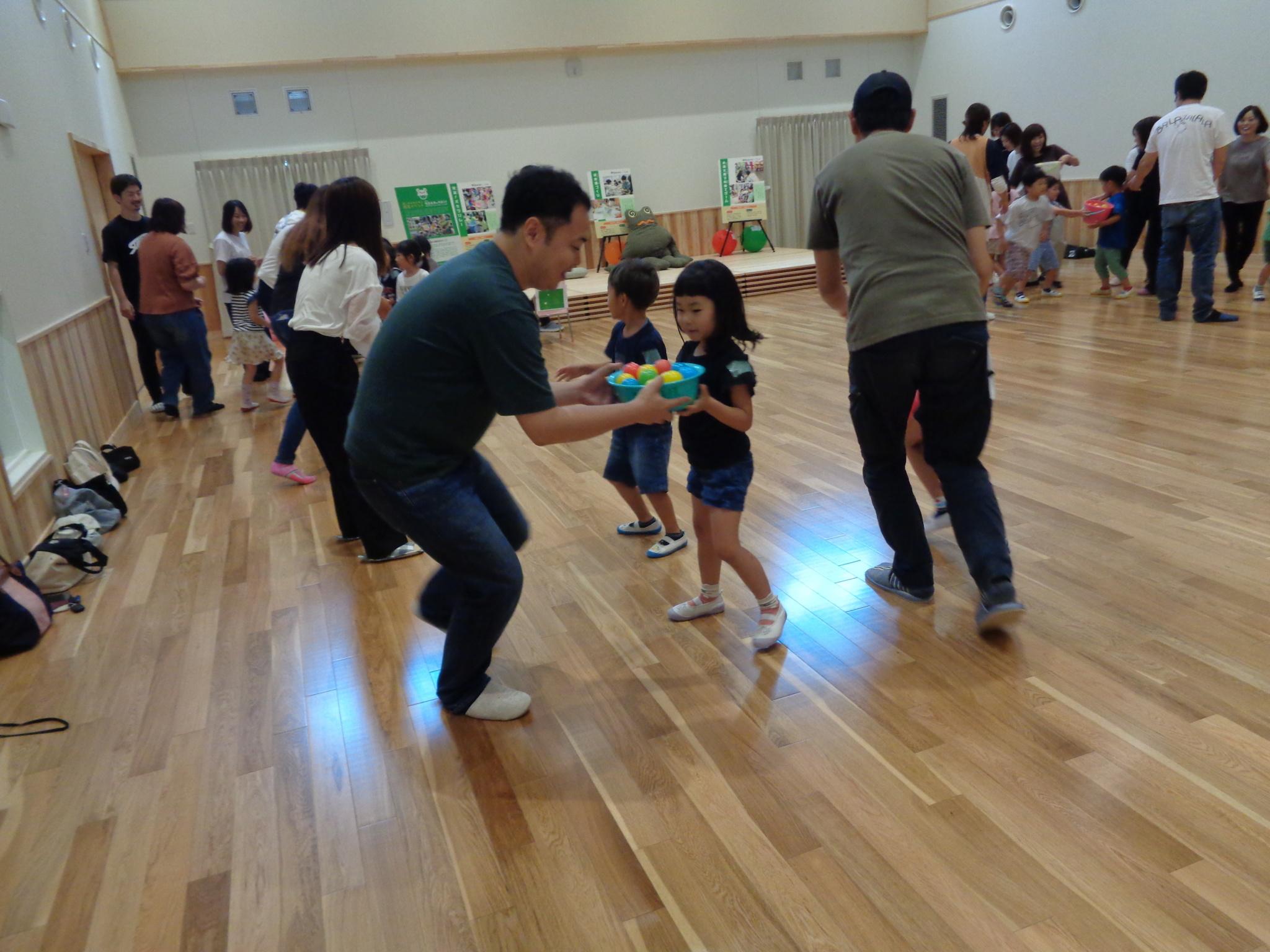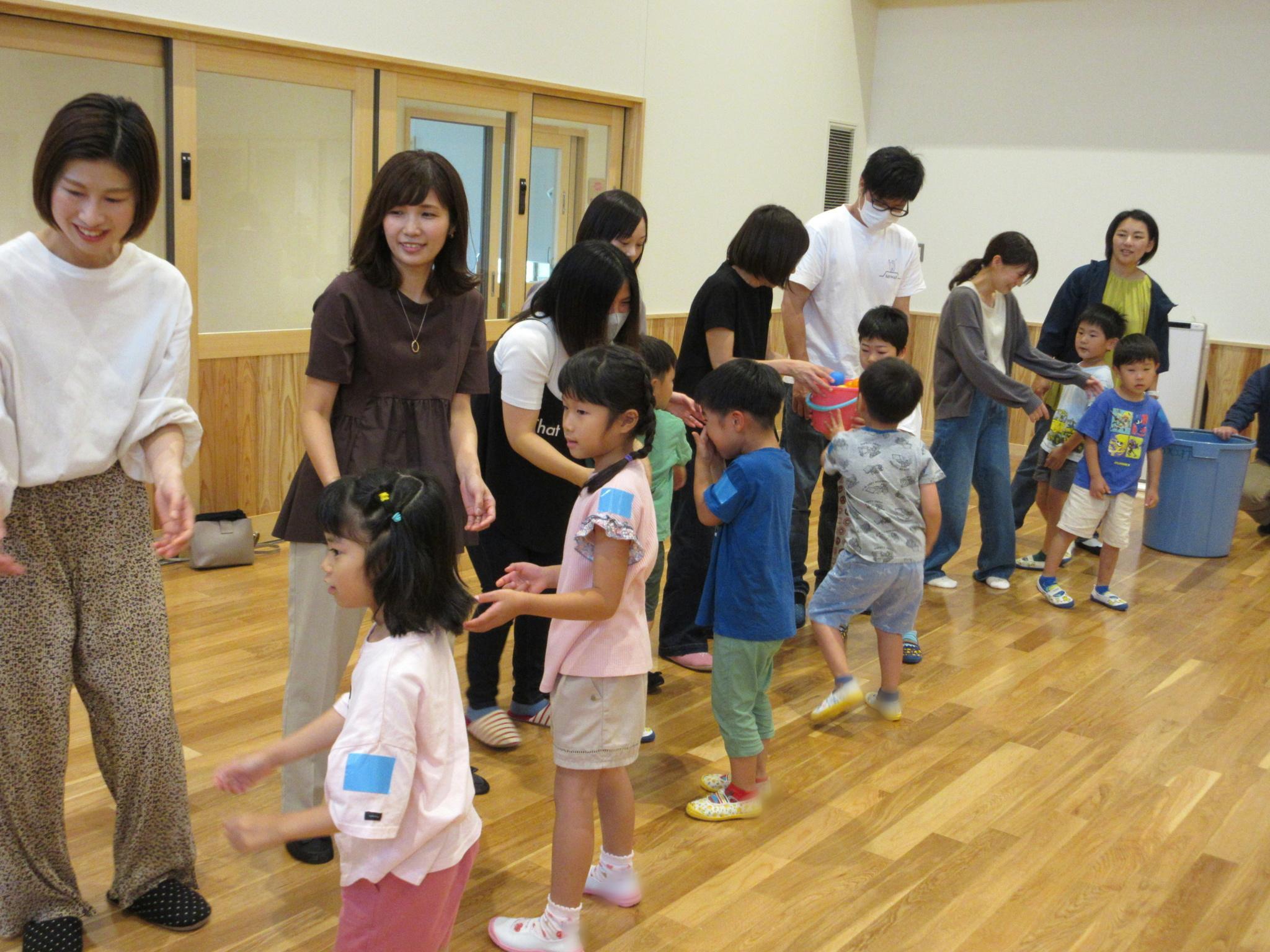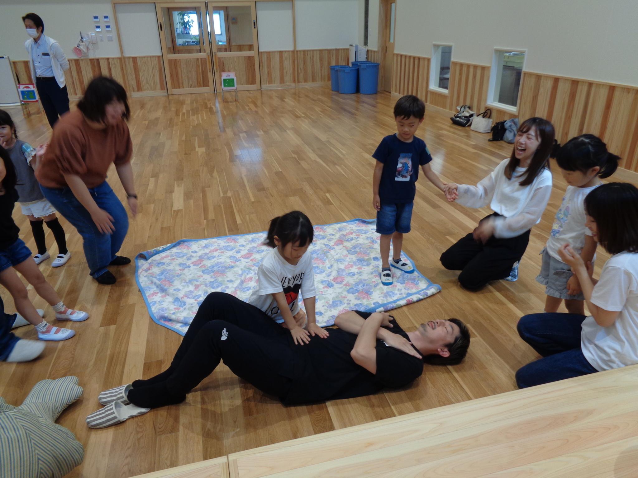 今日からリズムあそびが始まりました。ピアノの音に合わせてウサギやカエルになってぴょんぴょん跳ねたり、どんぐりのようにコロコロ床に転がりました。これから体を動かして楽しんでいきます。