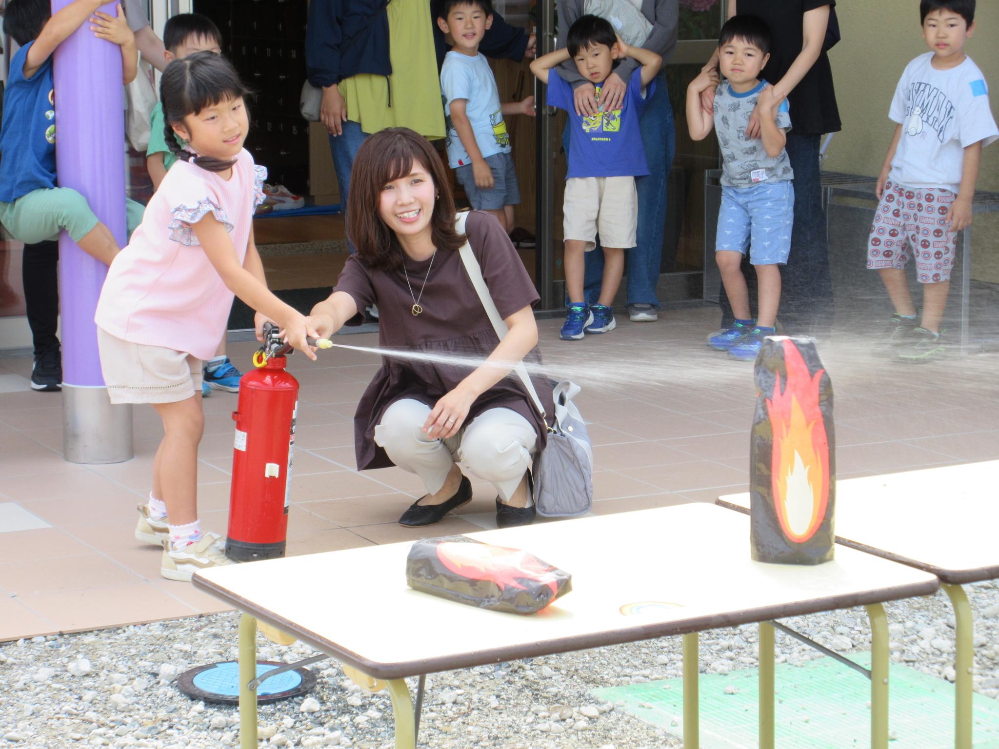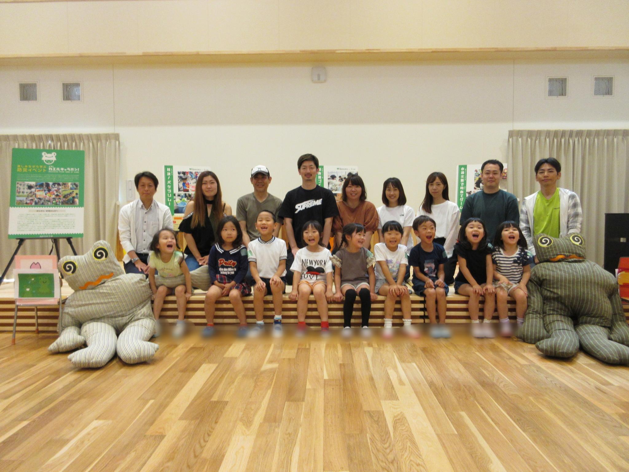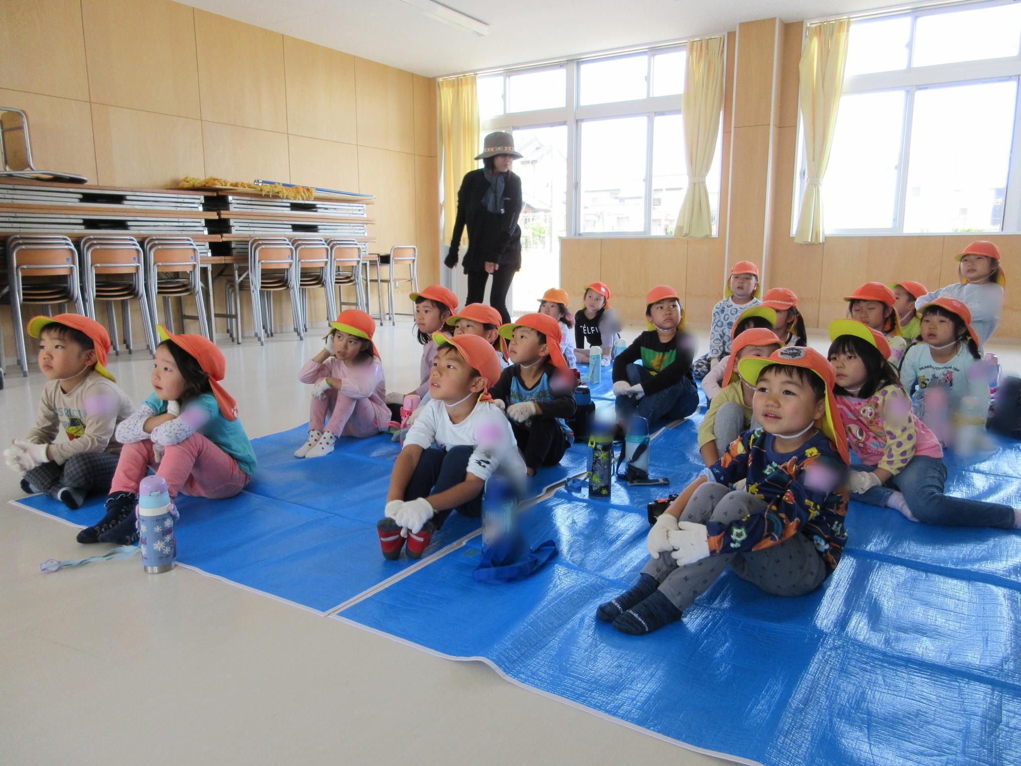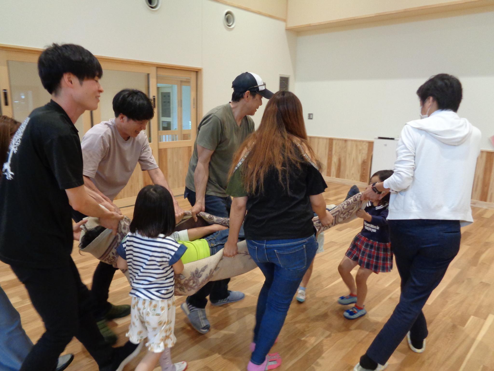 今日は親子で「イザ!カエルキャラバン」主催の防災体験を行いました。水消火器を手に消防士になりきり狙いを定め消火訓練をしたり、毛布担架やバケツリレーをして楽しみました。防災について学ぶ良い機会になりました。お忙しい中参観会へご参加いただきありがとうございました!