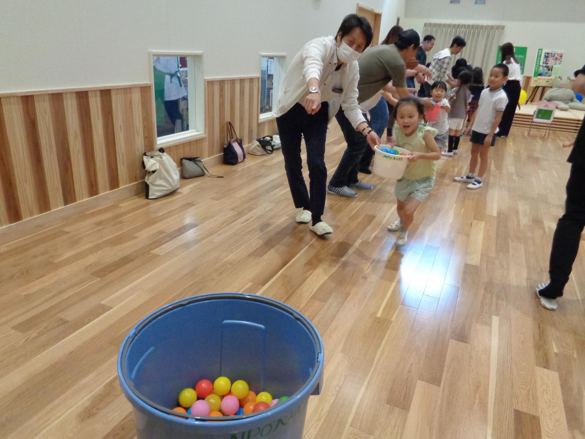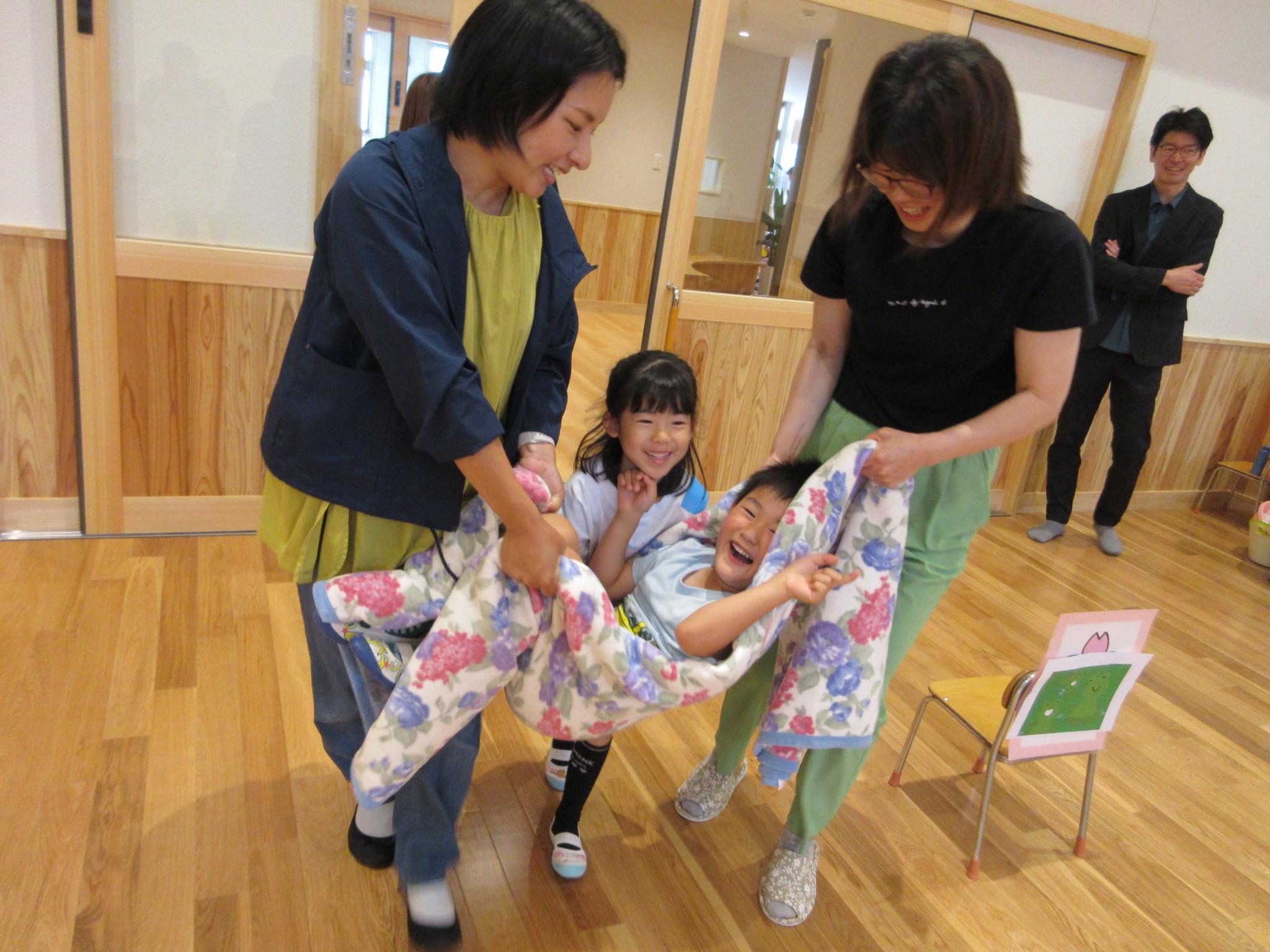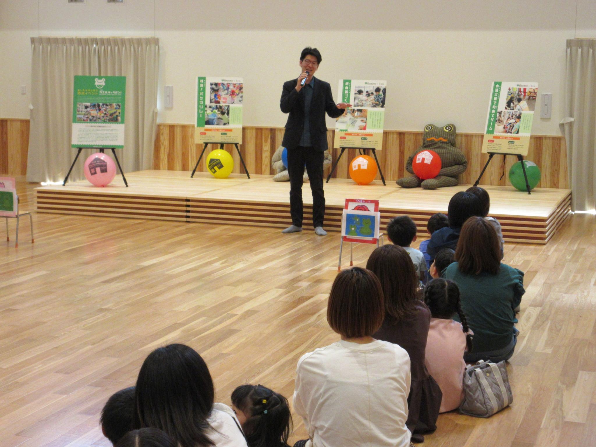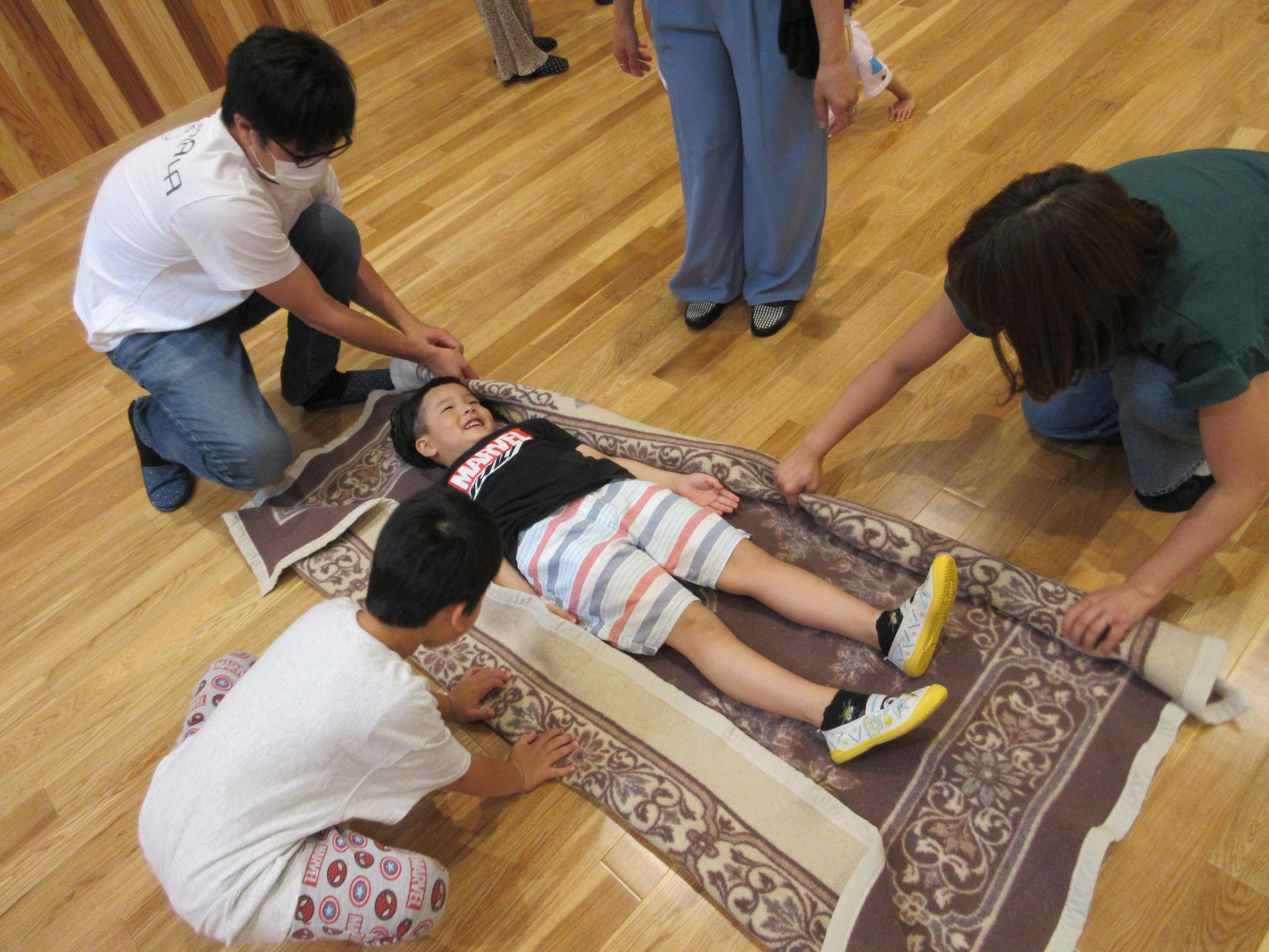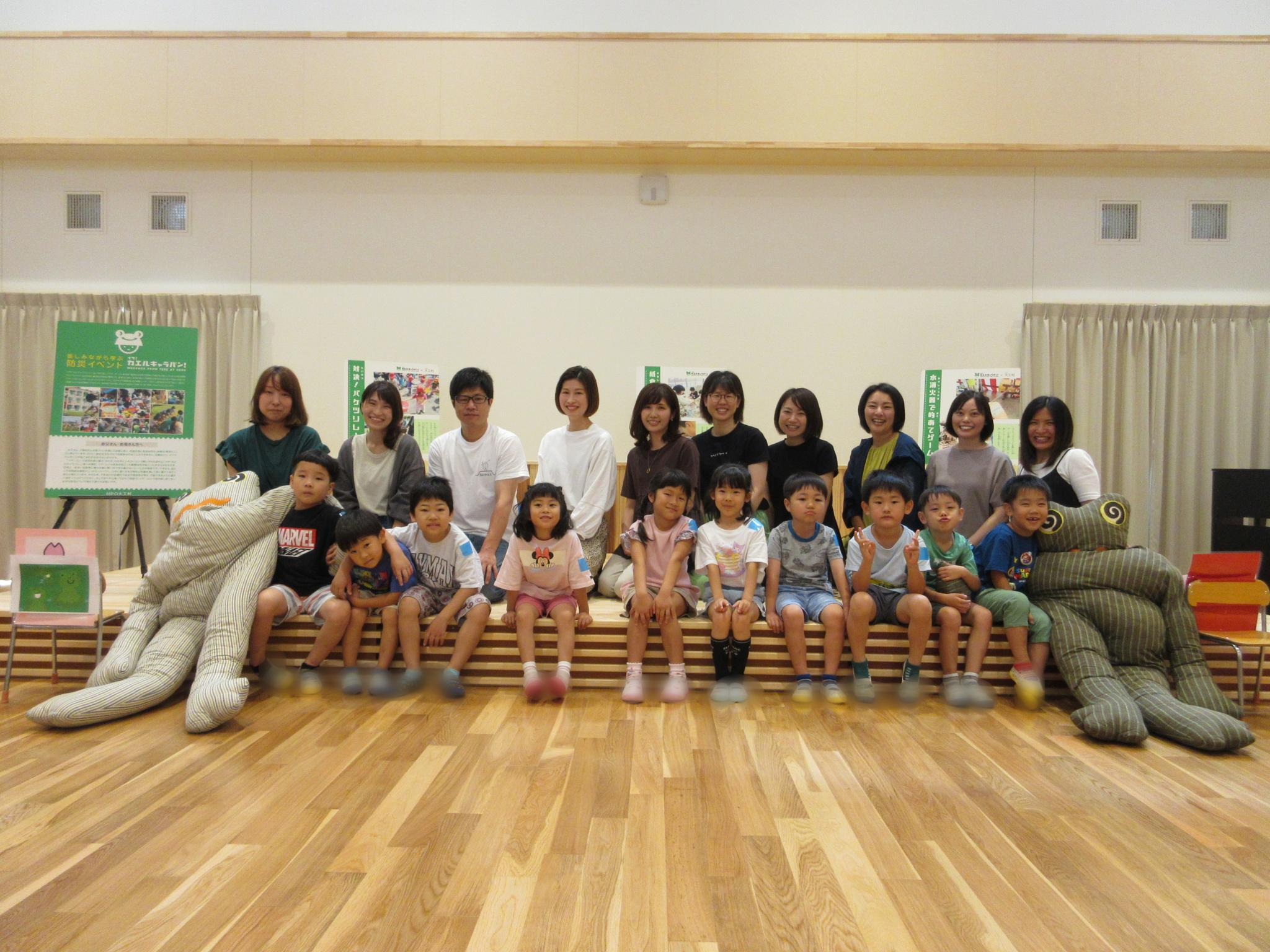 今日は親子で「イザ!カエルキャラバン」主催の防災体験を行いました。水消火器を手に消防士になりきり狙いを定め消火訓練をしたり、毛布担架やバケツリレーをして楽しみました。防災について学ぶ良い機会になりました。お忙しい中参観会へご参加いただきありがとうございました!