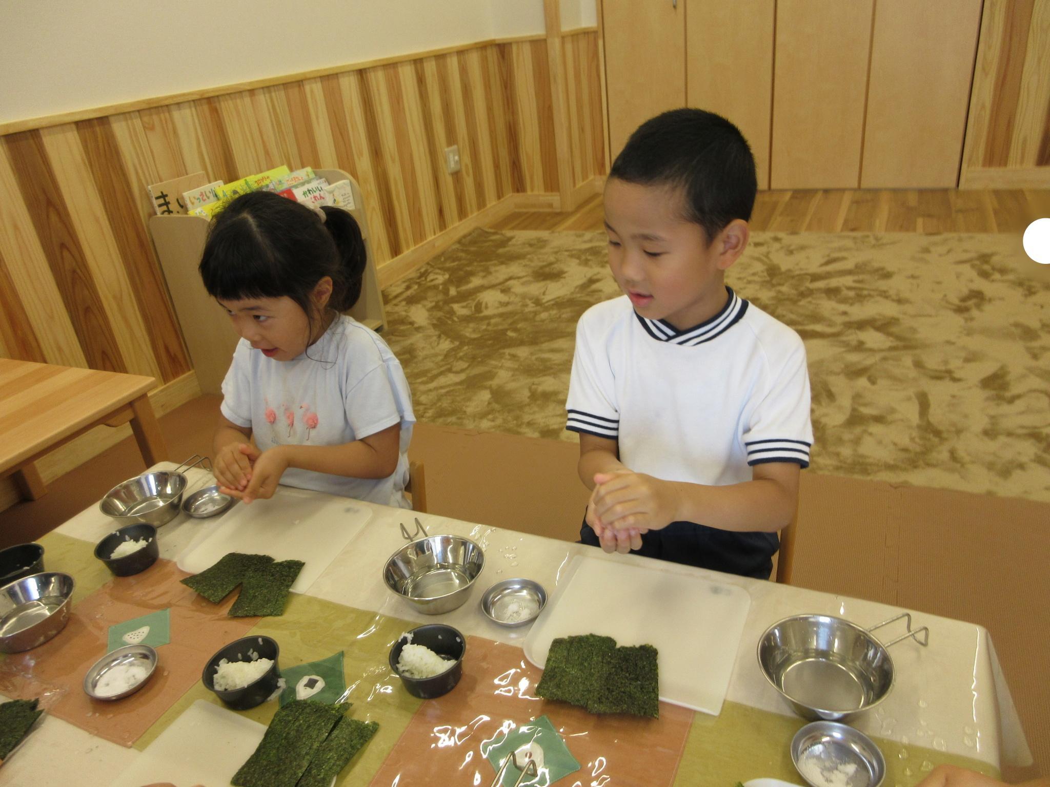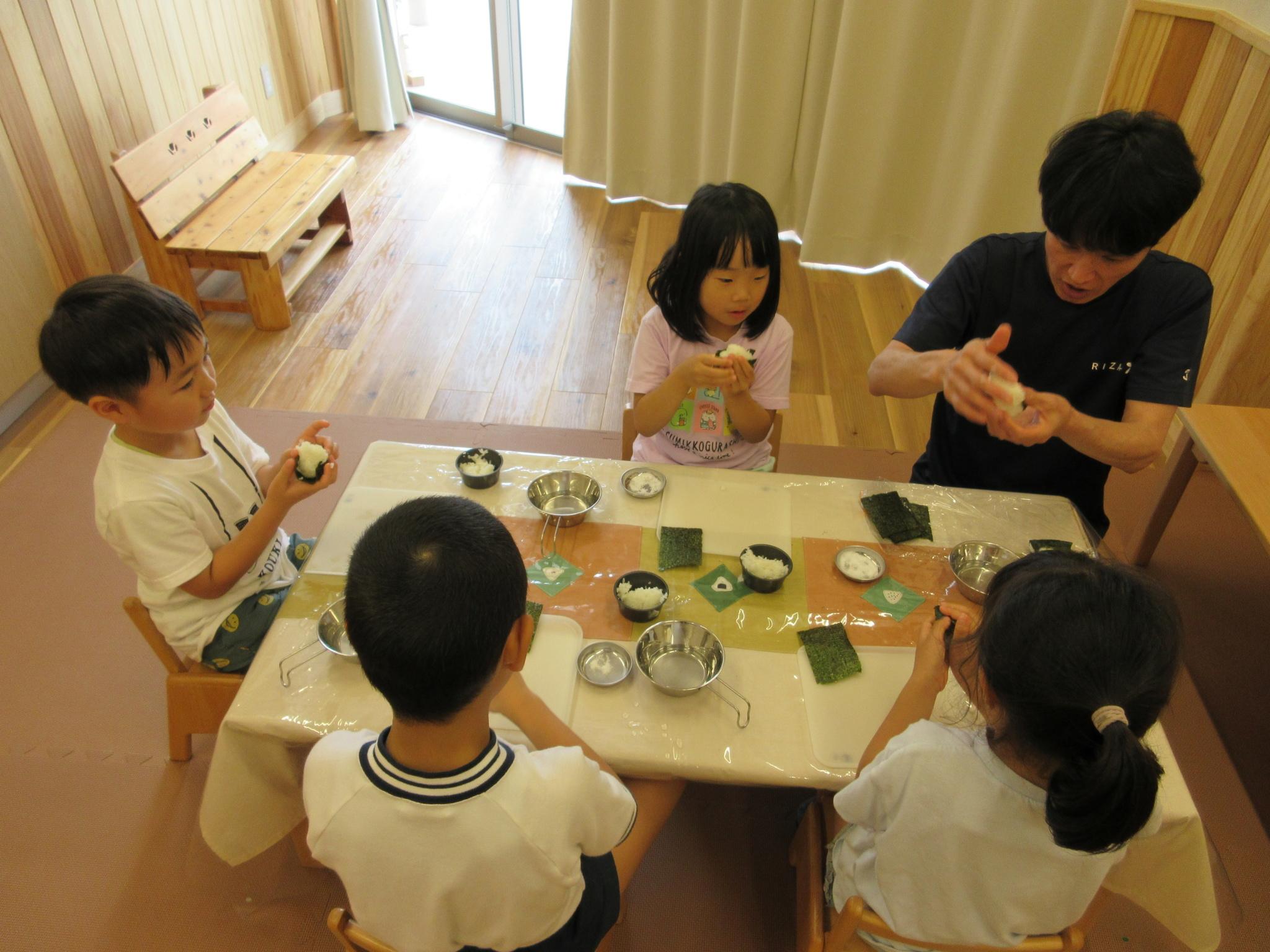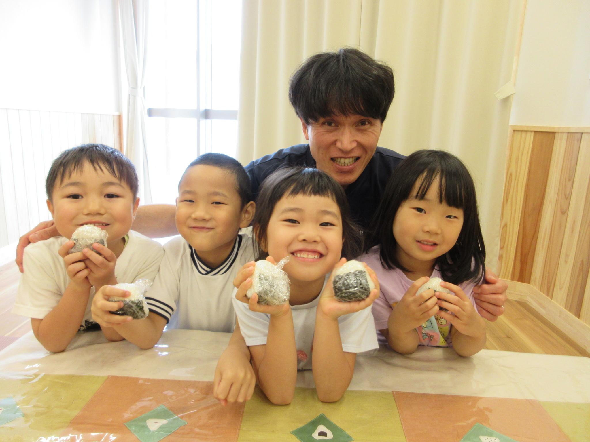 「家でも作って食べようかなあ~」「お母さんと同じくらいおいしい~」「わぁ~いい匂い~」体全体でおにぎりを感じている子どもたちです。