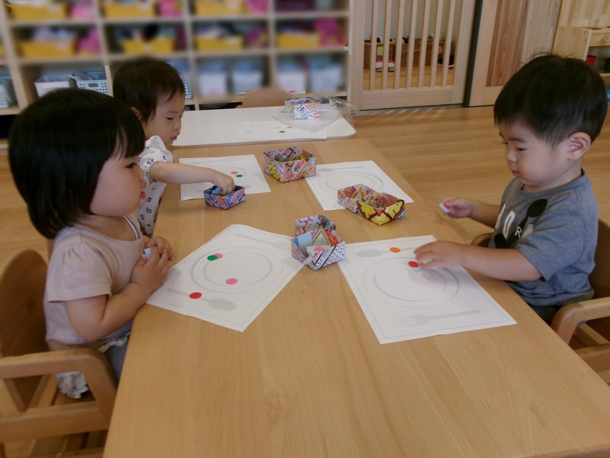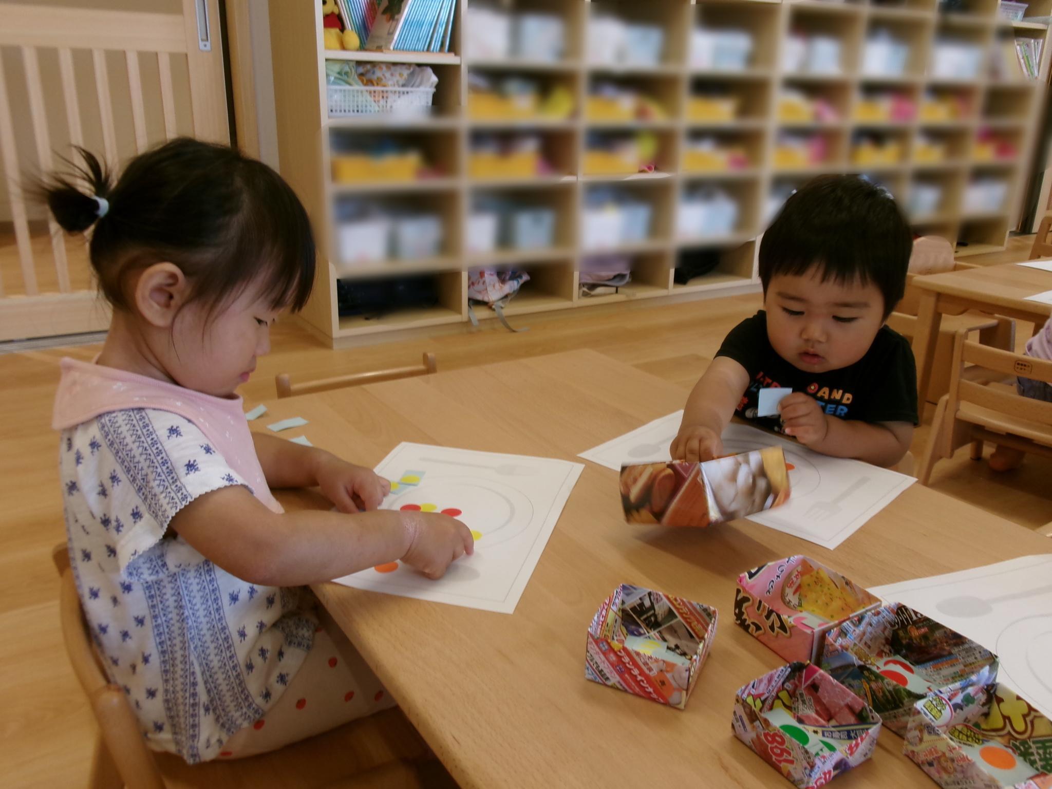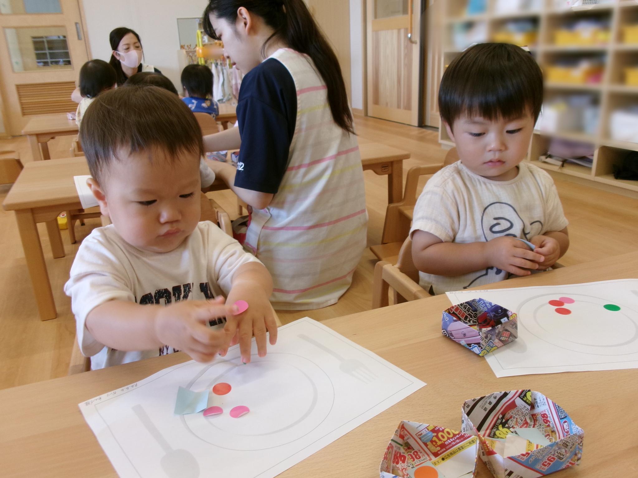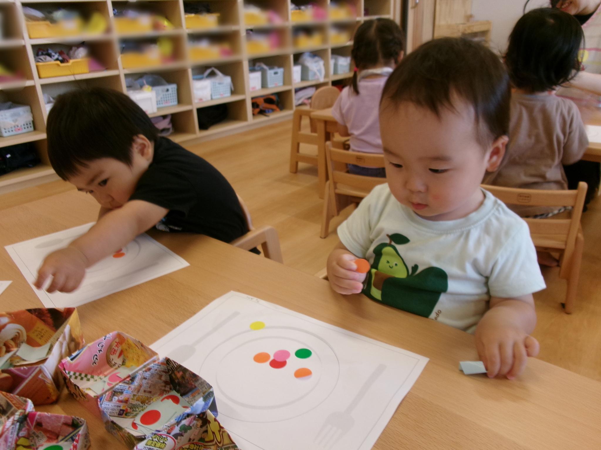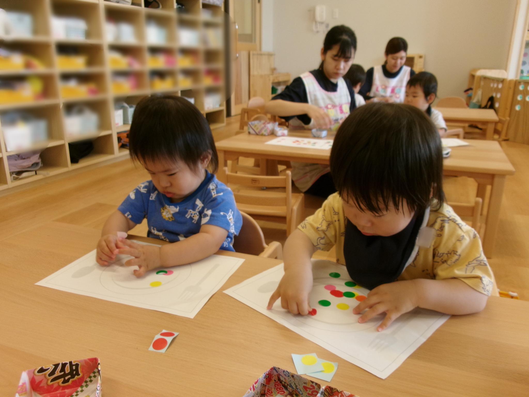 2回目のシールあそび。お皿の絵に食べ物に見立てたシールを貼りました!おいしそうなごちそうができました!