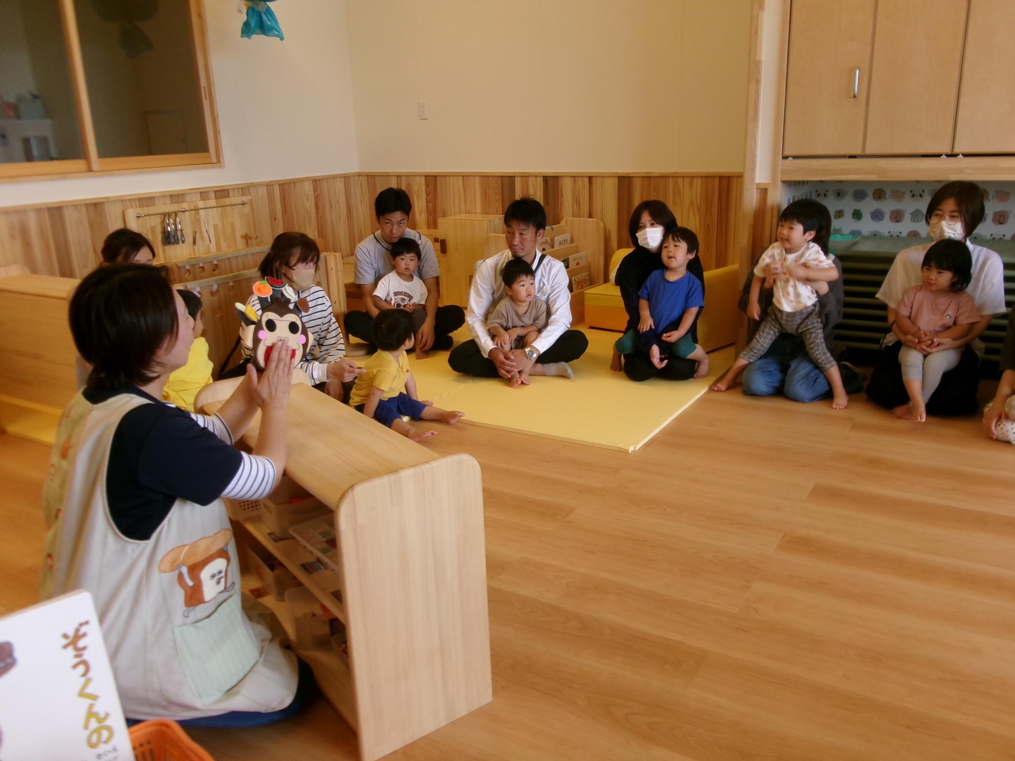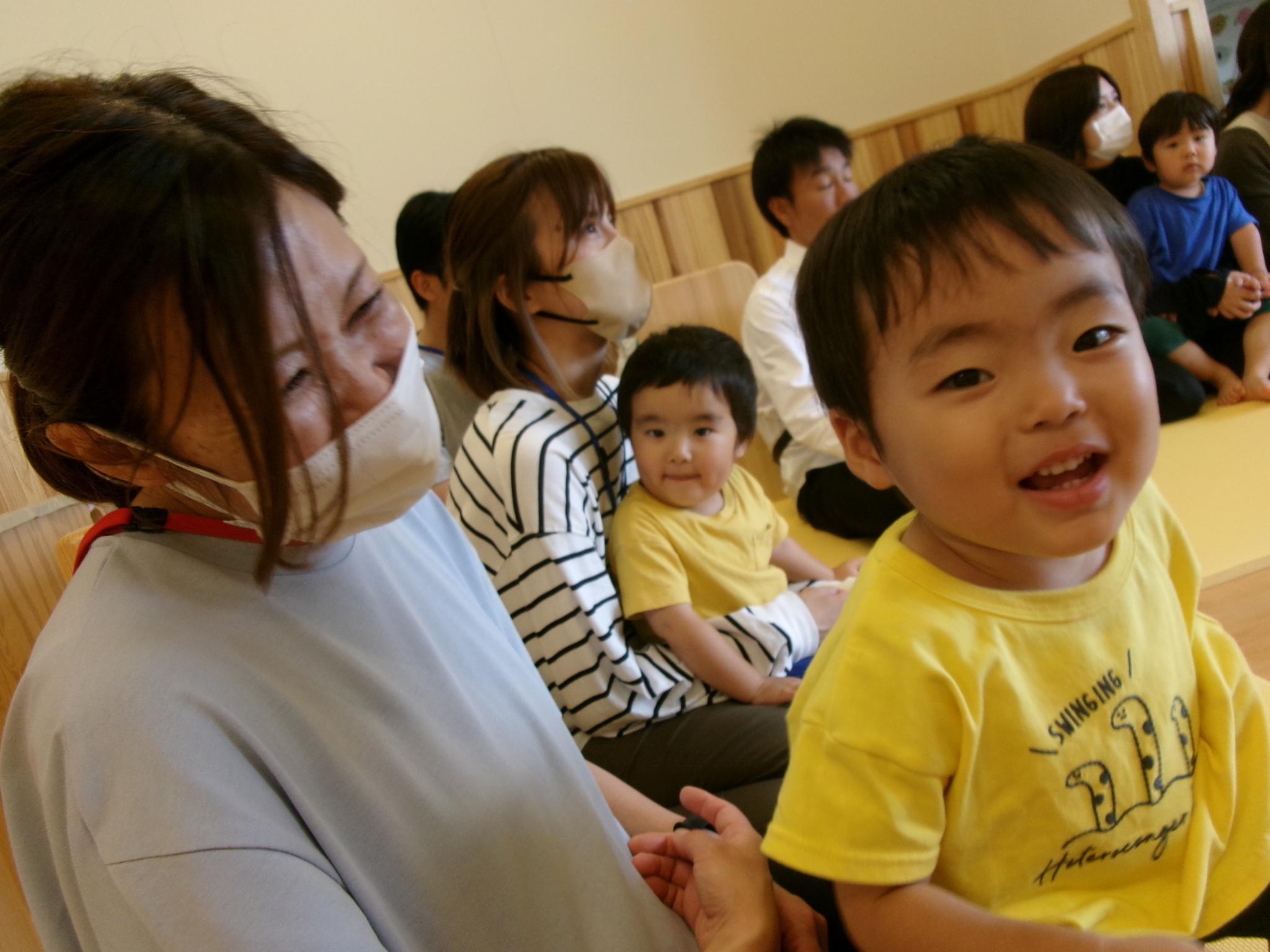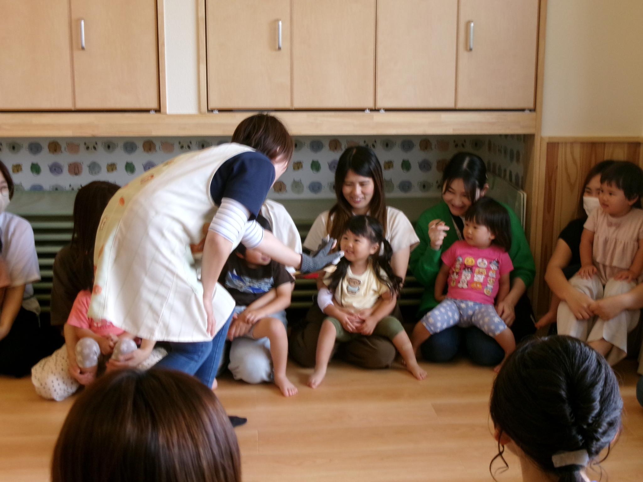 お家の方と一緒におやつを食べたり、大型絵本や手袋シアターを見たりふれあい遊びをしました。大好きなお父さんお母さんと一緒でとっても嬉しそうな子どもたち。ニコニコ笑顔がたくさん見られました。お忙しい中ご参加いただきありがとうございました。