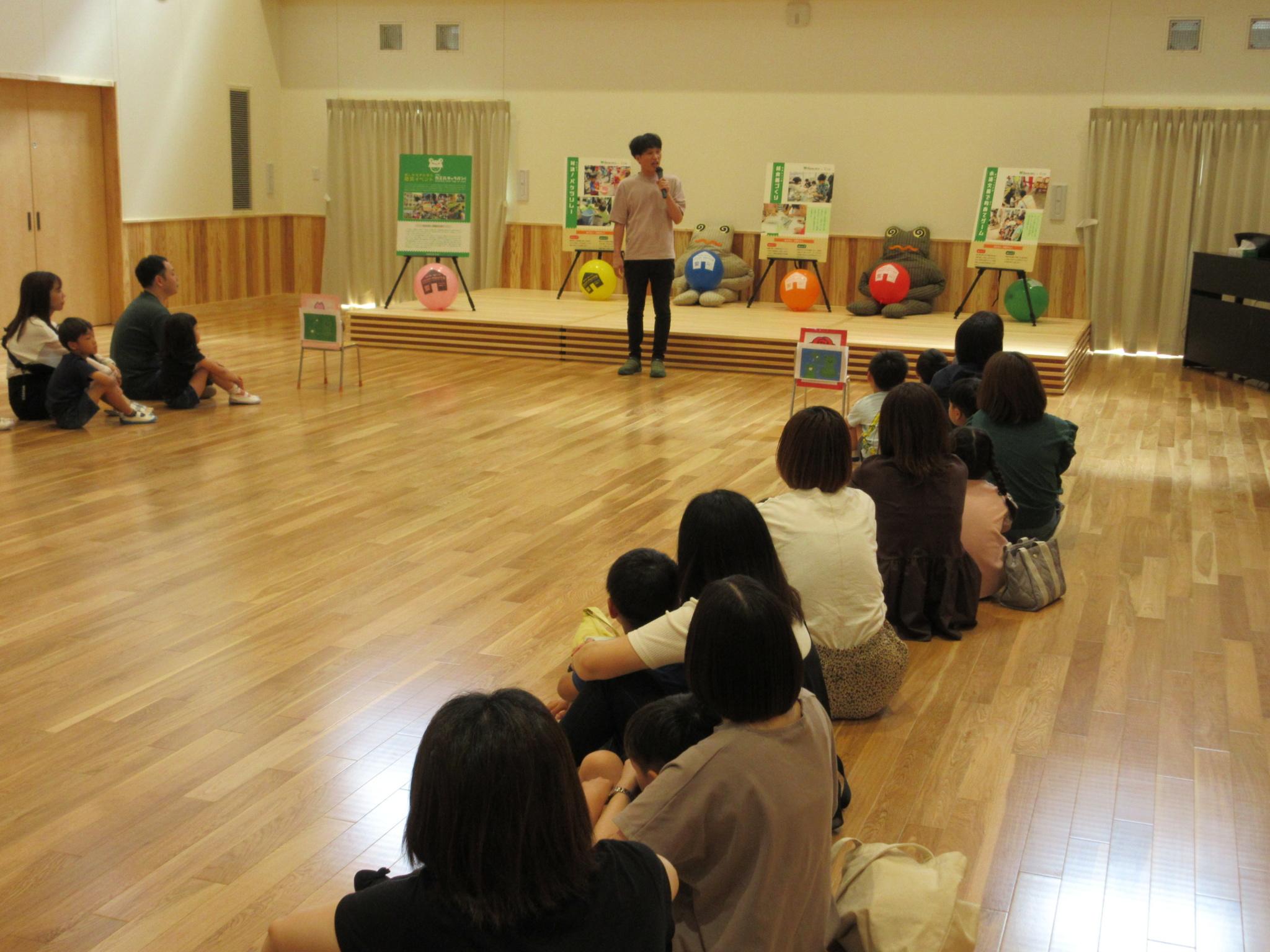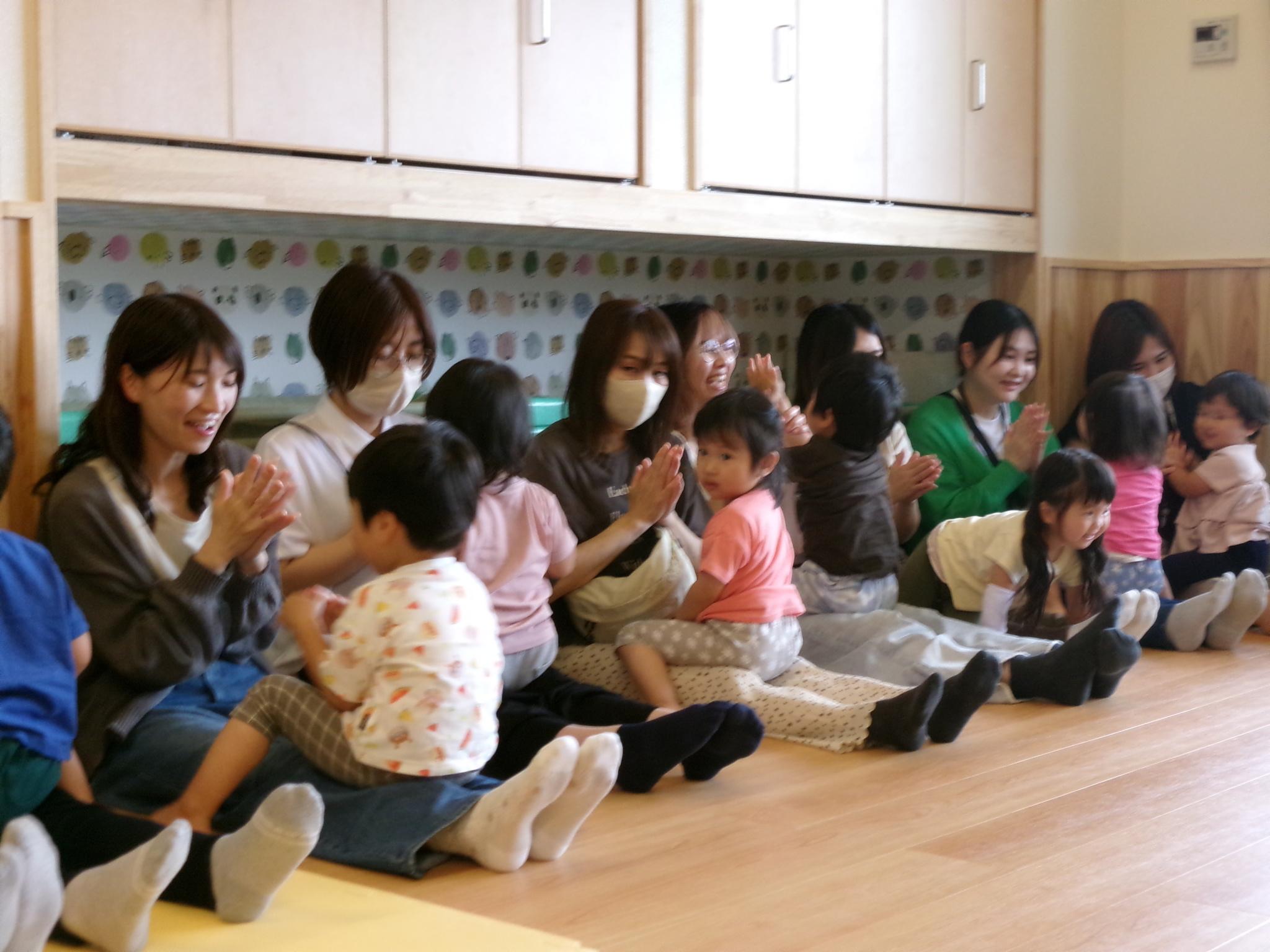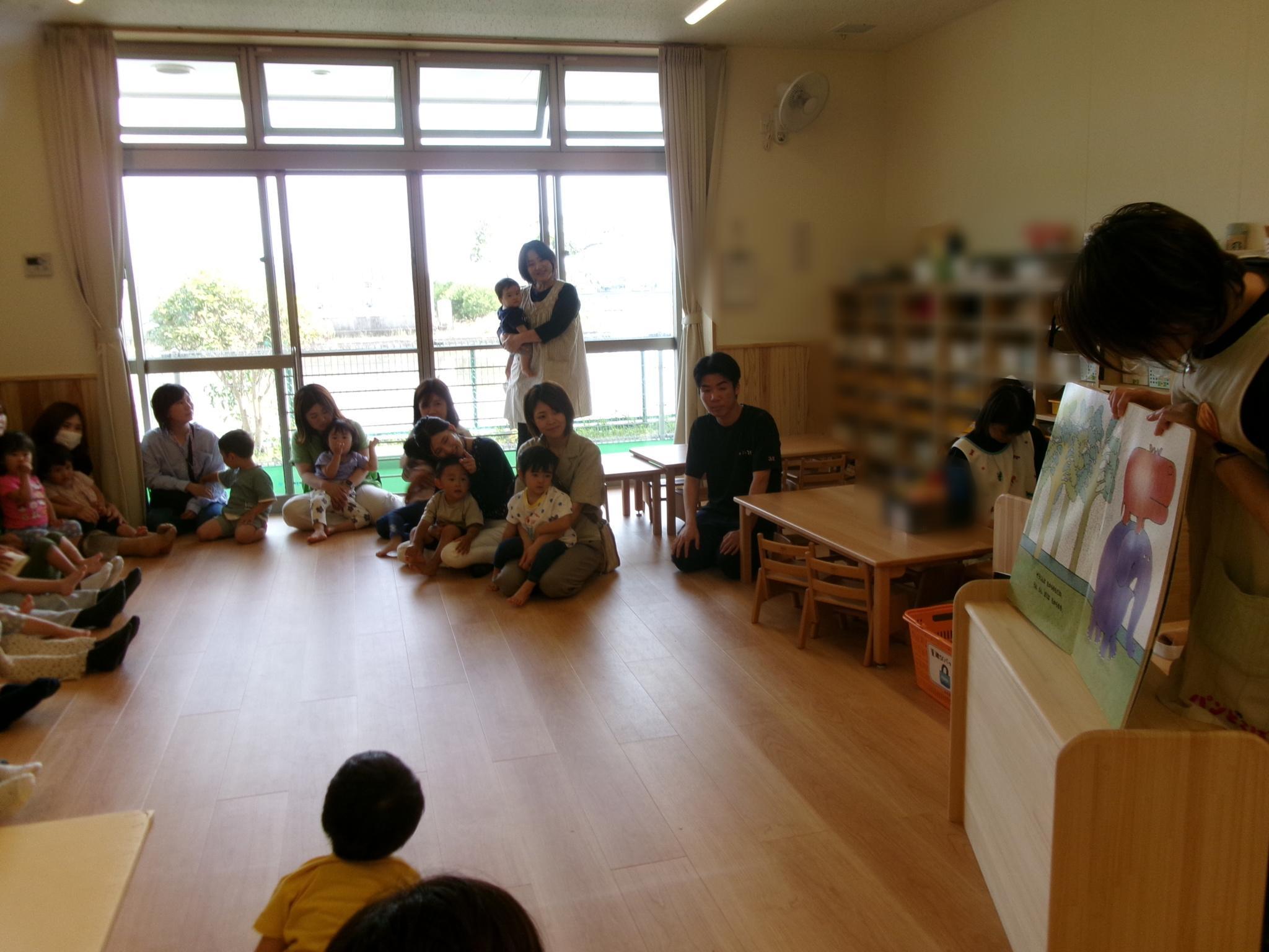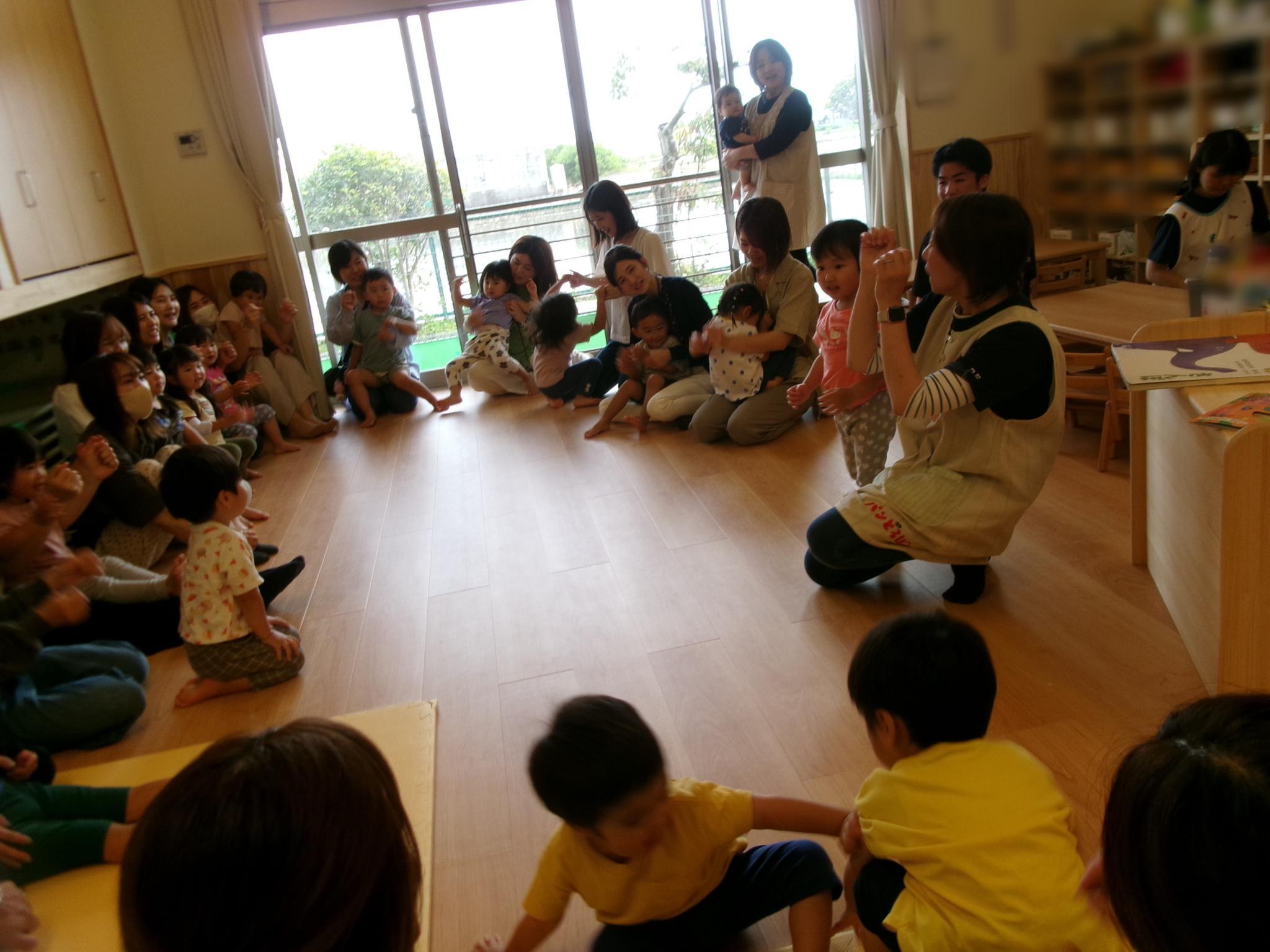 お家の方と一緒におやつを食べたり、大型絵本や手袋シアターを見たりふれあい遊びをしました。大好きなお父さんお母さんと一緒でとっても嬉しそうな子どもたち。ニコニコ笑顔がたくさん見られました。お忙しい中ご参加いただきありがとうございました。