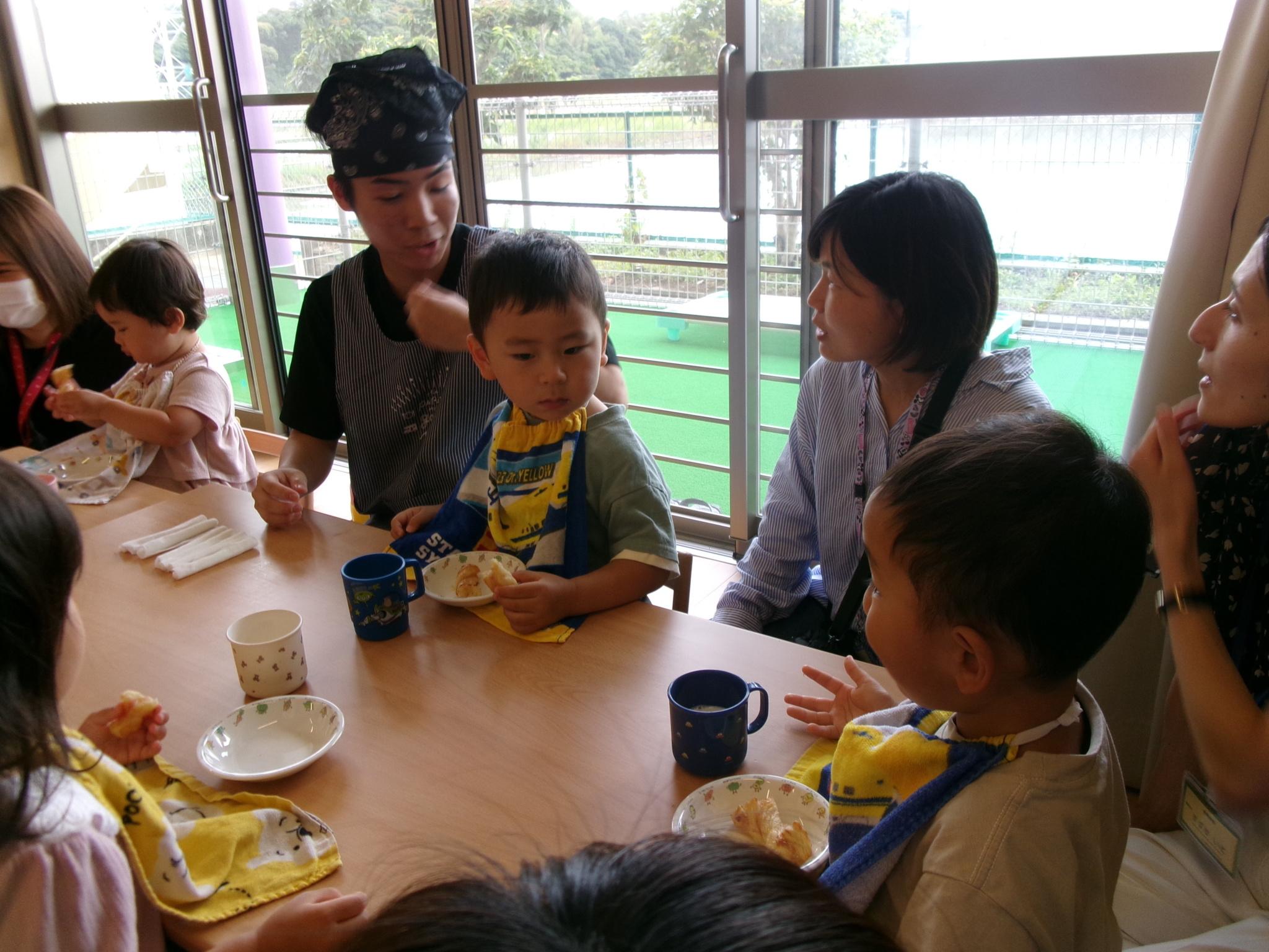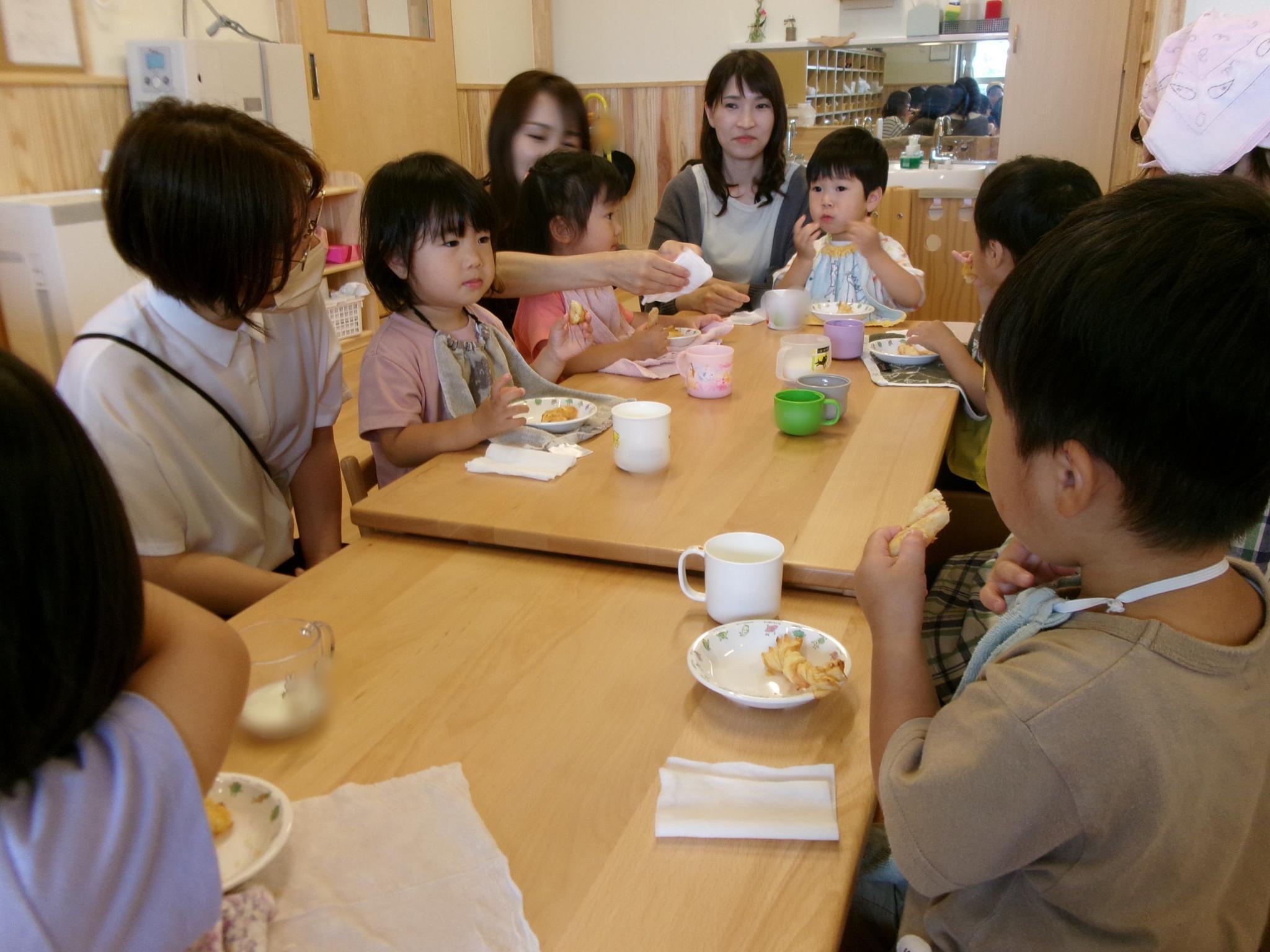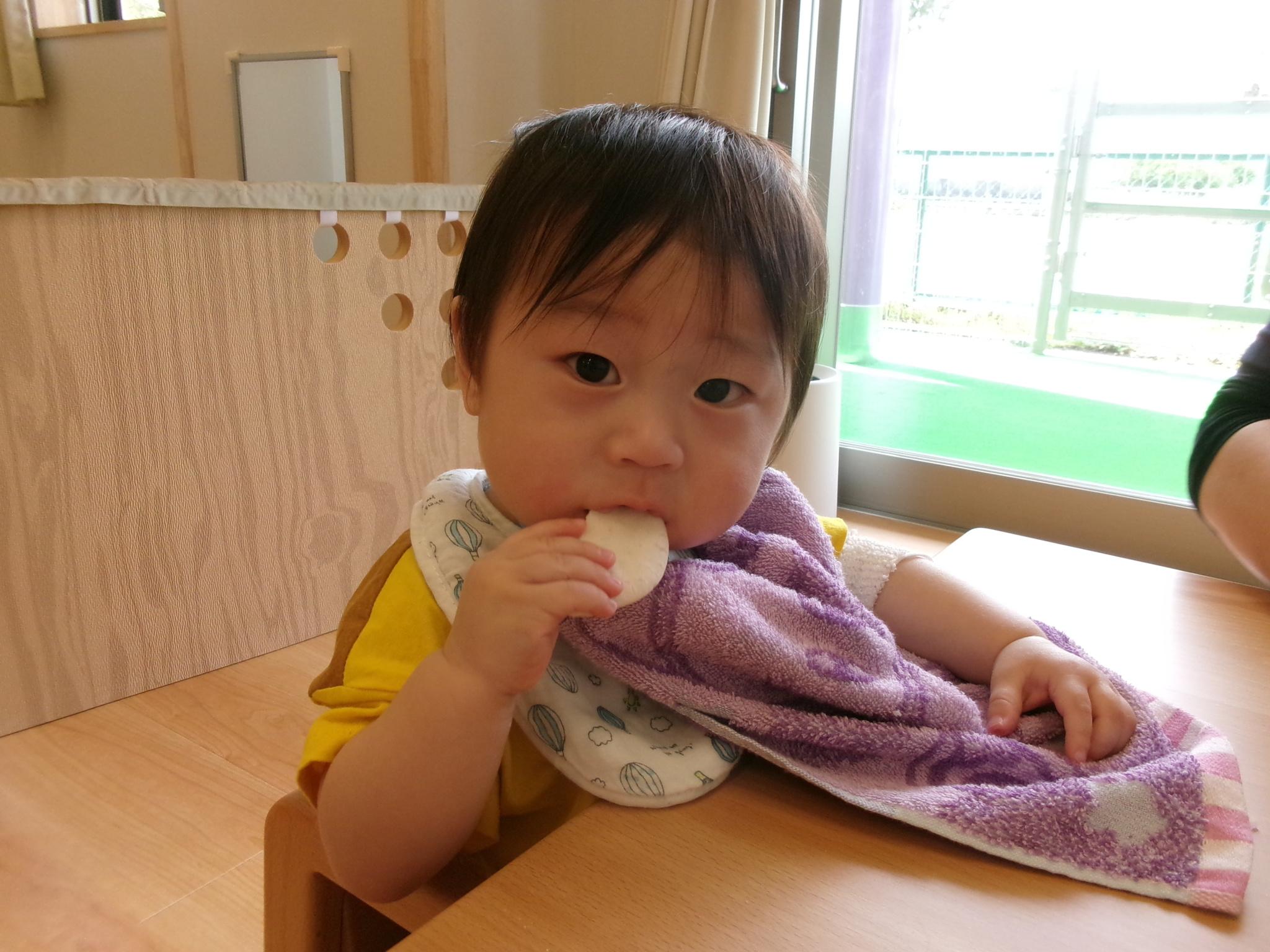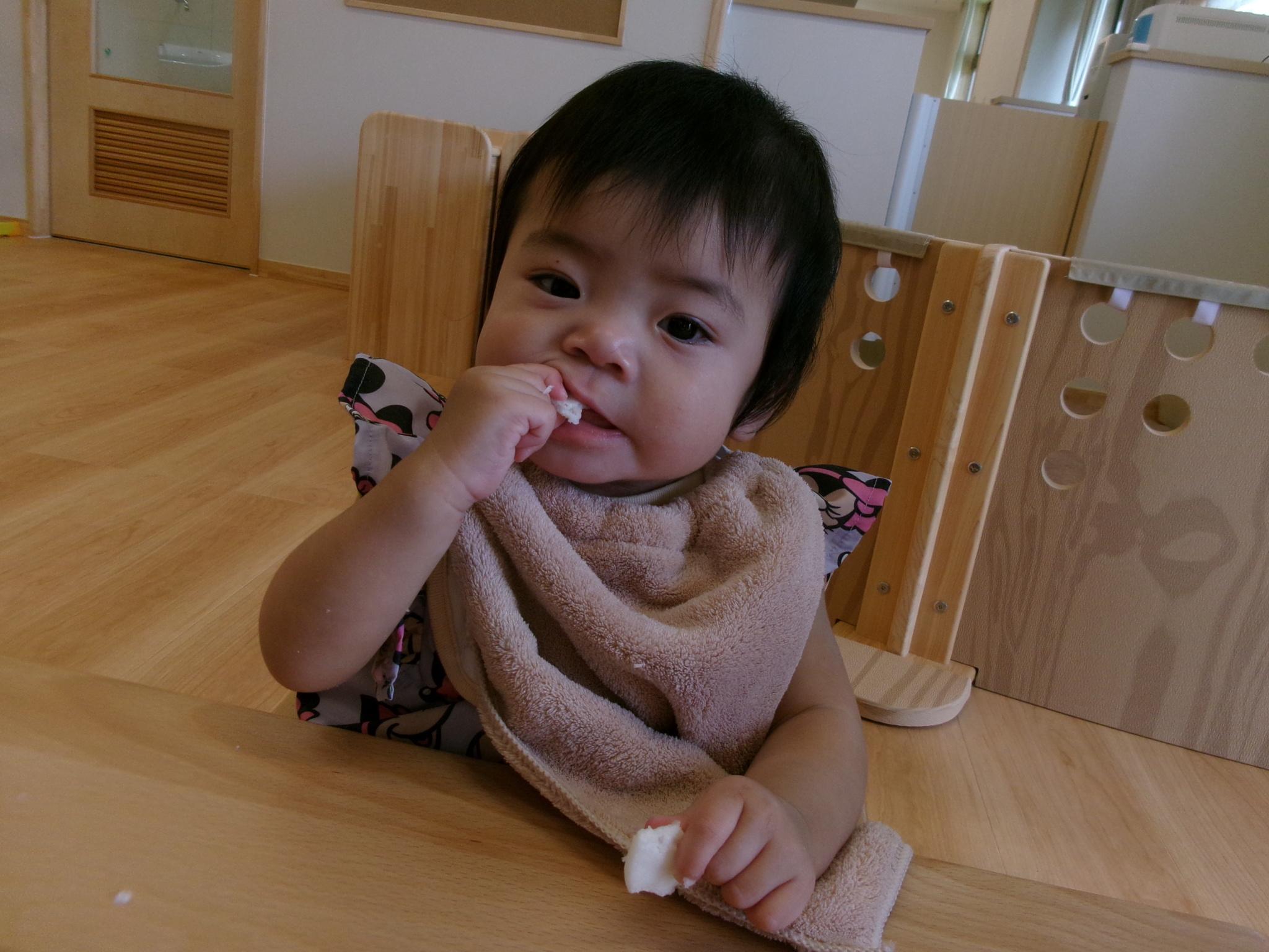 午前中のおやつタイム!!椅子に座って食べられるようになりました。みんなで食べるとおいしいね!