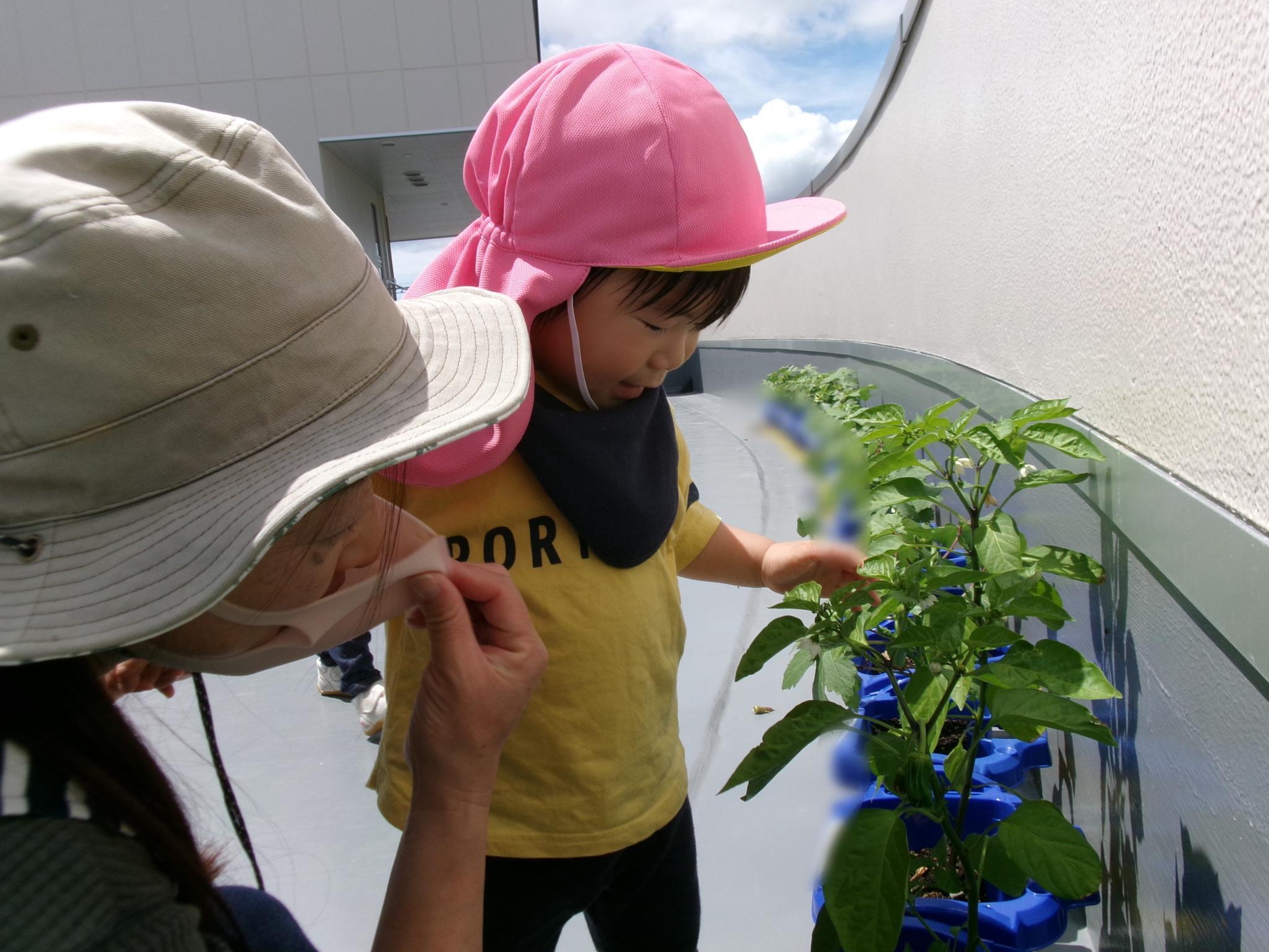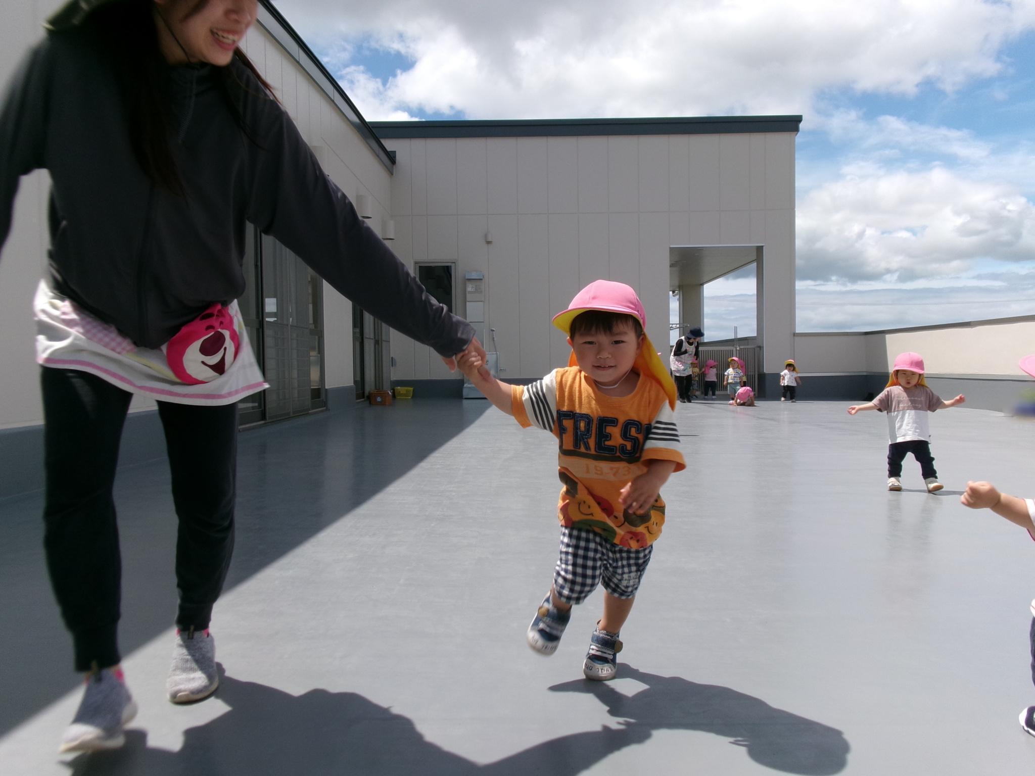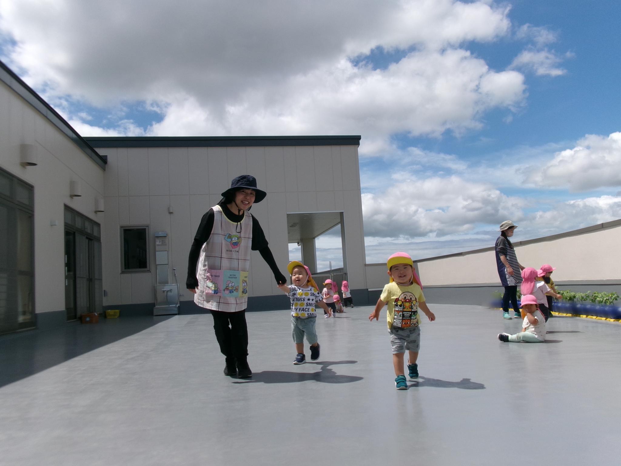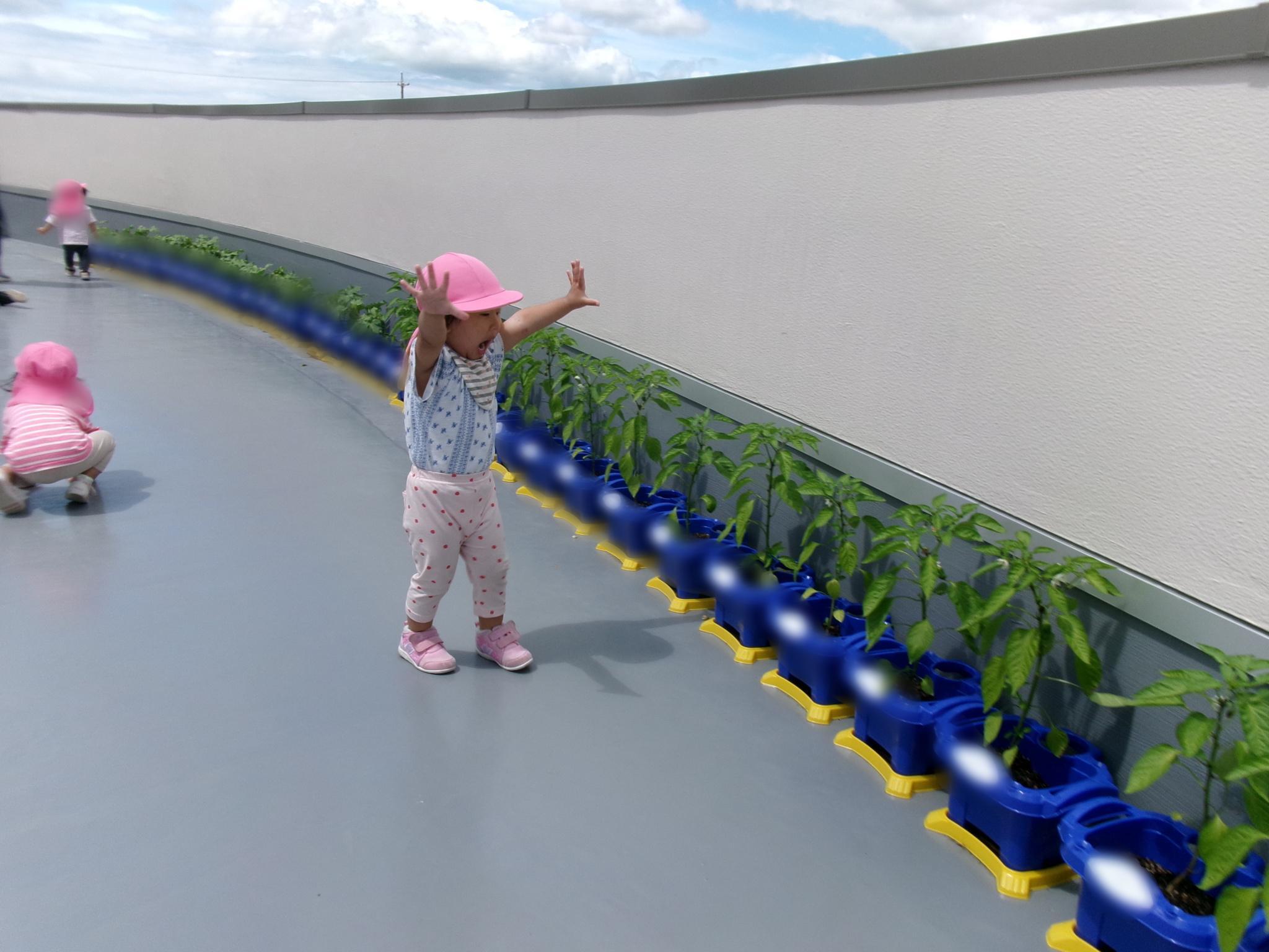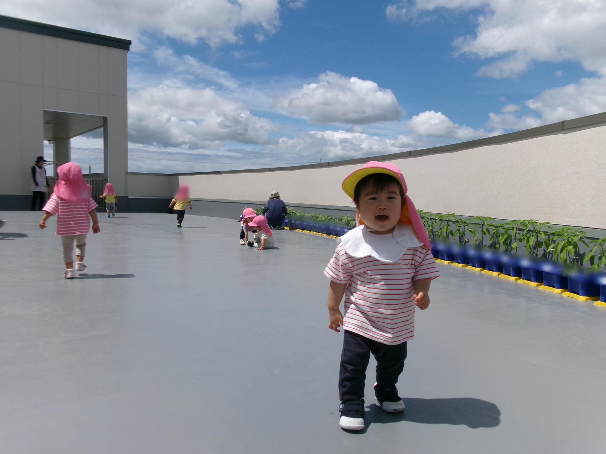 階段を登って2階のテラスへ遊びに行きました。以上児さんの育てている野菜や旧園舎の工事の様子を見たり、みんなでよーいどん!をして思い切り走り楽しんで過ごしました♪