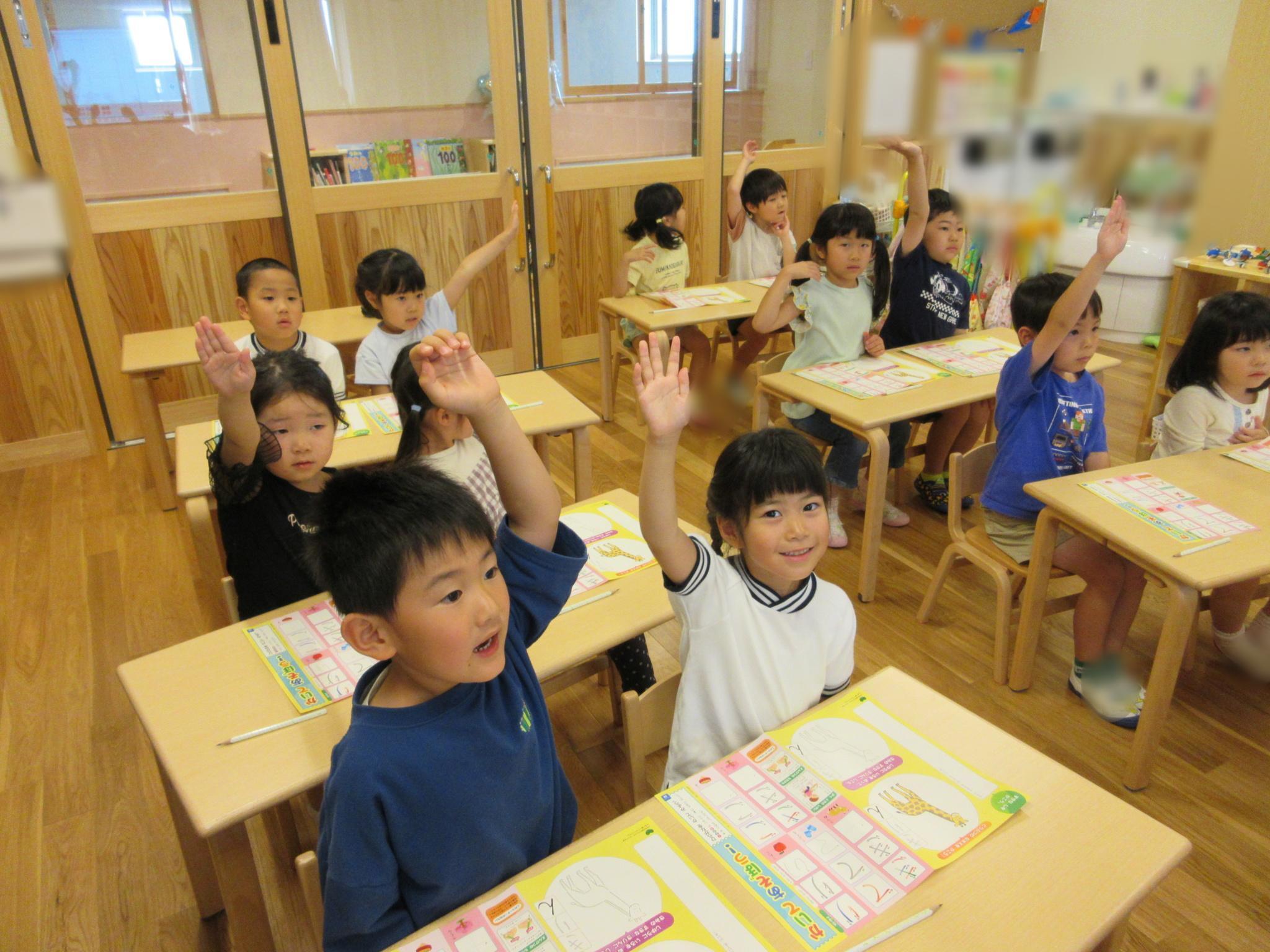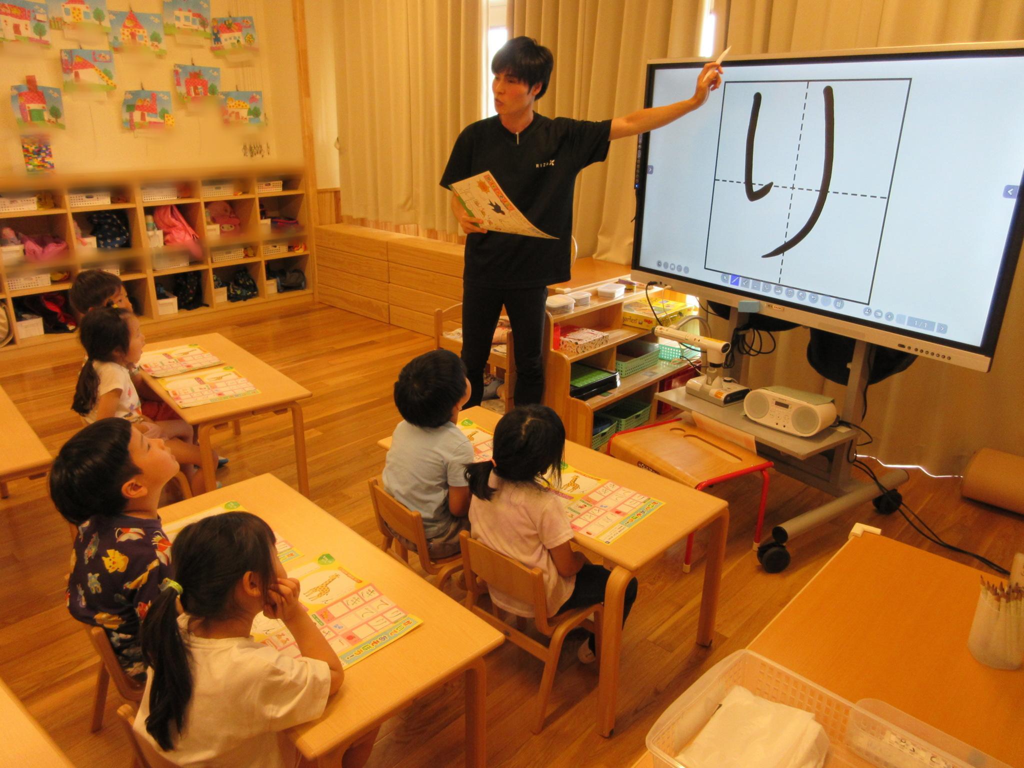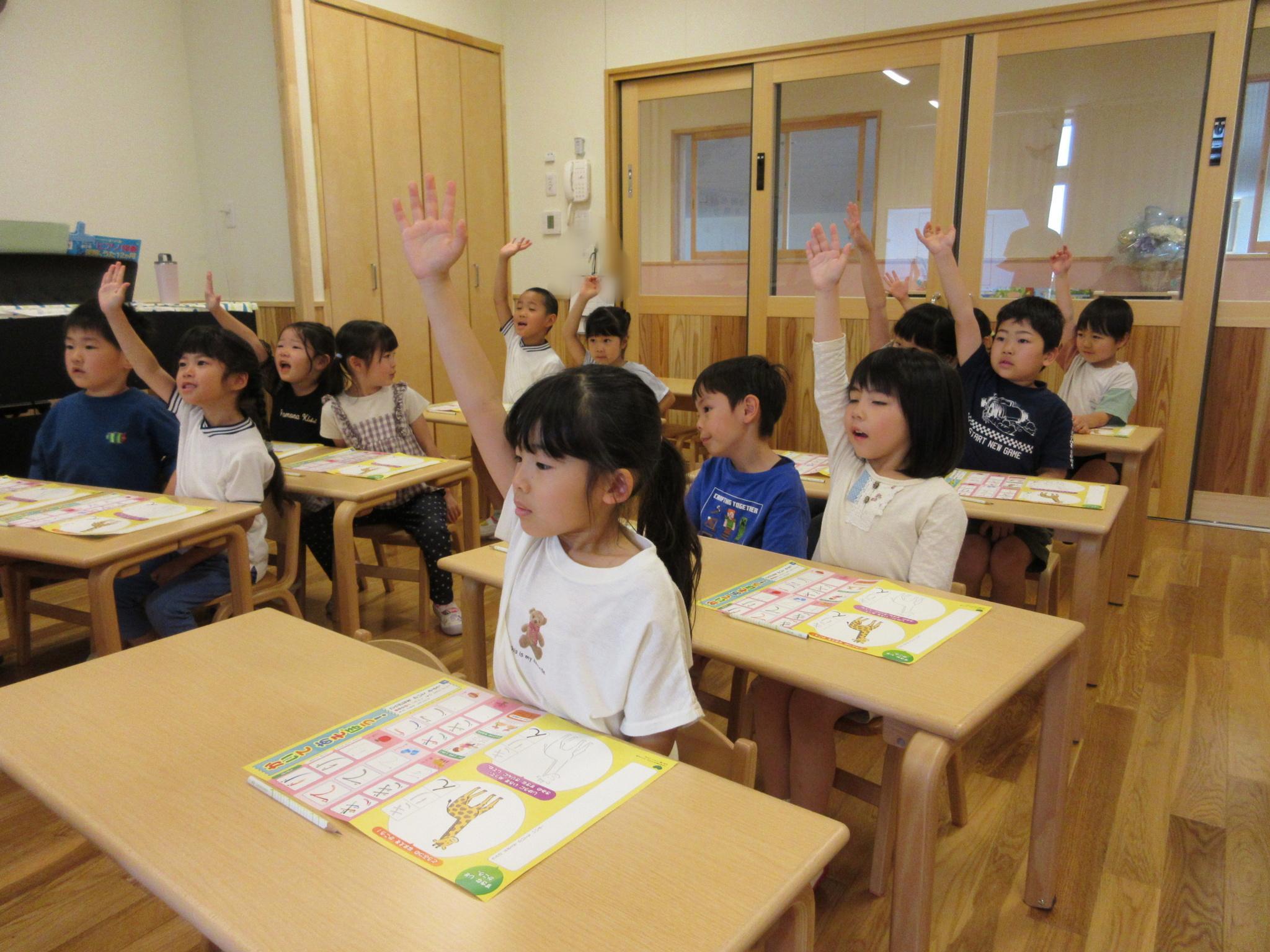 今日は『り』『こ』『さ』『て』『き』の5つを練習しました。普段と違った机の向きで「小学生みたい」とワクワクな子どもたち。たくさん手を挙げて発表していました♪