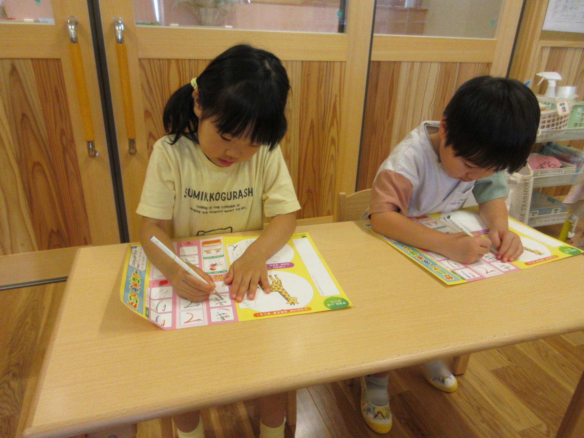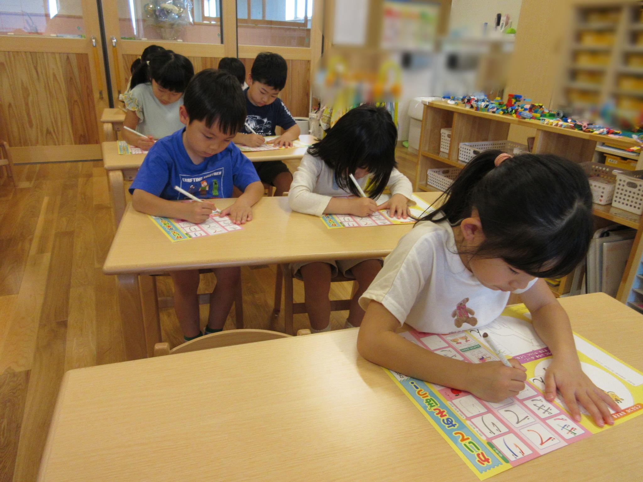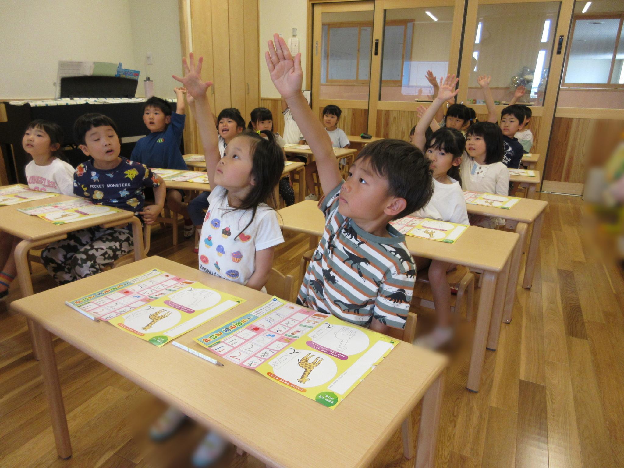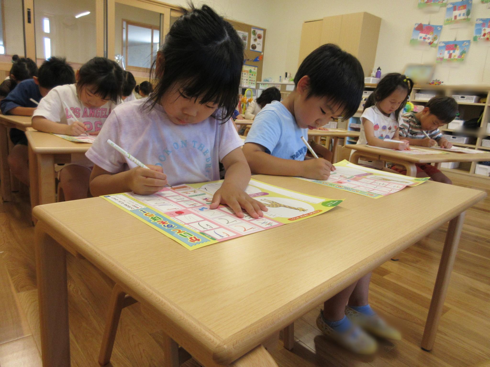 今日は『り』『こ』『さ』『て』『き』の5つを練習しました。普段と違った机の向きで「小学生みたい」とワクワクな子どもたち。たくさん手を挙げて発表していました♪