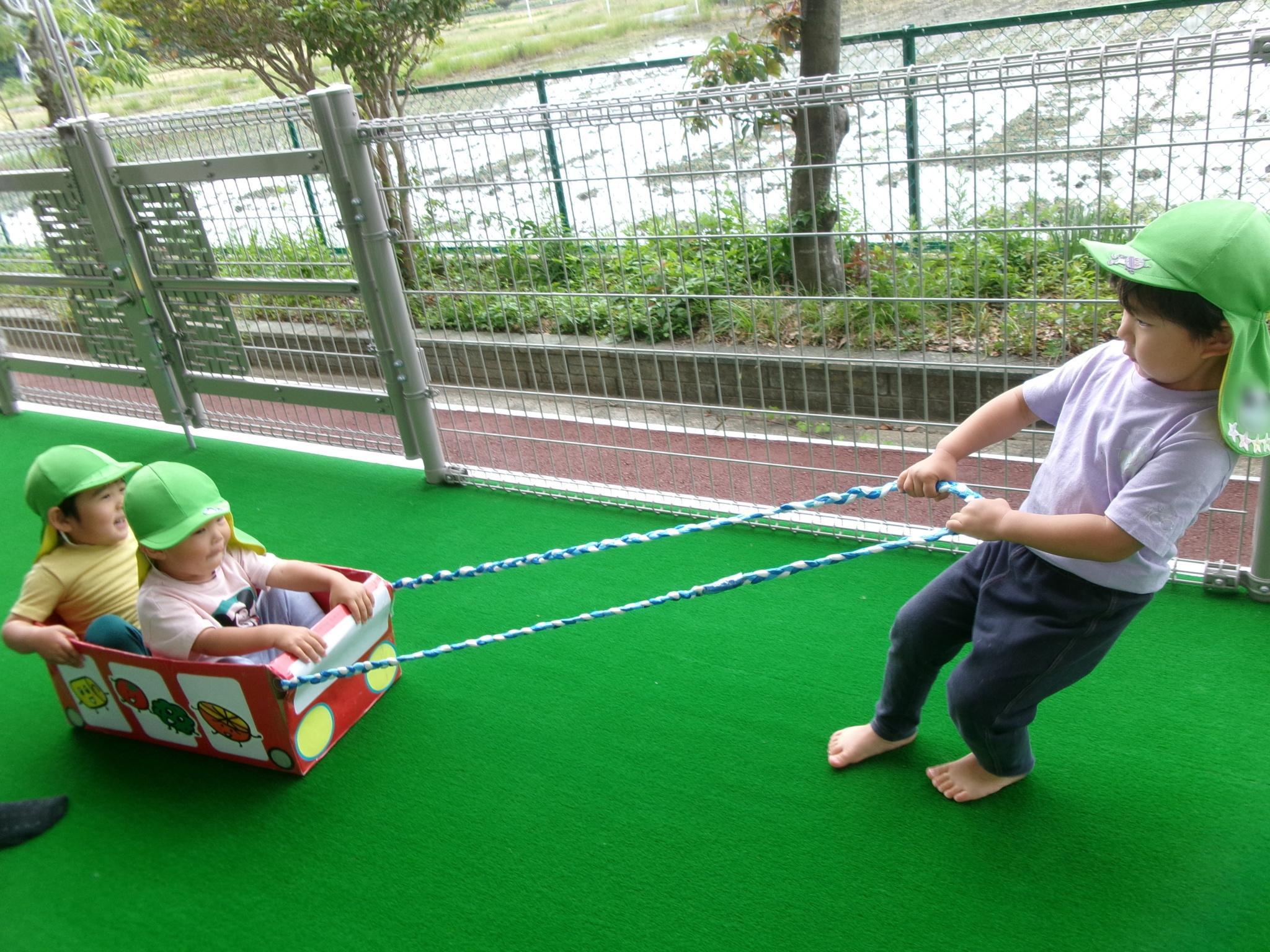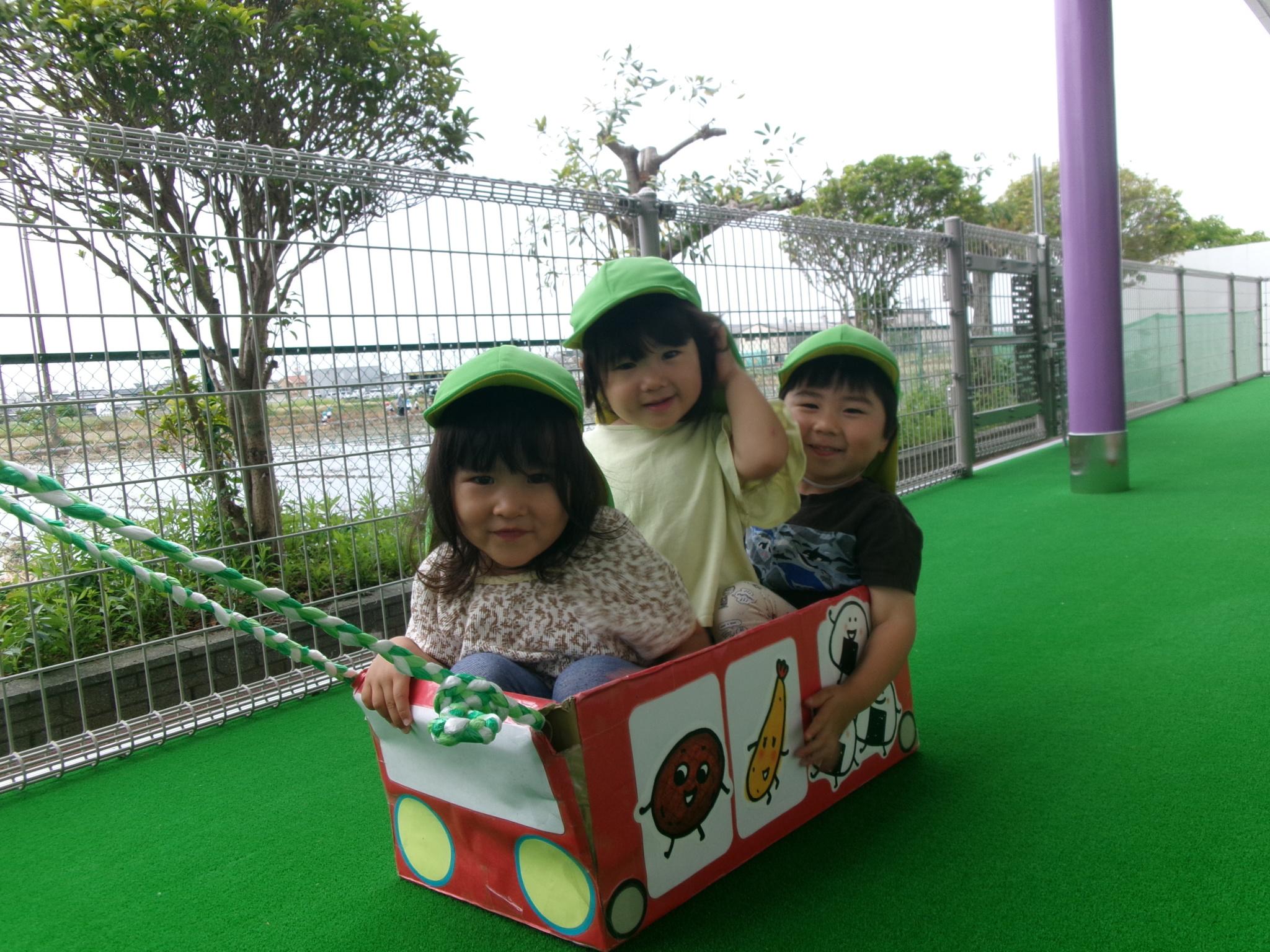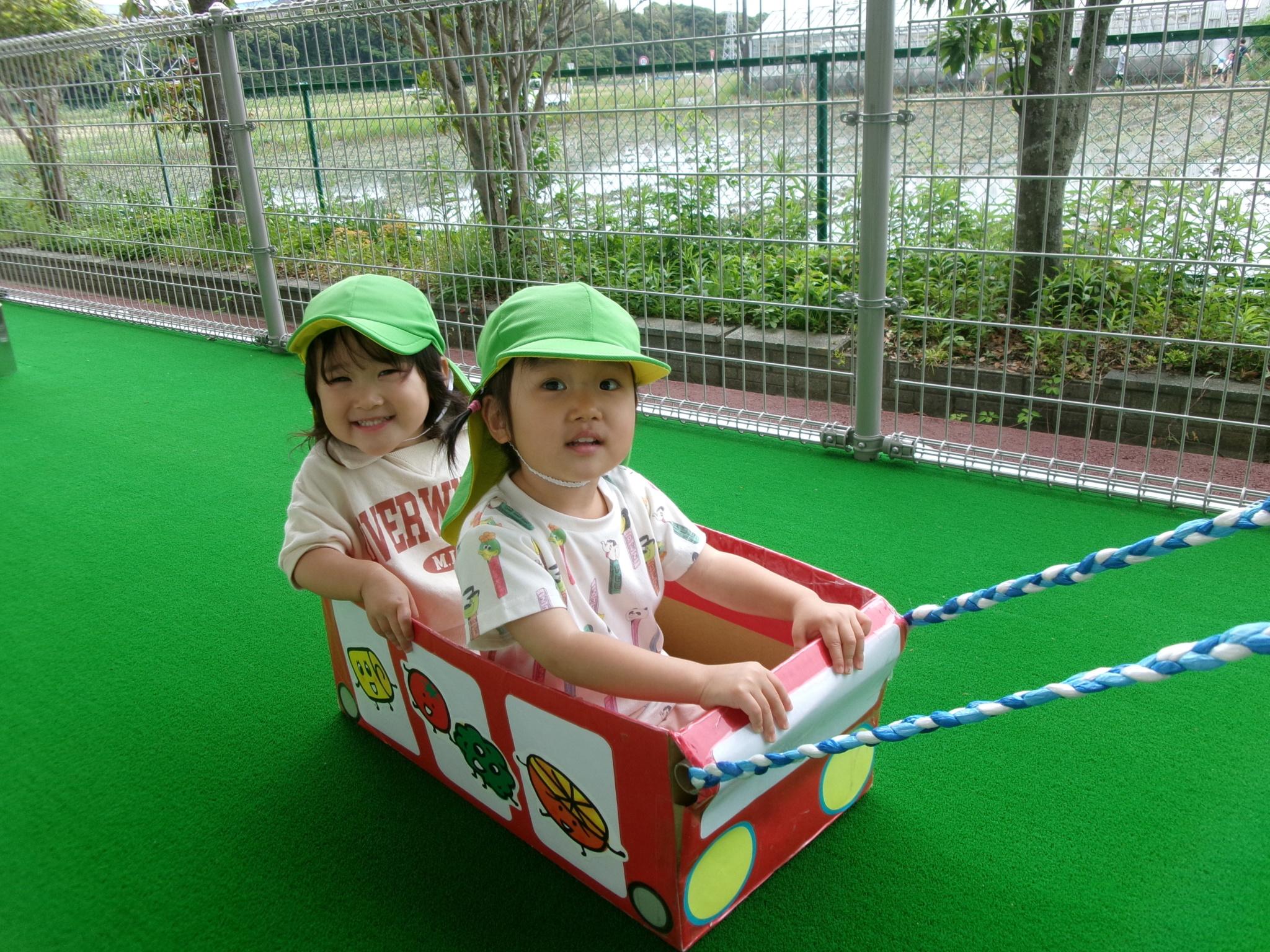 おべんとうバスに乗って園内を探検しました。気持ちよくバスに乗ったり「よいしょ」と言いながらひっぱったりすることを楽しみました。カメを見つけるとおーいと手を振って指をさしてよく見ていました♪