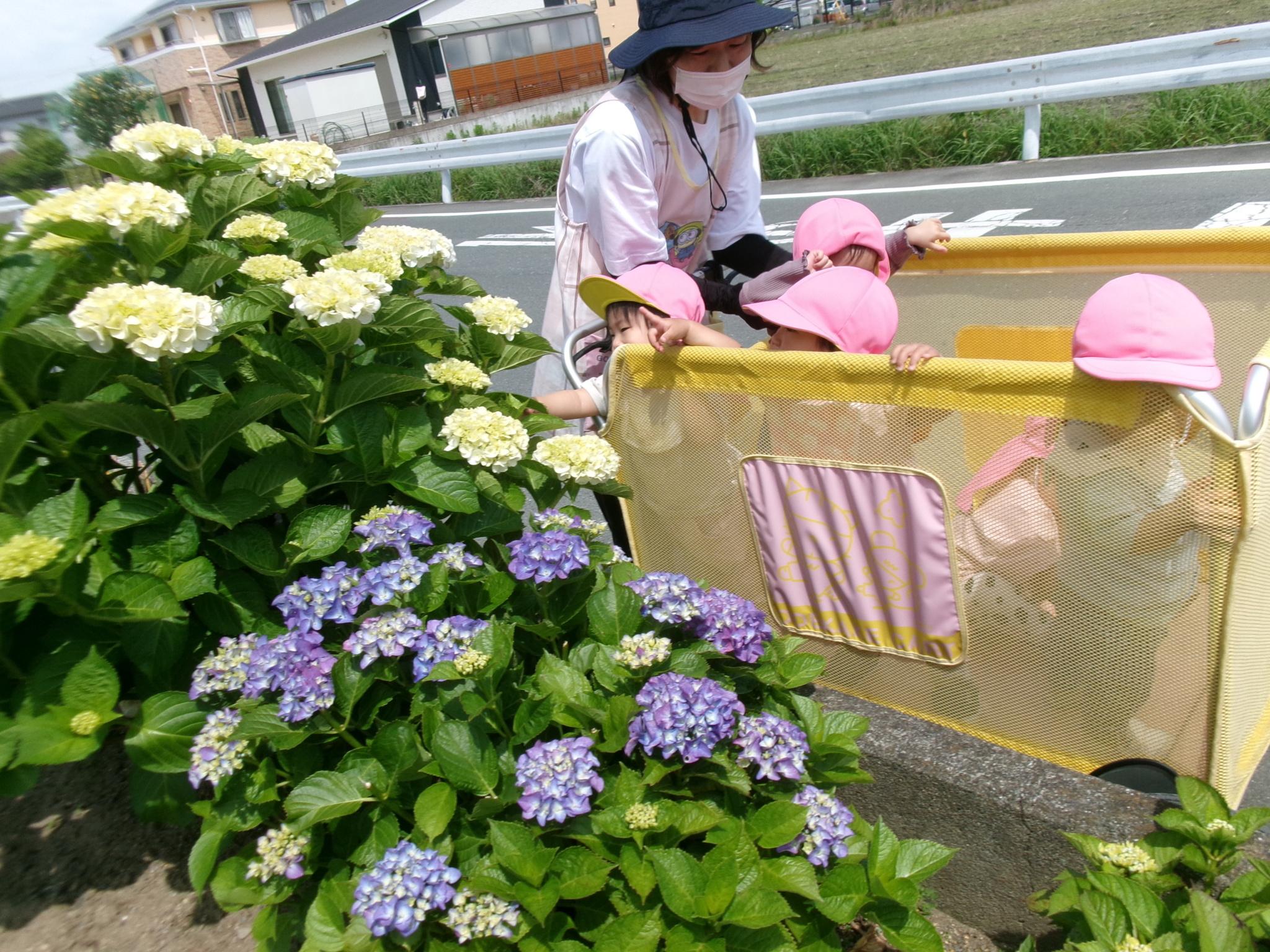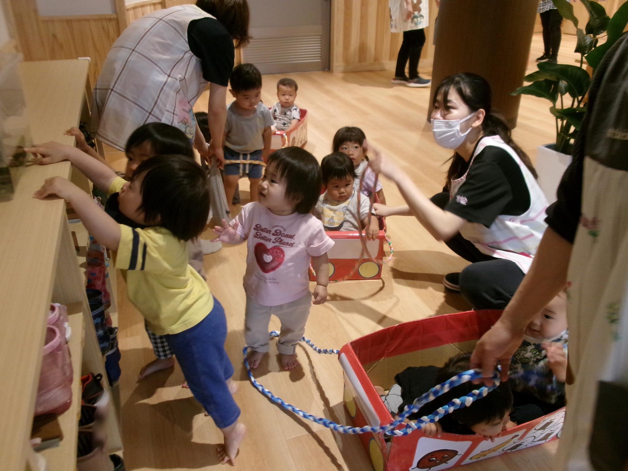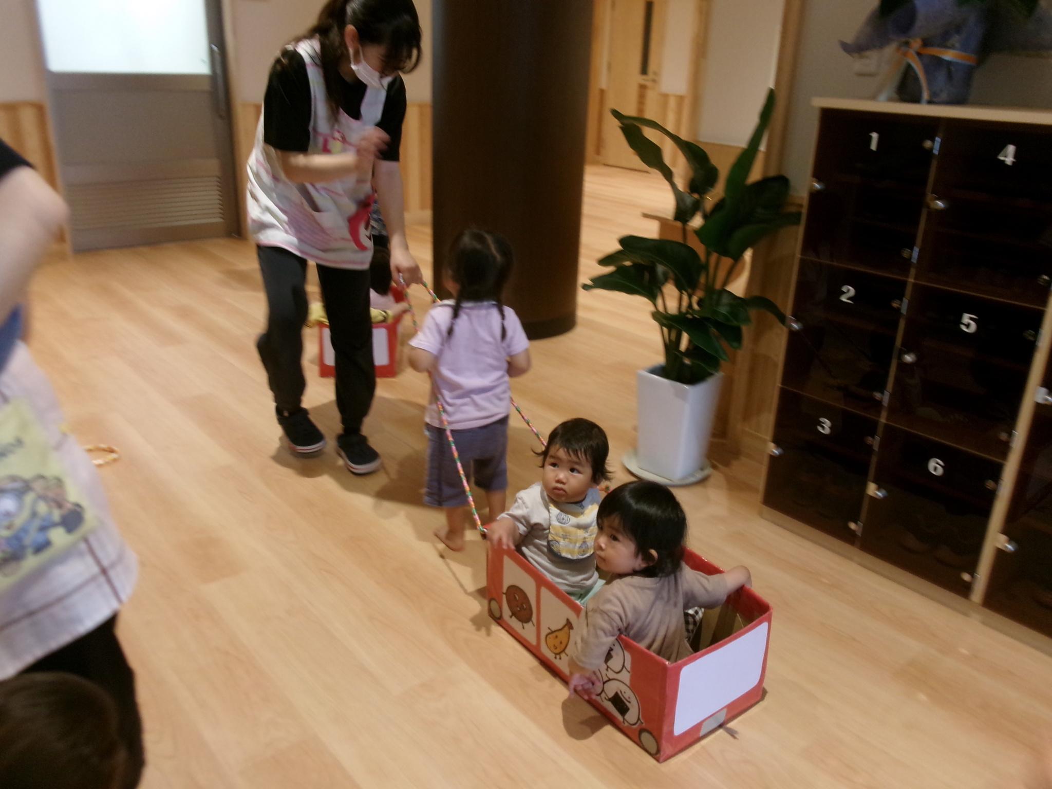 おべんとうバスに乗って園内を探検しました。気持ちよくバスに乗ったり「よいしょ」と言いながらひっぱったりすることを楽しみました。カメを見つけるとおーいと手を振って指をさしてよく見ていました♪