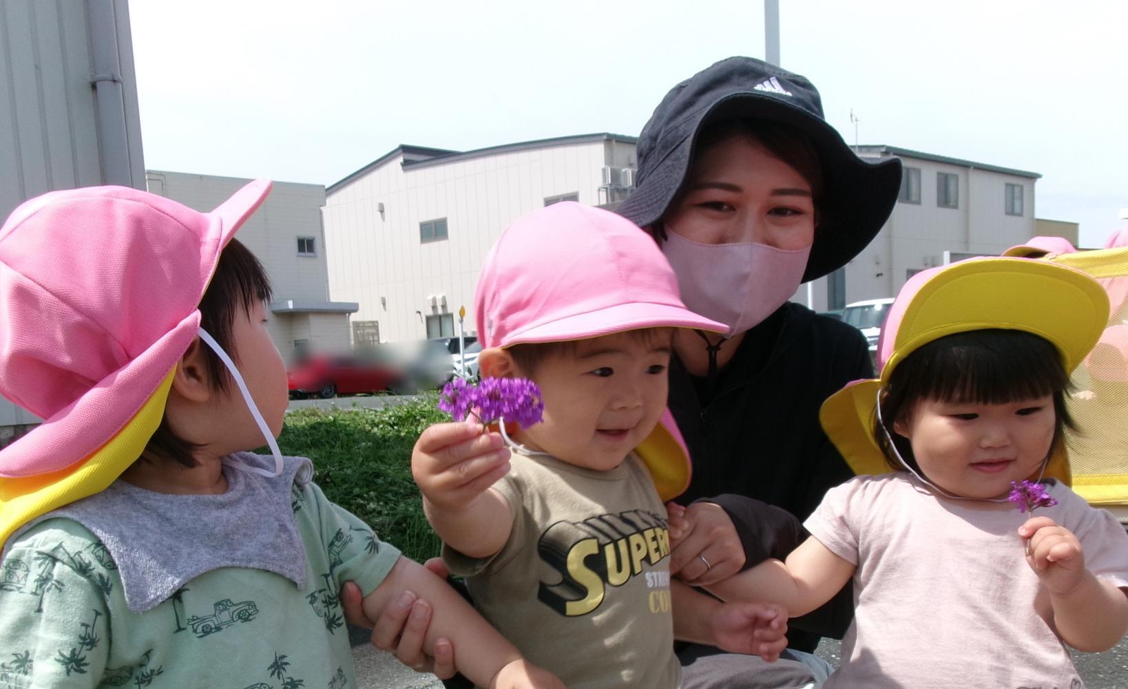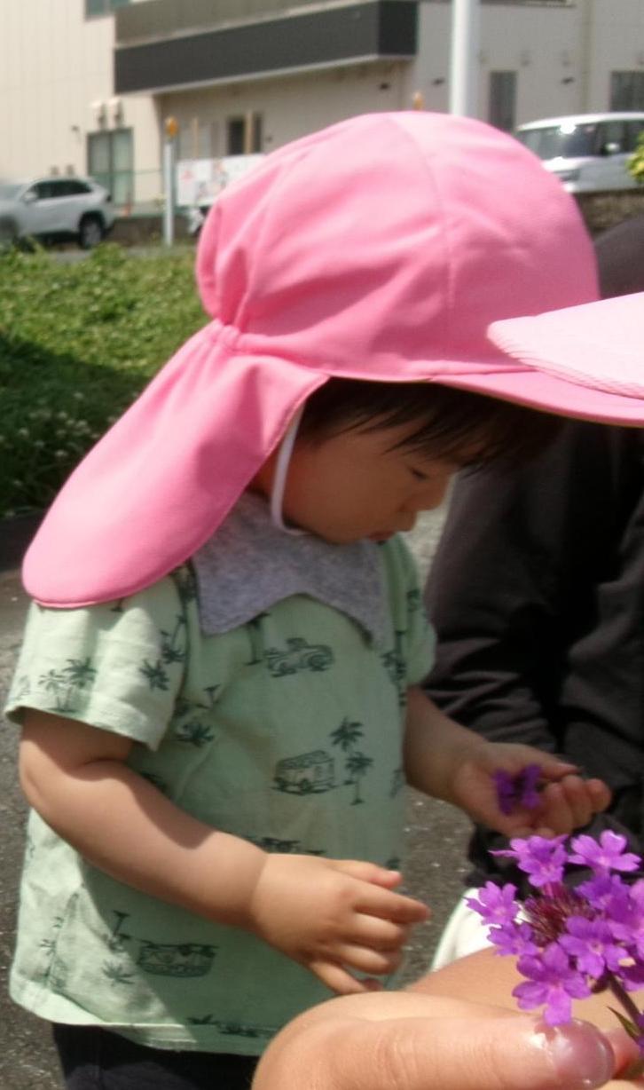 おさんぽに出掛けきれいなお花をいっぱい見つけました。摘んだお花を大事に持ってごきげんで歩いていました♪