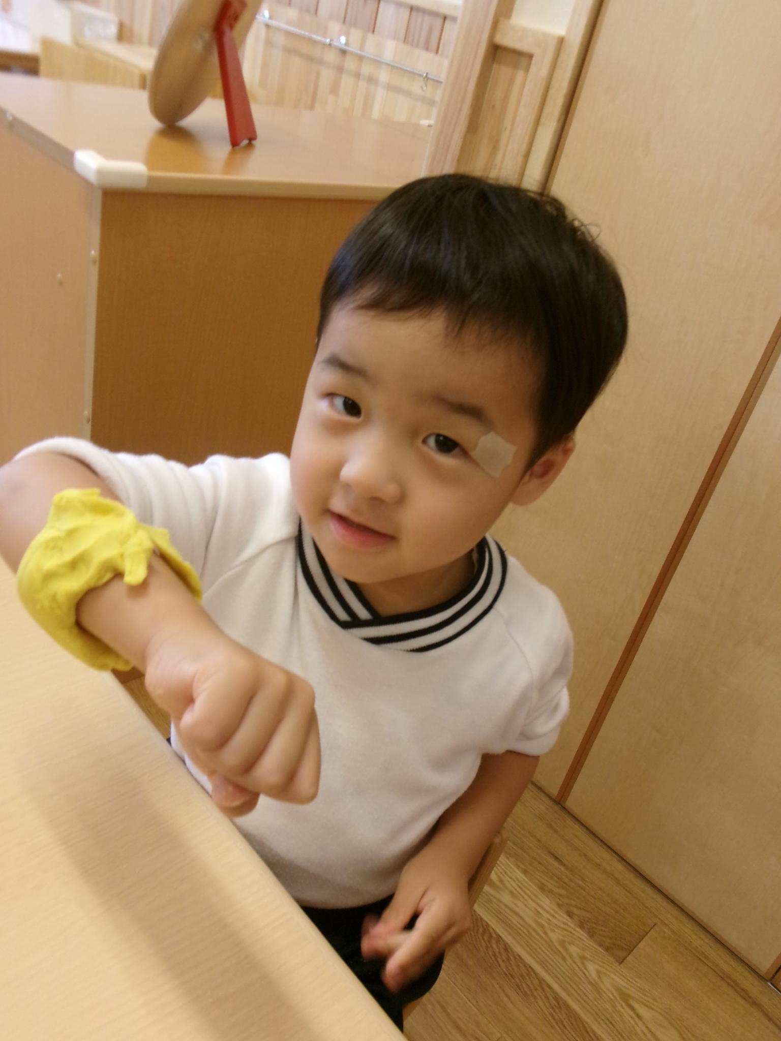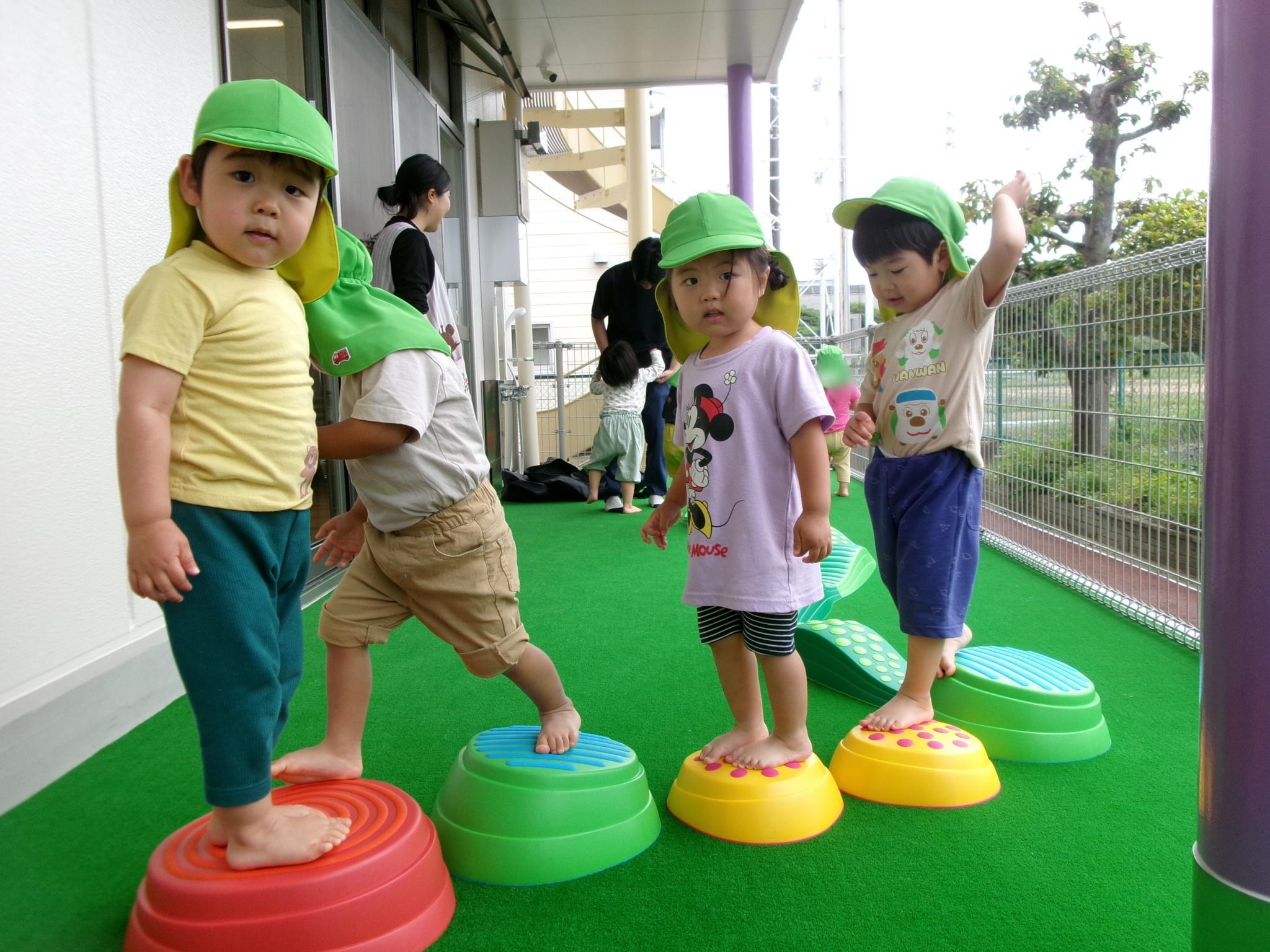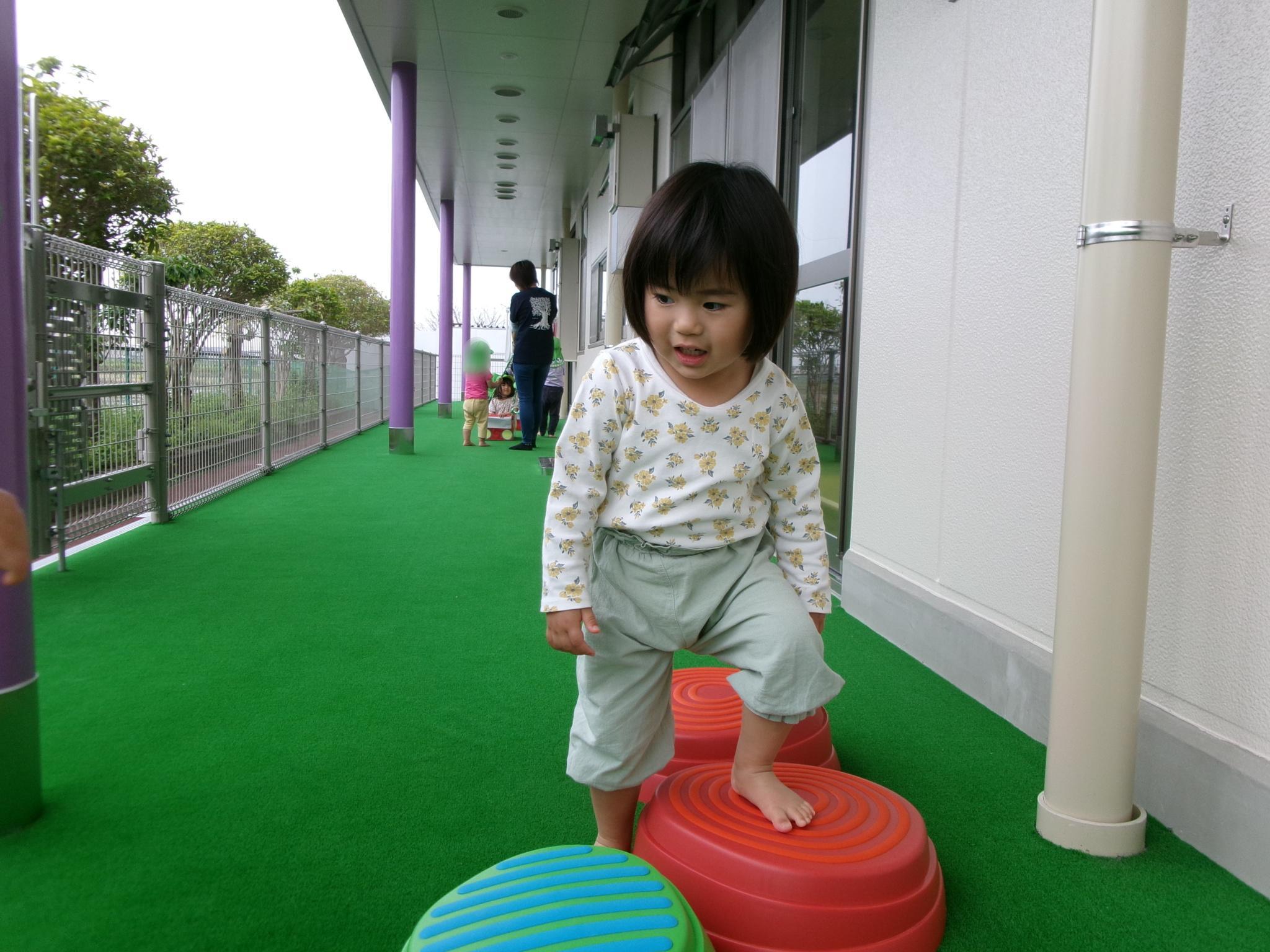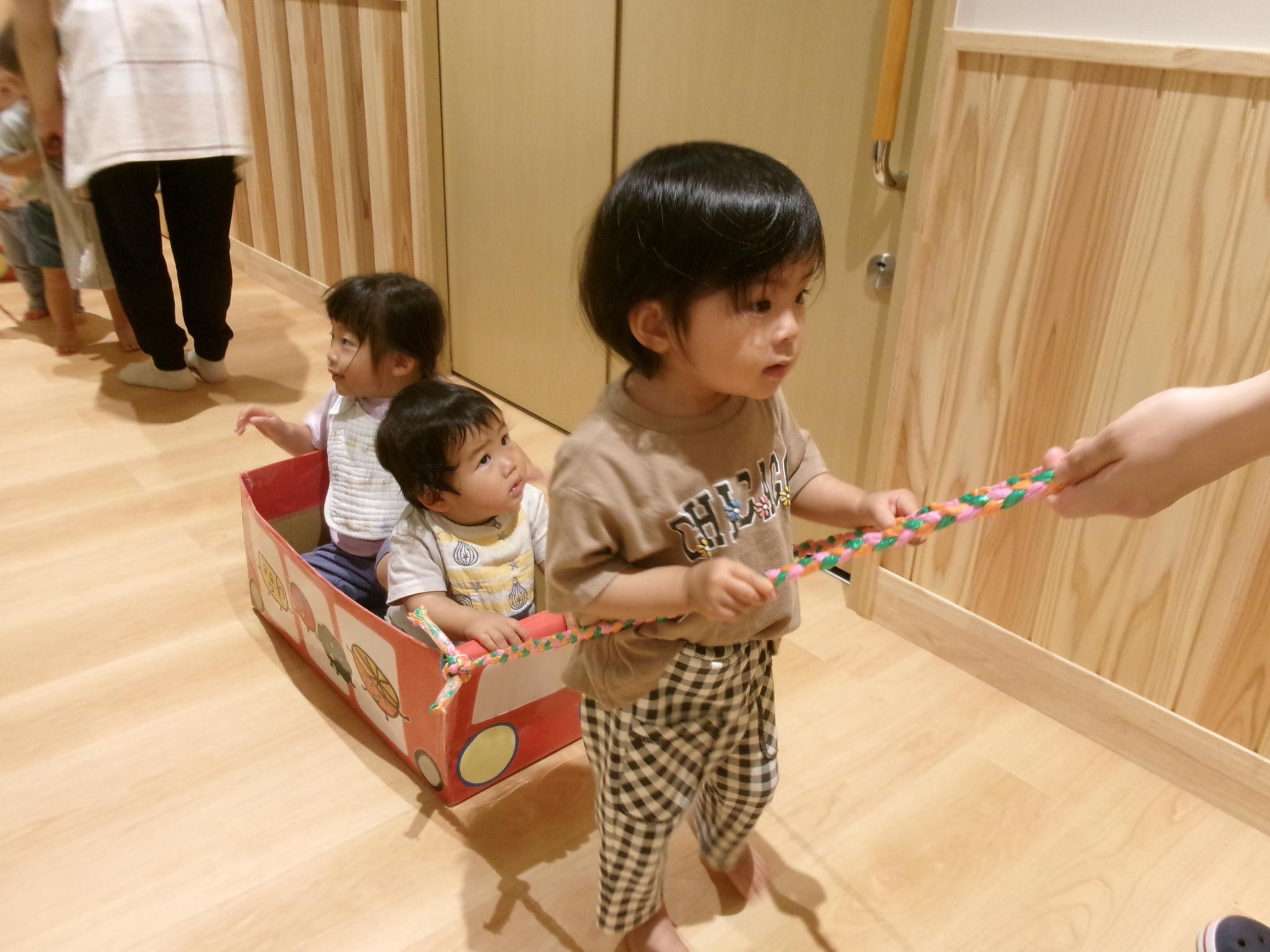 テラスで運動遊びをしました。デコボコの平均台とバランスストーン、高さのある台の上をゆっくり歩いたり、ダンボールカーに乗って遊びました。落っこちないようにおっとっとっと…と慎重に歩いていました。ダンボールカーはお友達と仲良く乗ったり、「ひっぱってあげる!!」「よいしょ!」と掛け声をかけながら楽しそうにしていました。