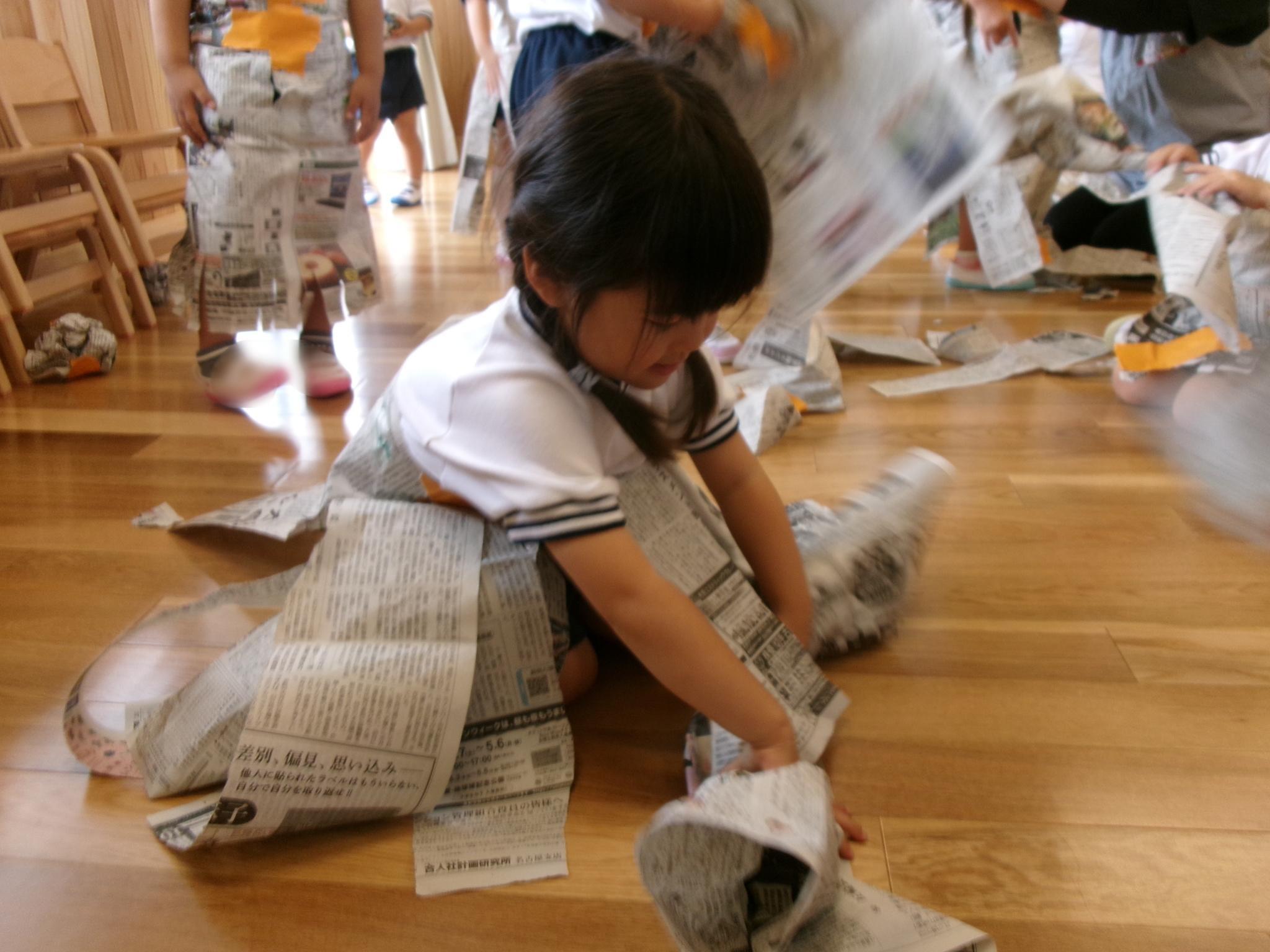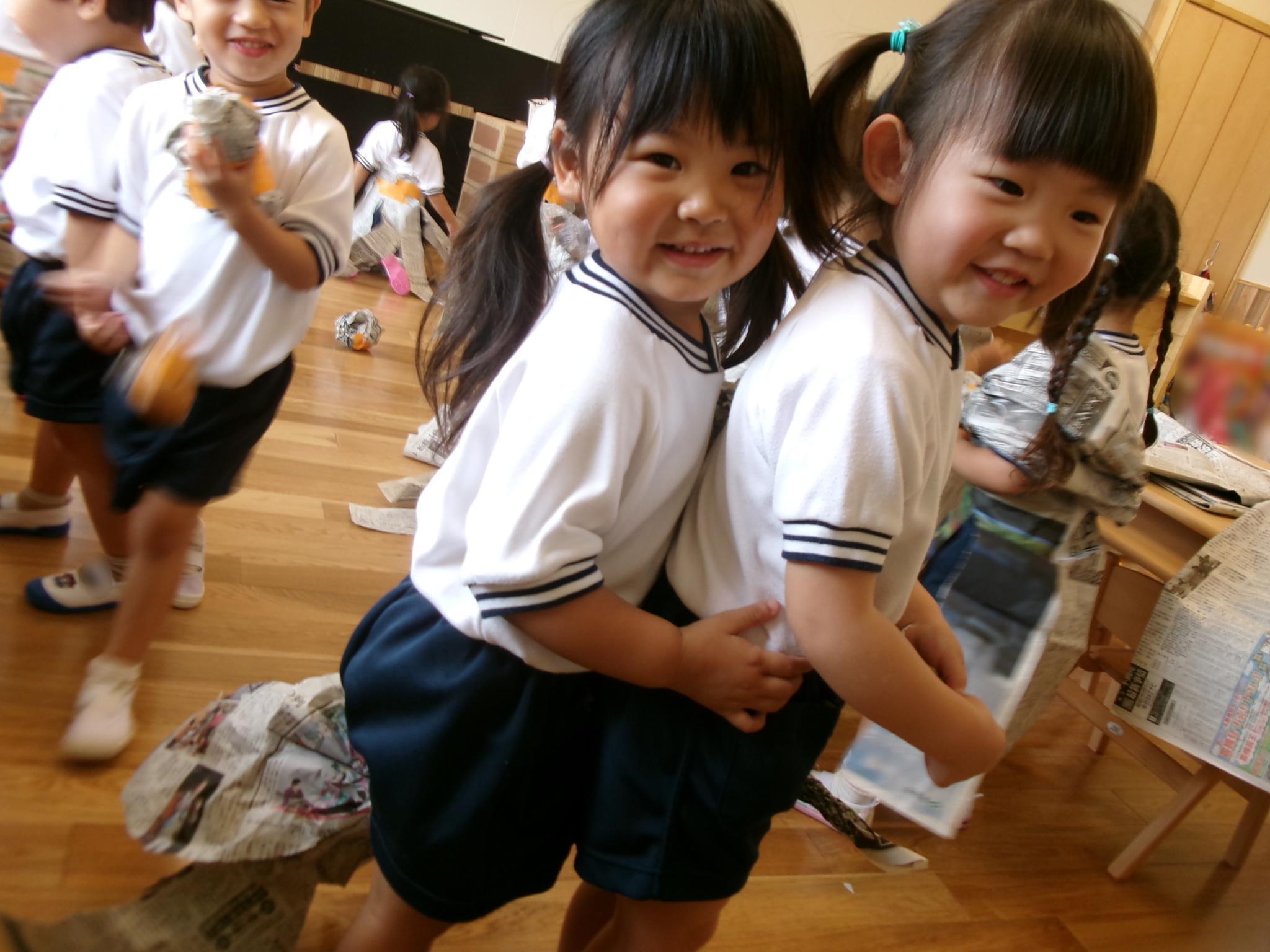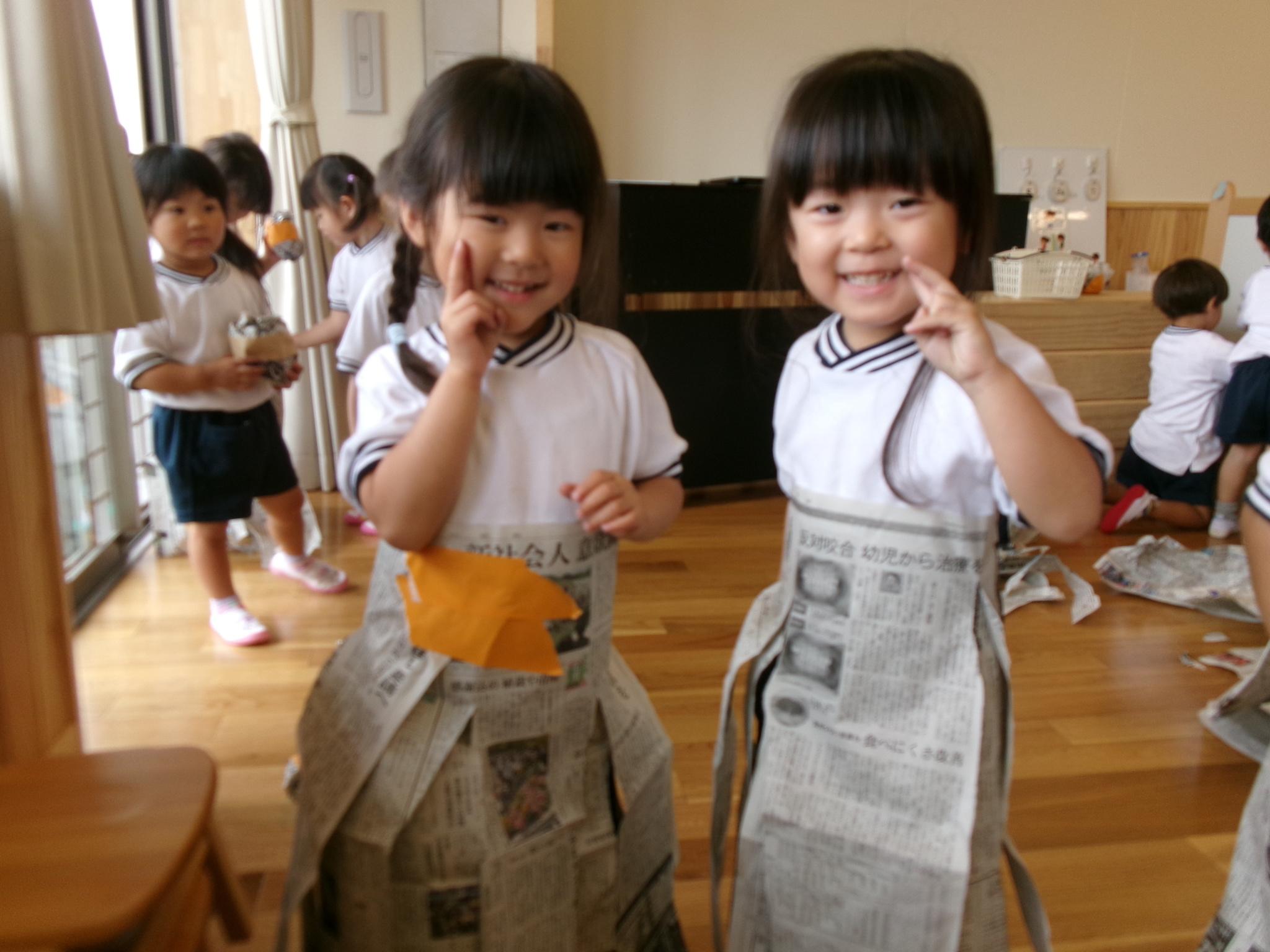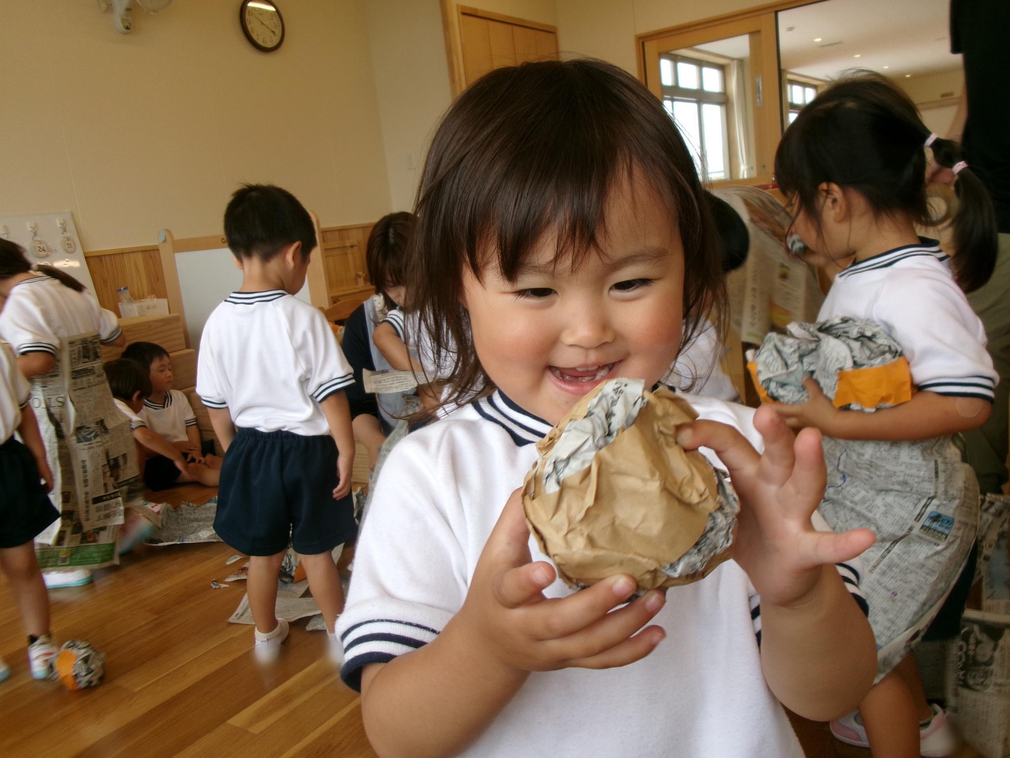 ちぎって・・・。丸めて・・・。ドレスやりんご、ほうきにボールといろいろな物を作って遊びました。「かわいいでしょ」とポーズを決めたり、キャッチボールをして大盛り上がりの子どもたちでした。