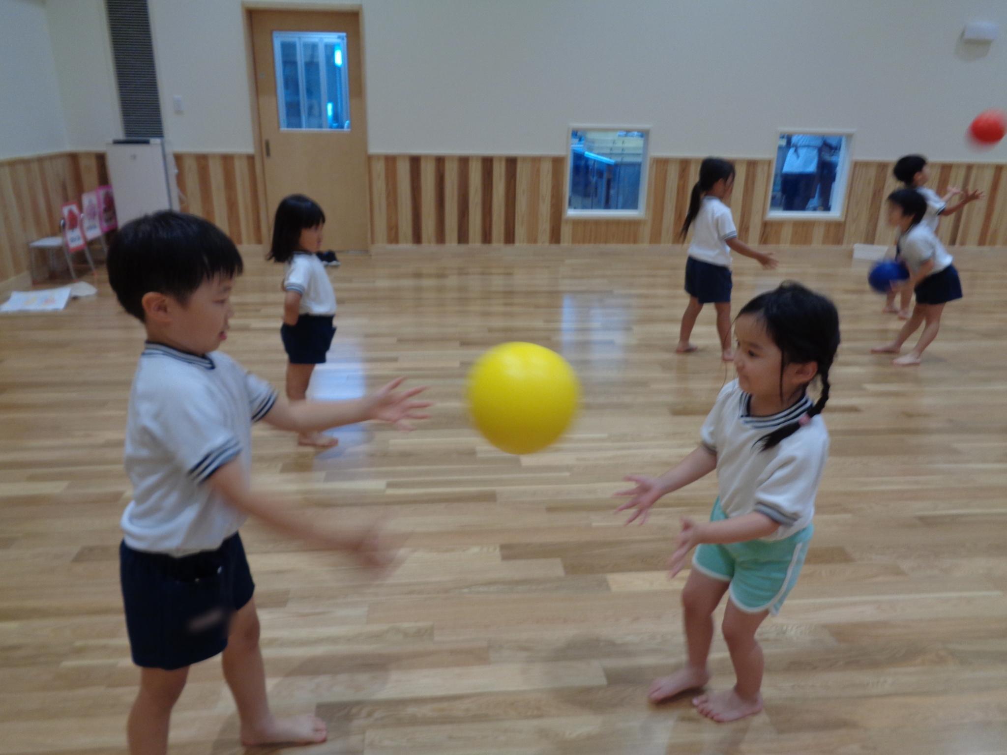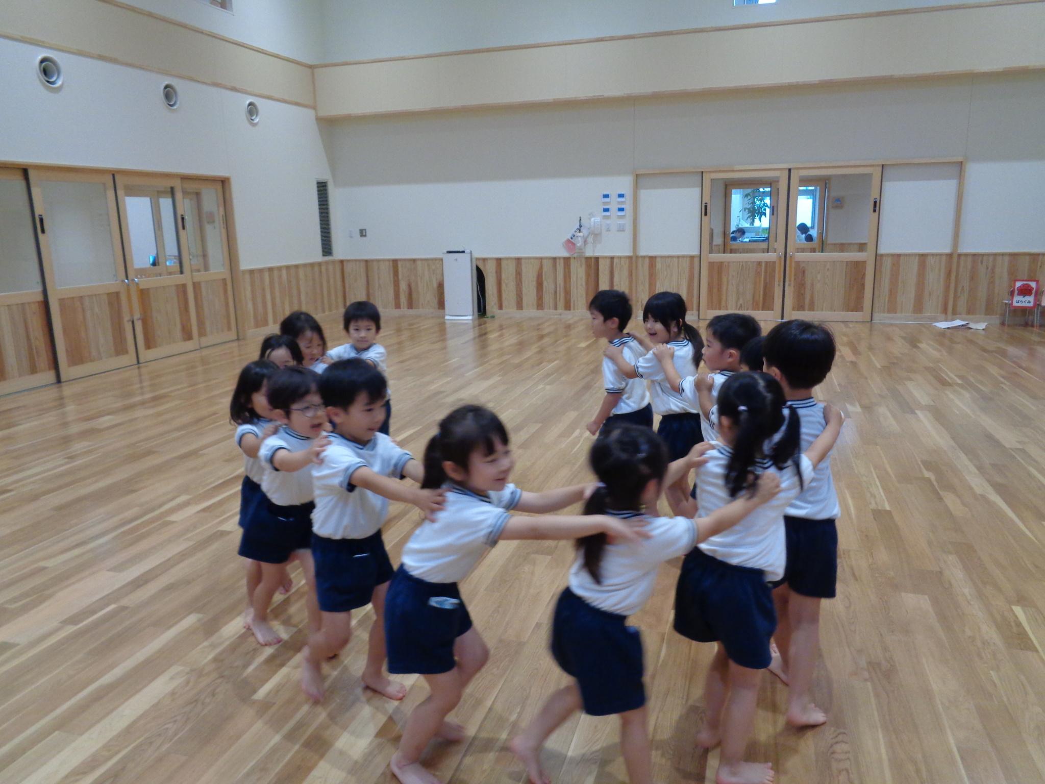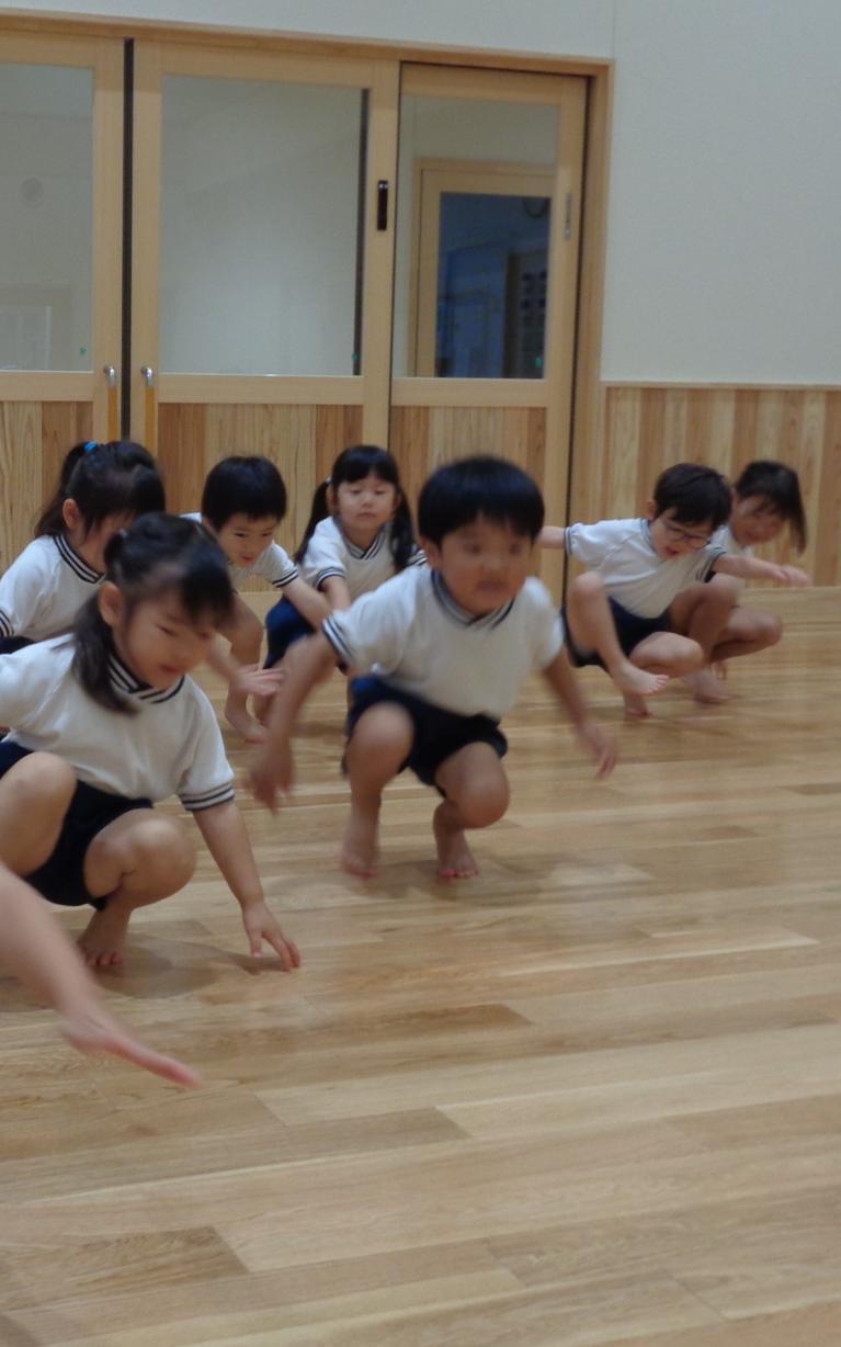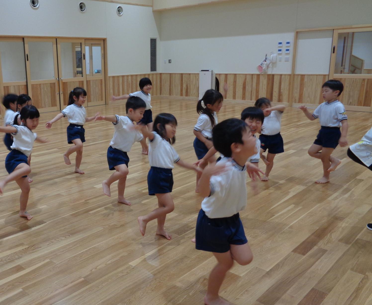 ホールで裸足になり、体をいっぱい動かして遊びました。笑い声や「がんばれー!」の応援の声であふれていました!