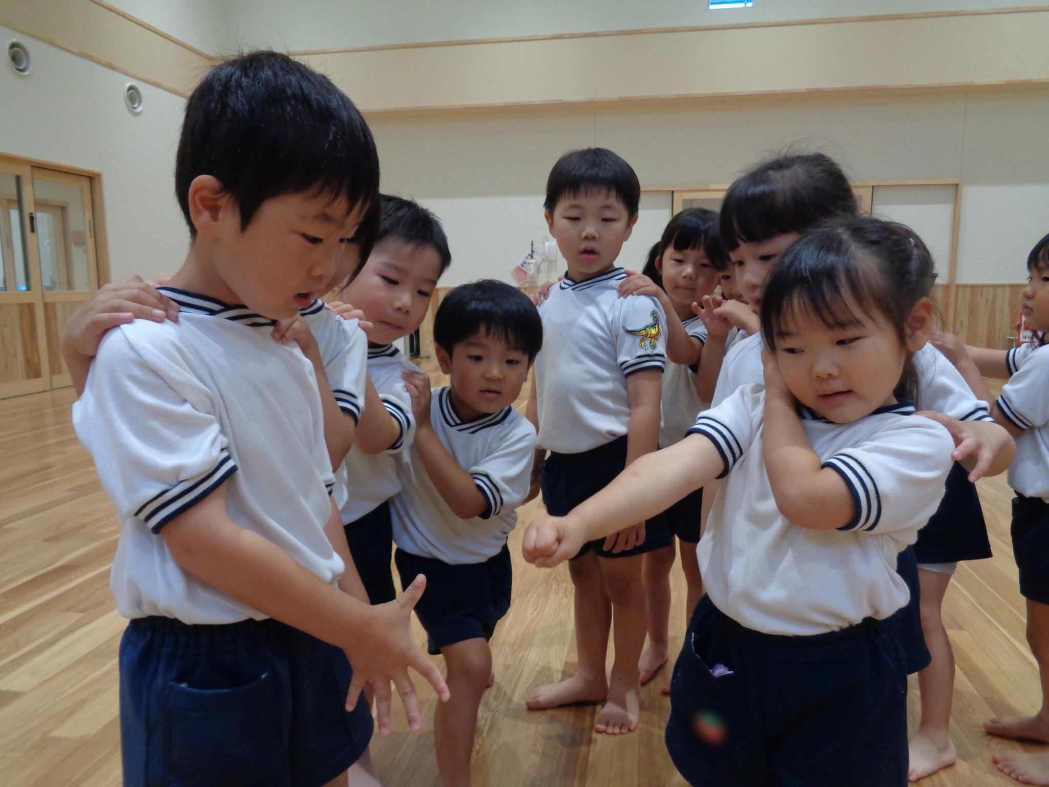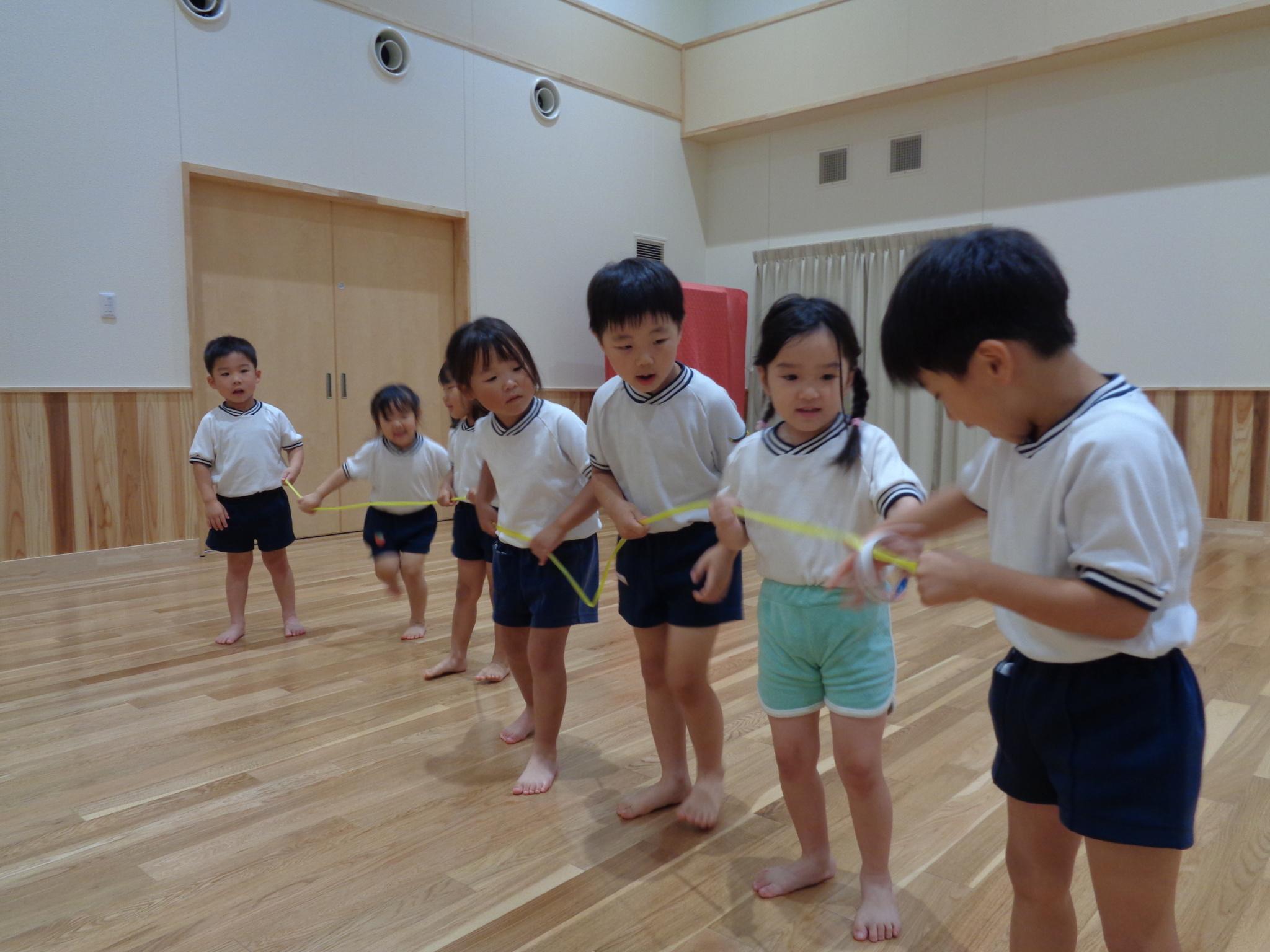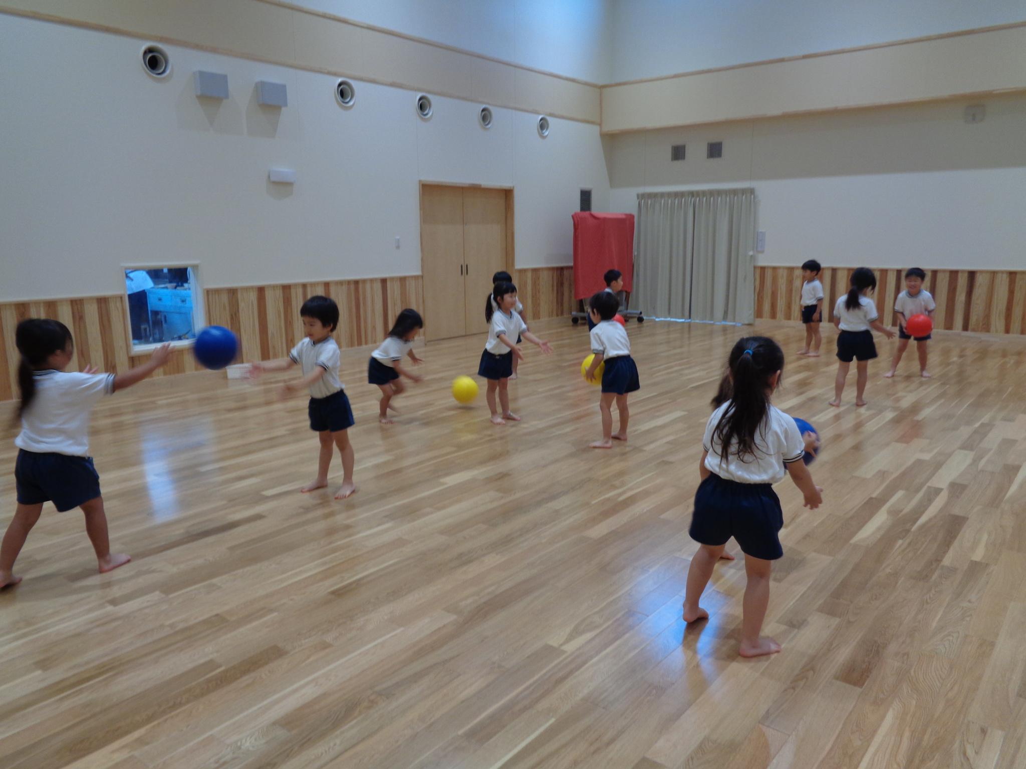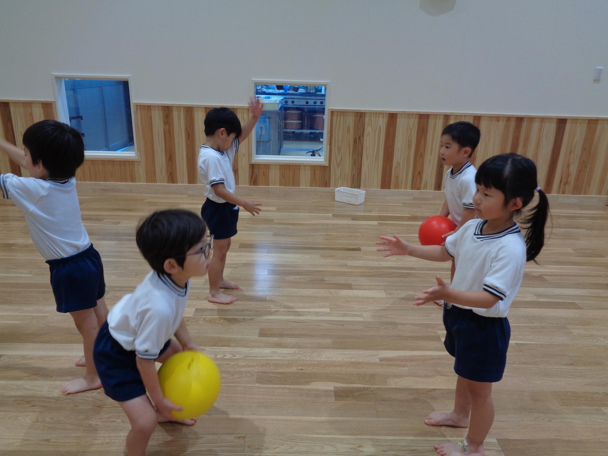 ホールで裸足になり、体をいっぱい動かして遊びました。笑い声や「がんばれー!」の応援の声であふれていました!