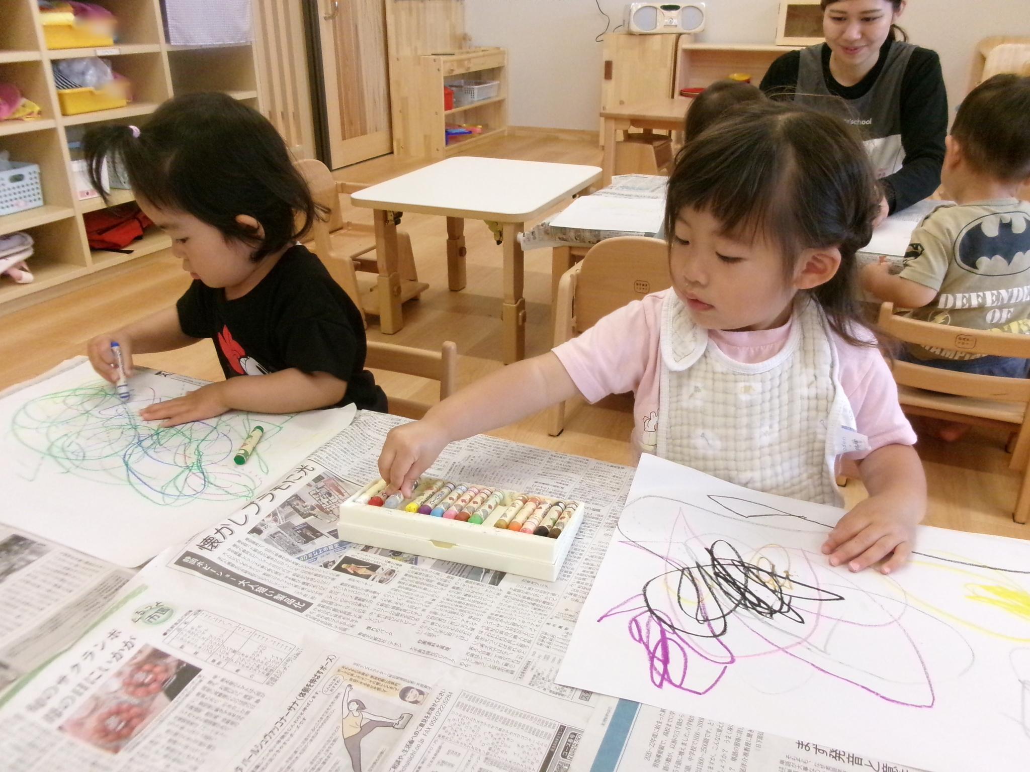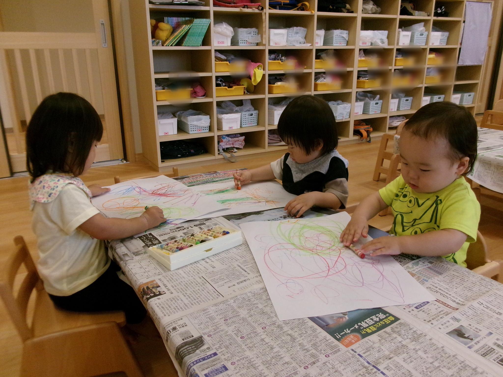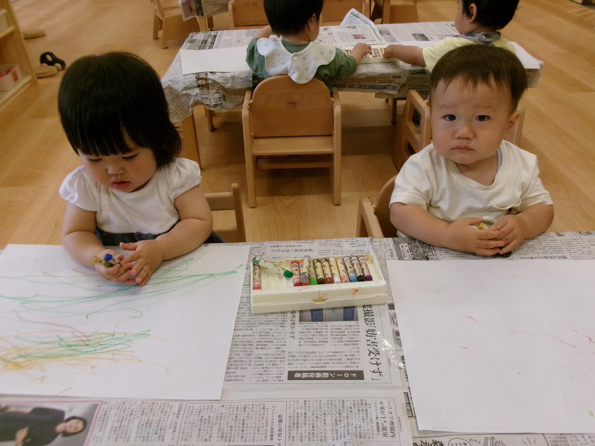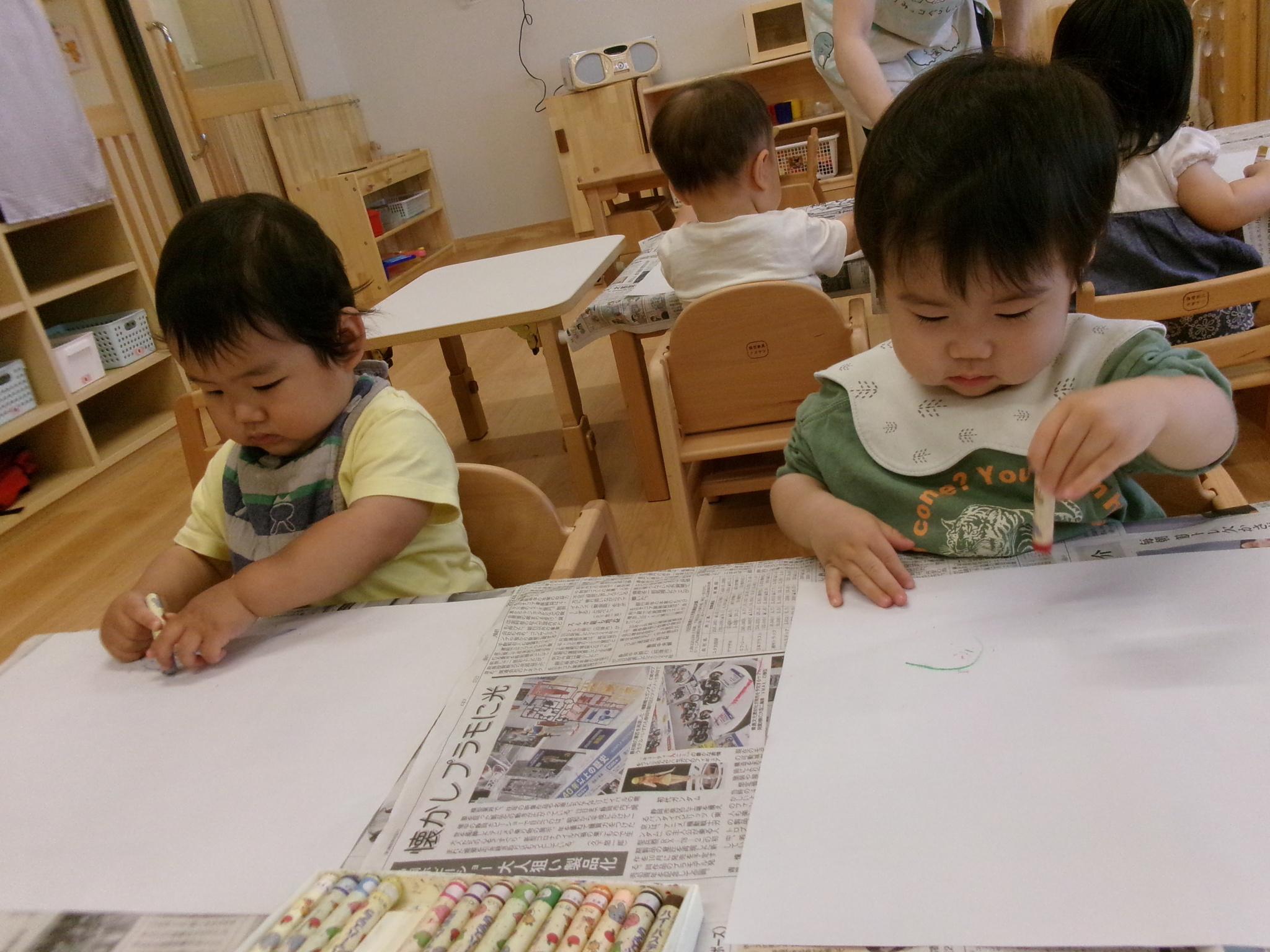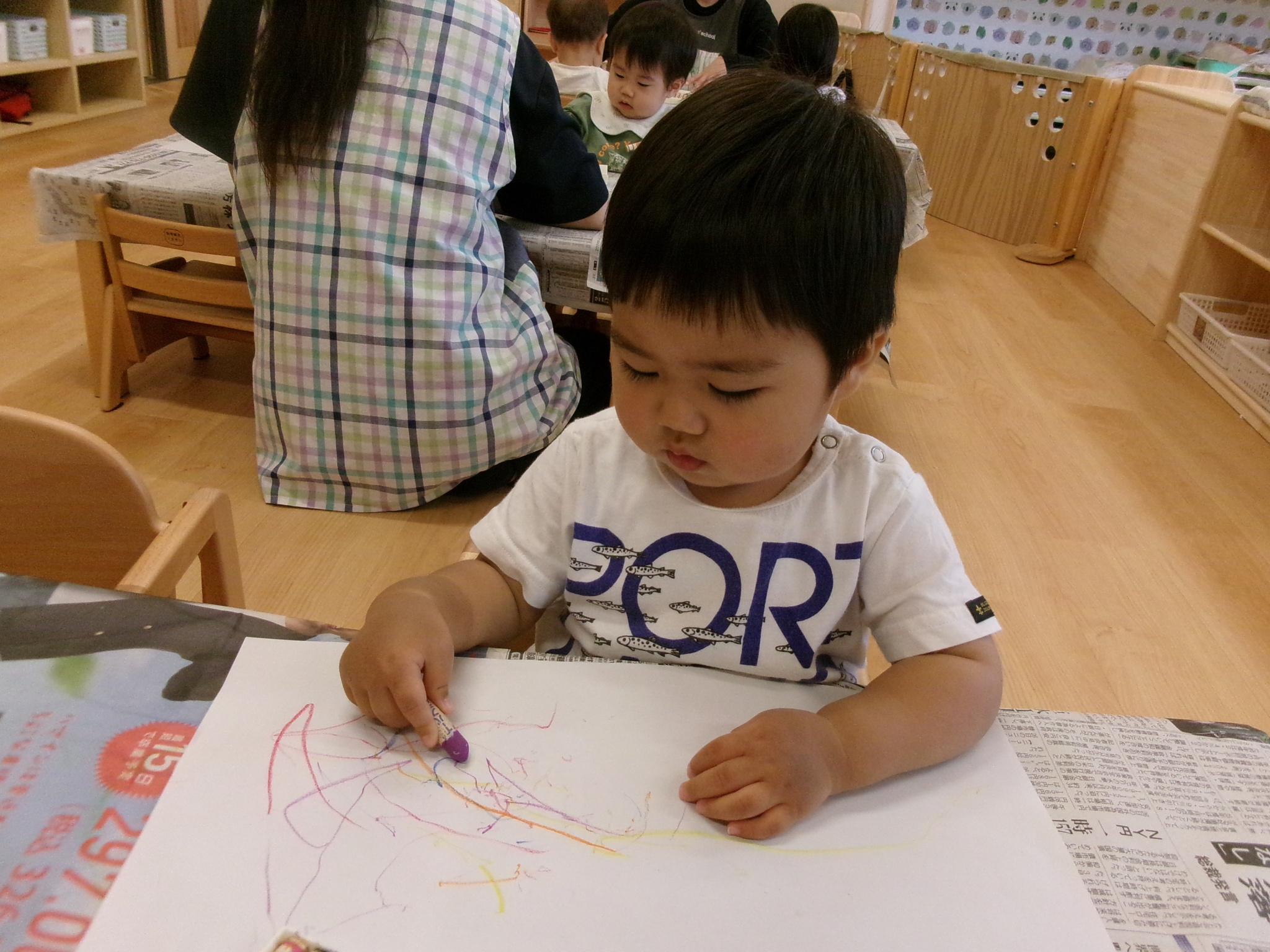 クレヨンを使ってお絵描きをしました。『どんな色が好き?』と歌を歌いながら好きなクレヨンを手に取りぐるぐるとんとんと描くことを楽しみました。