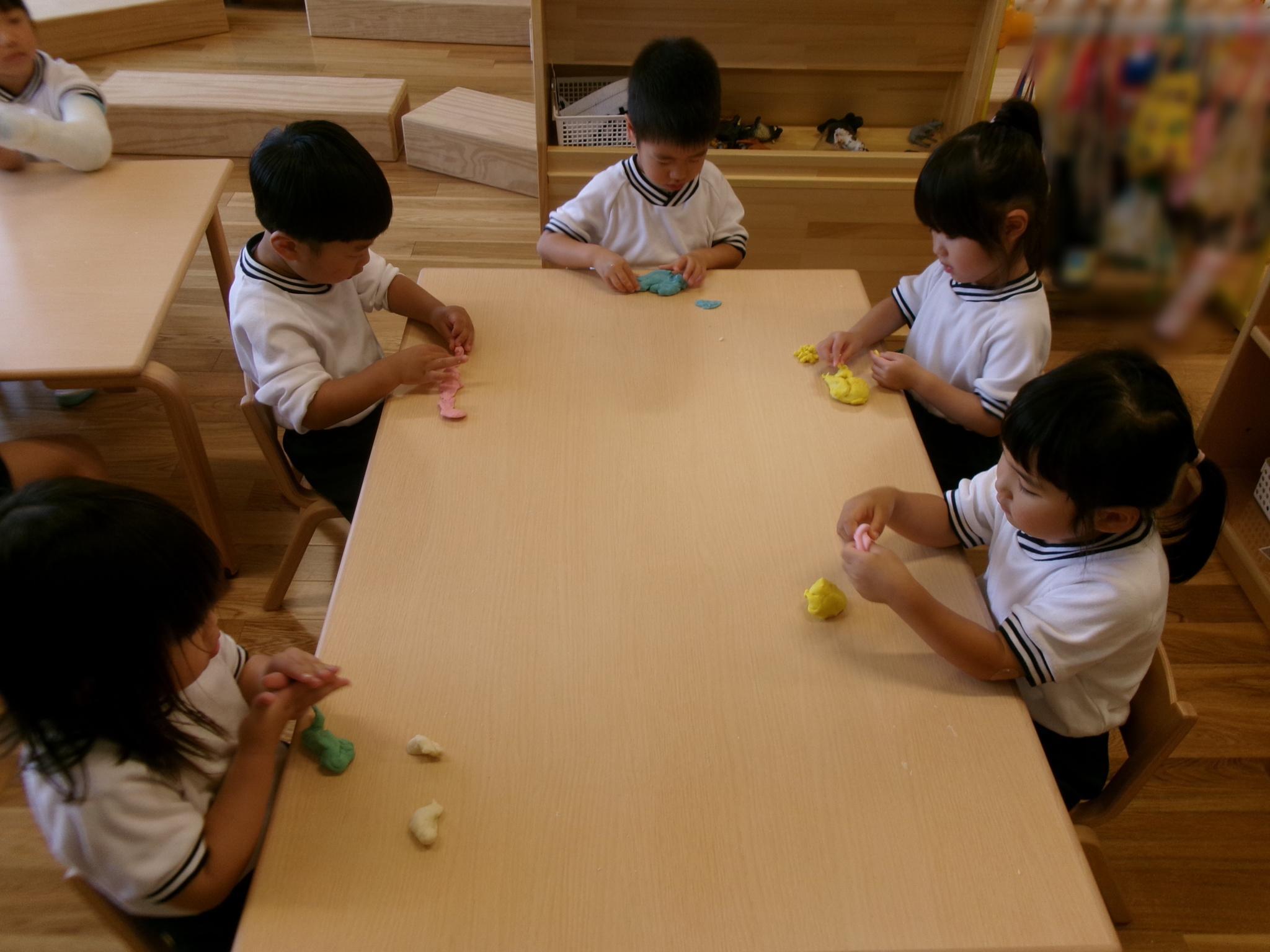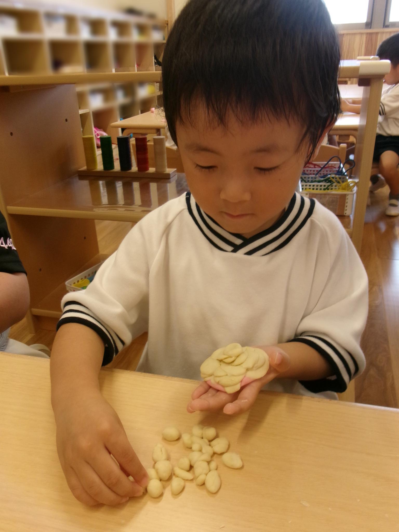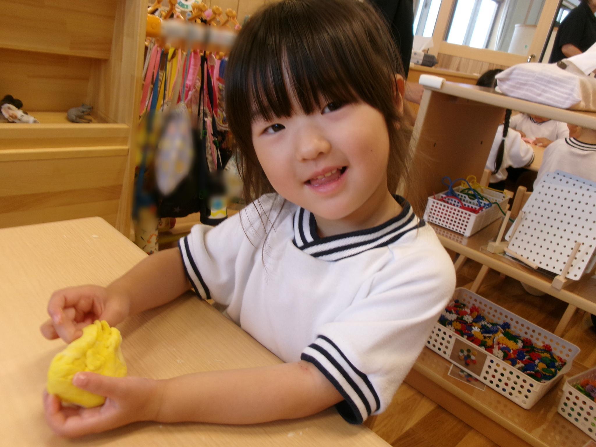 粉が粘土になっていく様子に驚いたり喜んだり…。指先でツンツンつついて感触を味わったり、ちぎって…まるめて…伸ばして…様々な形を作って楽しみました。