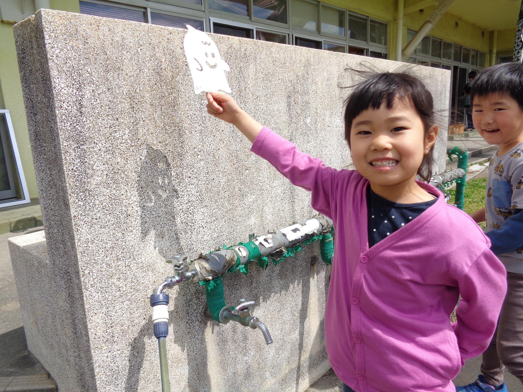 今日は月刊絵本のおばけシートを使い、園庭で遊具や地面・水道などに影を映してじっけん!「ここにやると大きく見えるよ!見て!!」「こっちは細い…」など比べてみたりしながらお友達と一緒に楽しみました。