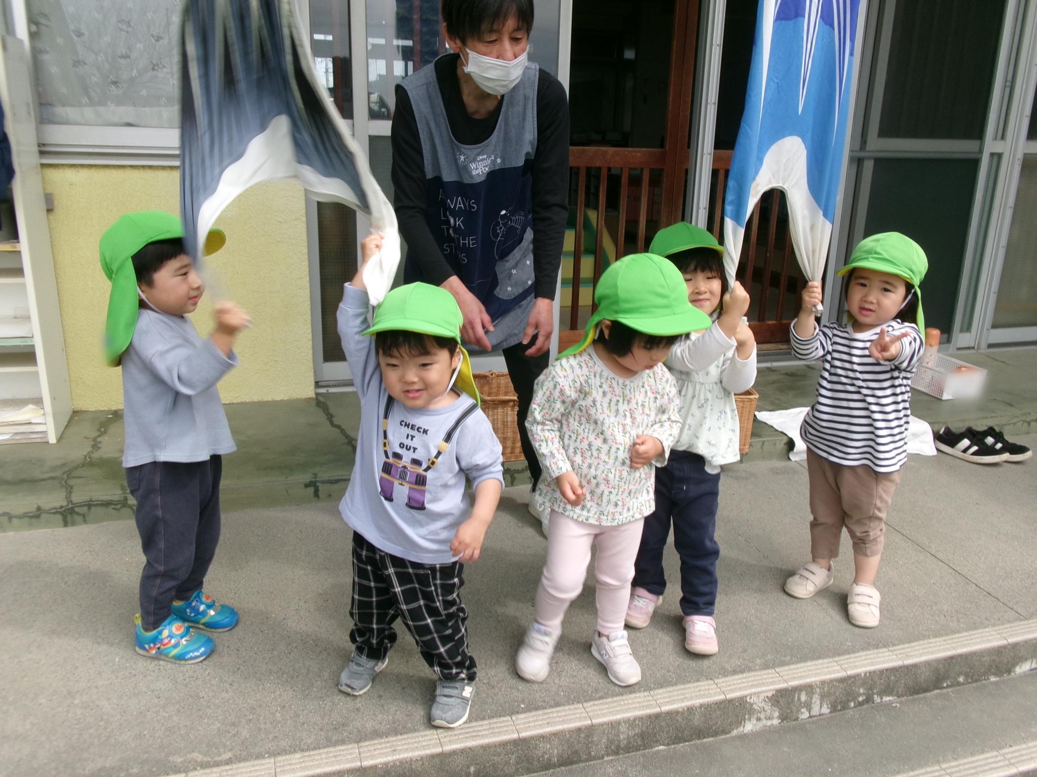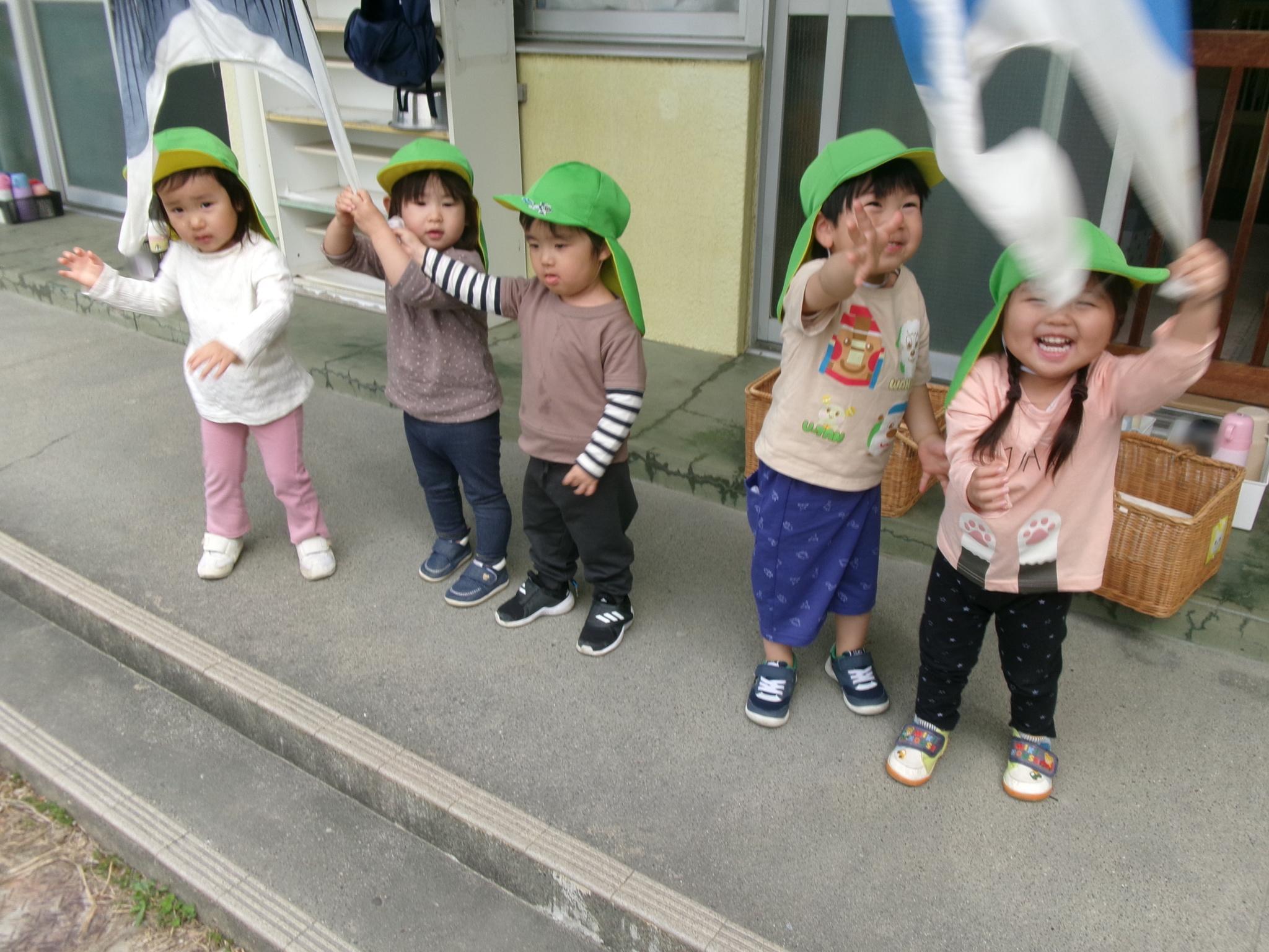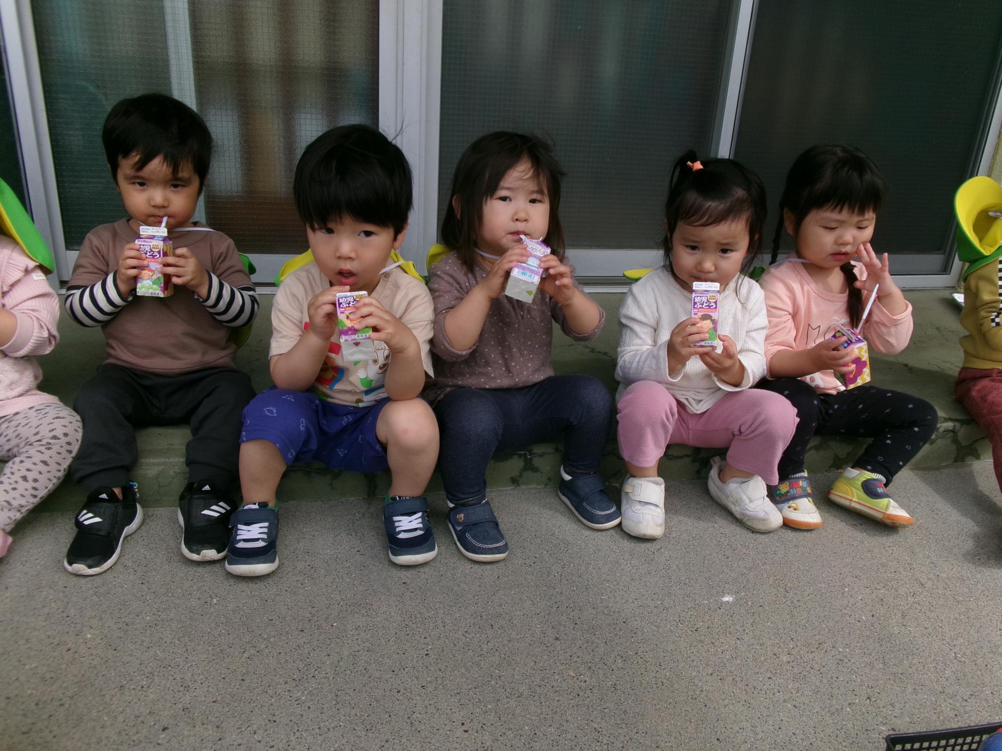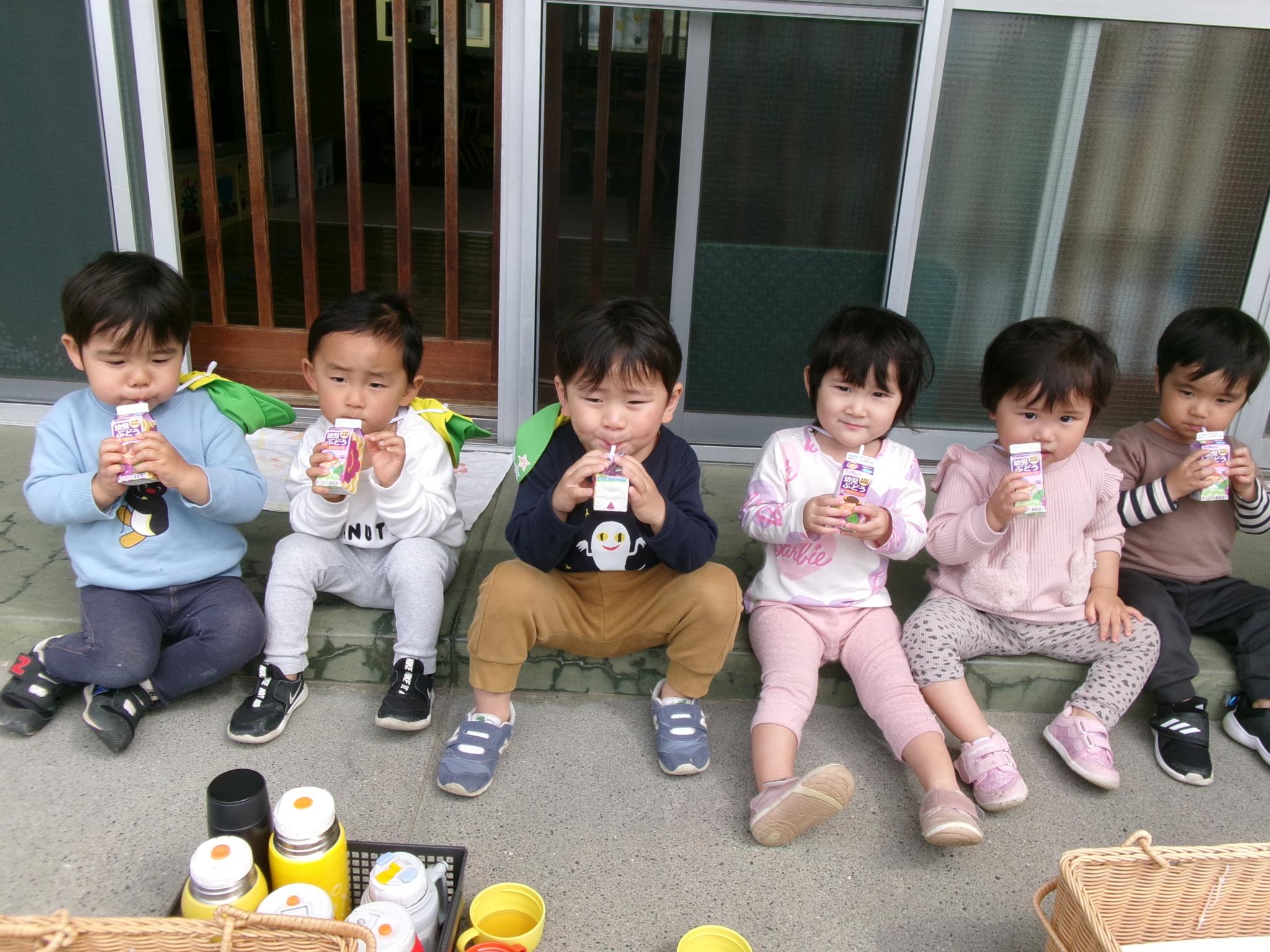 園庭にこいのぼりが出ました。今日のおやつはこいのぼりを見ながらテラスでジュースを飲みました。その後園庭でたくさん遊び、元気いっぱいのこどもたちでした。