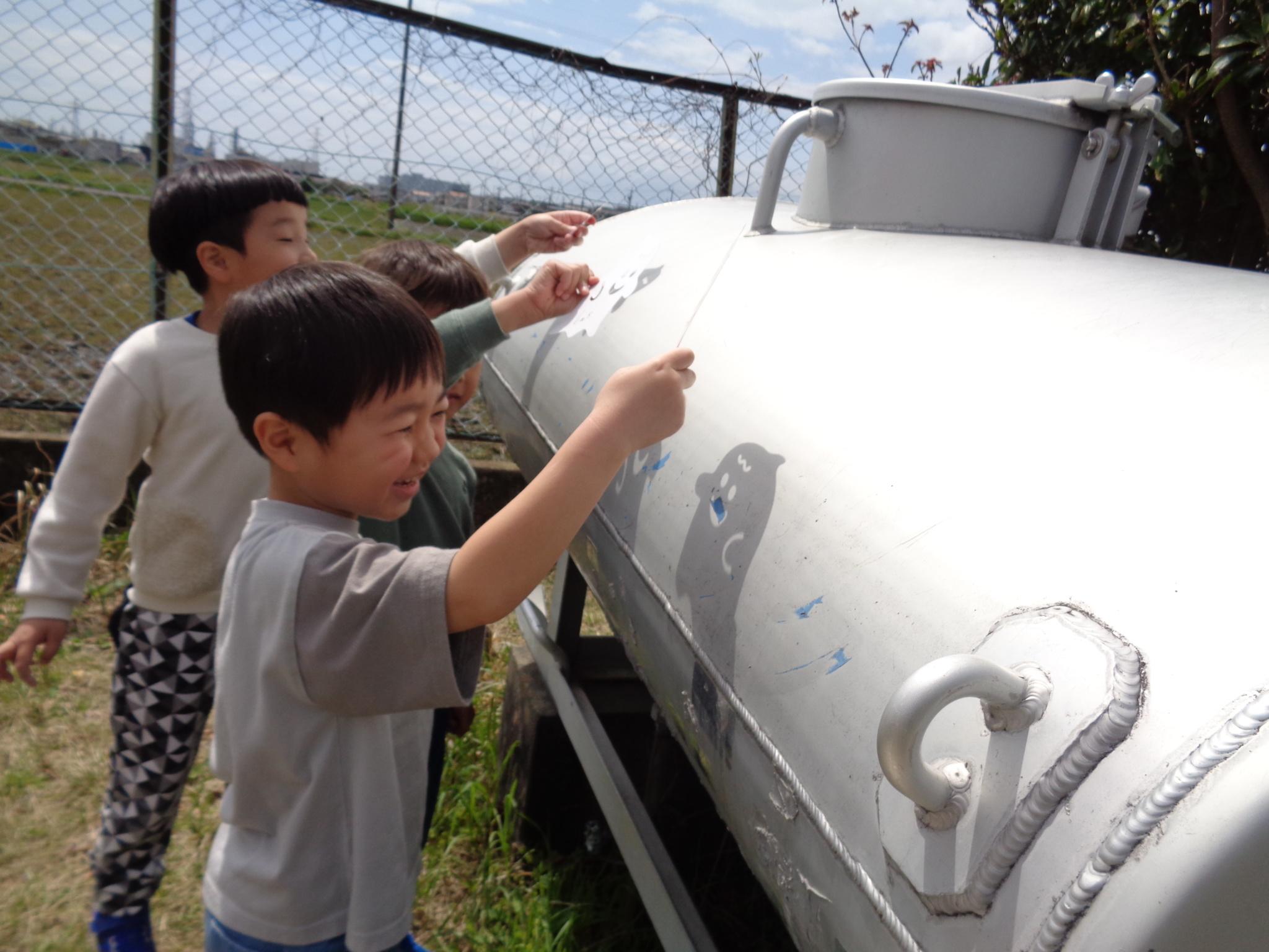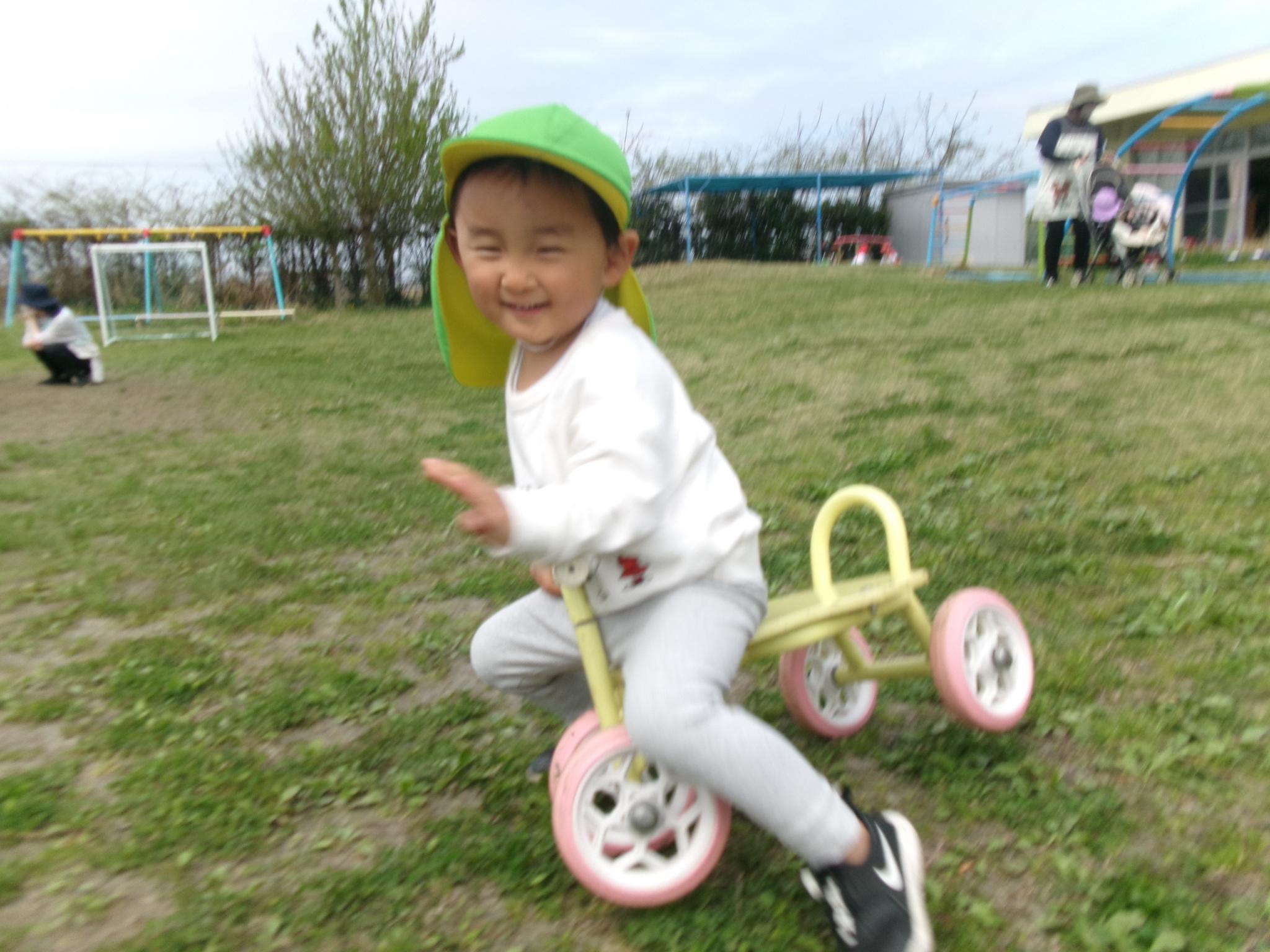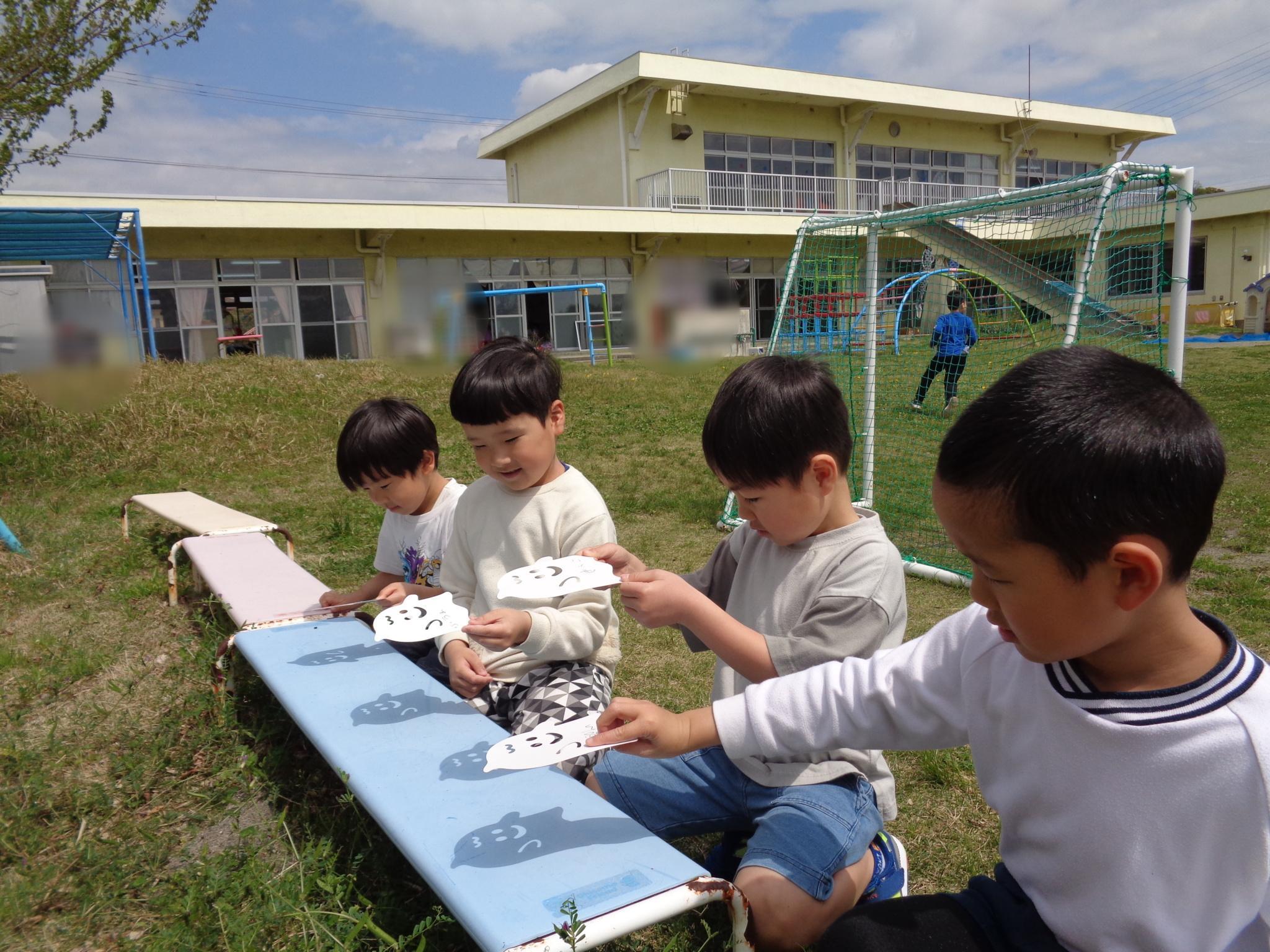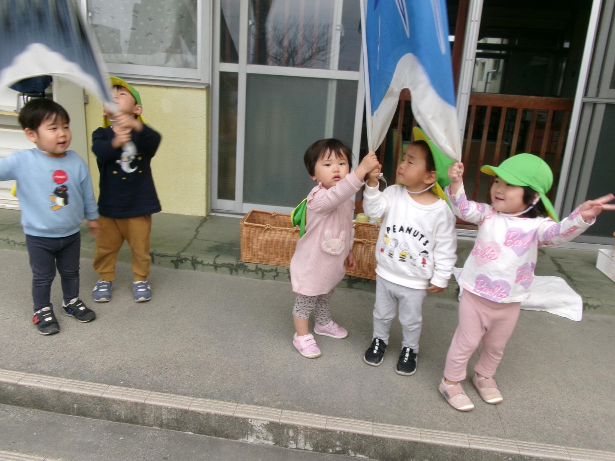 園庭にこいのぼりが出ました。今日のおやつはこいのぼりを見ながらテラスでジュースを飲みました。その後園庭でたくさん遊び、元気いっぱいのこどもたちでした。