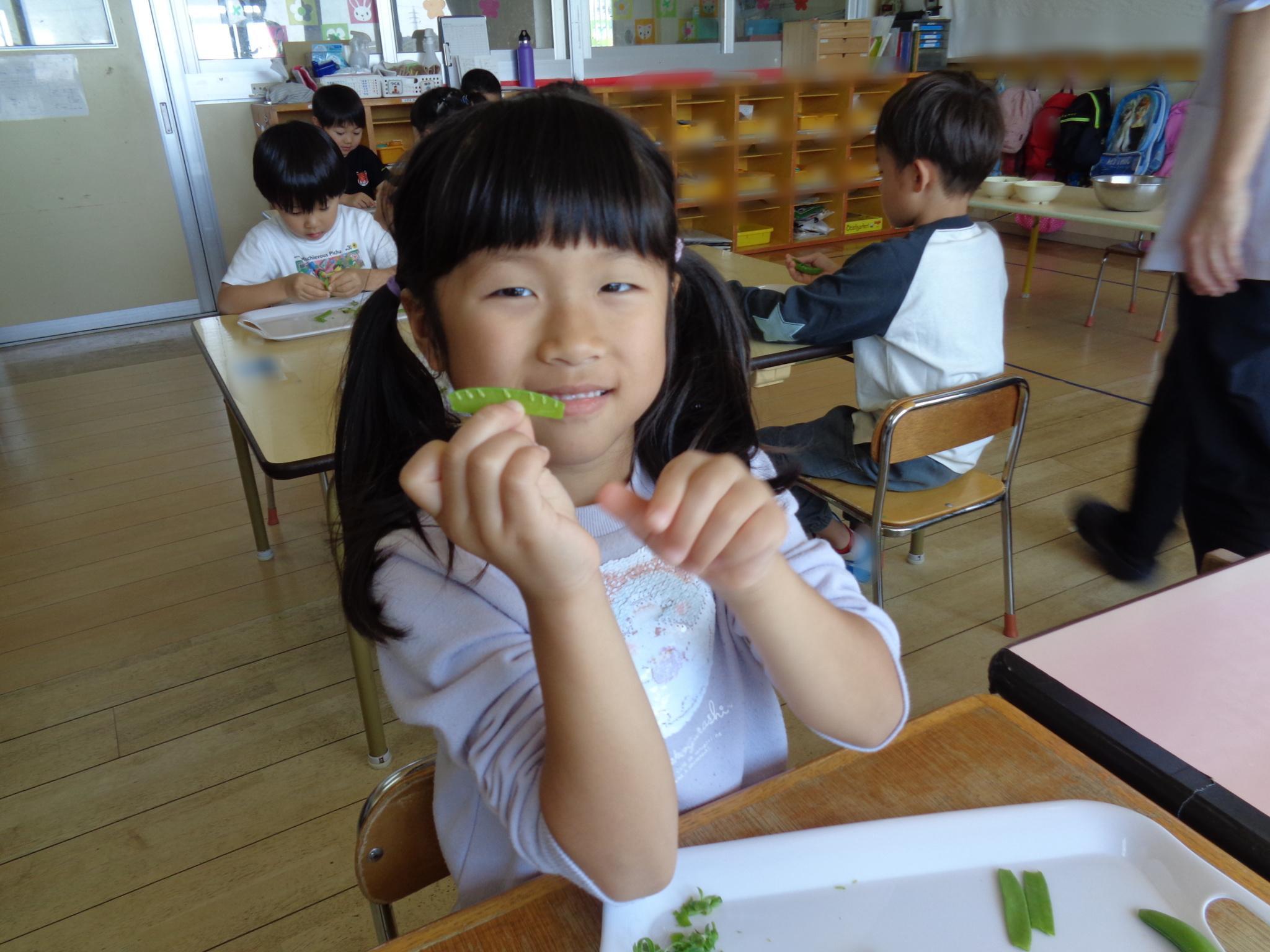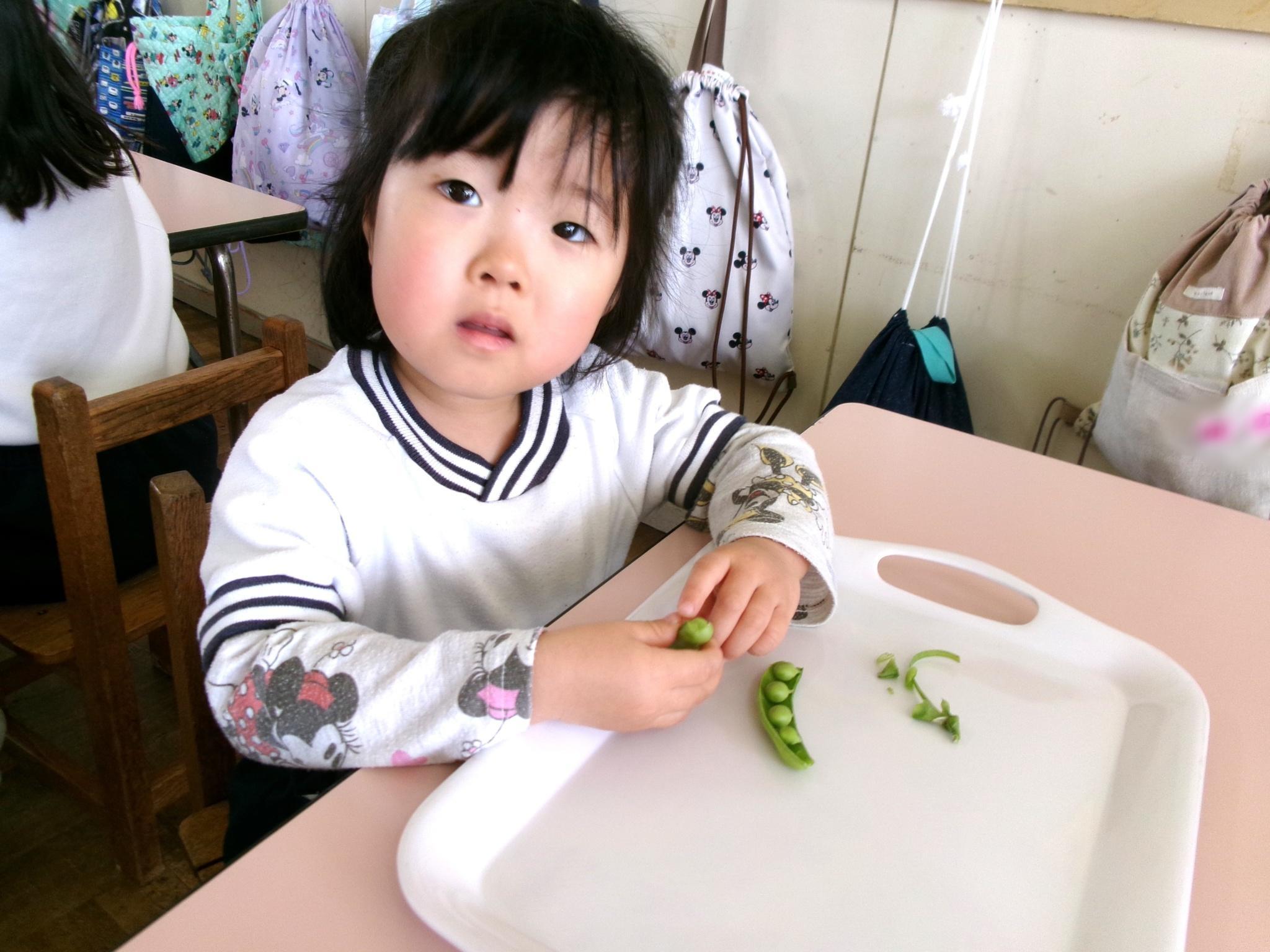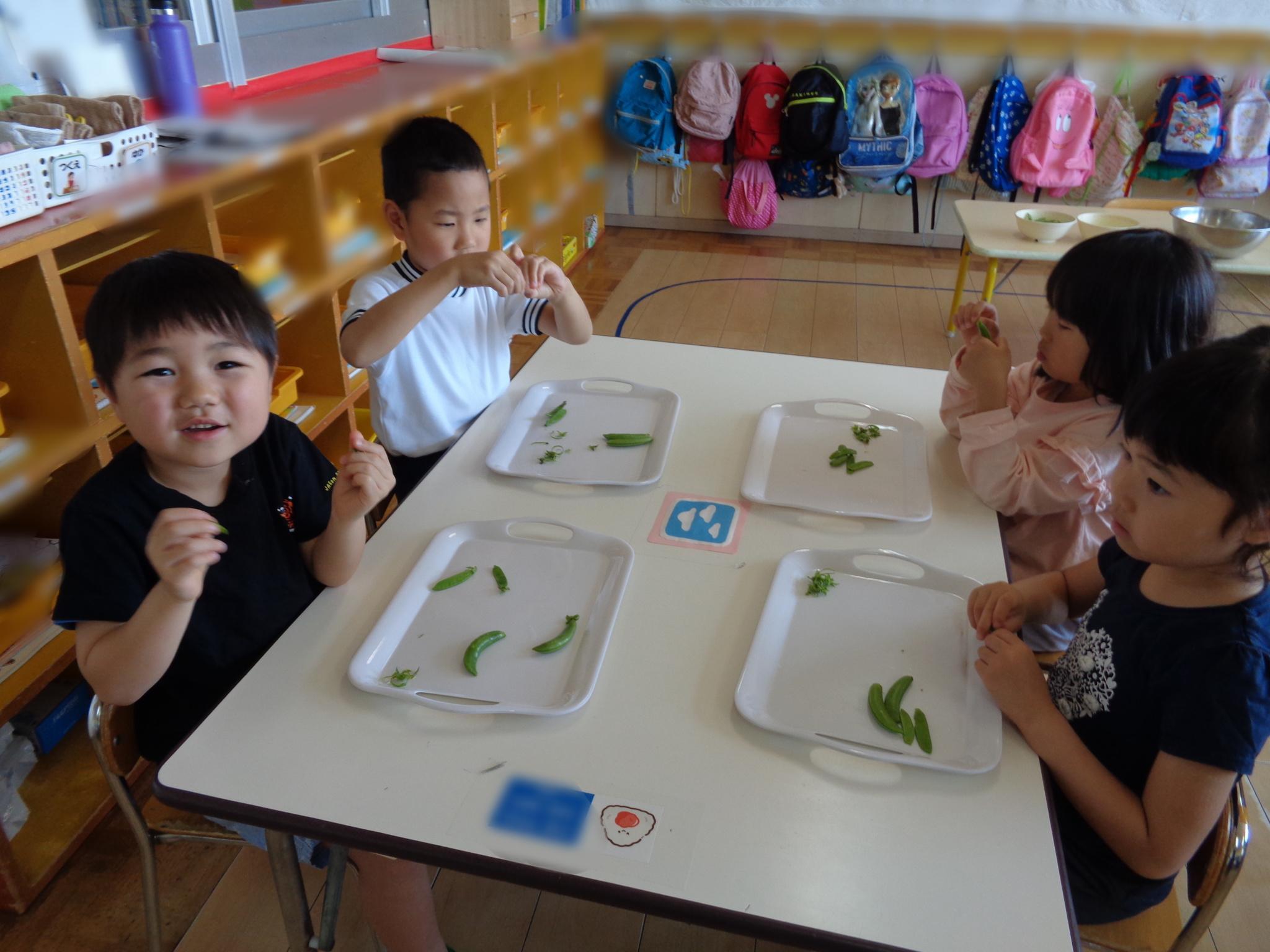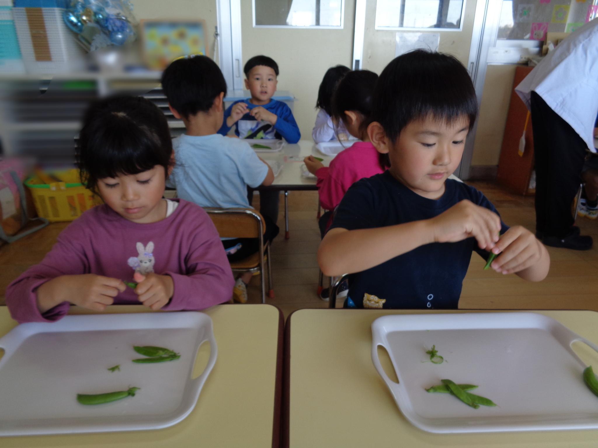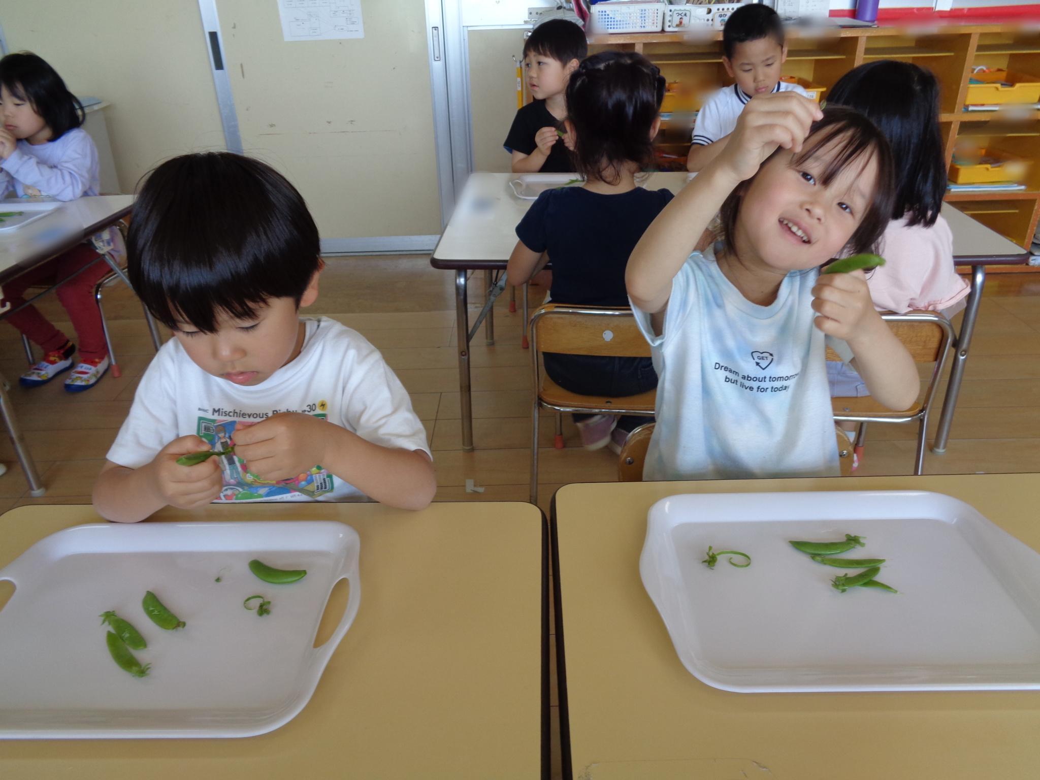 栄養士との食育でスナップエンドウと絹さやのすじ取りに挑戦しました。すじが切れないように慎重に取り組む子どもたち。「親子みたいでかわいいね」とほっこり。楽しく活動することができました!