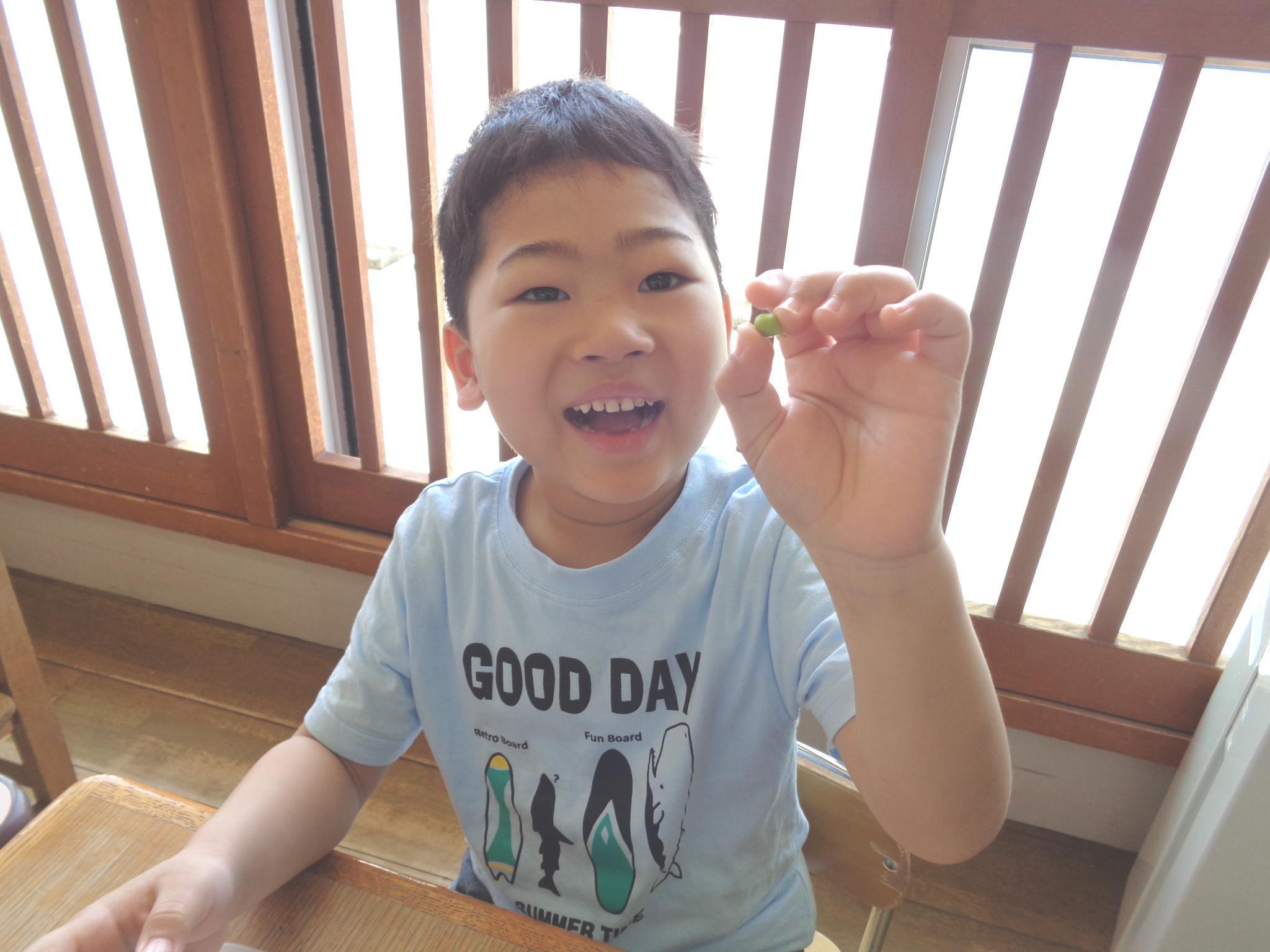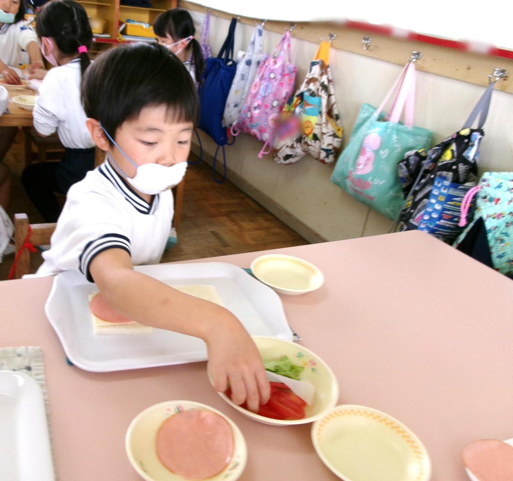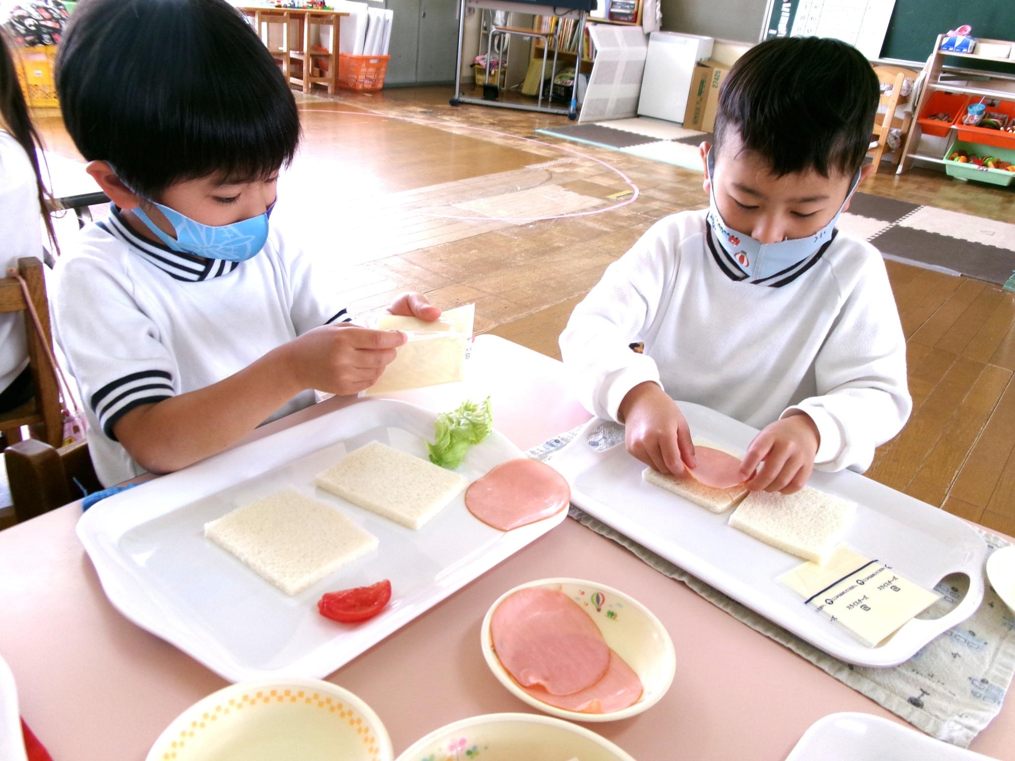 スナップえんどうのすじ取りをしました。二つのうちの一つを皮をむいて中のお豆を見ました。「小さくてかわいいお豆あったよ」と教えてくれました。給食では、自分でサンドイッチを作り「パーティみたいだね」と嬉しそうな子どもたちでした。