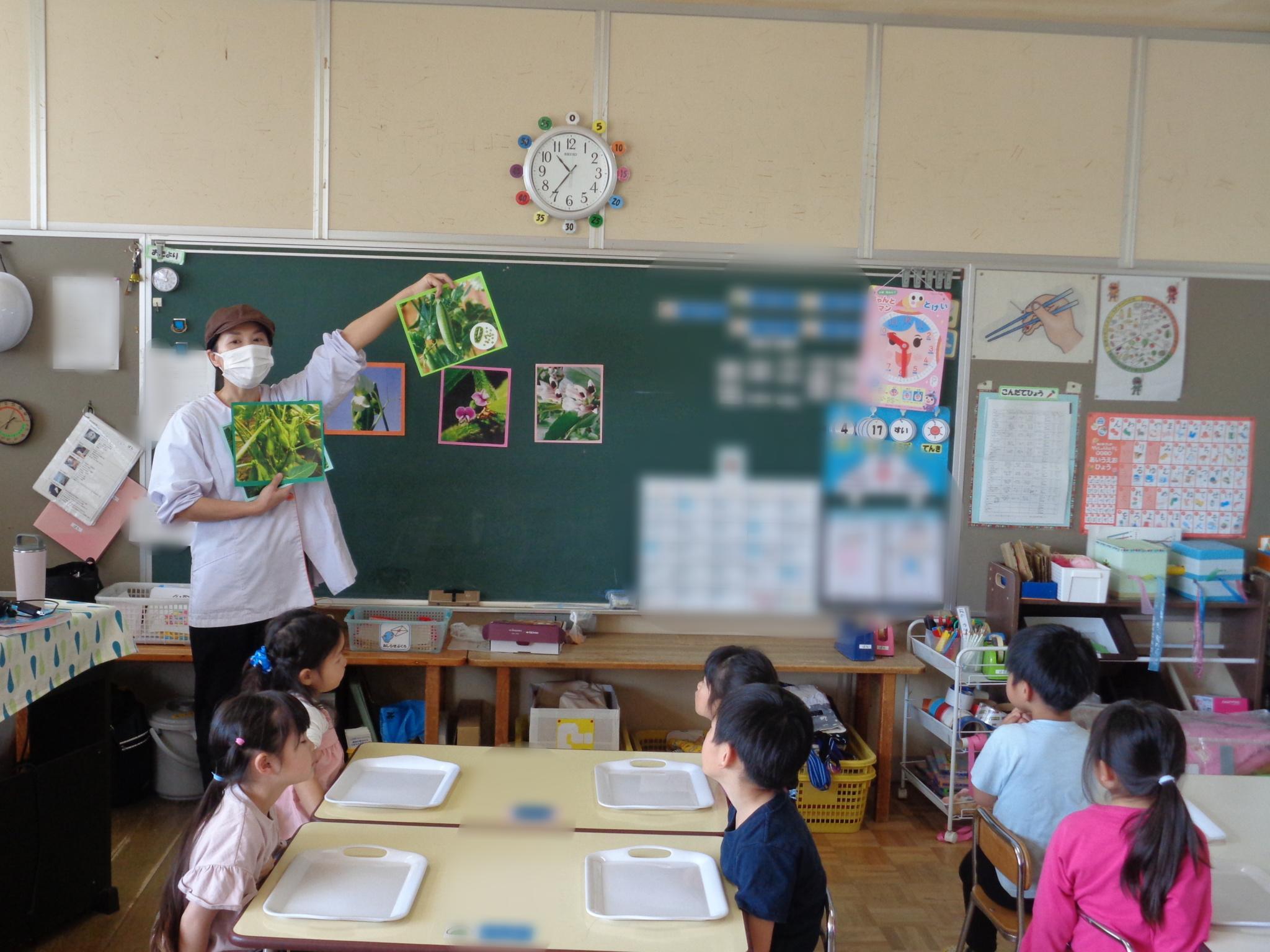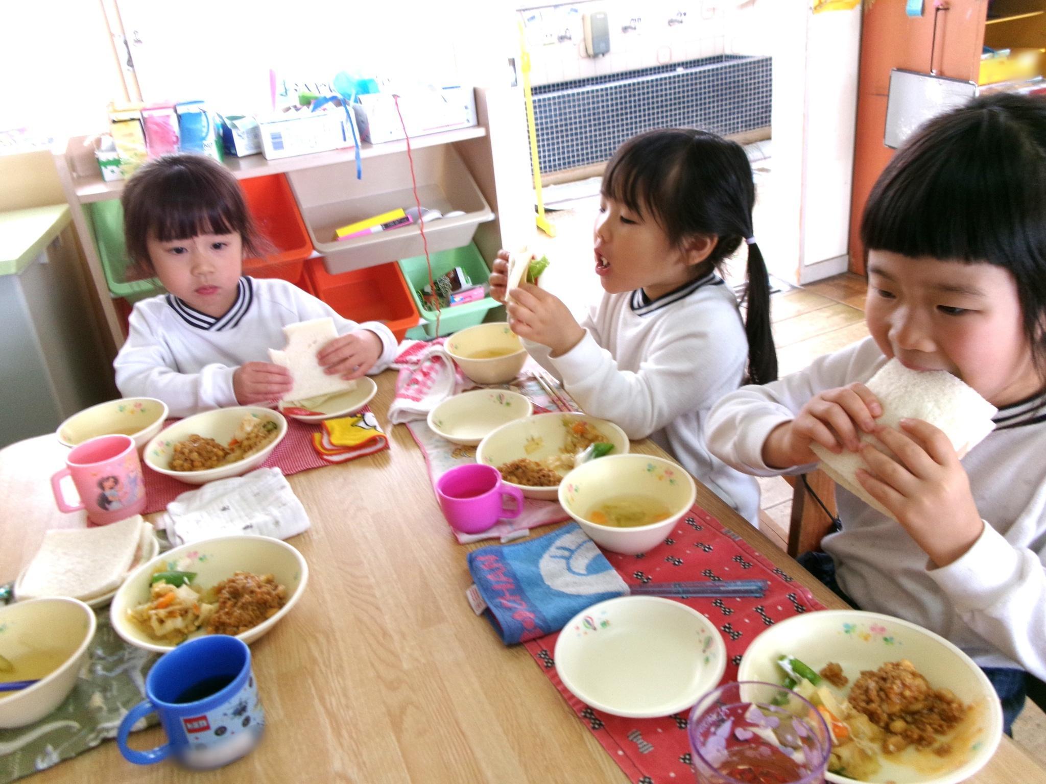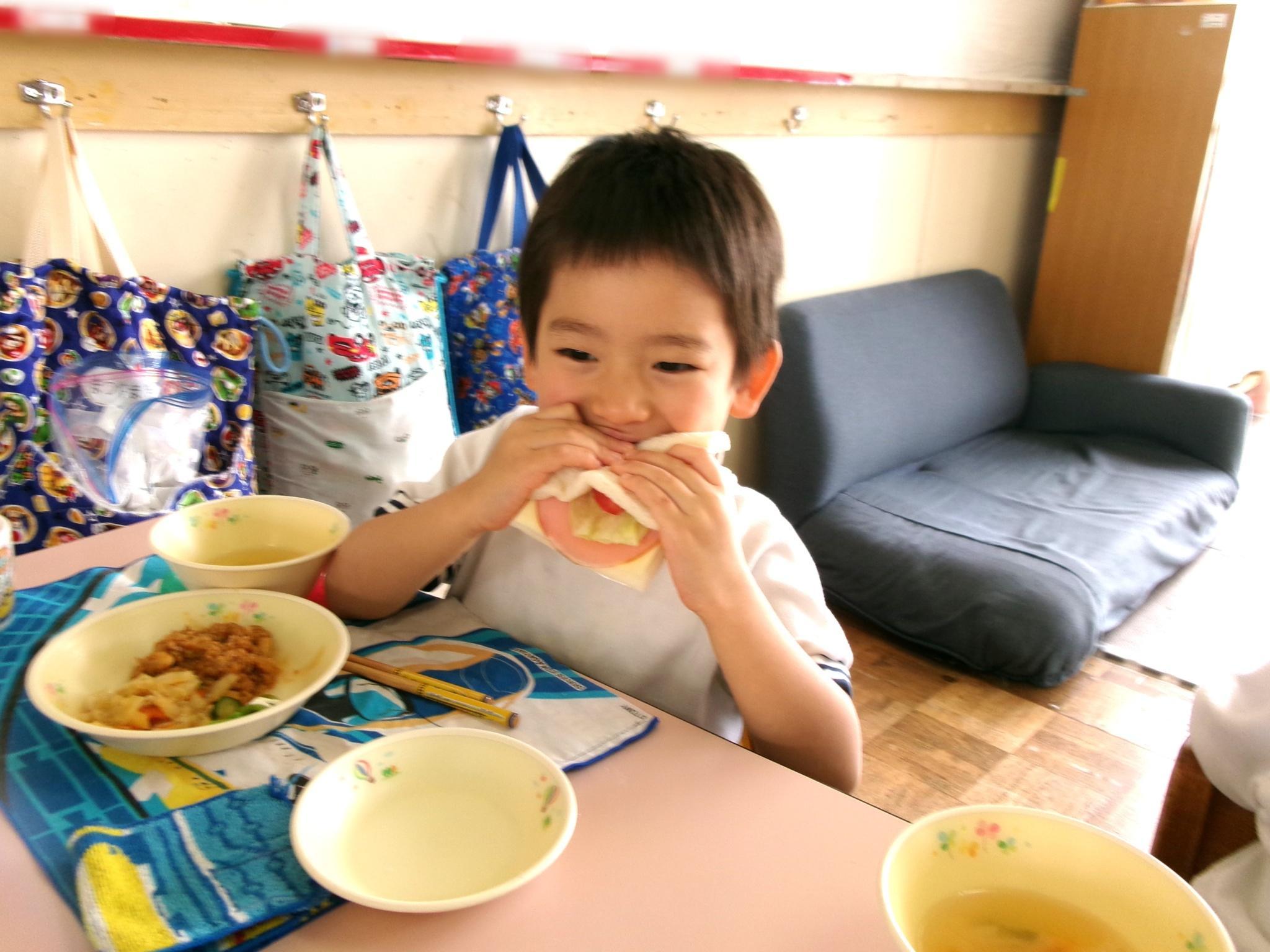 スナップえんどうのすじ取りをしました。二つのうちの一つを皮をむいて中のお豆を見ました。「小さくてかわいいお豆あったよ」と教えてくれました。給食では、自分でサンドイッチを作り「パーティみたいだね」と嬉しそうな子どもたちでした。