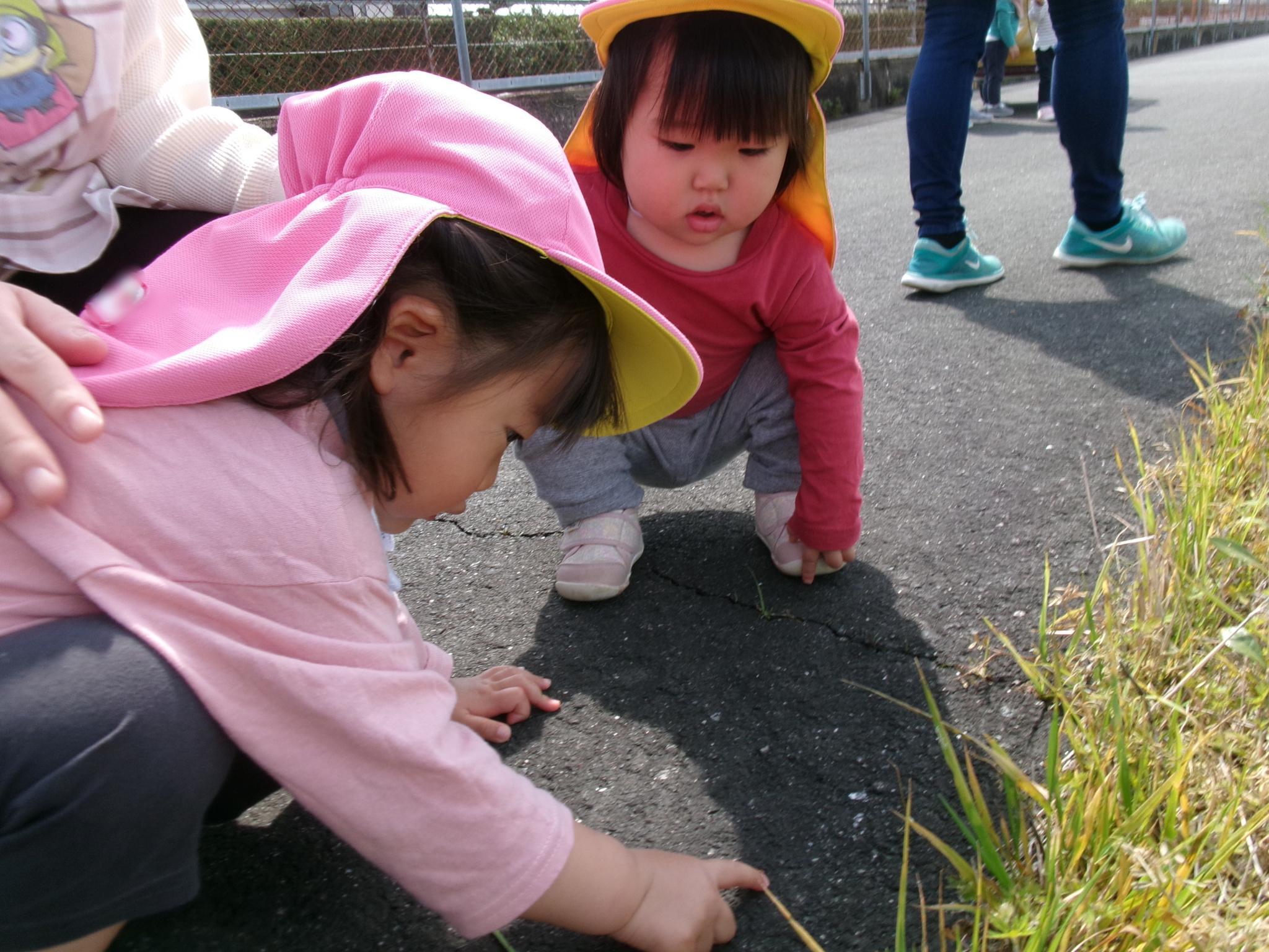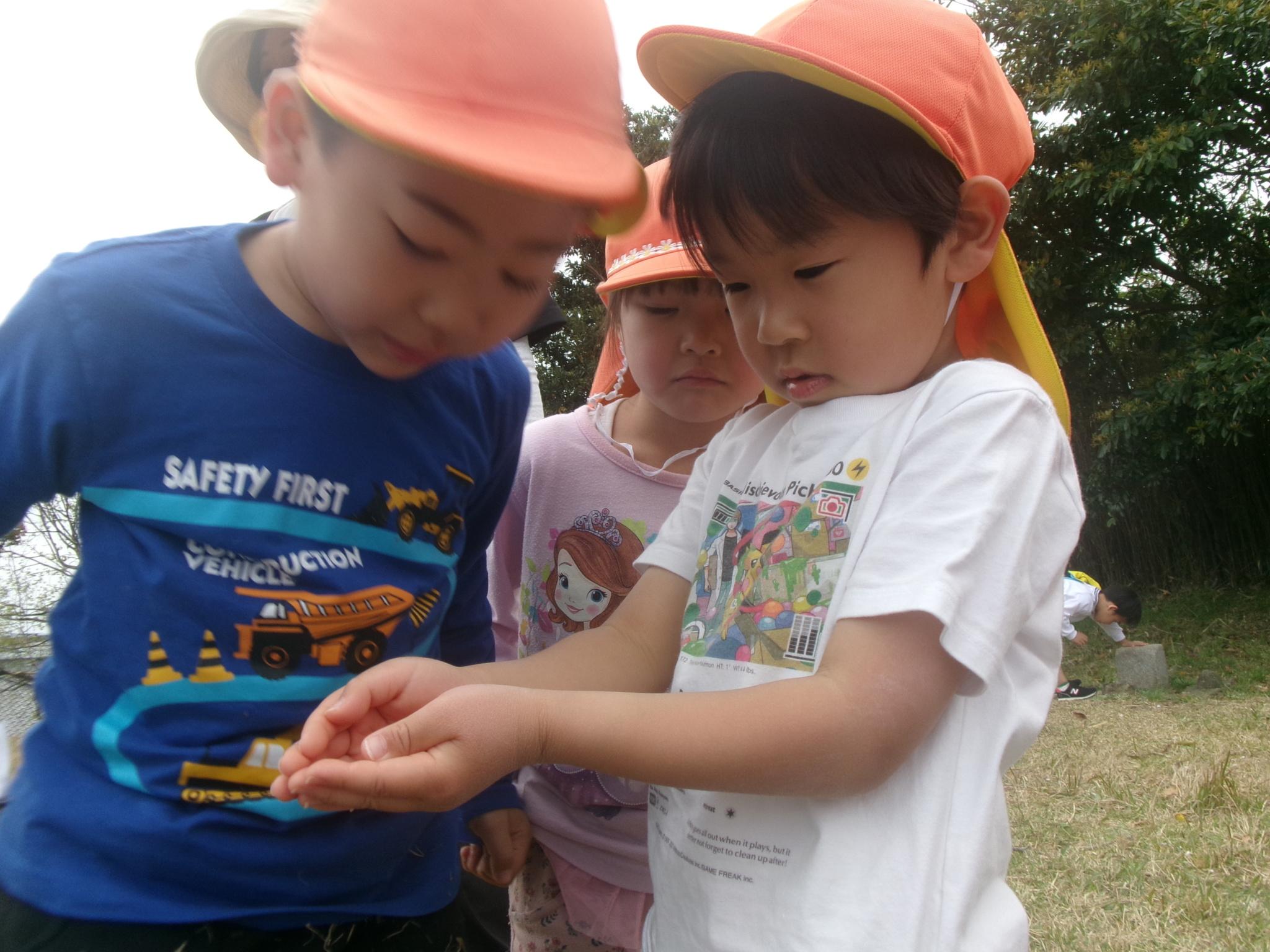 てんとう虫、ちょうちょなど様々な虫を見つけて大喜び!!指にのせたり体にはわせたりと虫たちと仲良くなった子どもたち。次は何を探しに行こうかな?