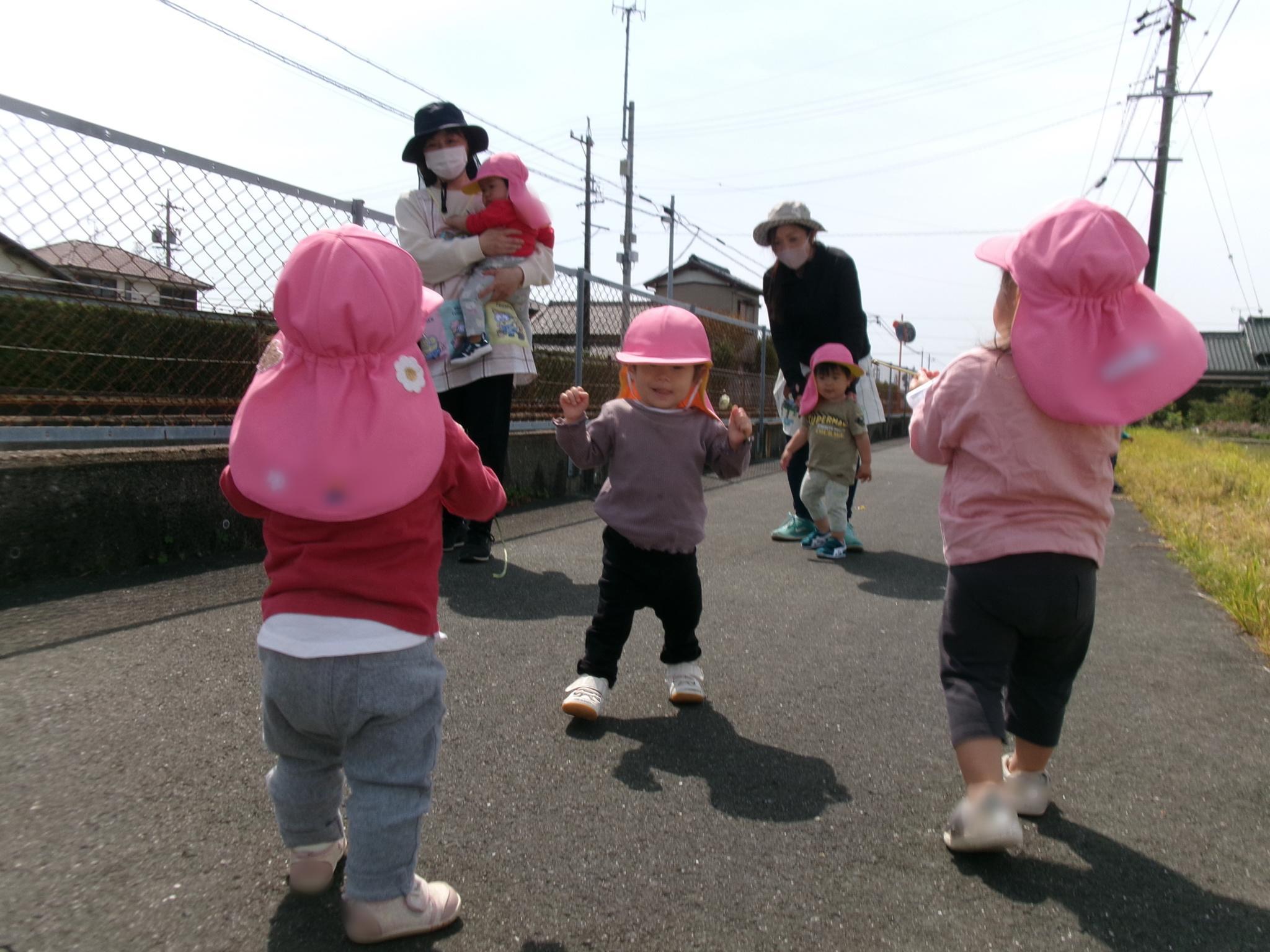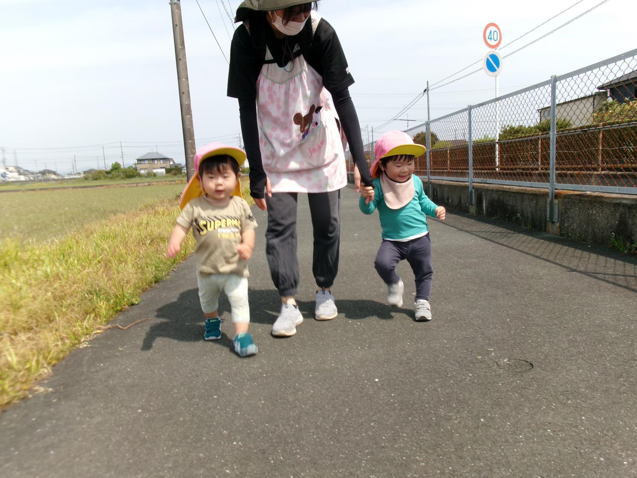 良い天気の中、散歩車やベビーカーに乗って園周辺を散歩しました。春探しを楽しみながら、風にあたって気持ちよさそうでした。新入園児にとっては、初めてのお散歩でした♪