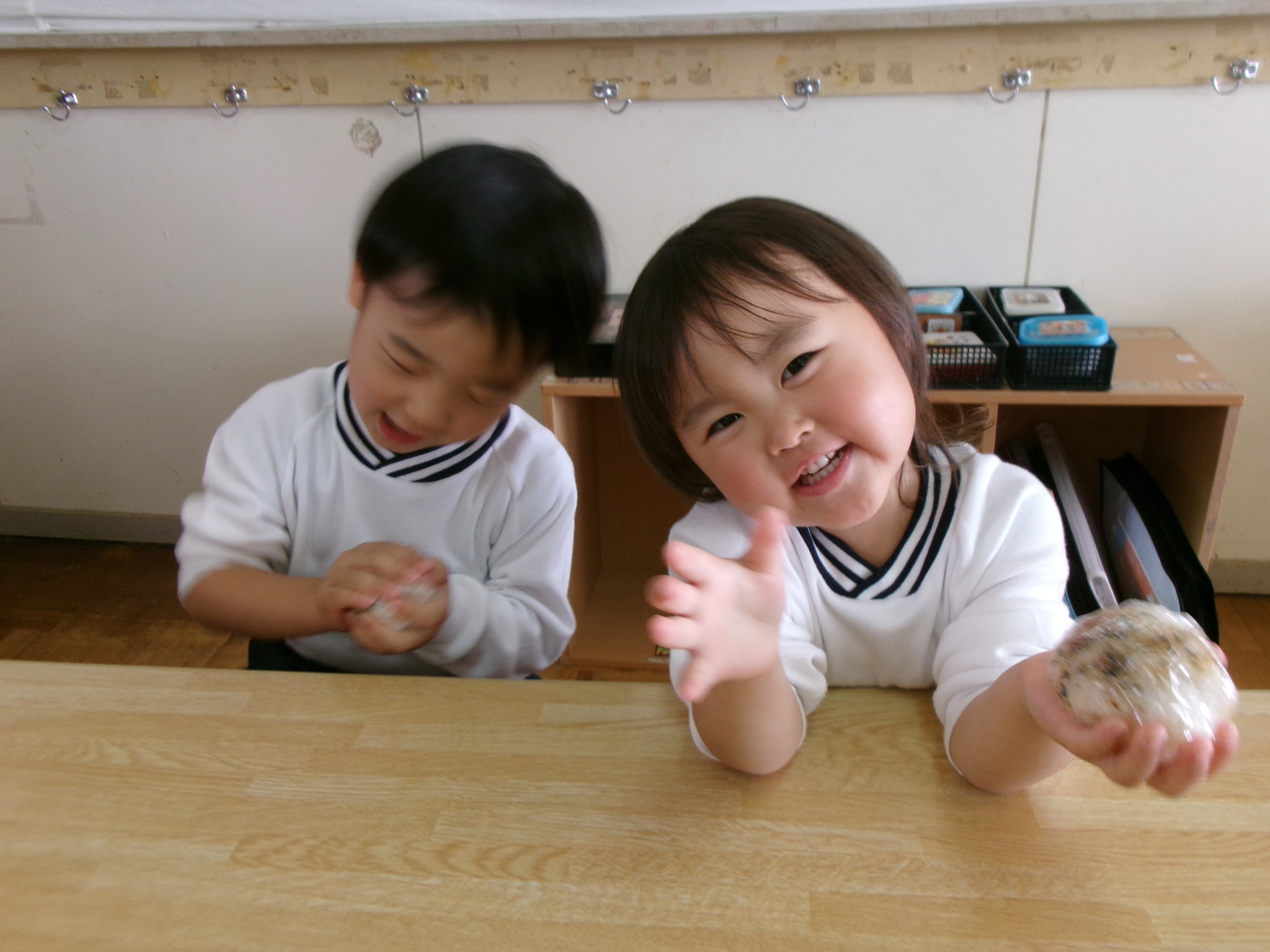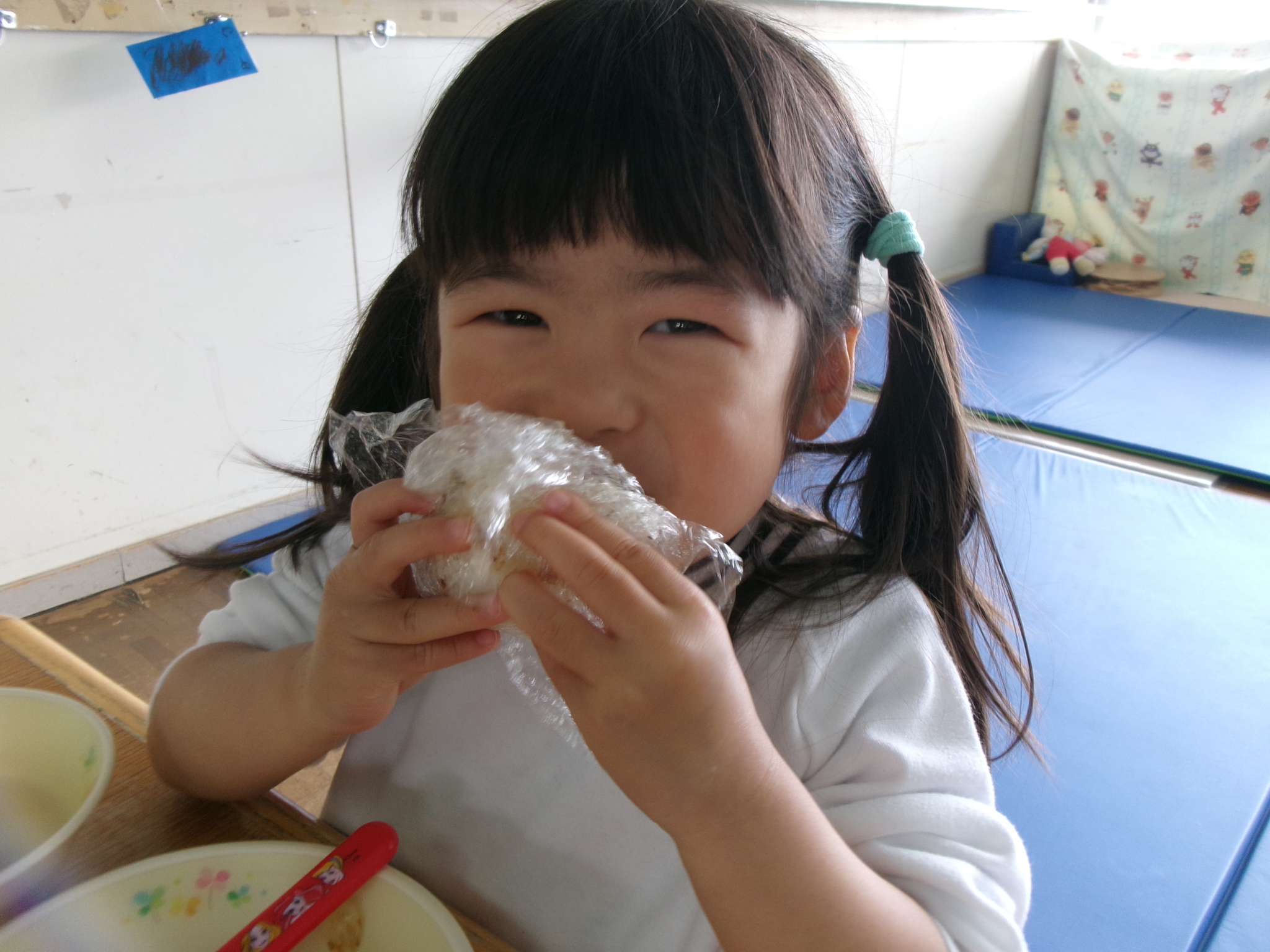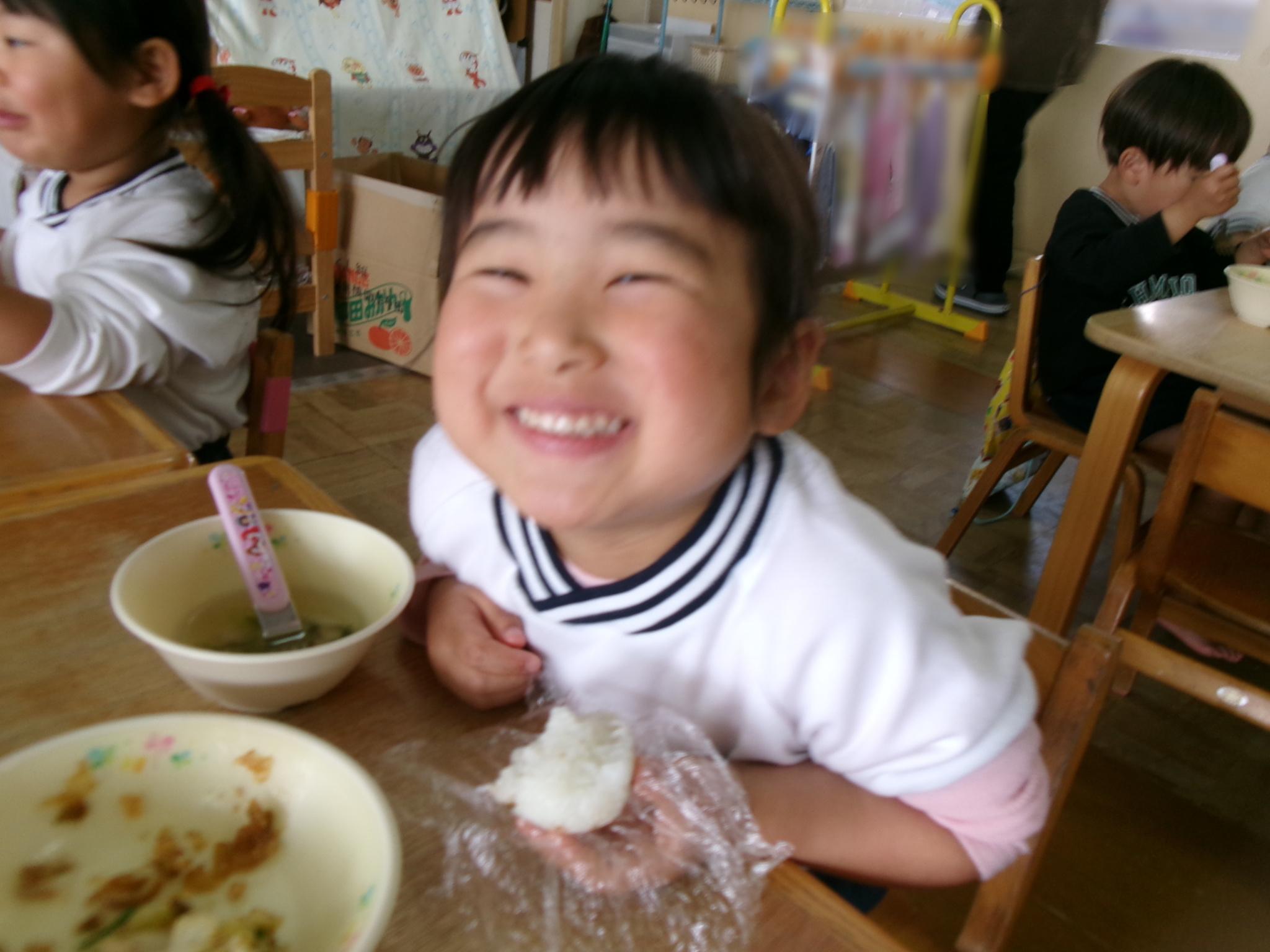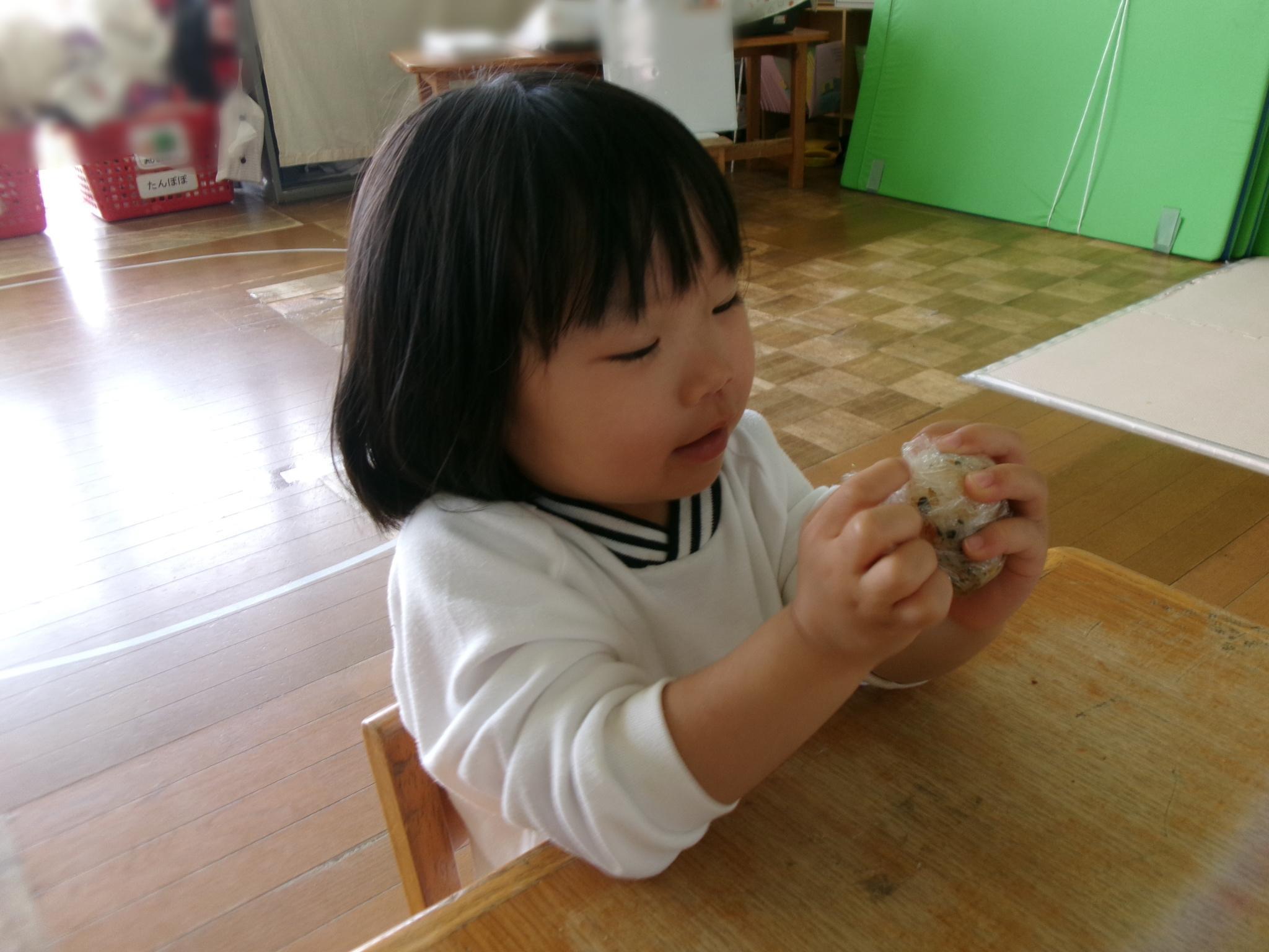 月刊絵本の『おにぎりへんしん』を読んだ後ふりかけごはんでおにぎりを作りました。「おいしい」と、自分で作ったおにぎりを味わう子どもたちでした。