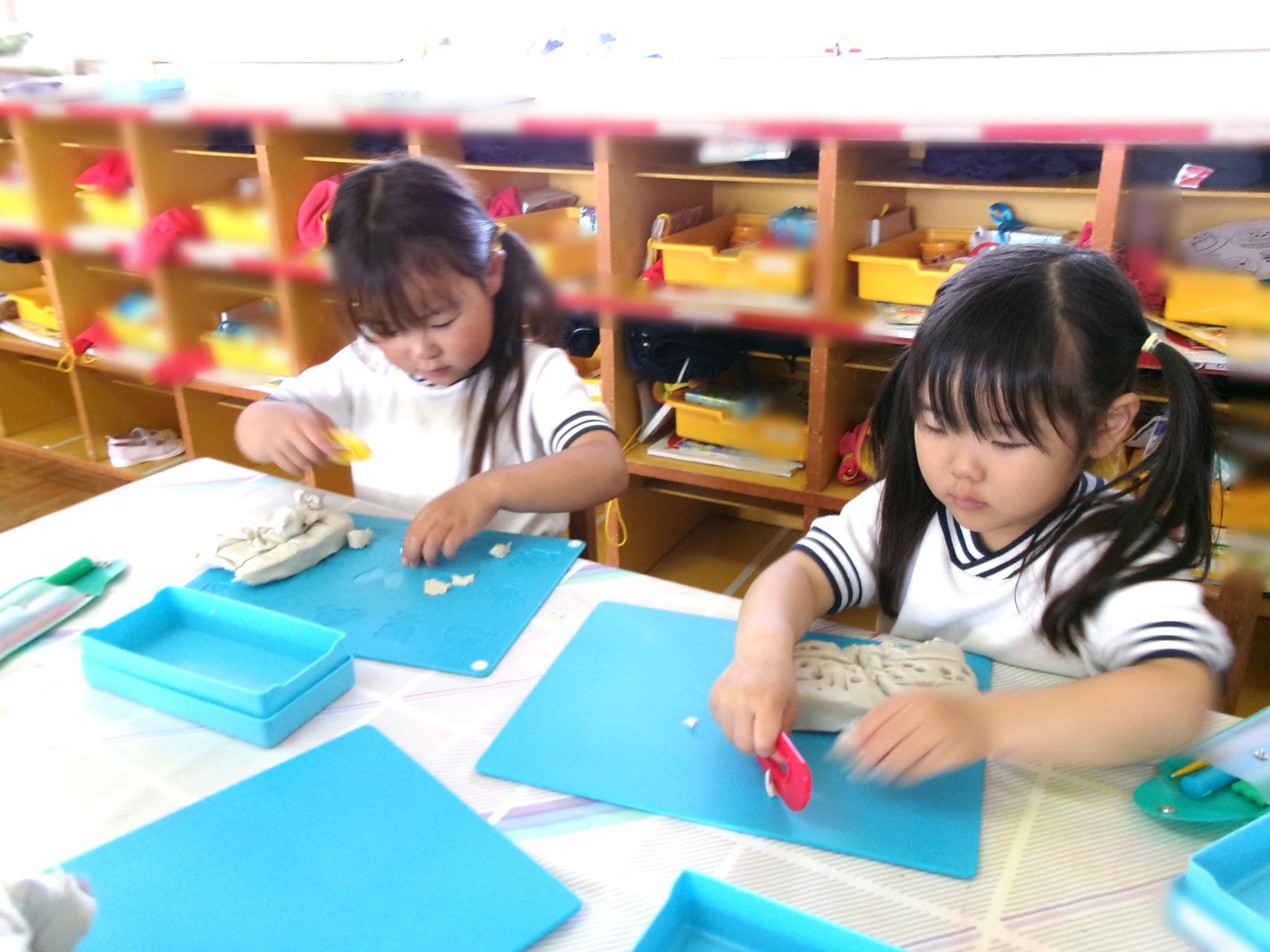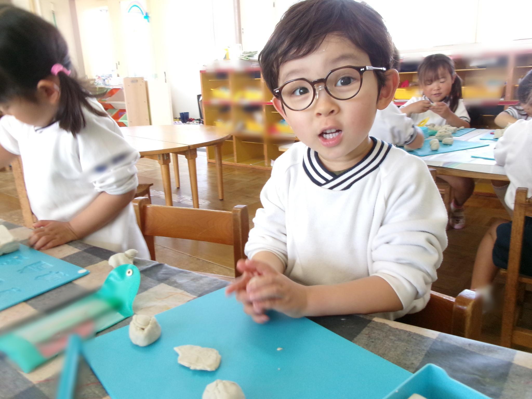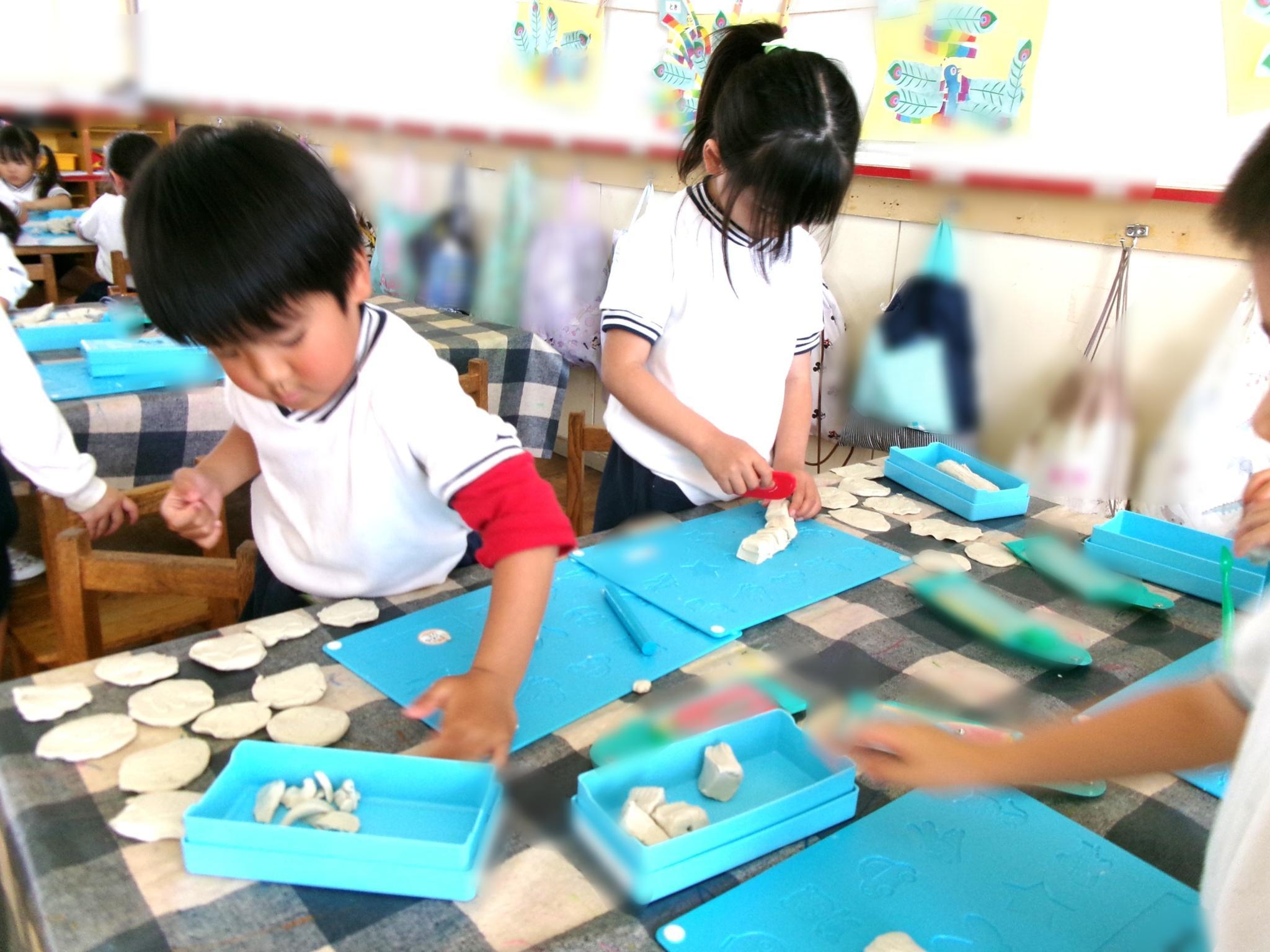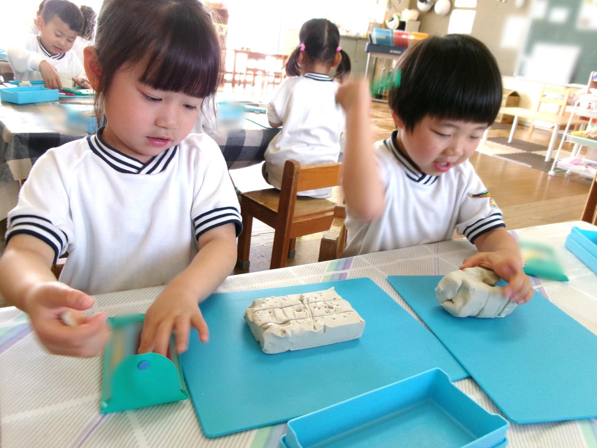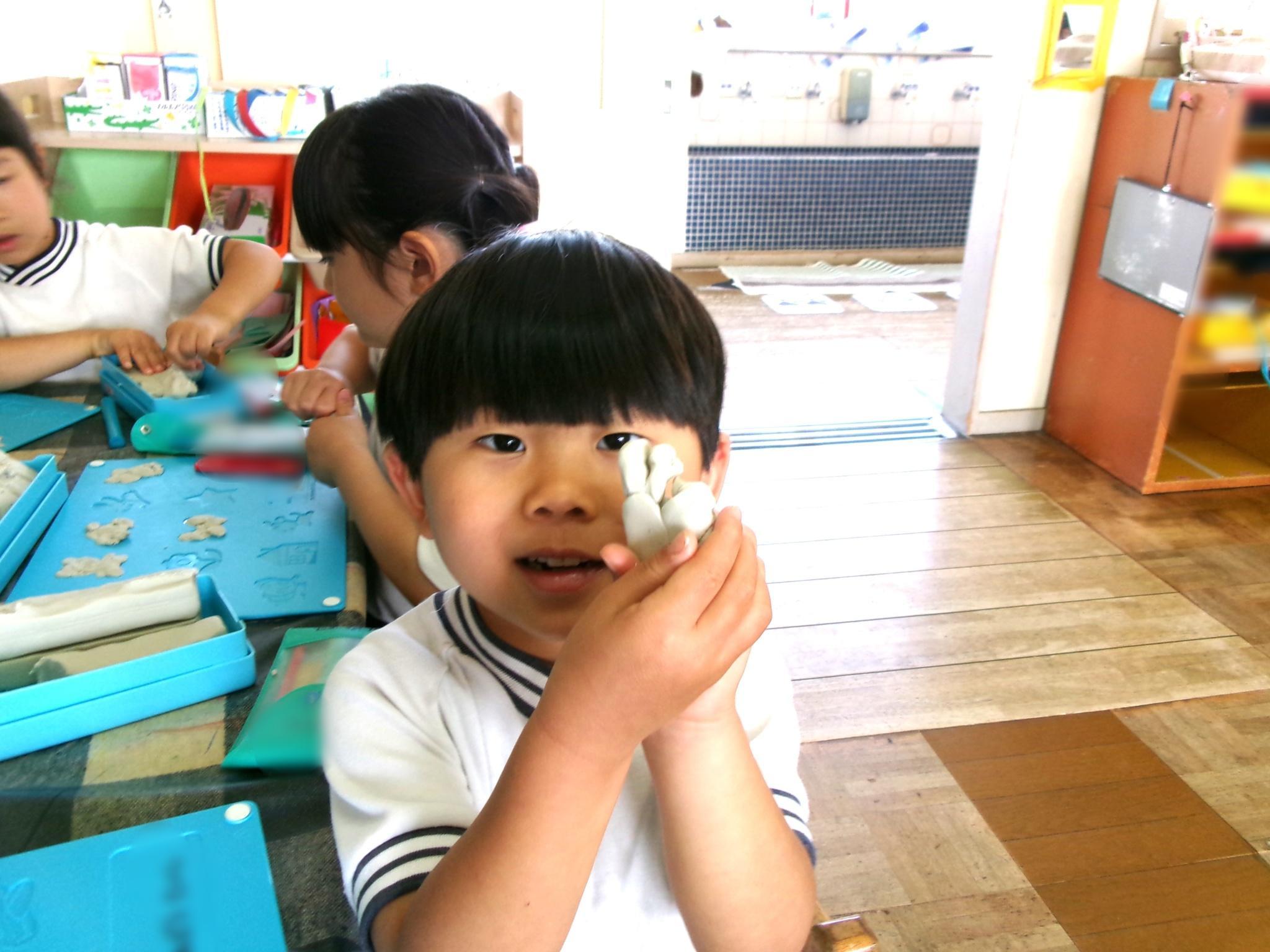 子どもたちが楽しみにしていた粘土遊びです。餃子やドーナツを作ったり、スタンプの型を押したりして楽しみました。