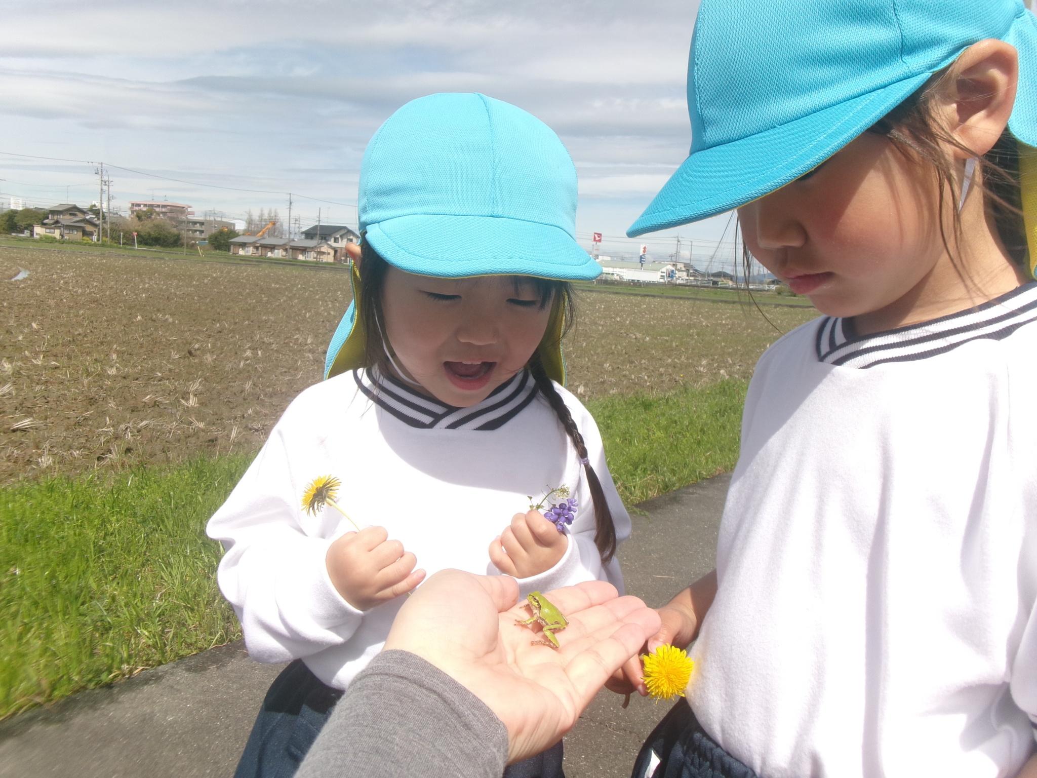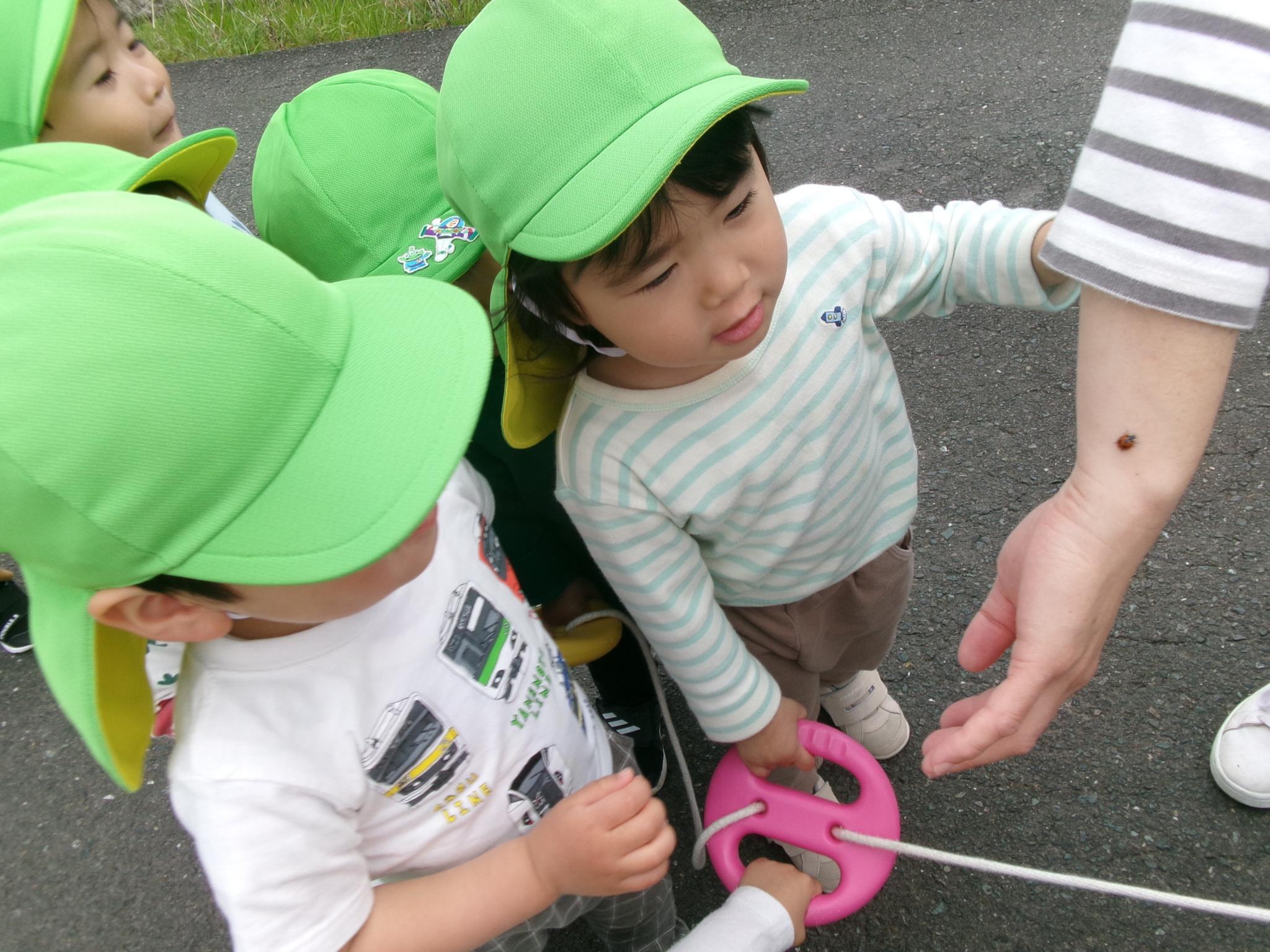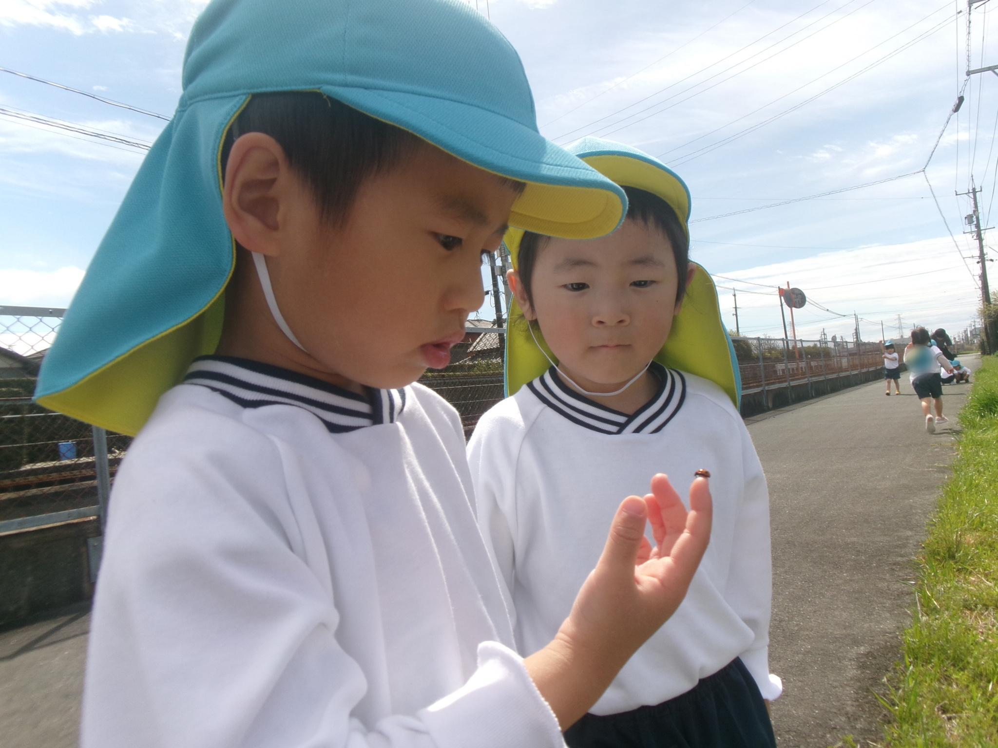 川沿いへお散歩に行きました。タンポポやれんげ、ちょうちょうてんとう虫を見つけました。月刊絵本の春探しを読んだ後だったので、「あった!!」「いた!!」と見つけると嬉しそうな子どもたちでした。