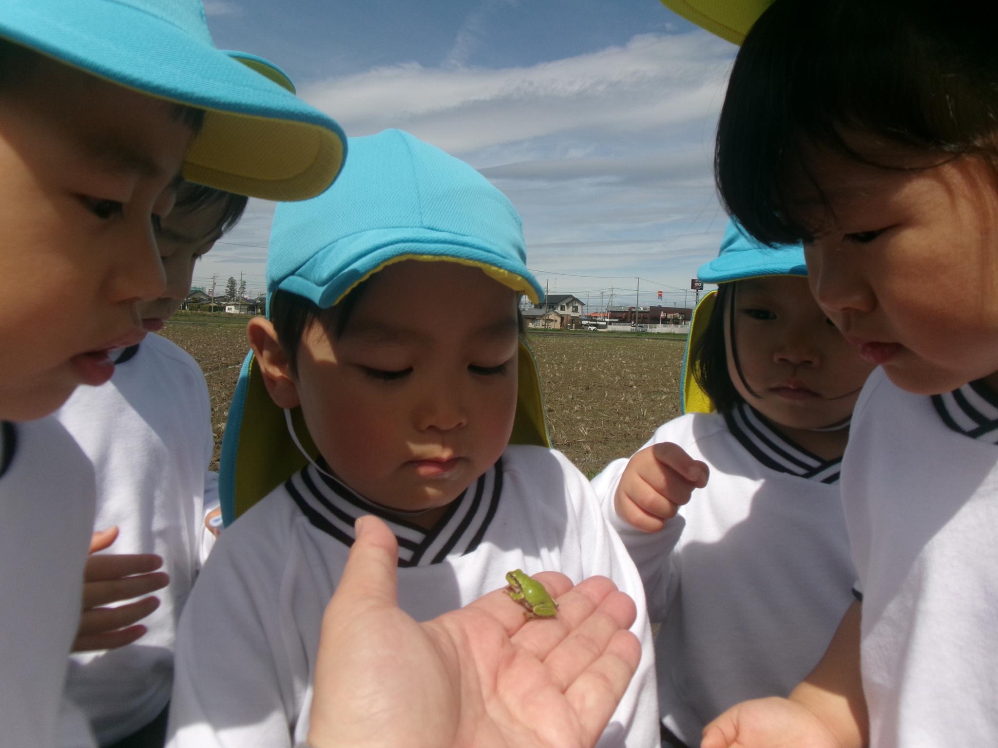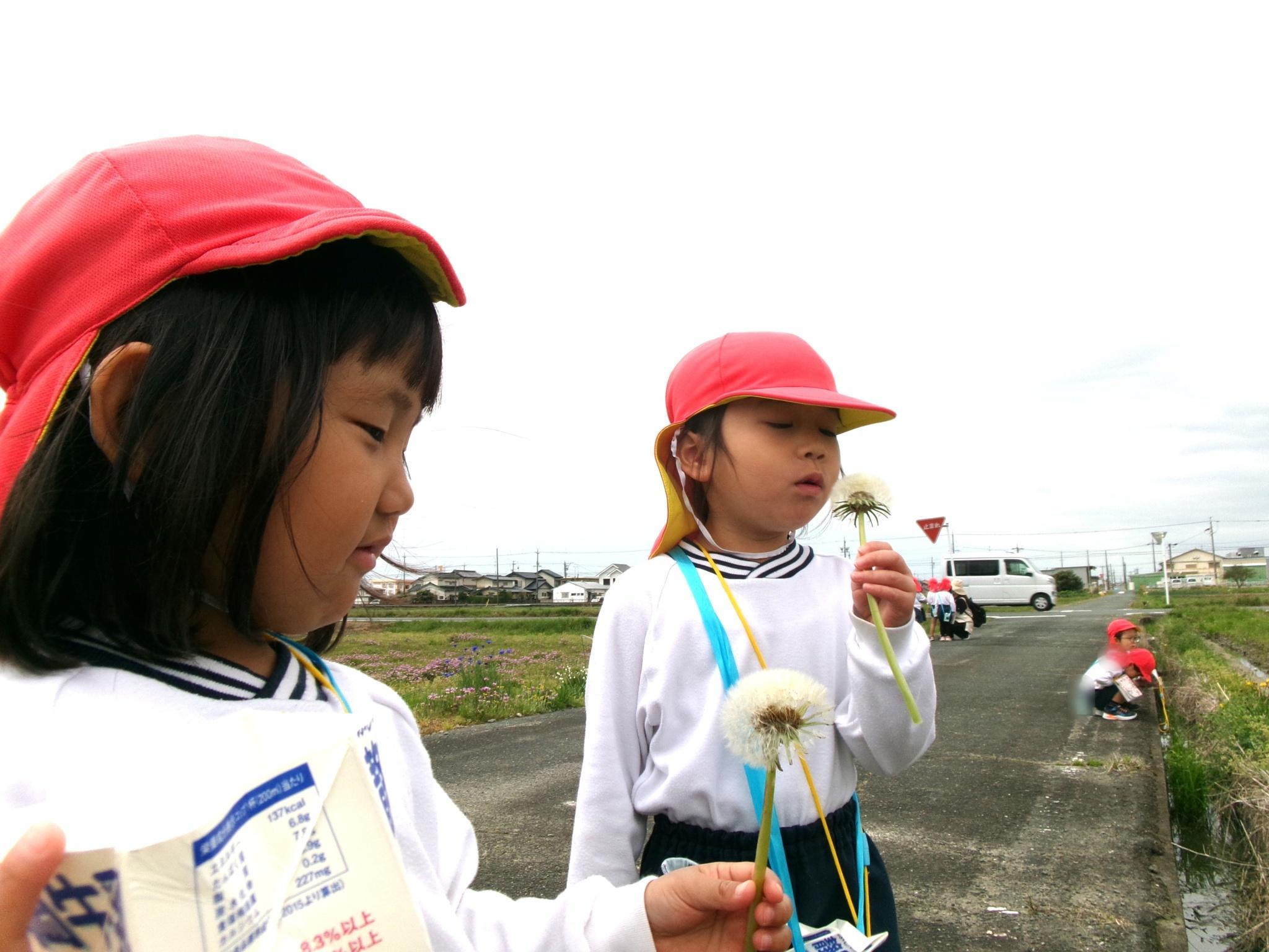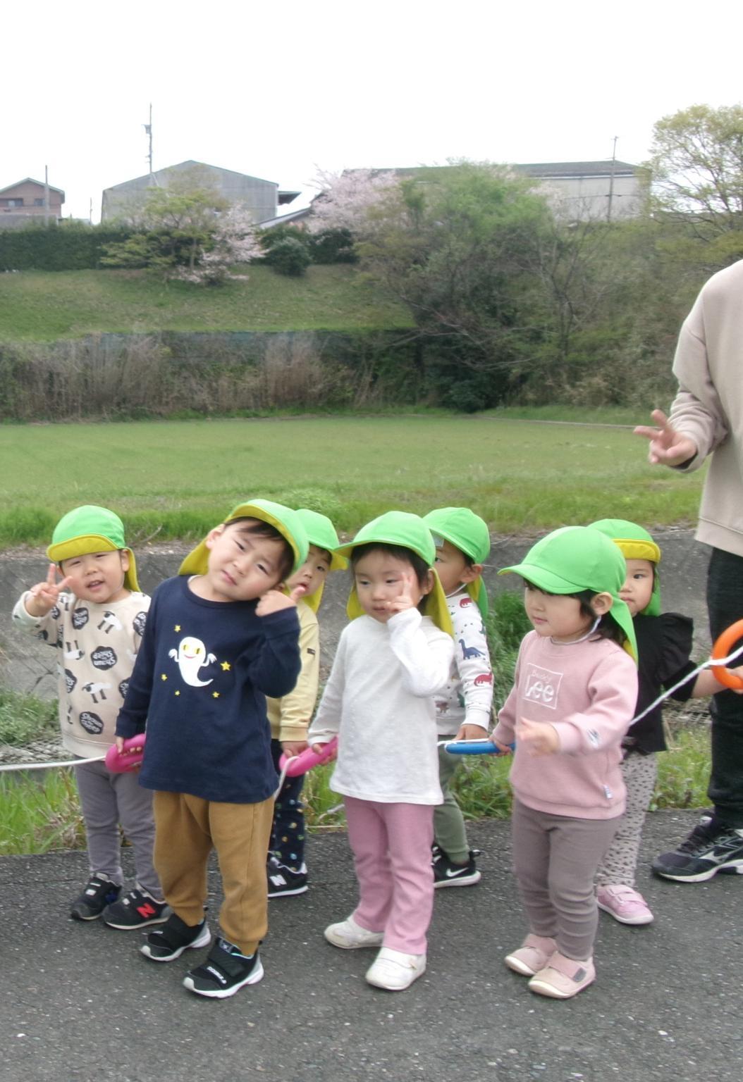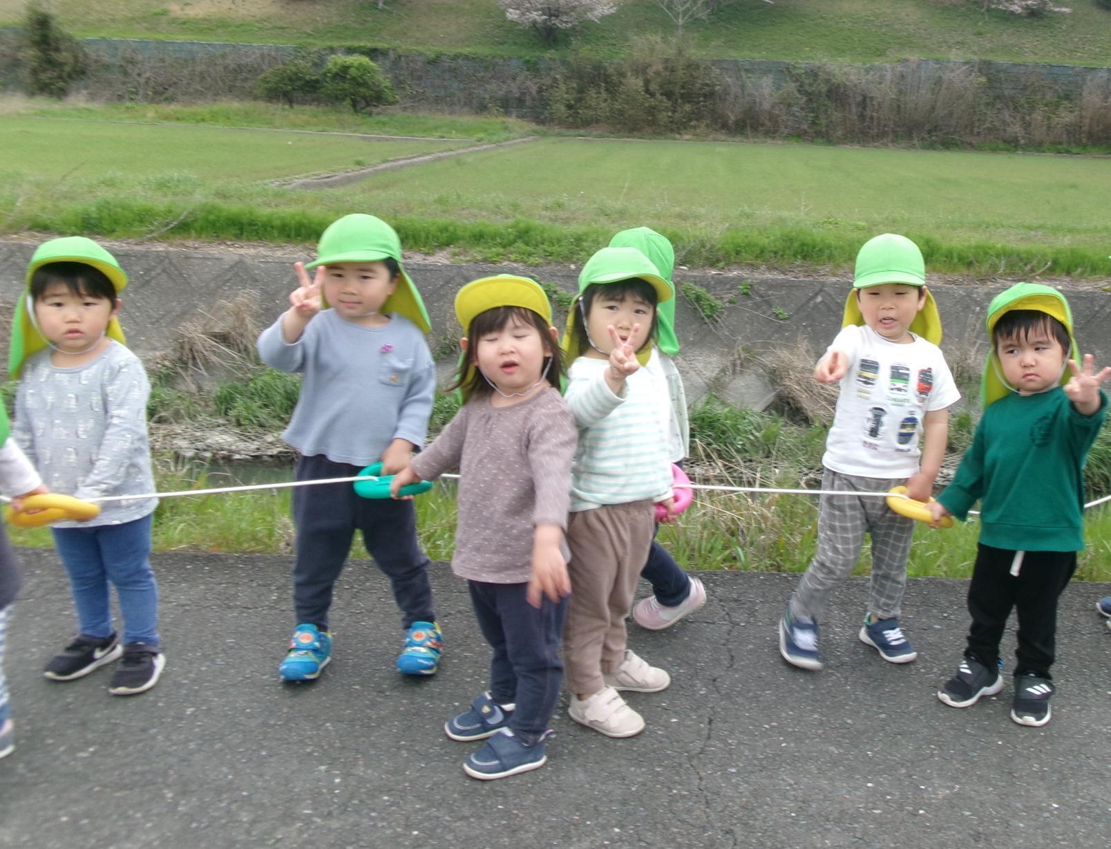 川沿いへお散歩に行きました。タンポポやれんげ、ちょうちょうてんとう虫を見つけました。月刊絵本の春探しを読んだ後だったので、「あった!!」「いた!!」と見つけると嬉しそうな子どもたちでした。