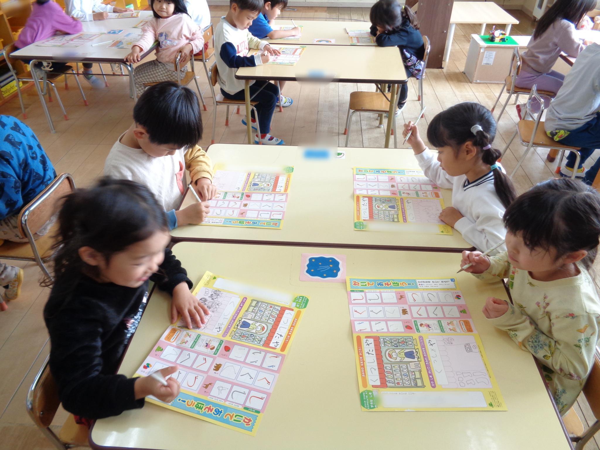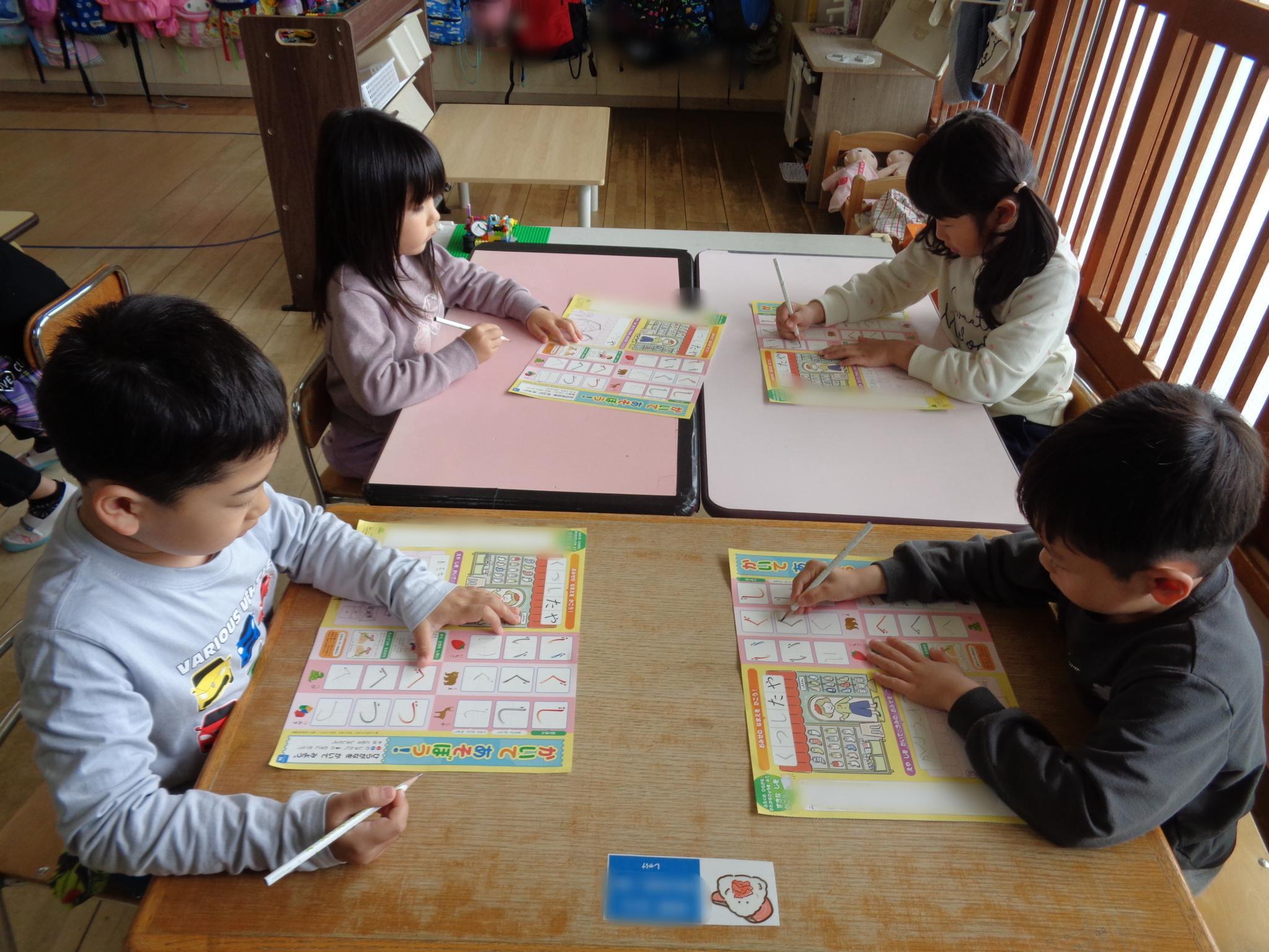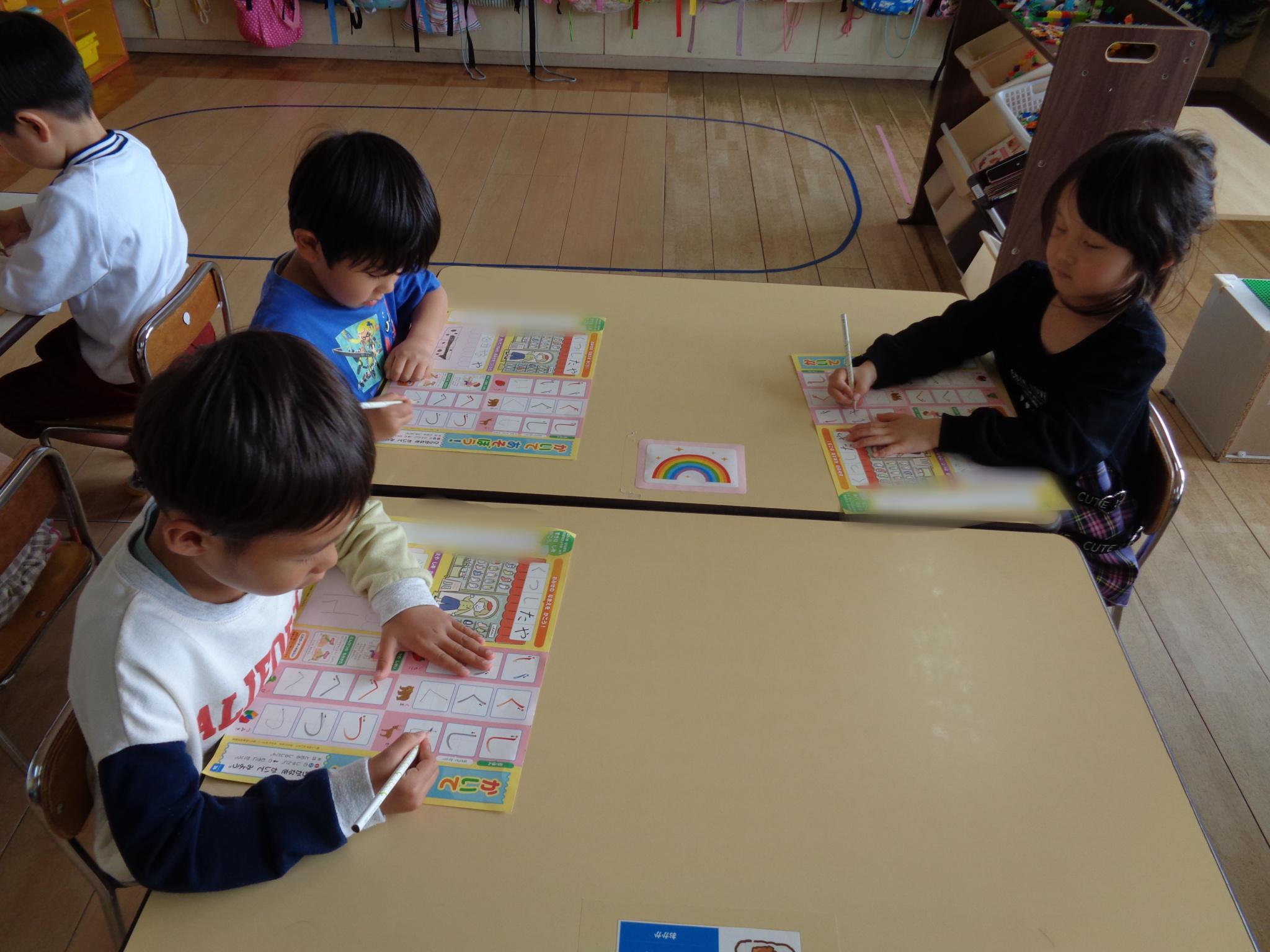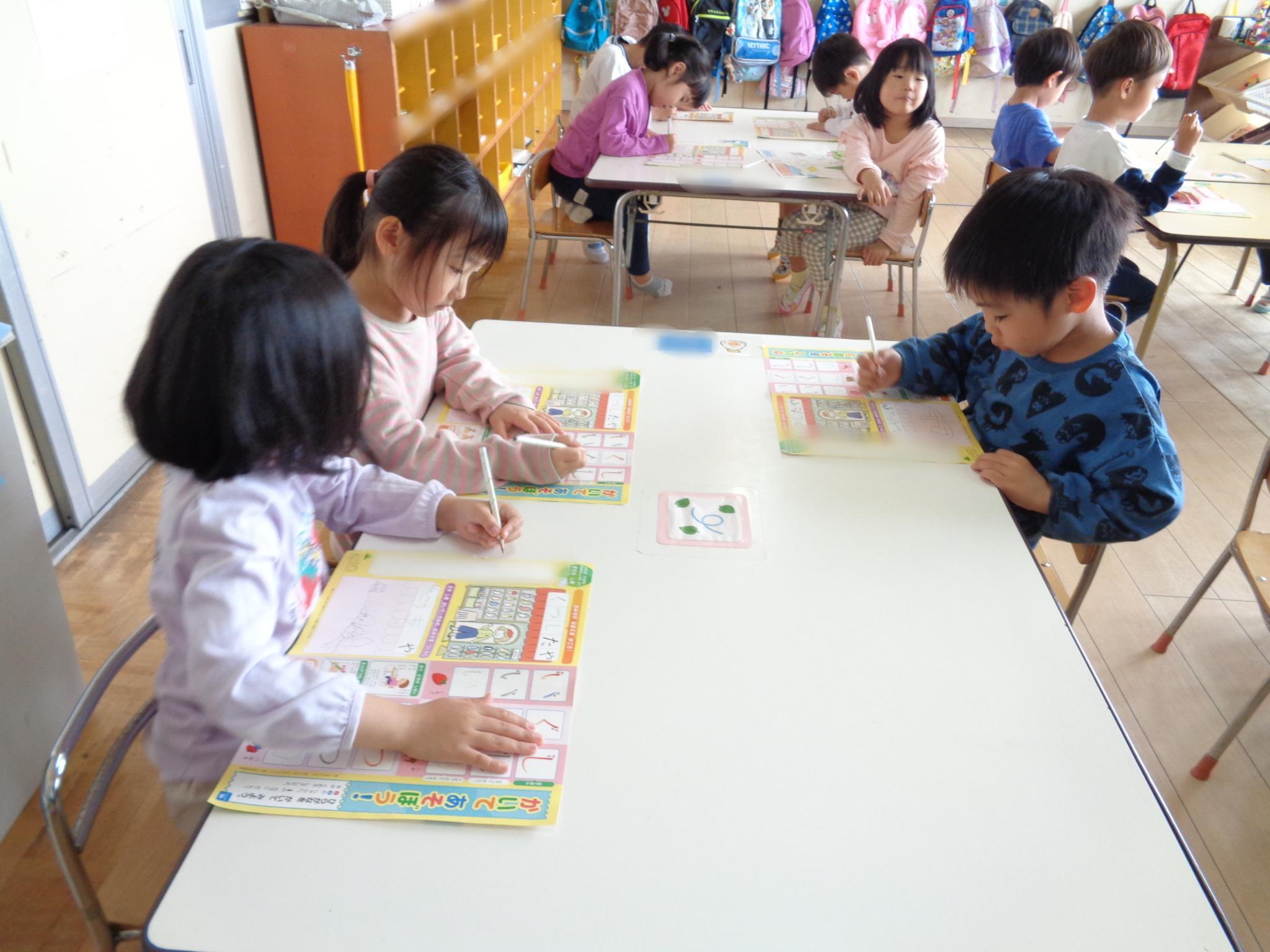 今月から月刊絵本の付録にあるひらがなの練習が始まりました!「とめる」「はねる」「はらう」の三個を意識しながら取り組むことができました。「小学生みたい!!」と緊張感を持ちながらも楽しくできました。