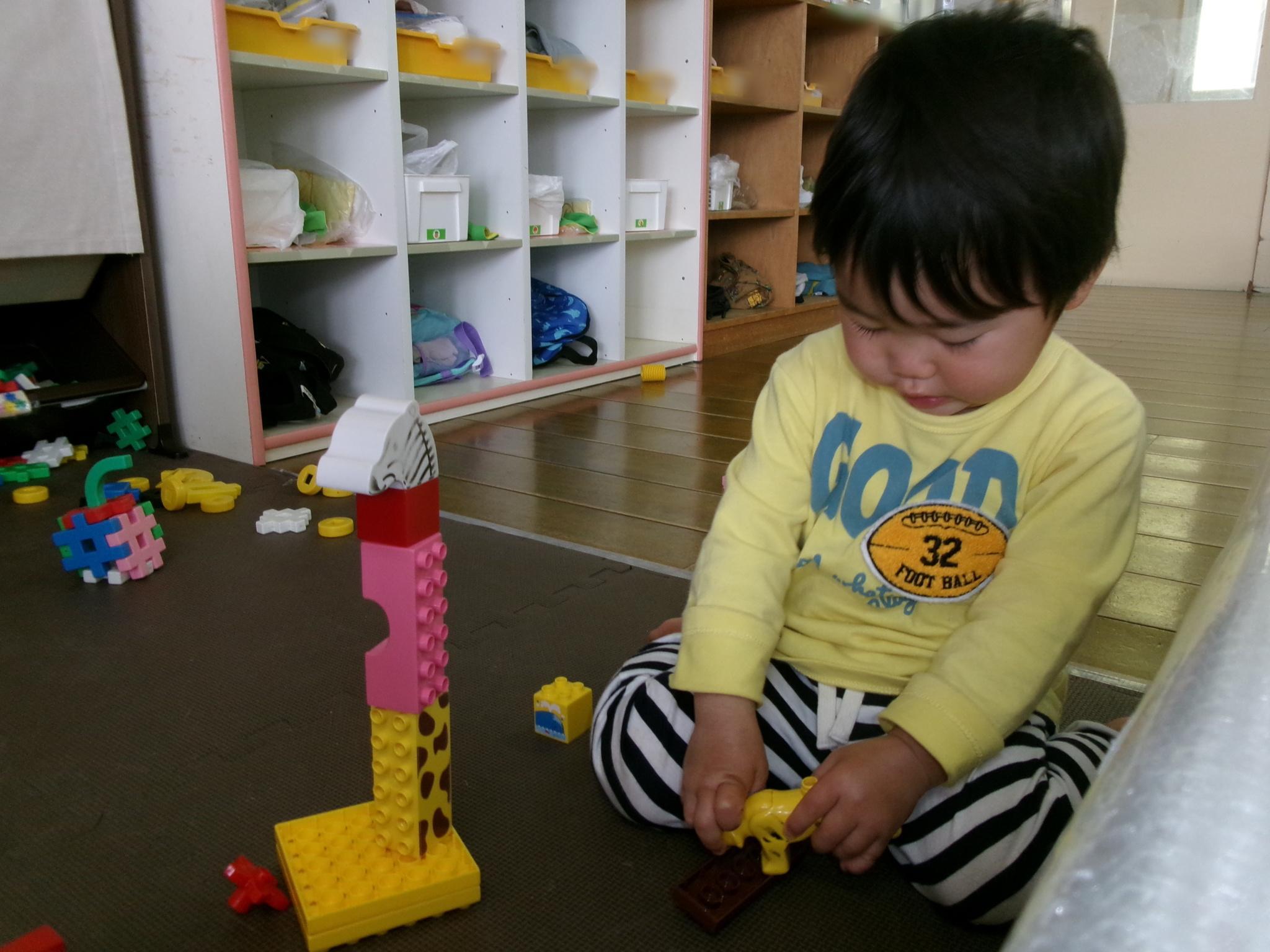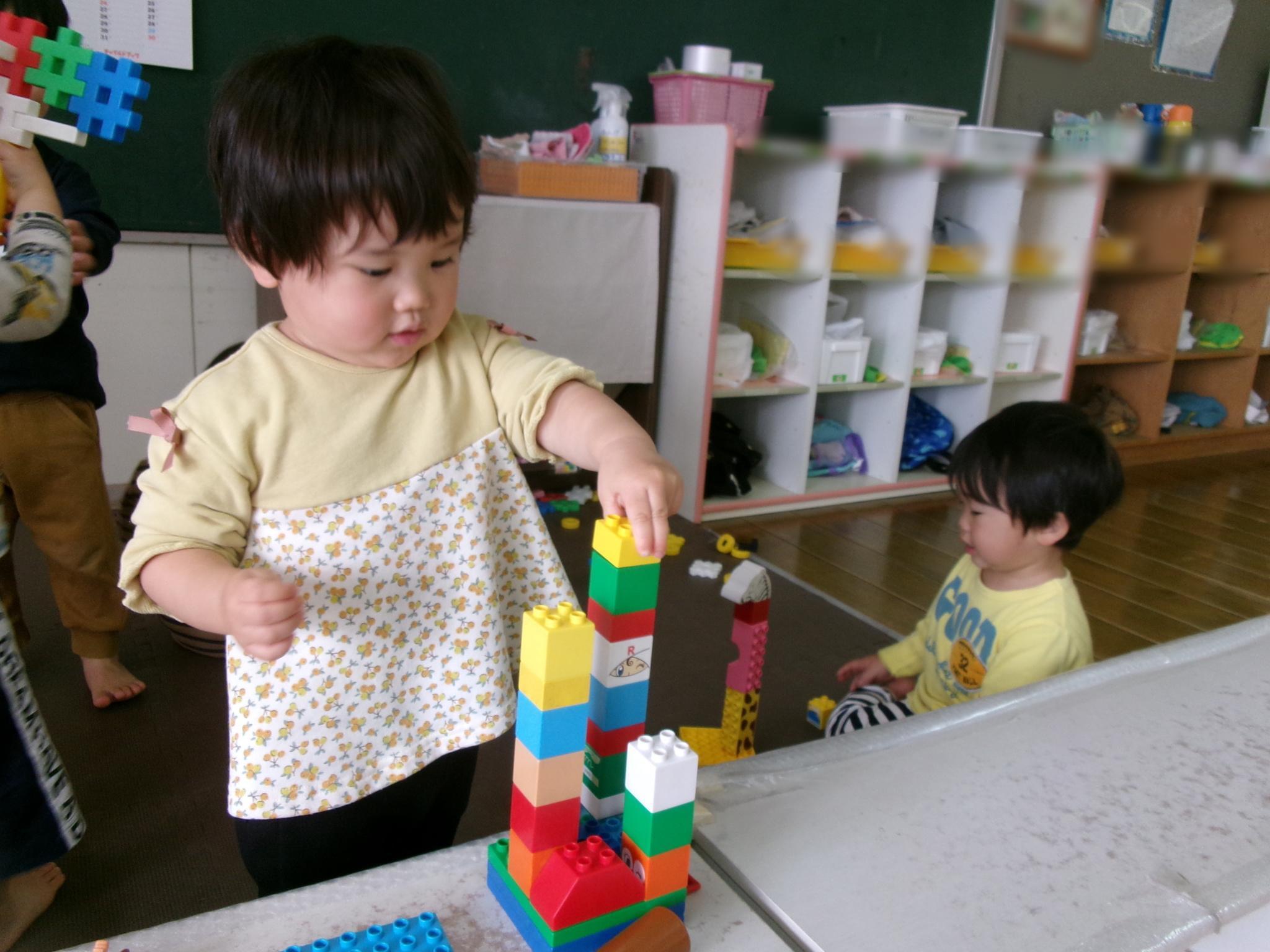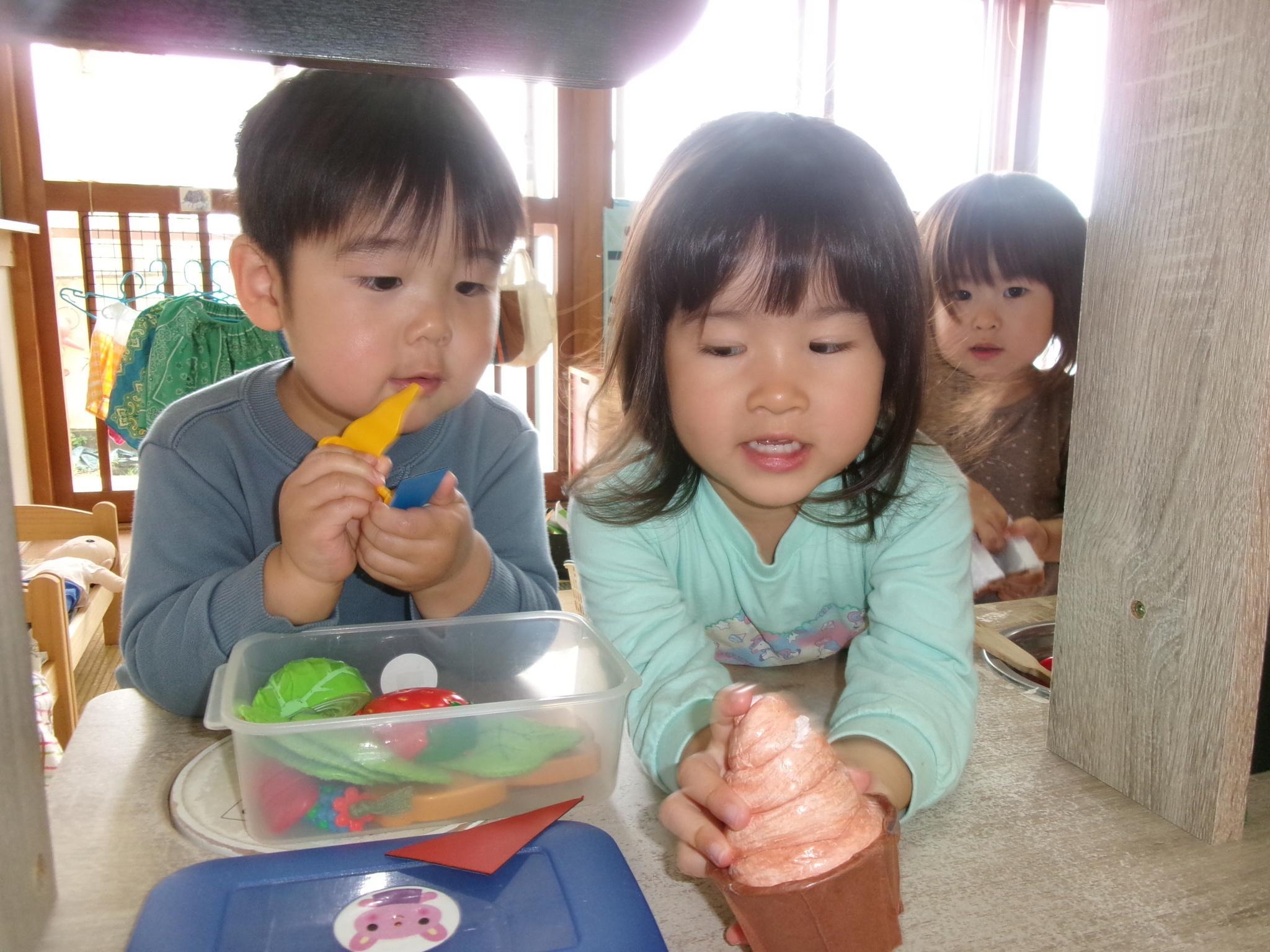 ままごと、ブロック、電車、絵本、お絵描きコーナーで遊びました。ままごとコーナーでは「どうぞ」「何にしますか」「イチゴ4つ?」と保育者や友達と遊んでいました。入園・進級して新しい玩具に夢中の子どもたちです。