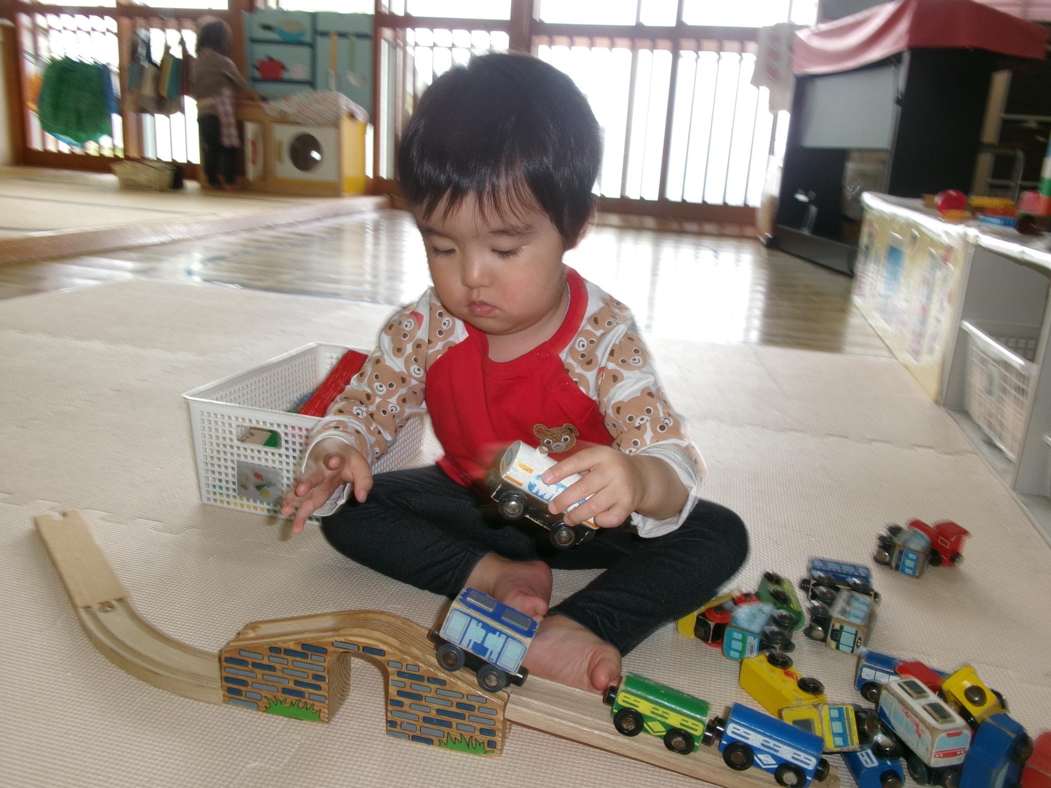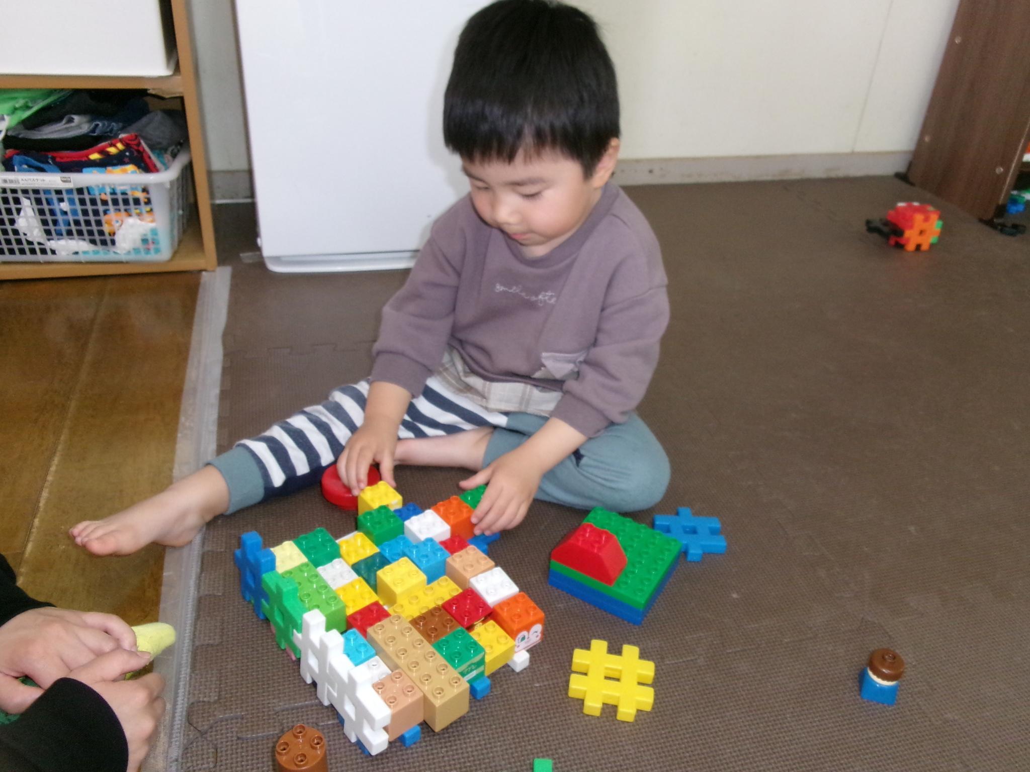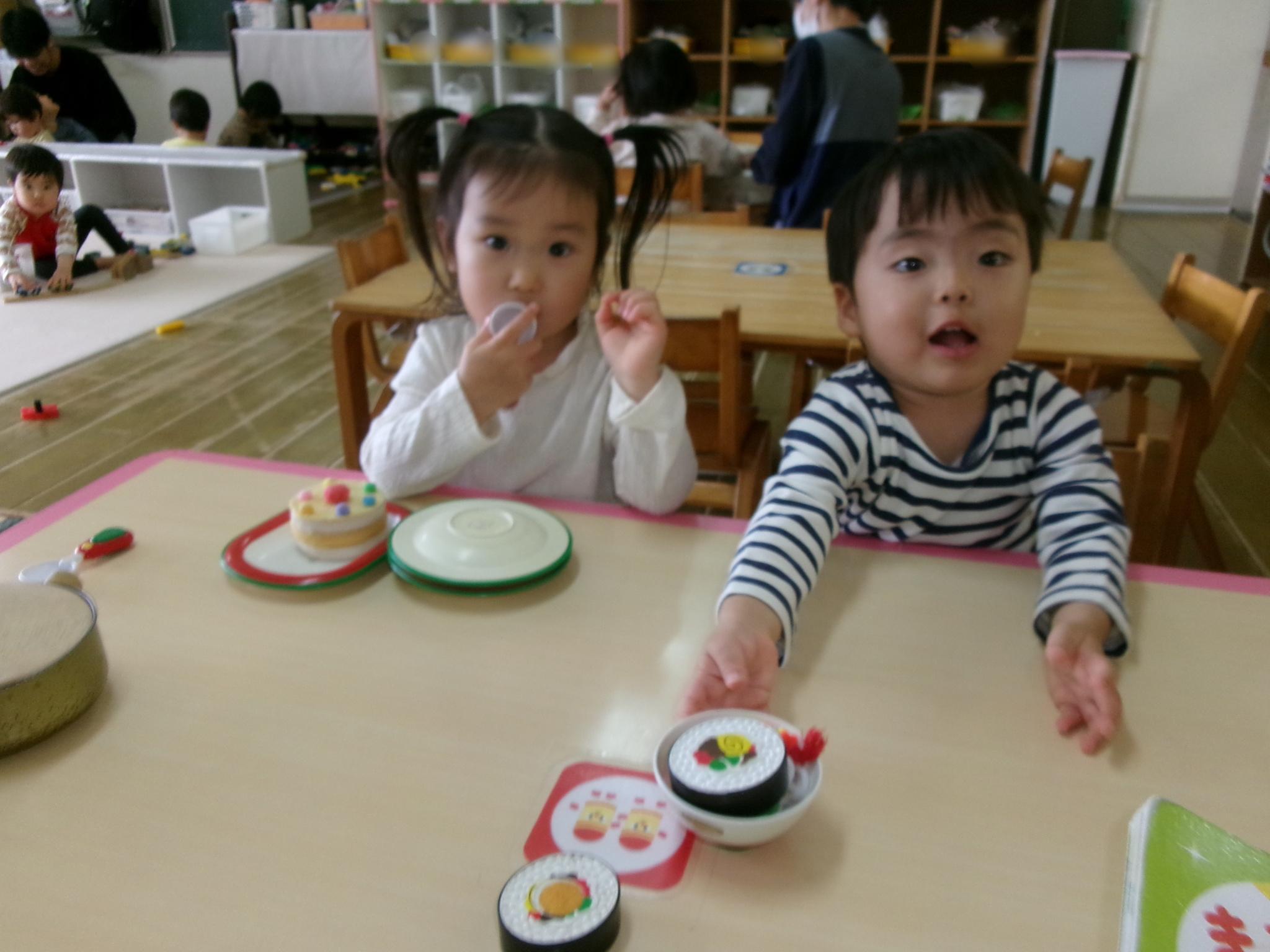 ままごと、ブロック、電車、絵本、お絵描きコーナーで遊びました。ままごとコーナーでは「どうぞ」「何にしますか」「イチゴ4つ?」と保育者や友達と遊んでいました。入園・進級して新しい玩具に夢中の子どもたちです。