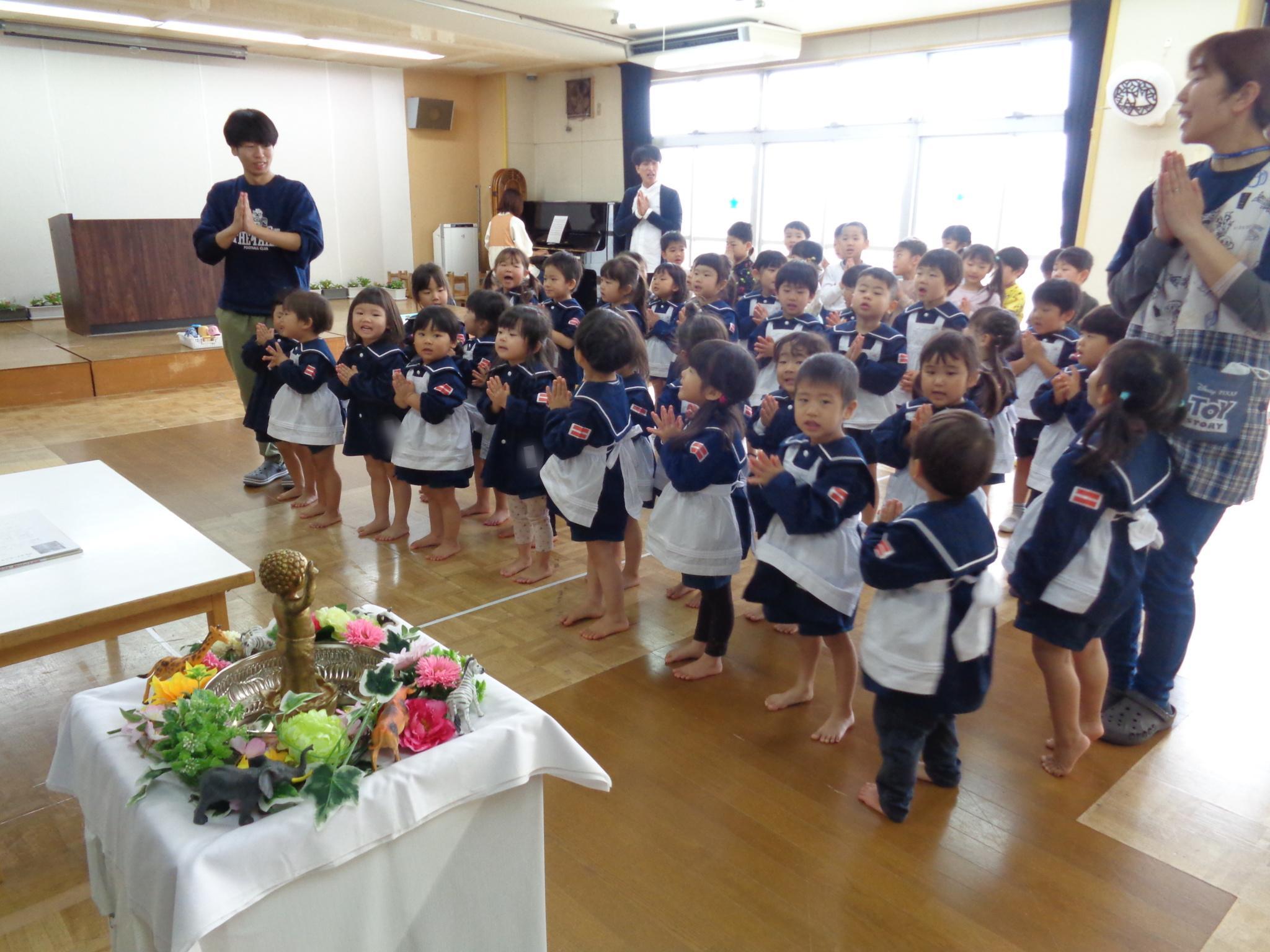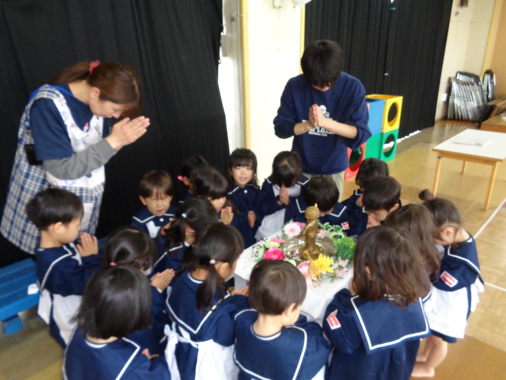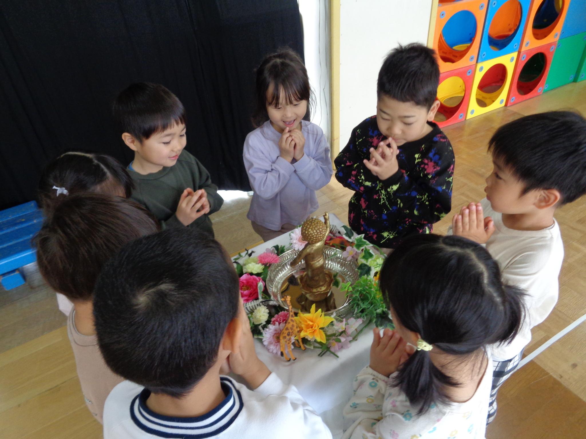 花まつりを行いました。紙芝居を見たり甘茶を飲んでお祝いしました。「元気に過ごせるように」「大きくなれますように」とお祈りしました。