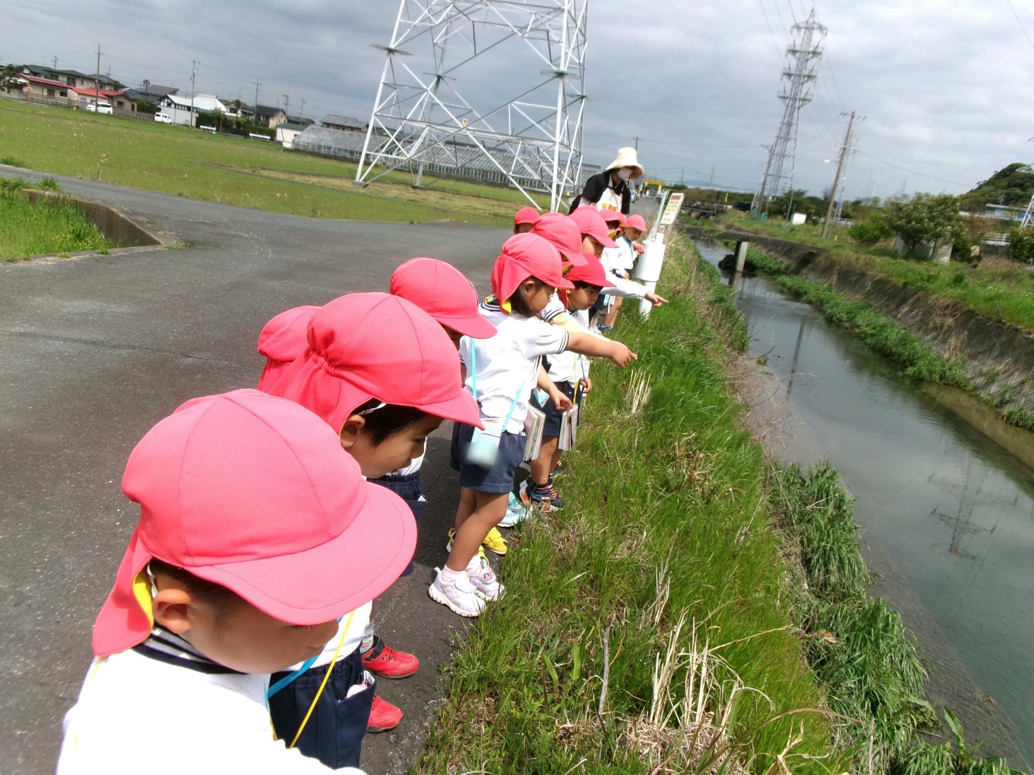 図鑑を持ってお散歩に出掛けました。畔道ではたんぽぽ、れんげ、ほとけのざの草花を、川ではカメやコイを見つけました。「6ページに載ってるよ」と声を掛け合いながら楽しみました。