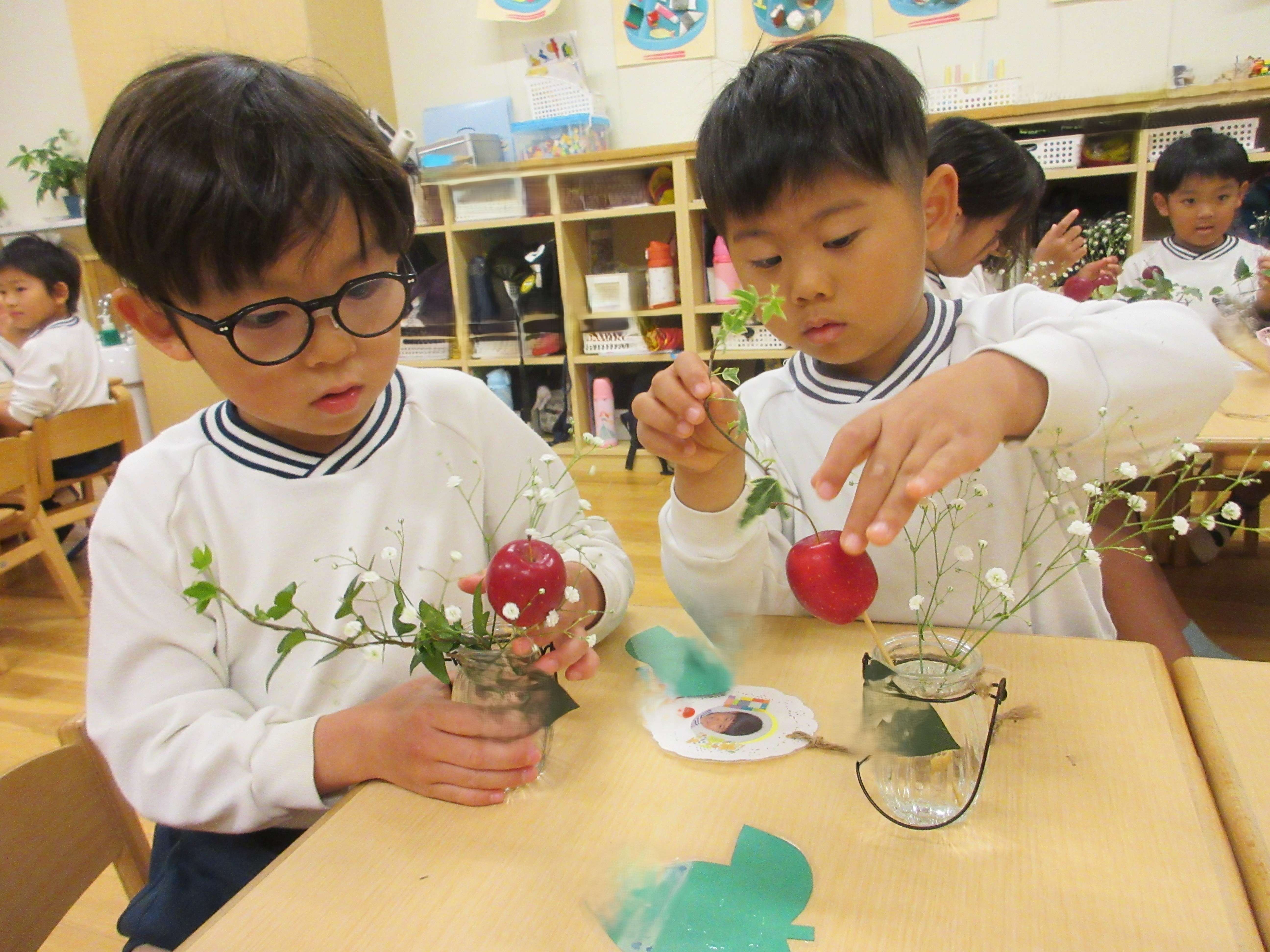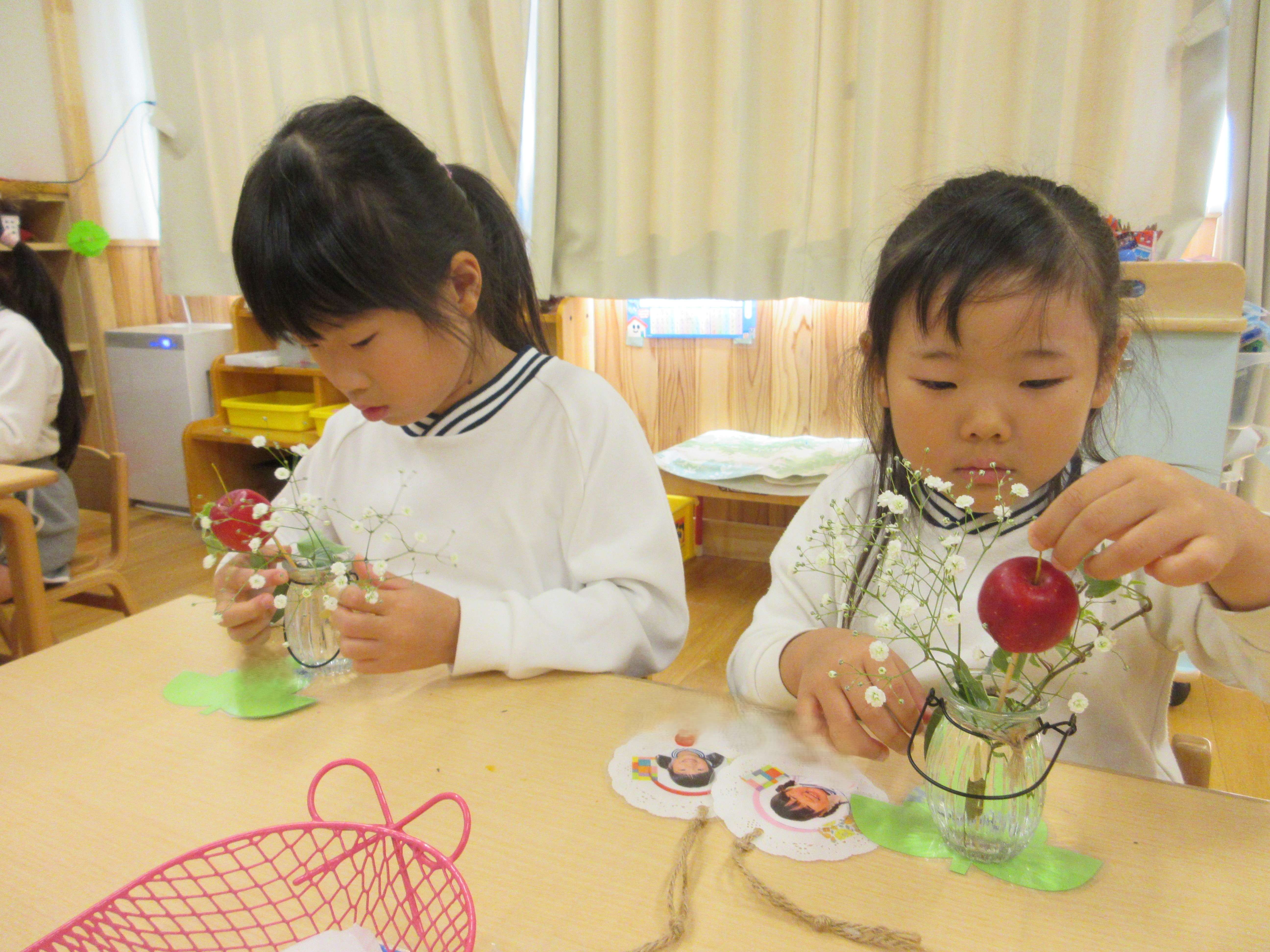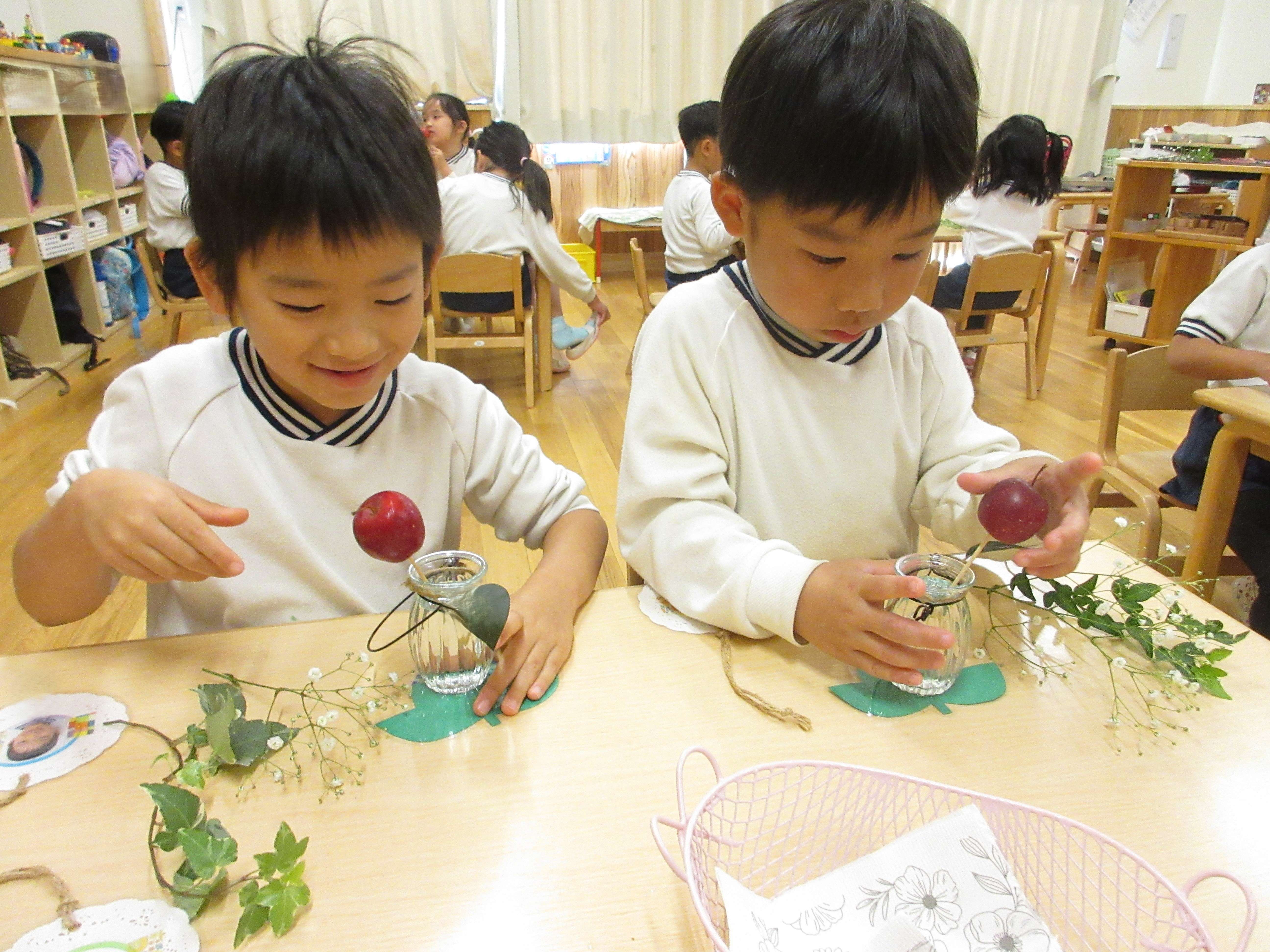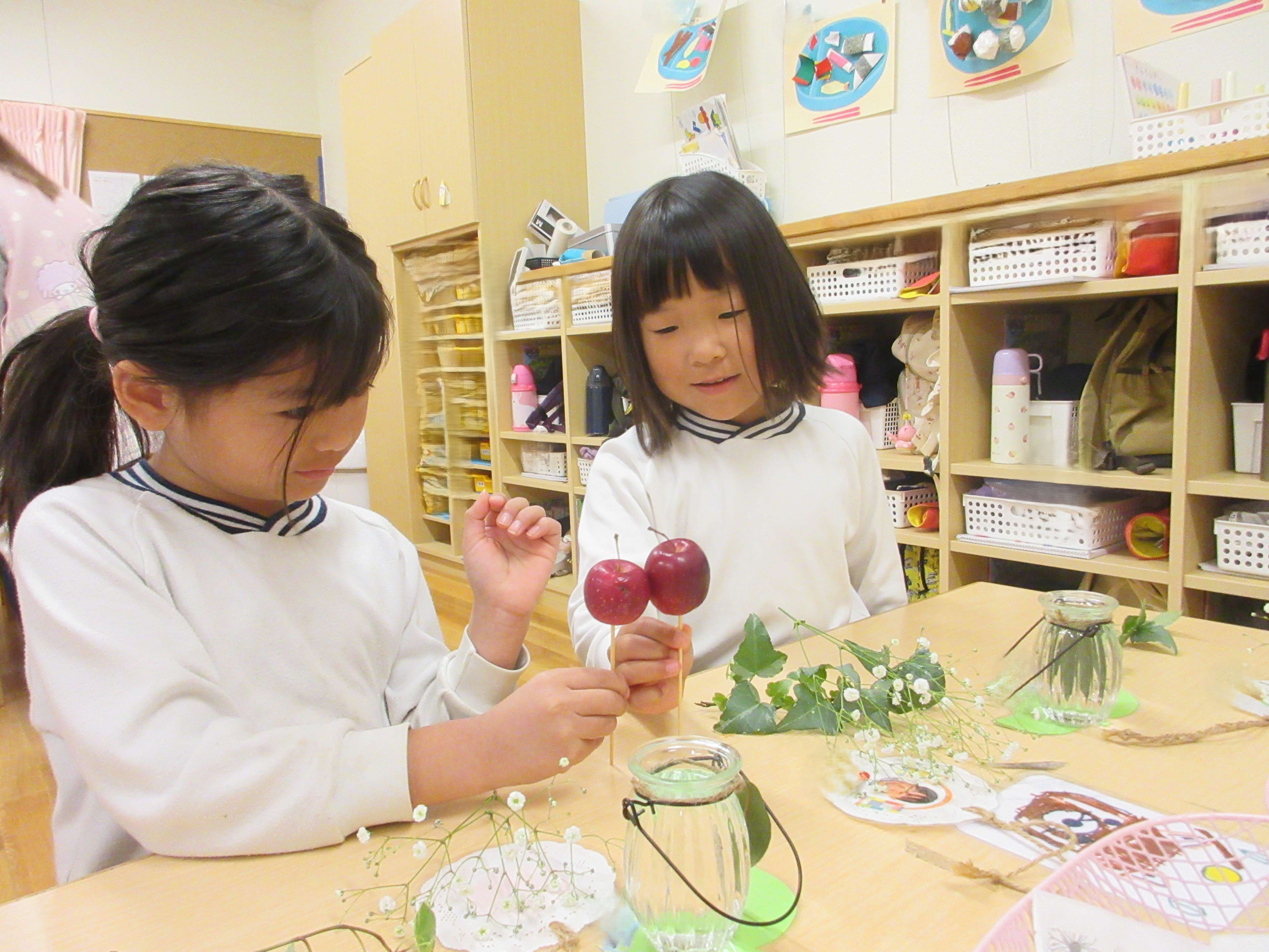 果実を使ってアレンジ♪ひめリンゴの香りやお花に触れながら楽しんで、小瓶に飾り保育室が可愛くい彩られました!