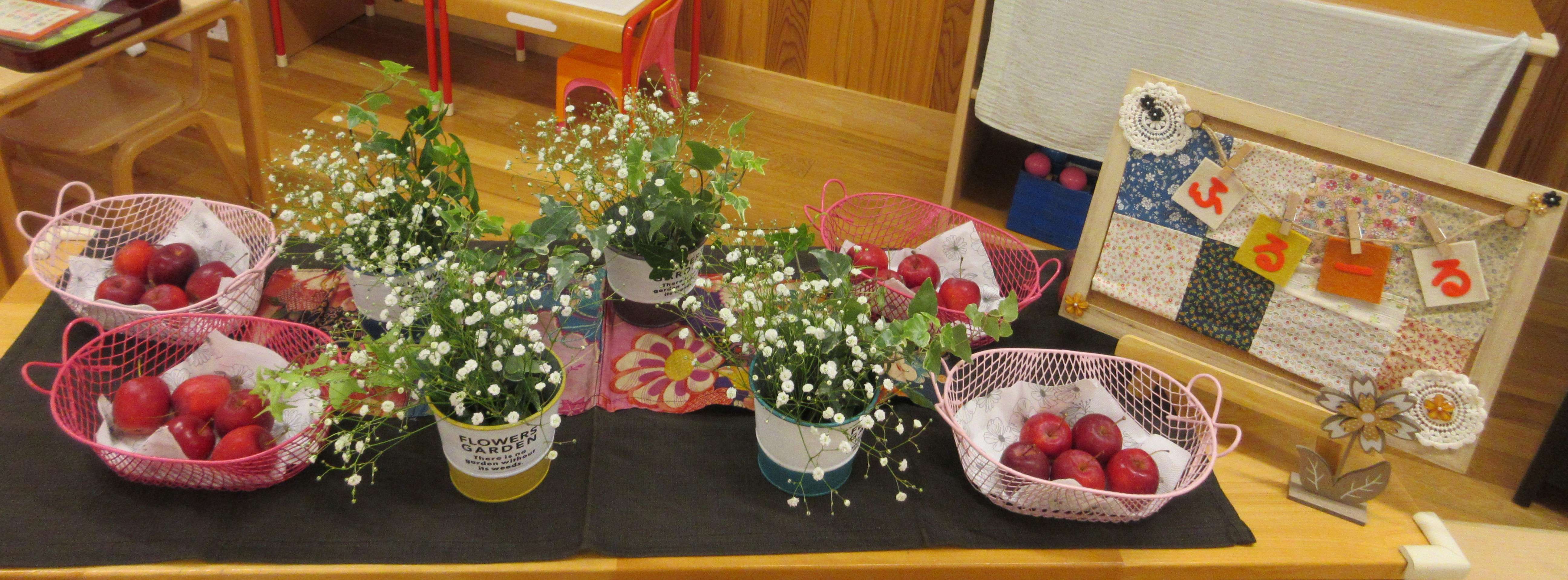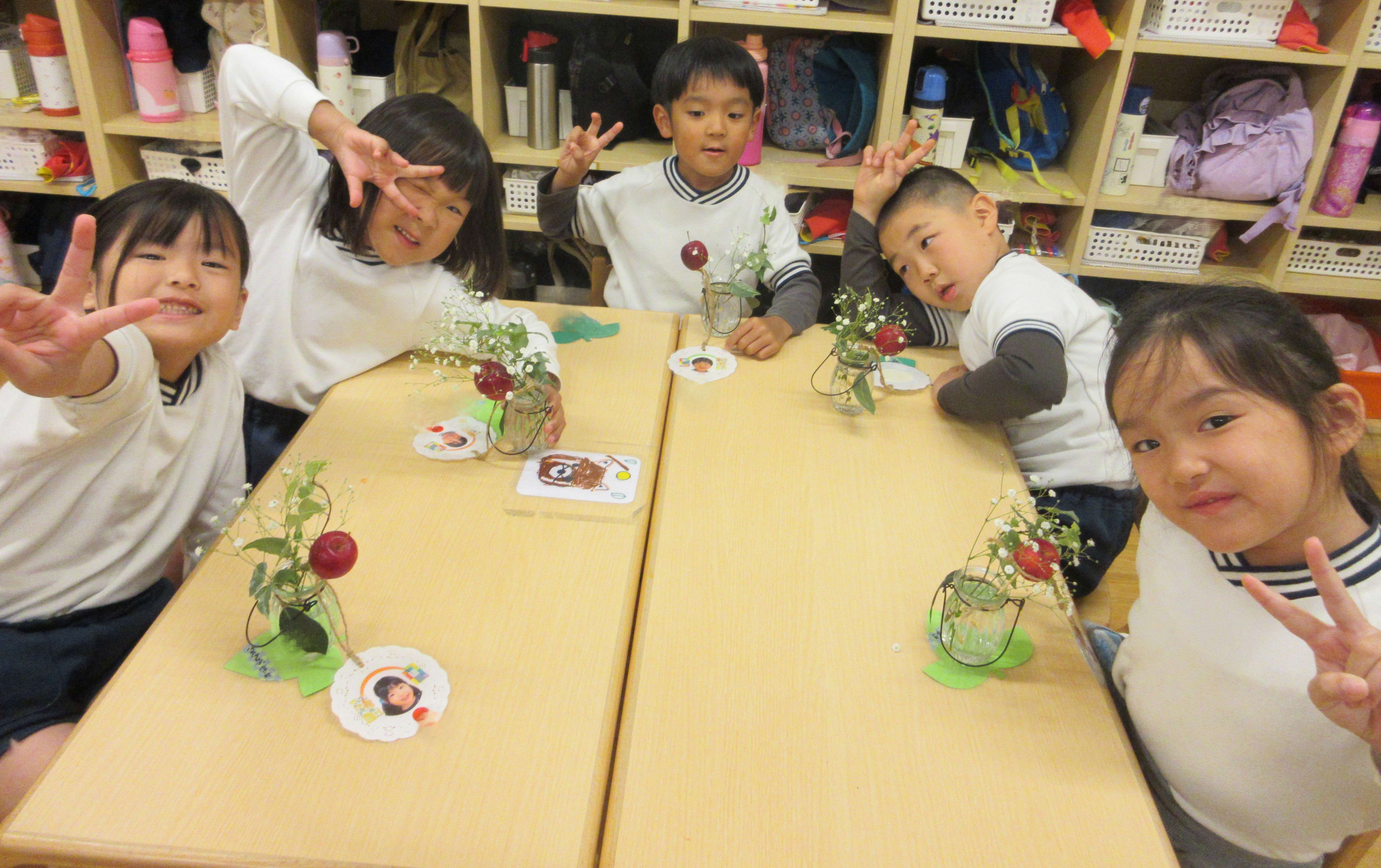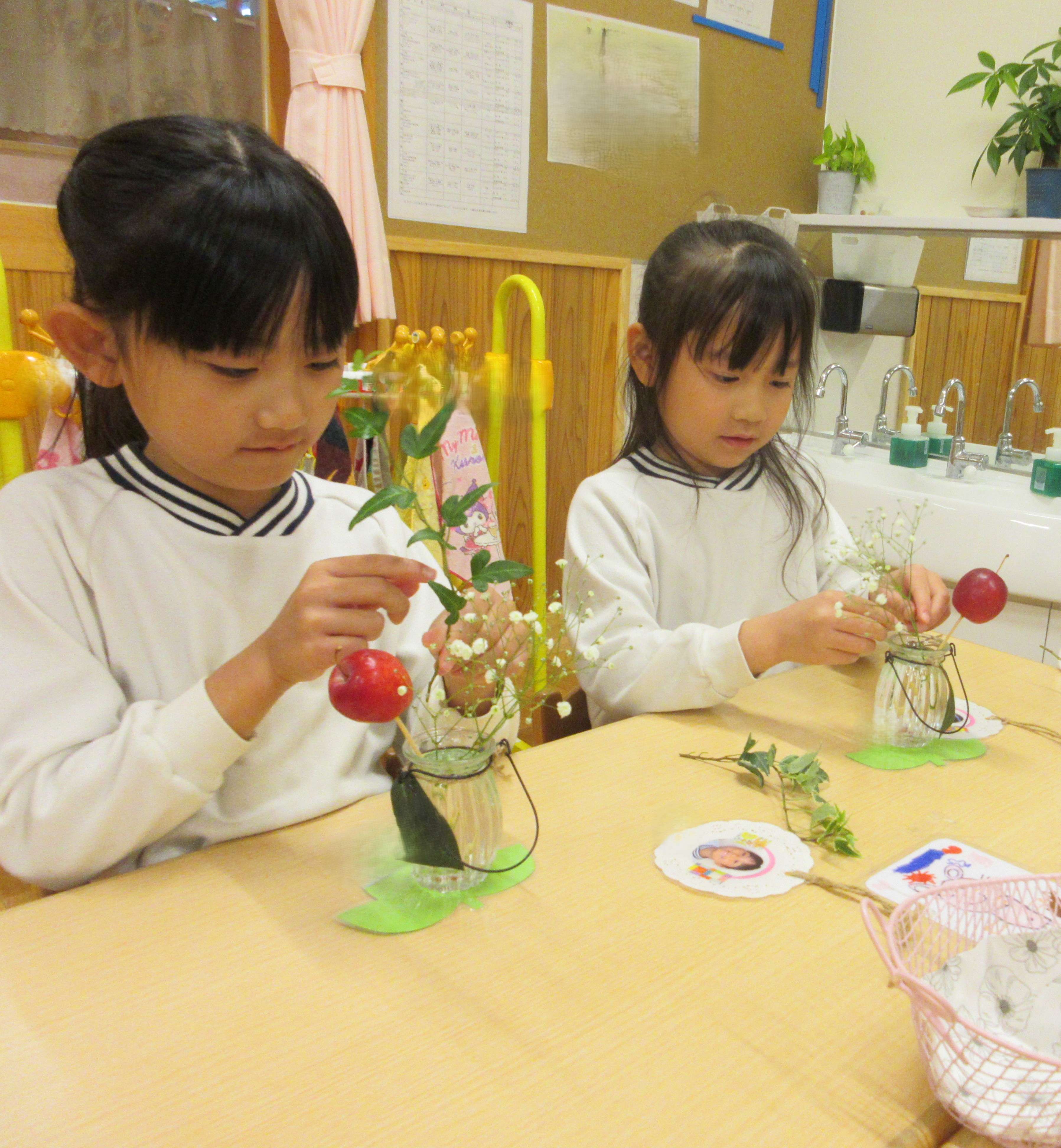 果実を使ってアレンジ♪ひめリンゴの香りやお花に触れながら楽しんで、小瓶に飾り保育室が可愛くい彩られました!