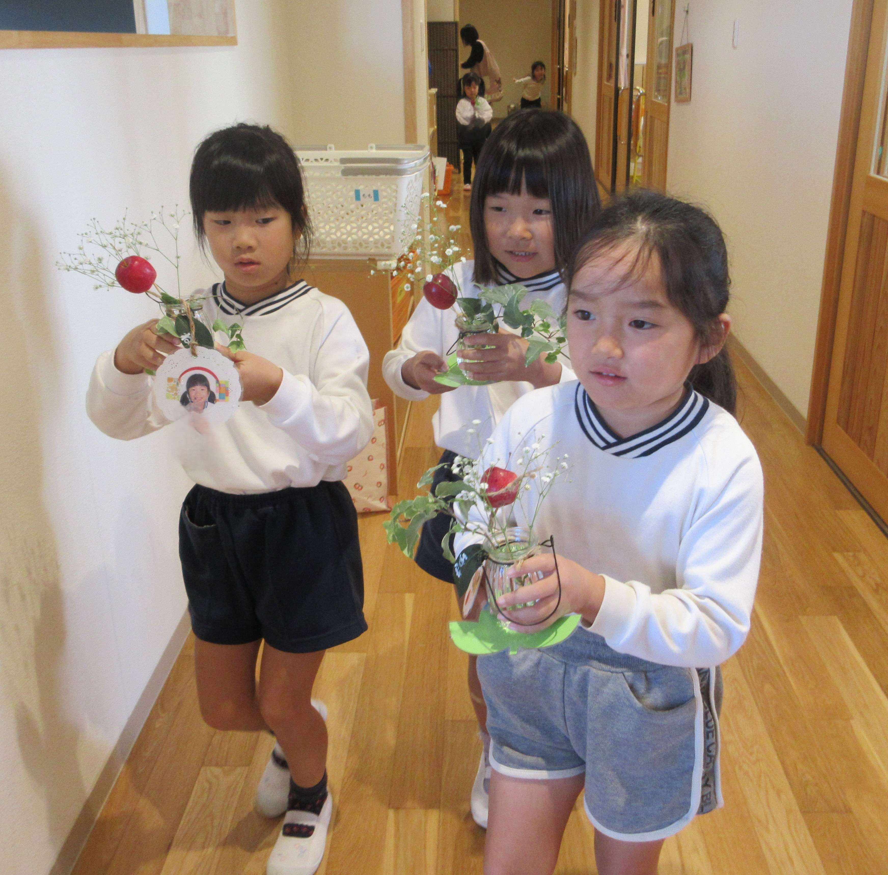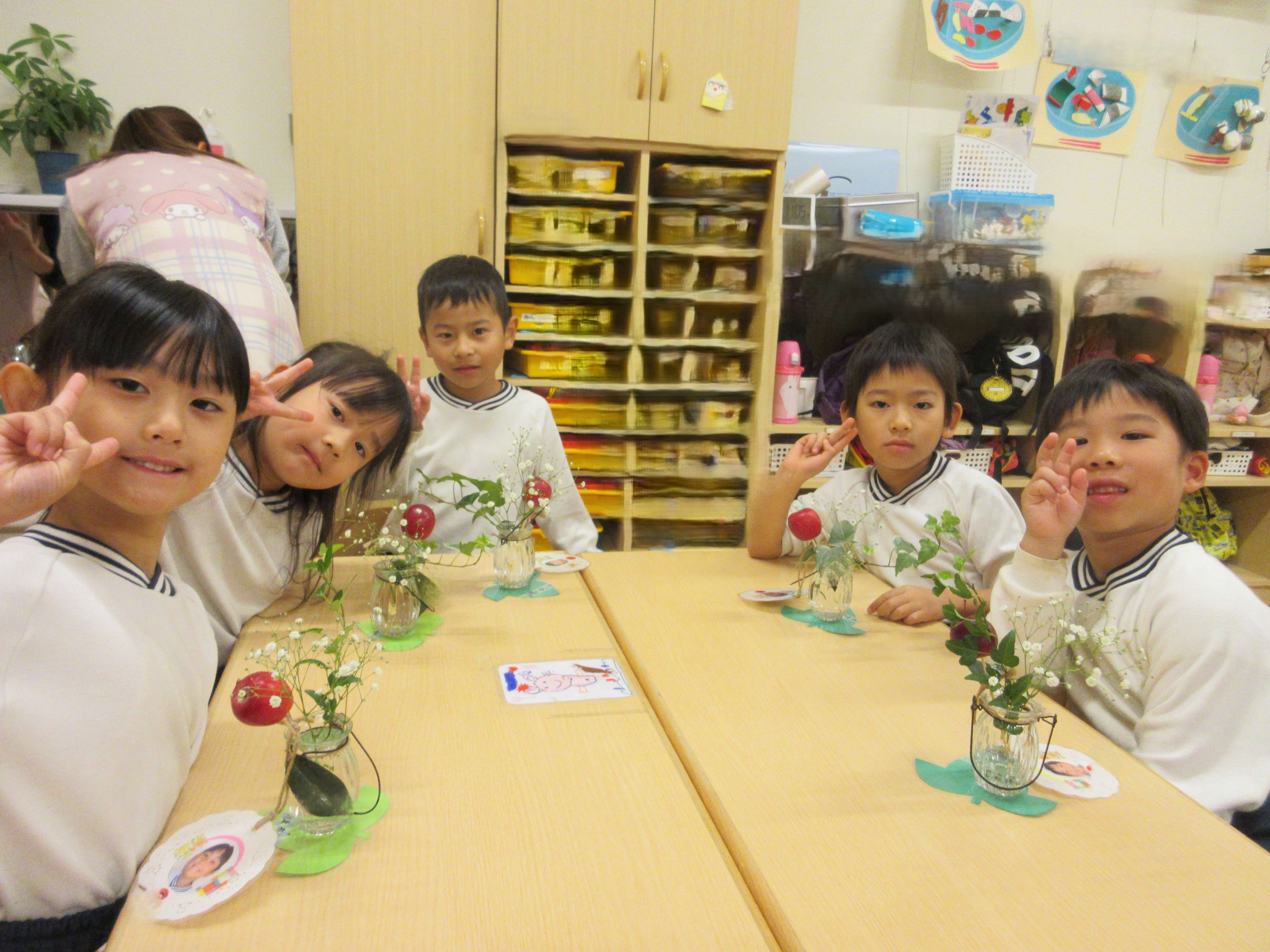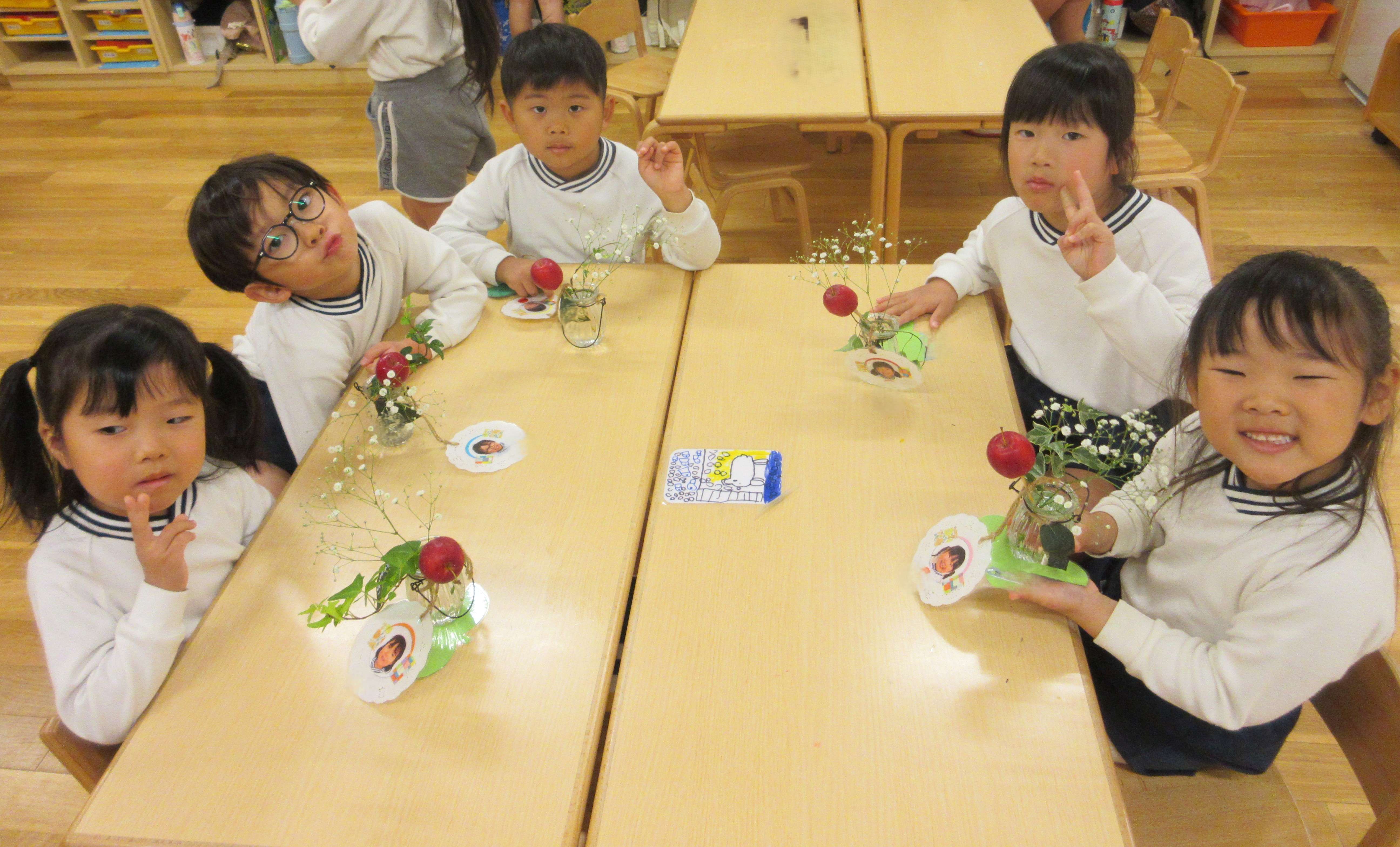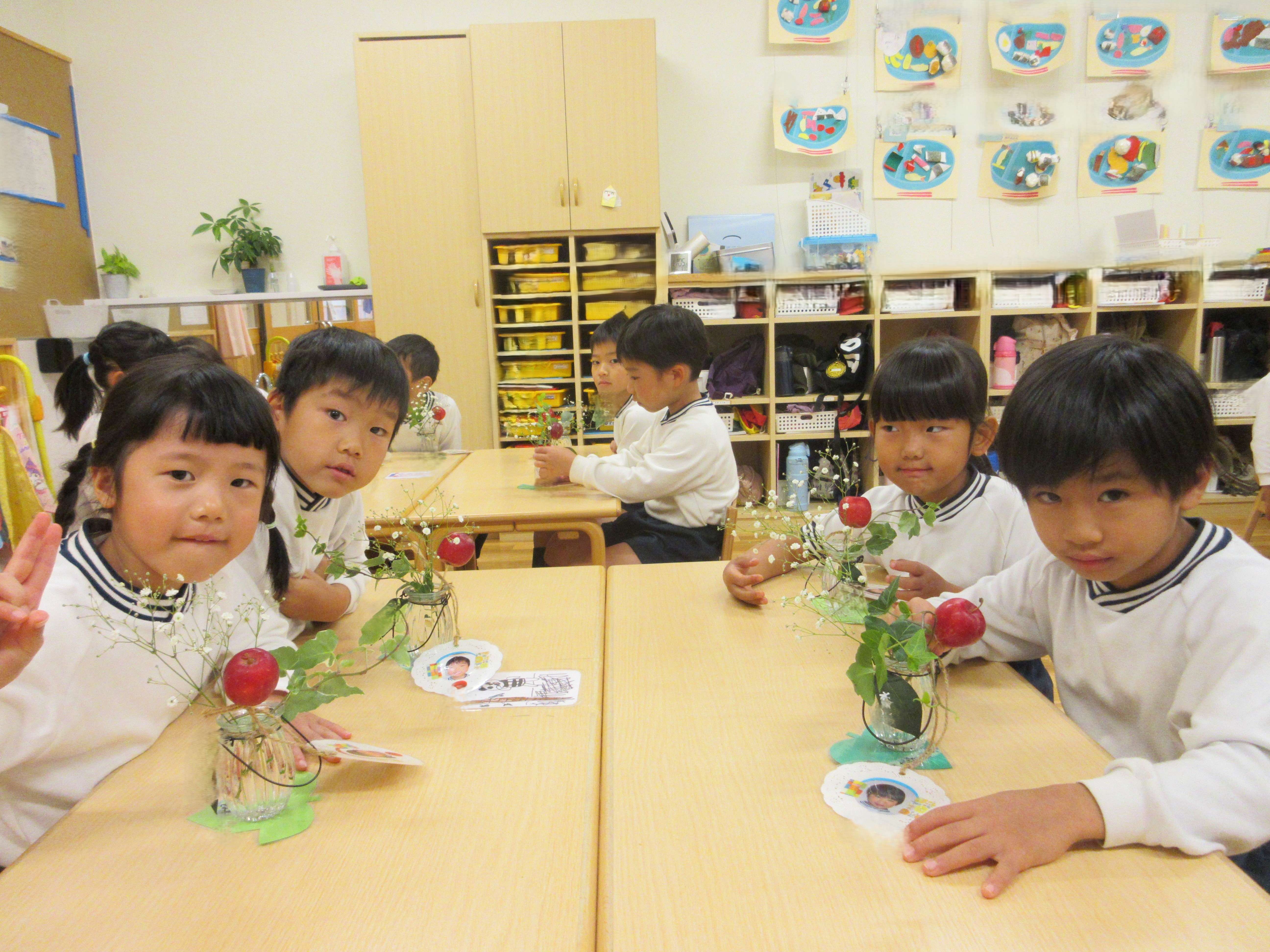 果実を使ってアレンジ♪ひめリンゴの香りやお花に触れながら楽しんで、小瓶に飾り保育室が可愛くい彩られました!