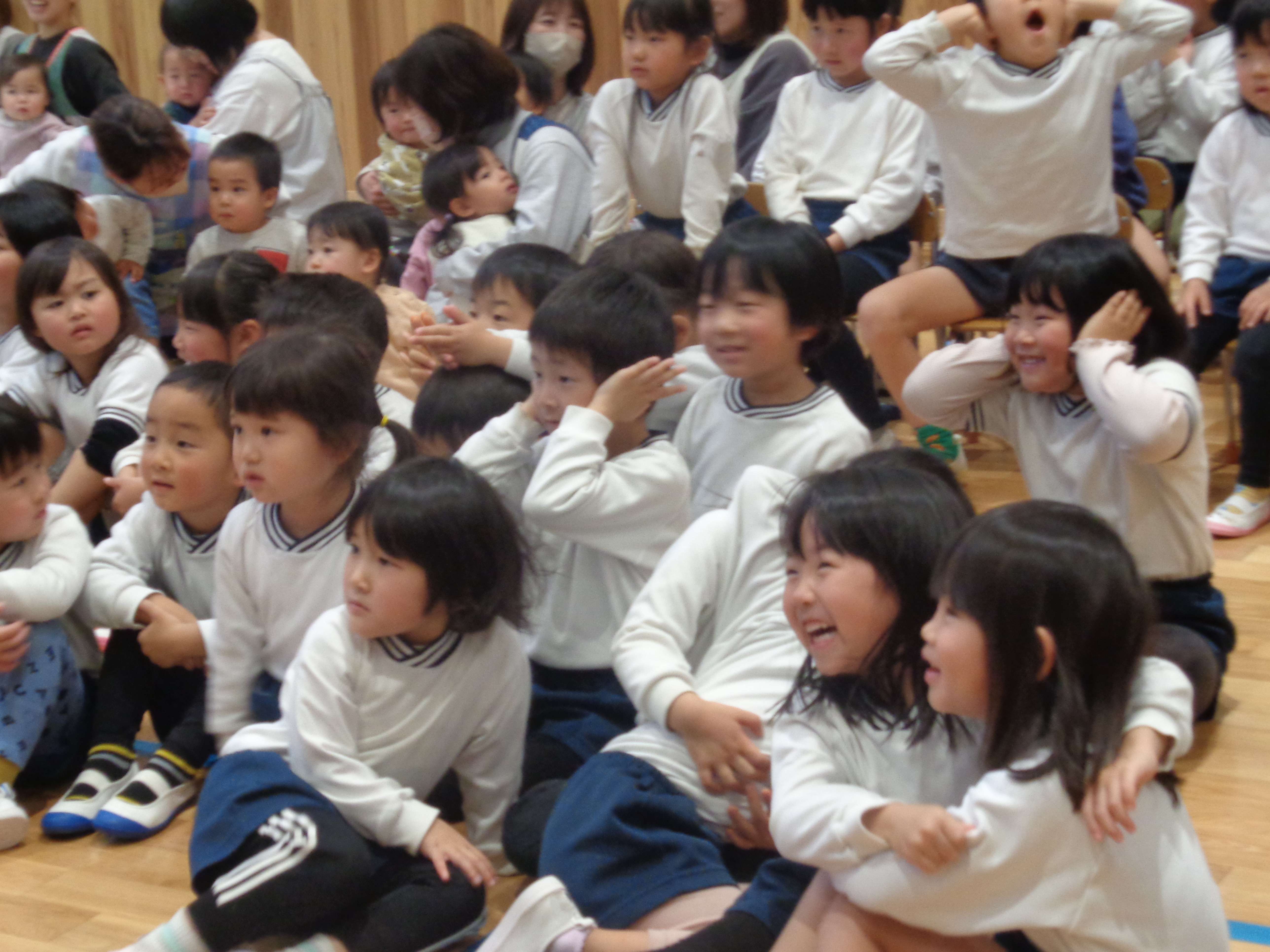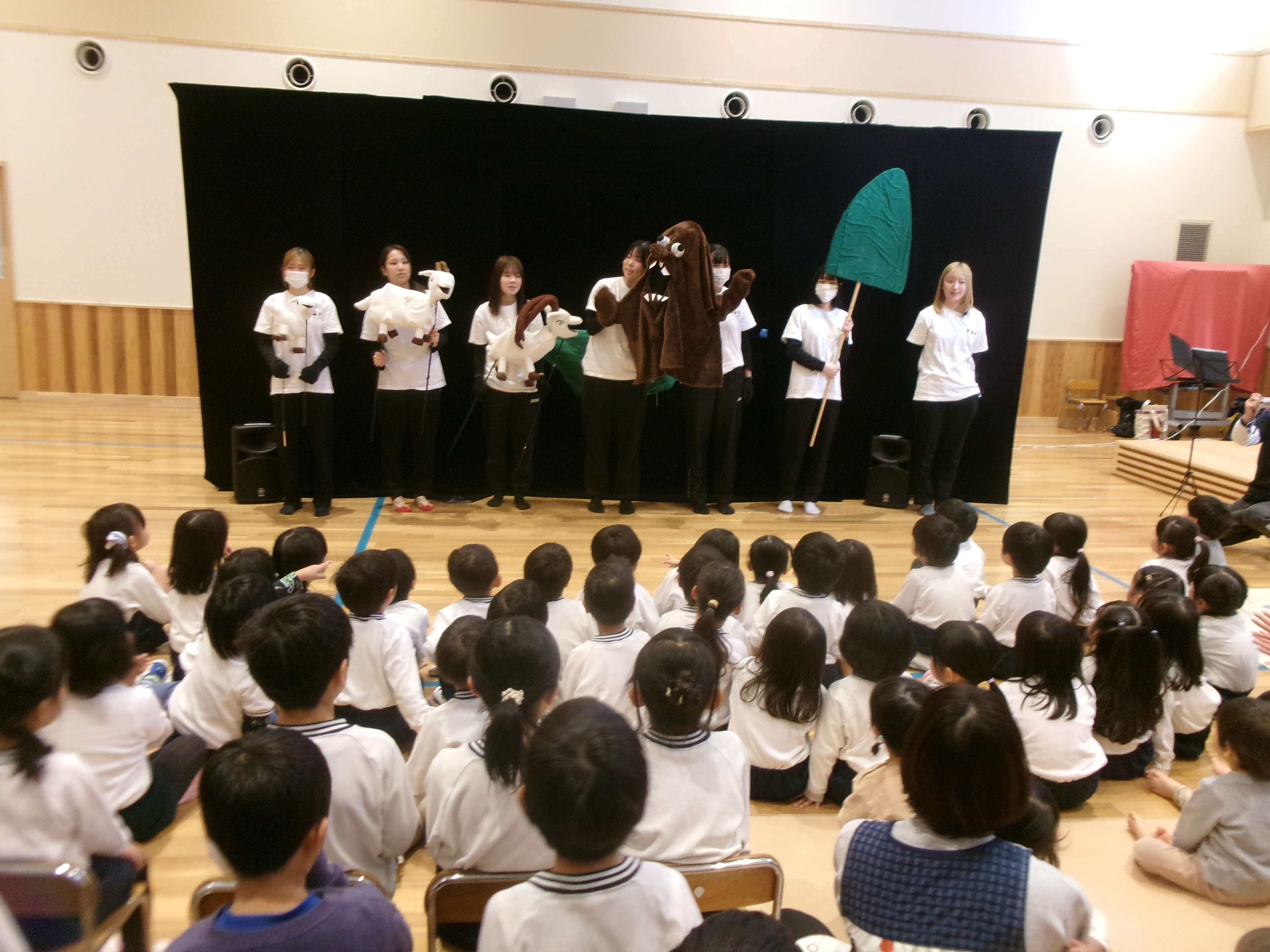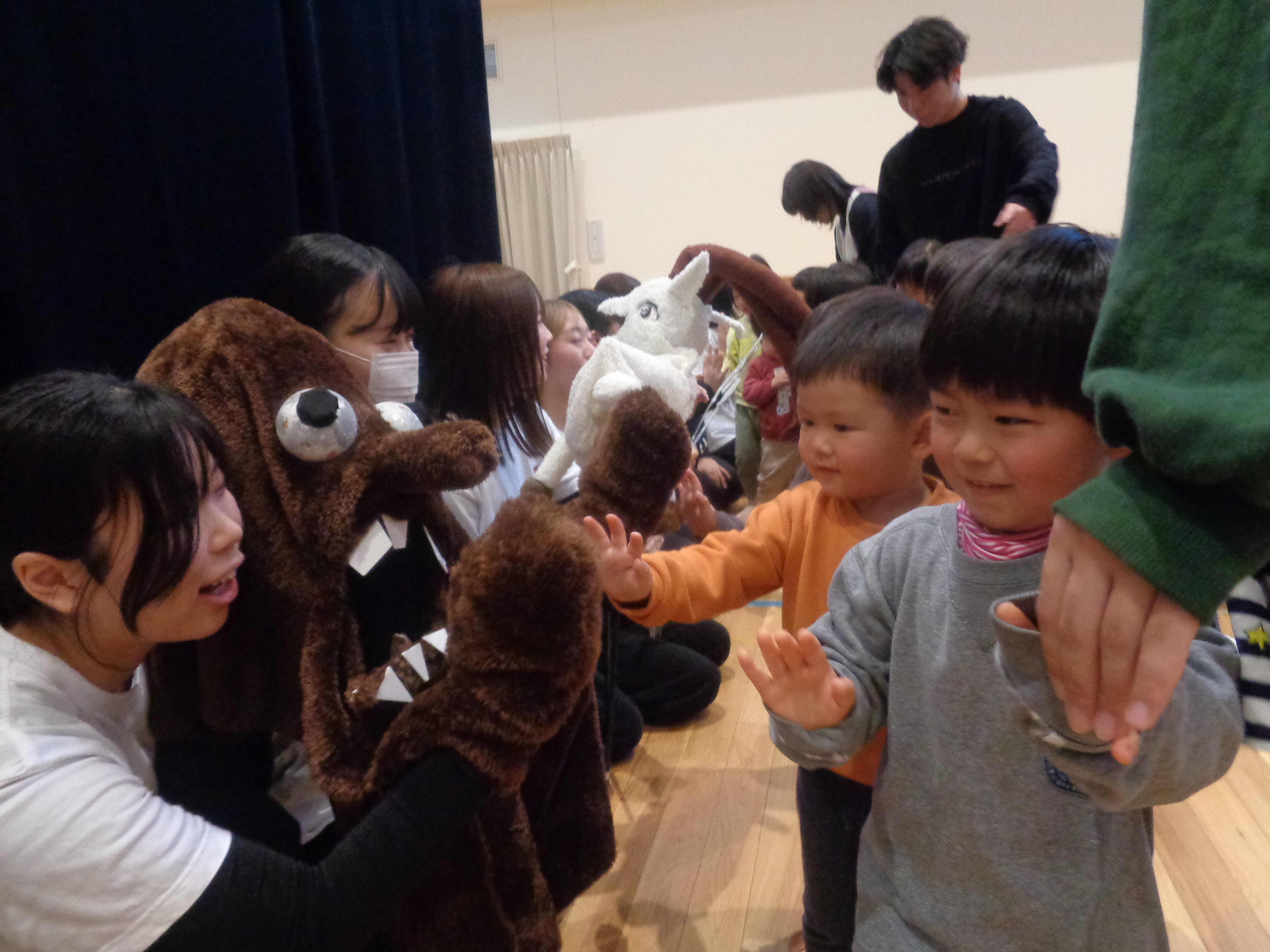 浜松未来総合専門学校のお姉さんが「さるかに合戦」の影絵と、「三匹のやぎのがらがらどん」の人形劇を披露しにきてくれました。トロルが出てくると友達と抱き合ったり、顔を隠したりと最後までドキドキ、ハラハラ楽しみながら真剣に見ていた子どもたちでした♪