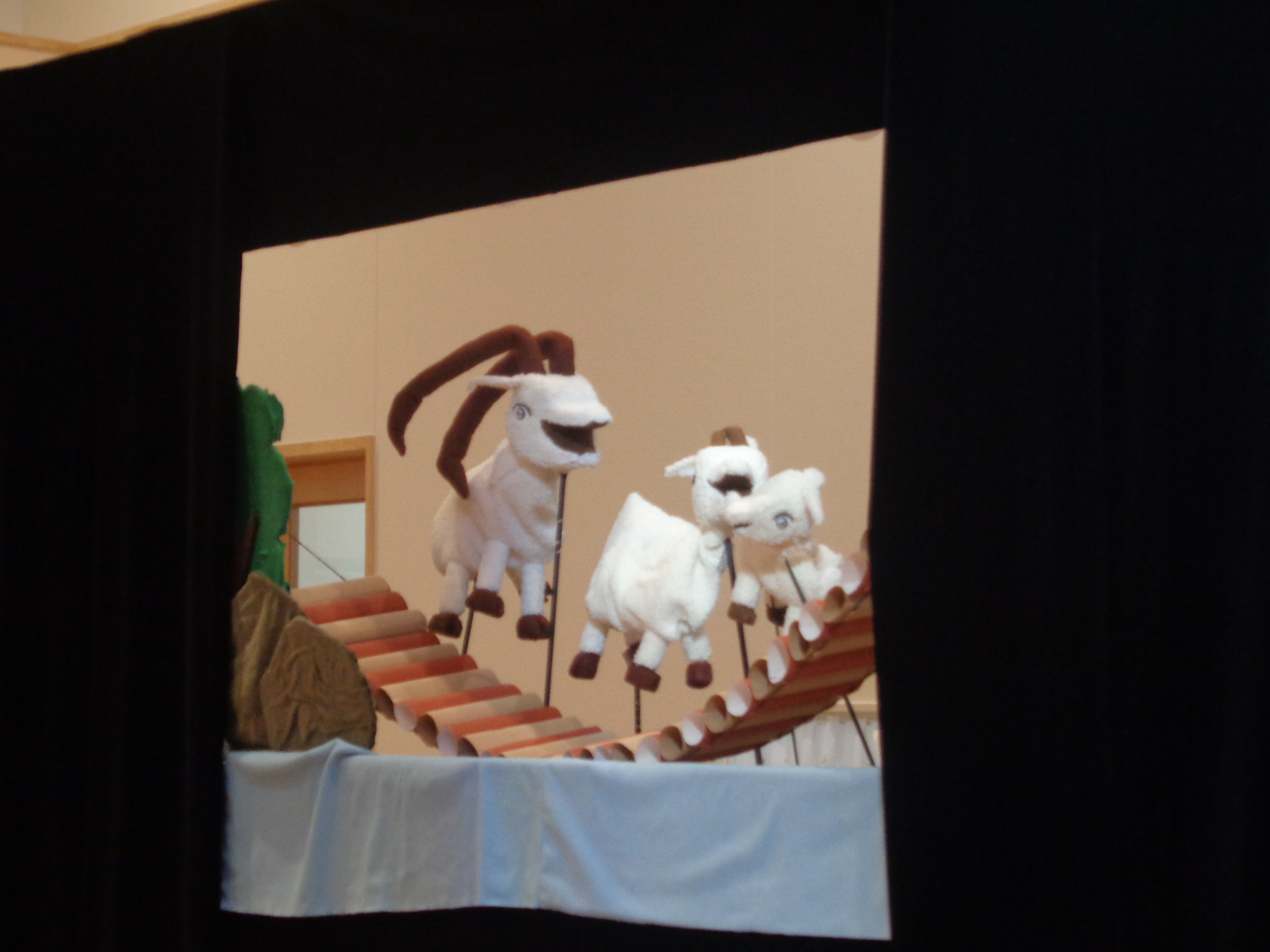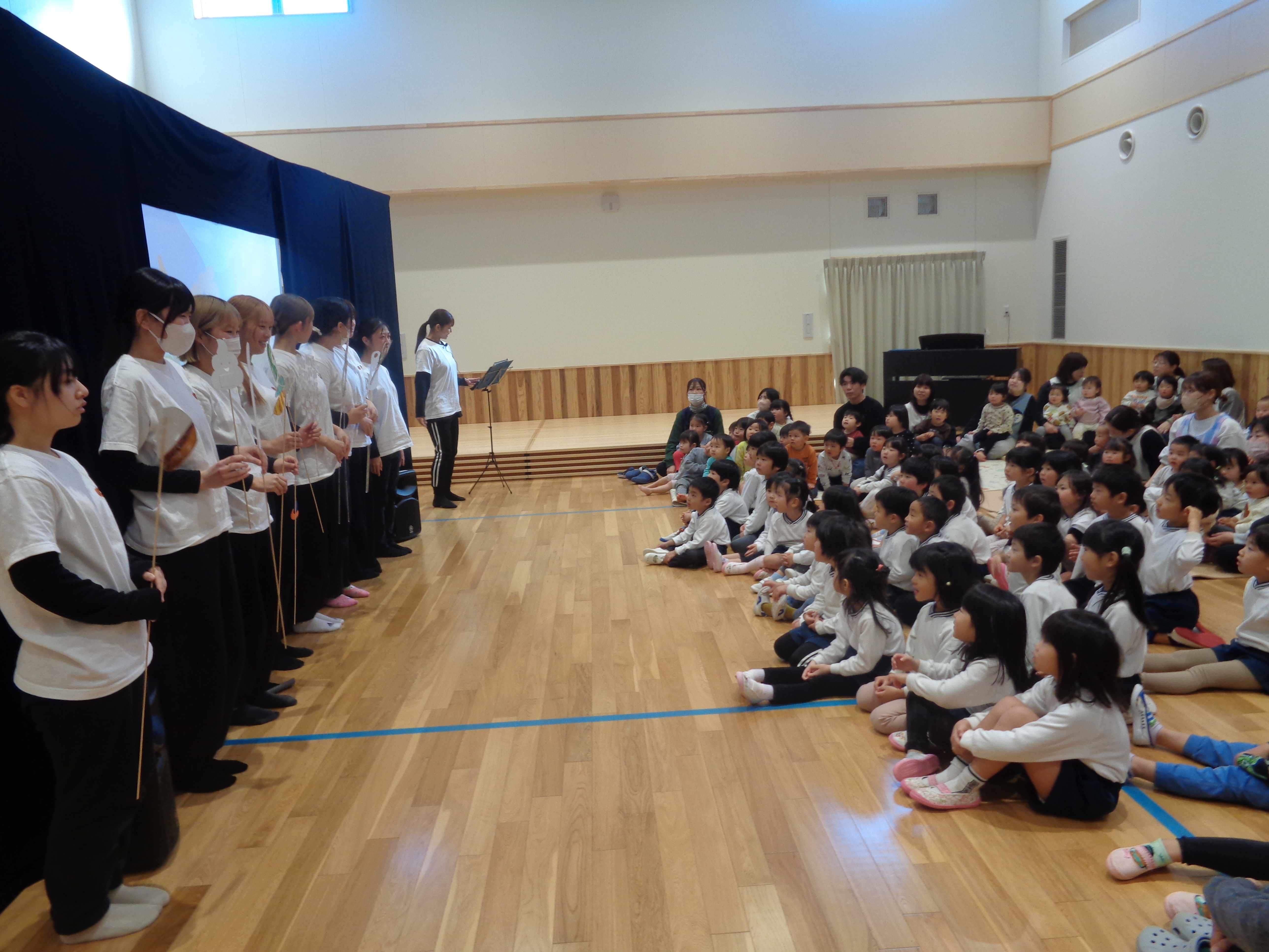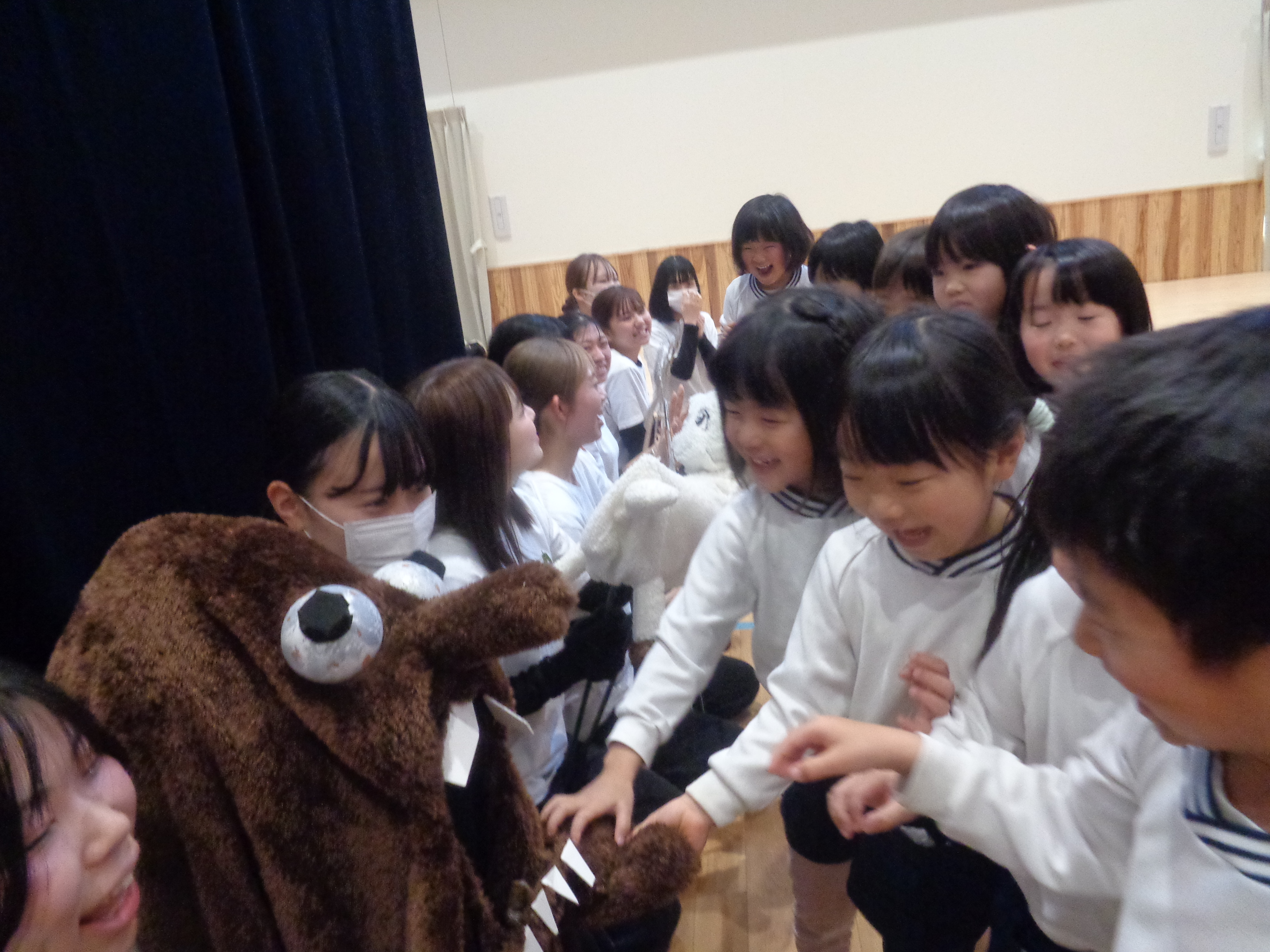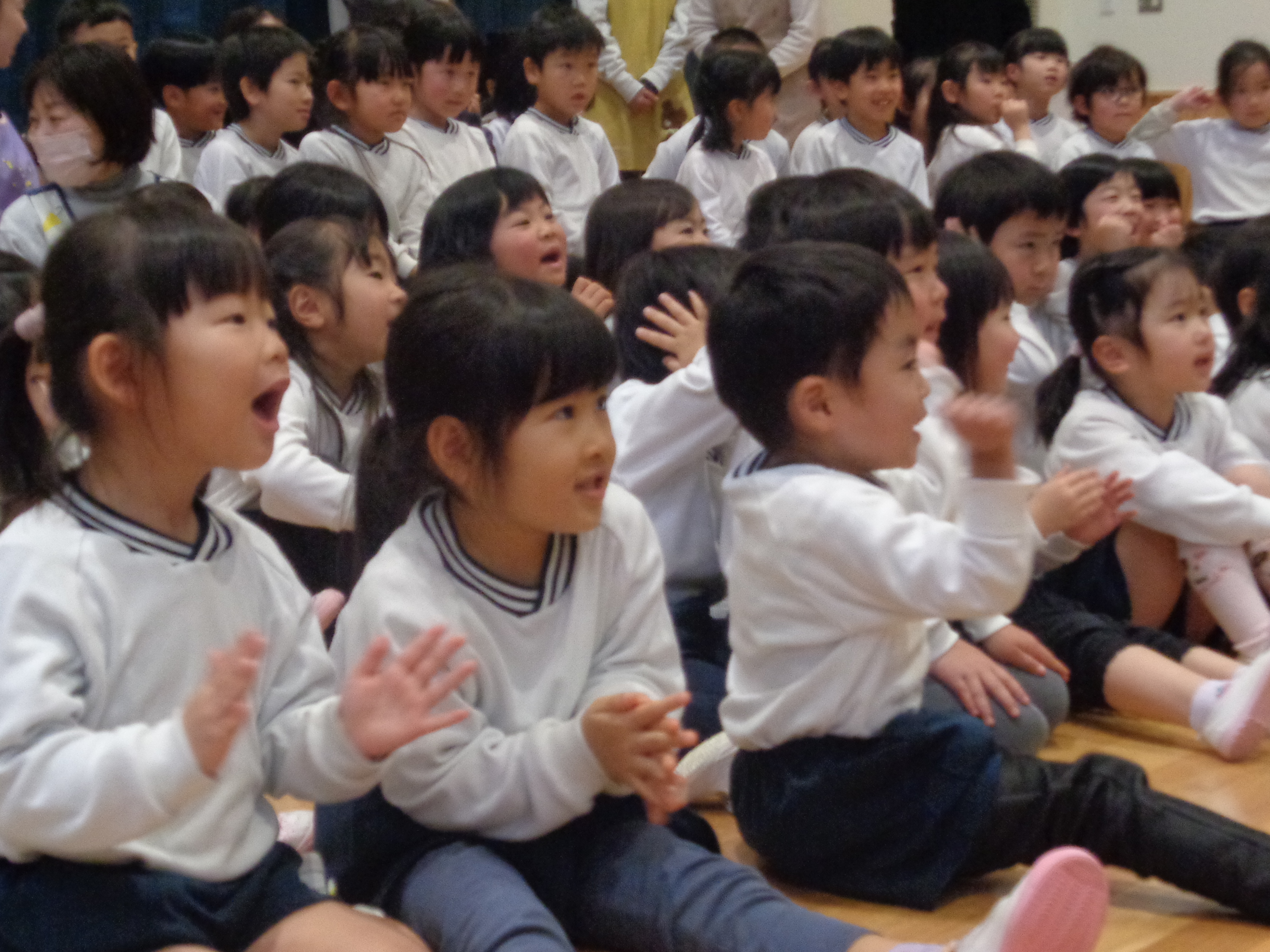 浜松未来総合専門学校のお姉さんが「さるかに合戦」の影絵と、「三匹のやぎのがらがらどん」の人形劇を披露しにきてくれました。トロルが出てくると友達と抱き合ったり、顔を隠したりと最後までドキドキ、ハラハラ楽しみながら真剣に見ていた子どもたちでした♪