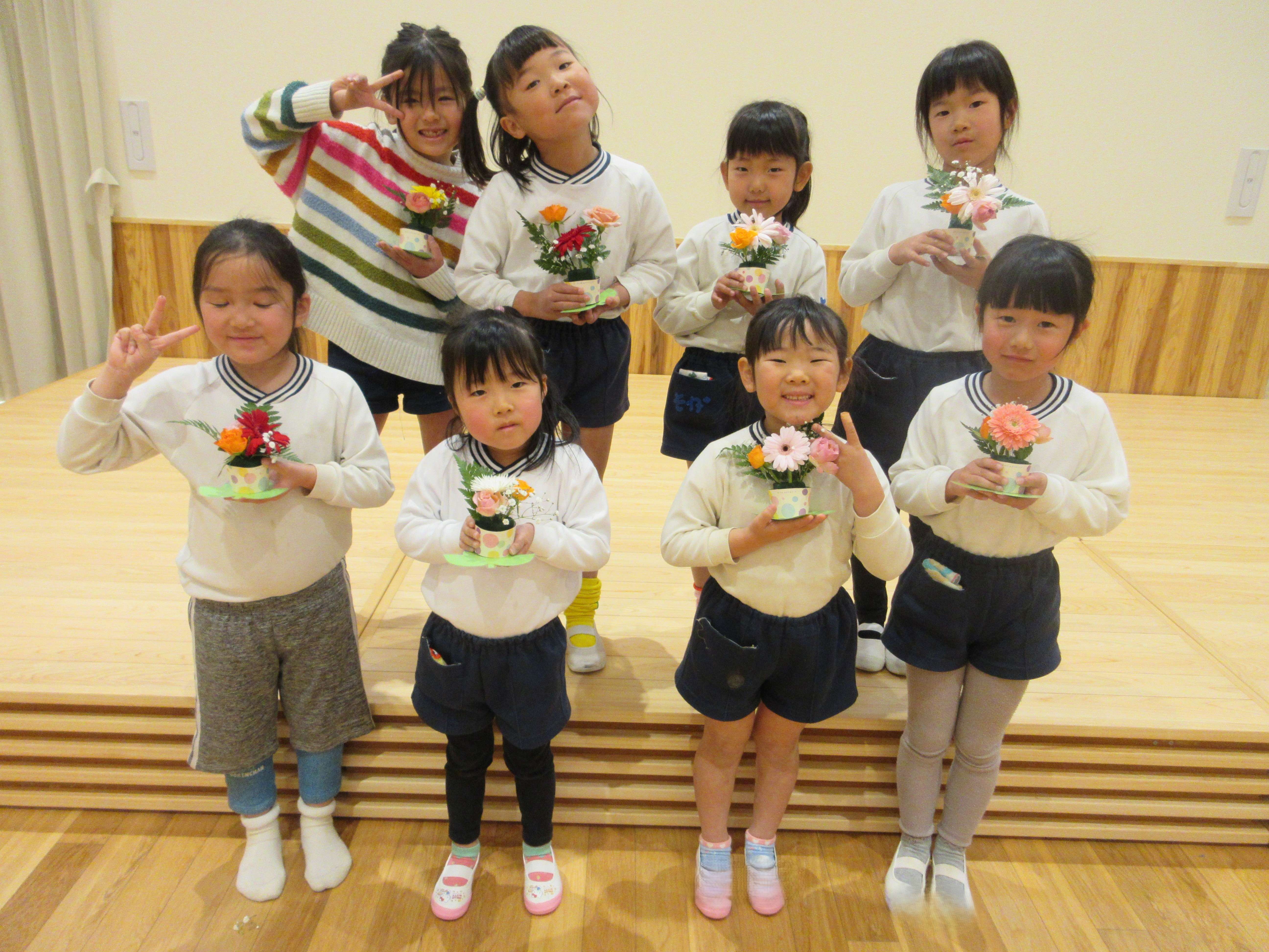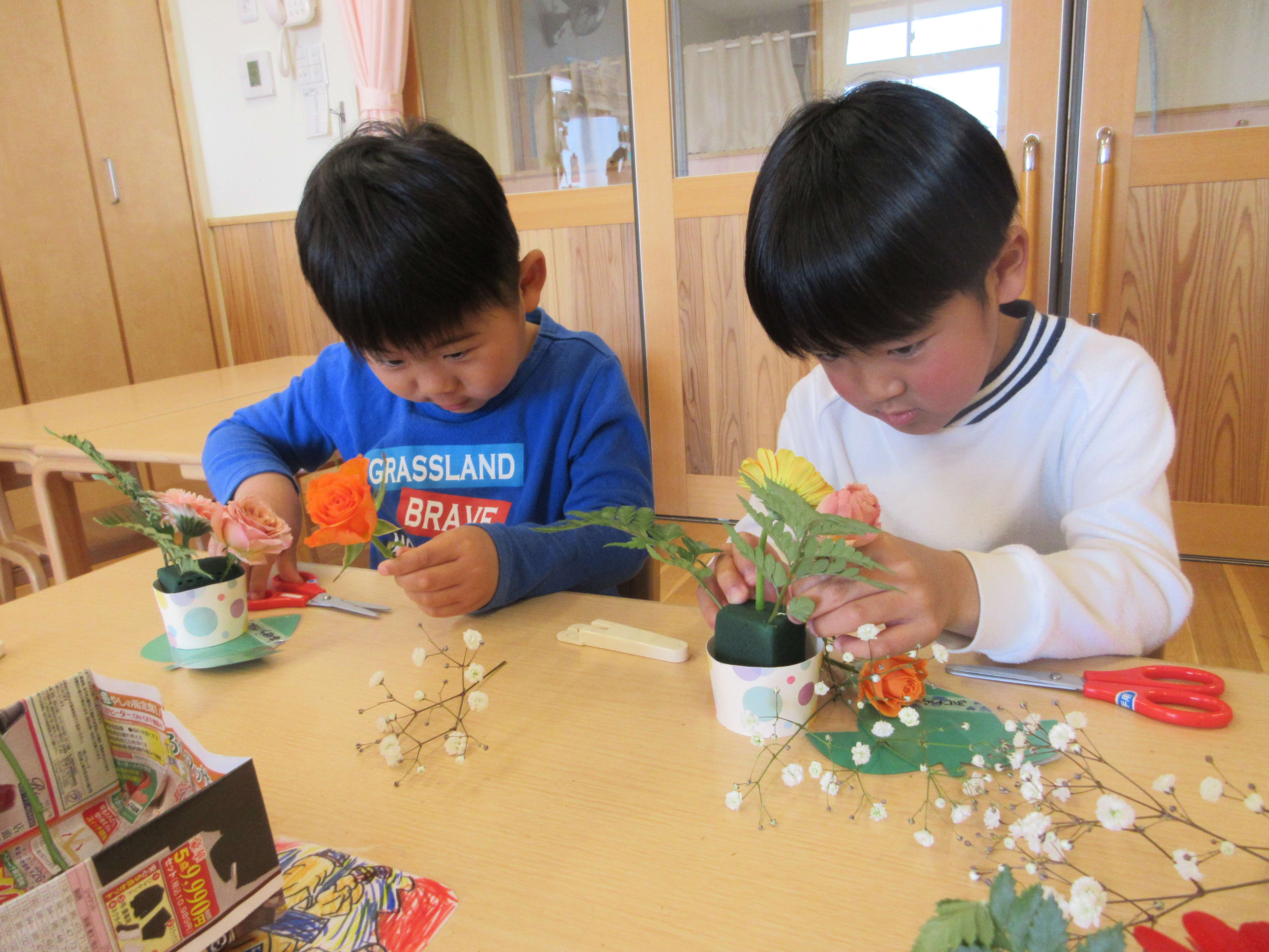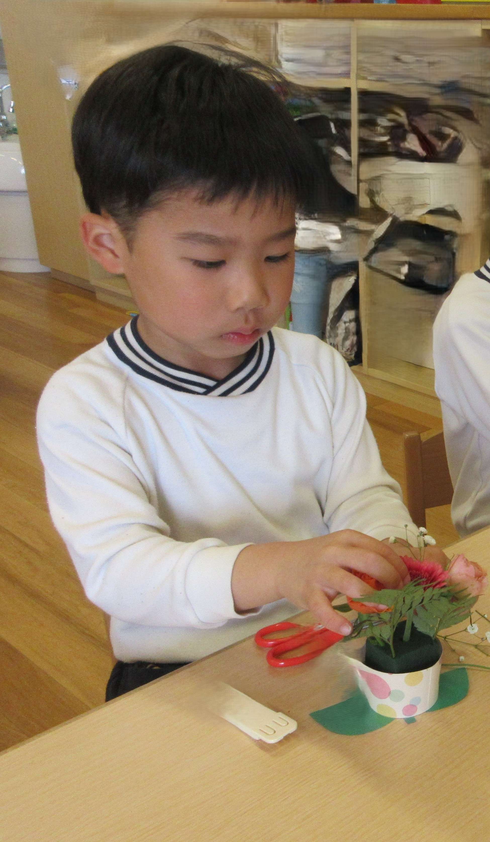 お花と向き合い、子どもたちの笑顔の花が咲き、キュートなフラワーアレンジの完成!