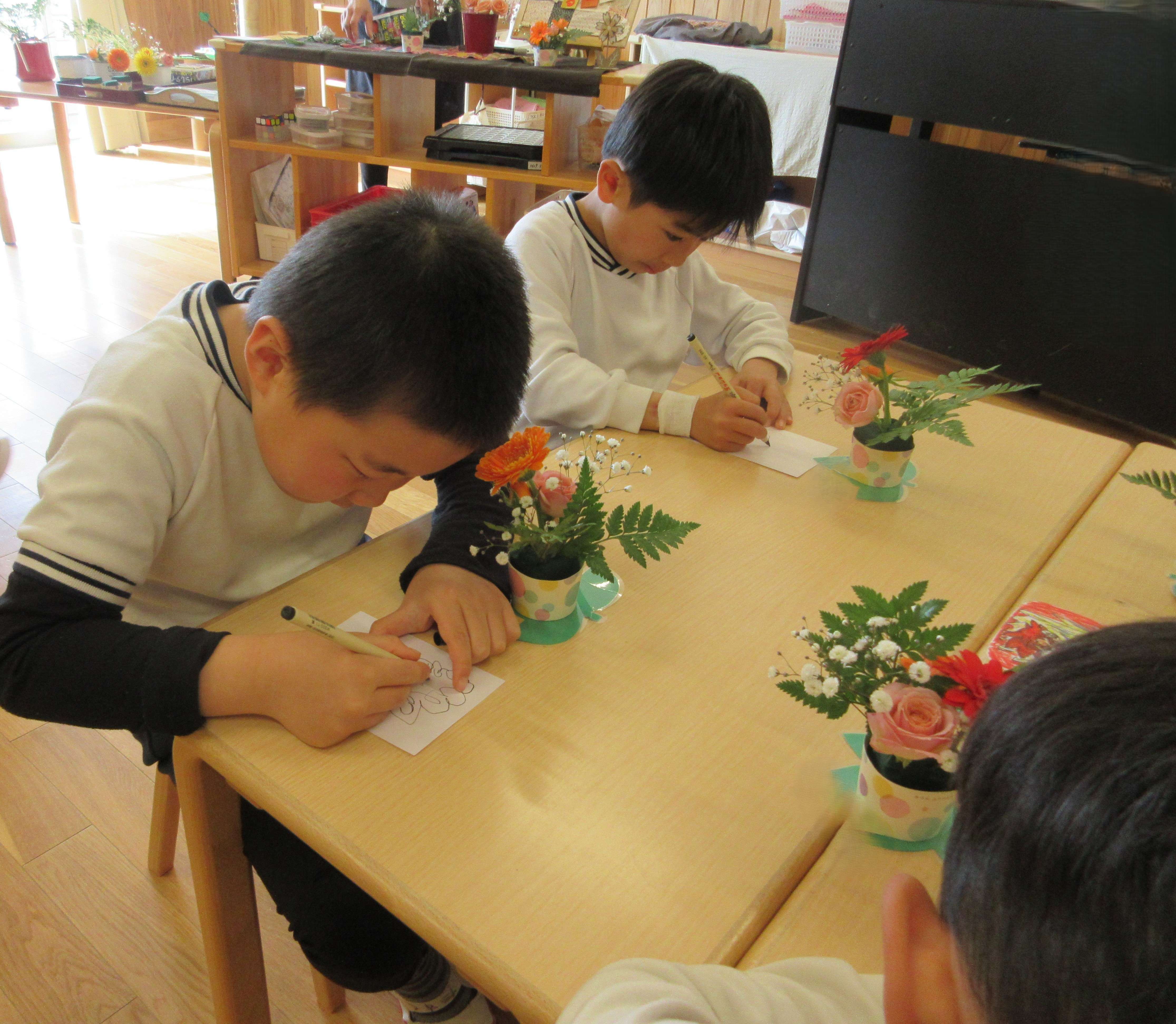 はじめてのデッサン!アレンジしたお花をじっくり観察しながら丁寧に細かく描く姿は画伯のようです。